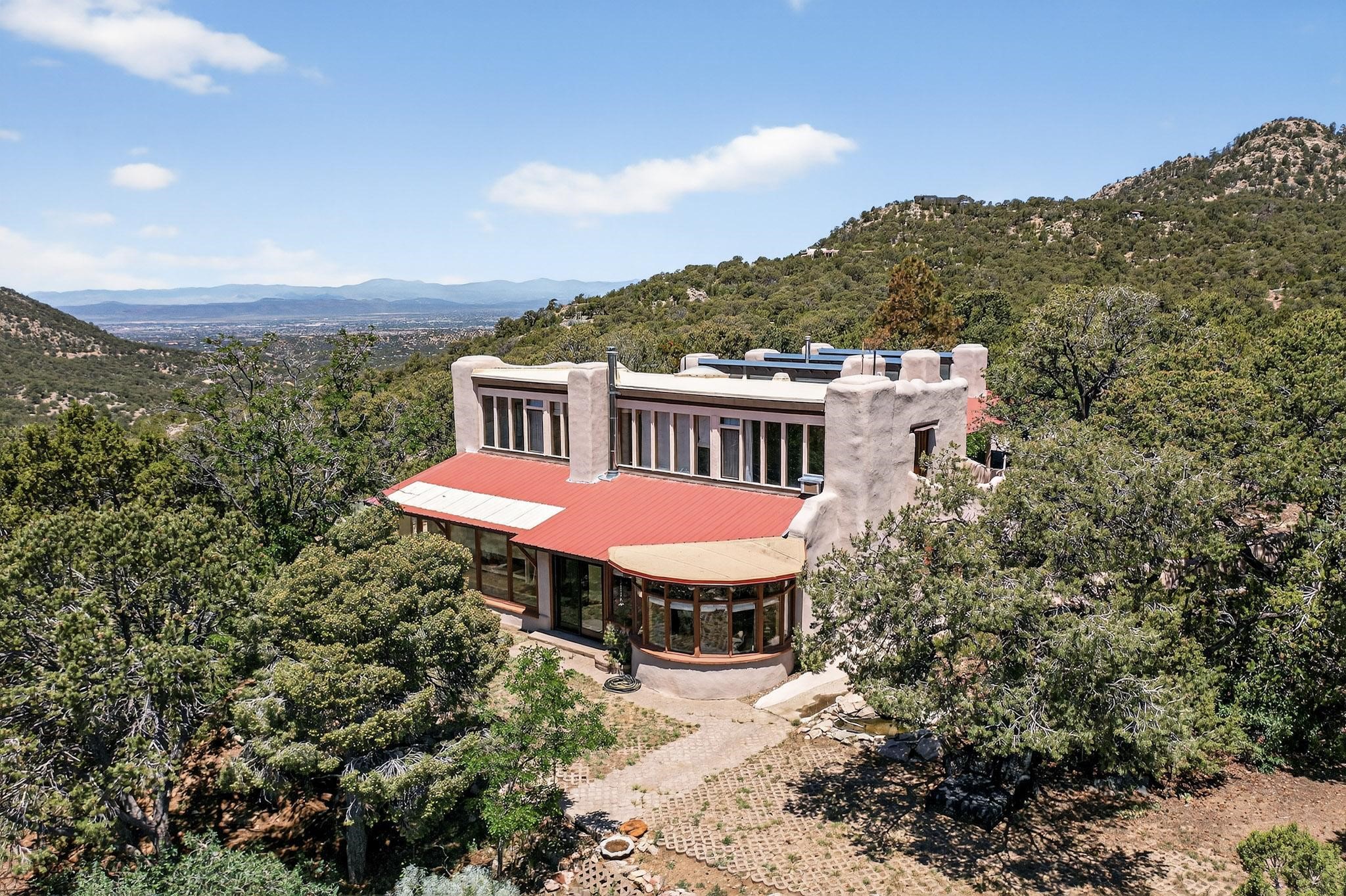 Tucked along the iconic Old Santa Fe Trail, ideal as a primary or get away residence, this enchanting adobe & frame-built appx 3147 sqft main home with an appx 480 sqft attached studio offers country living yet only 8 miles from the heart of downtown Santa Fe & close to amenities & restaurants (Harrys Rd House, El Gancho & more). Perfectly sited on 7.56 acres comprised of 4.56 acres + an additional lot of 3 acres, this property captures breathtaking panoramas of the Pecos & Galisteo Basins, Sandia & Jemez Mountains, & spectacular sunsets. Inside, you'll find a warm & inviting layout with a living room, kitchen with eat in nook, dining area, the charming "bottle" entry, a pantry, 3 bedrooms and 2.5 bathrooms, with a 3-car garage setup: a one-car attached garage w/ storage/workshop space, plus a detached two-car garage--all in an engaging split-level design full of Santa Fe charm & character with hand-crafted details including vigas, carved lintels, stain glass accents & more. The passive solar design with large south-facing windows & a pellet stove is efficient for heating, while adobe construction helps maintain comfortable indoor temperatures year-round. The wonderful appx 480-sqft studio with its own entrance, half bath, stainless steel work area, tongue & groove ceiling, sink & a propane heater--ideal as a home office, playroom, fitness or media room, or an easy guest suite conversion. Features/amenities include: NEW SEPTIC TANK, brick, tile & wood floors, kitchen with a conventional/convection oven, Bosch dishwasher & refrigerator, Pella windows, Artesanos fixtures, handmade tiles, solid wood doors, a balcony, peaceful patios, a pond, covered portals, walled courtyard, flagstone walkways, regraded and graveled driveway (no dirt) and more. There's even a dedicated "dog room" or additional storage leading to an appx 8-foot coyote-fenced enclosure. Gardeners will love the spacious greenhouse with sink & walled garden with apple trees ready for planting and harvest.