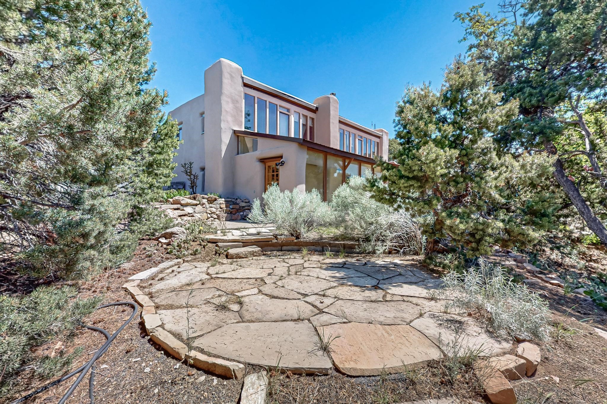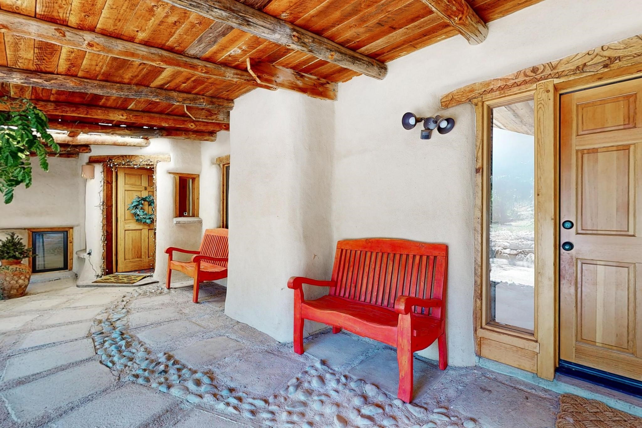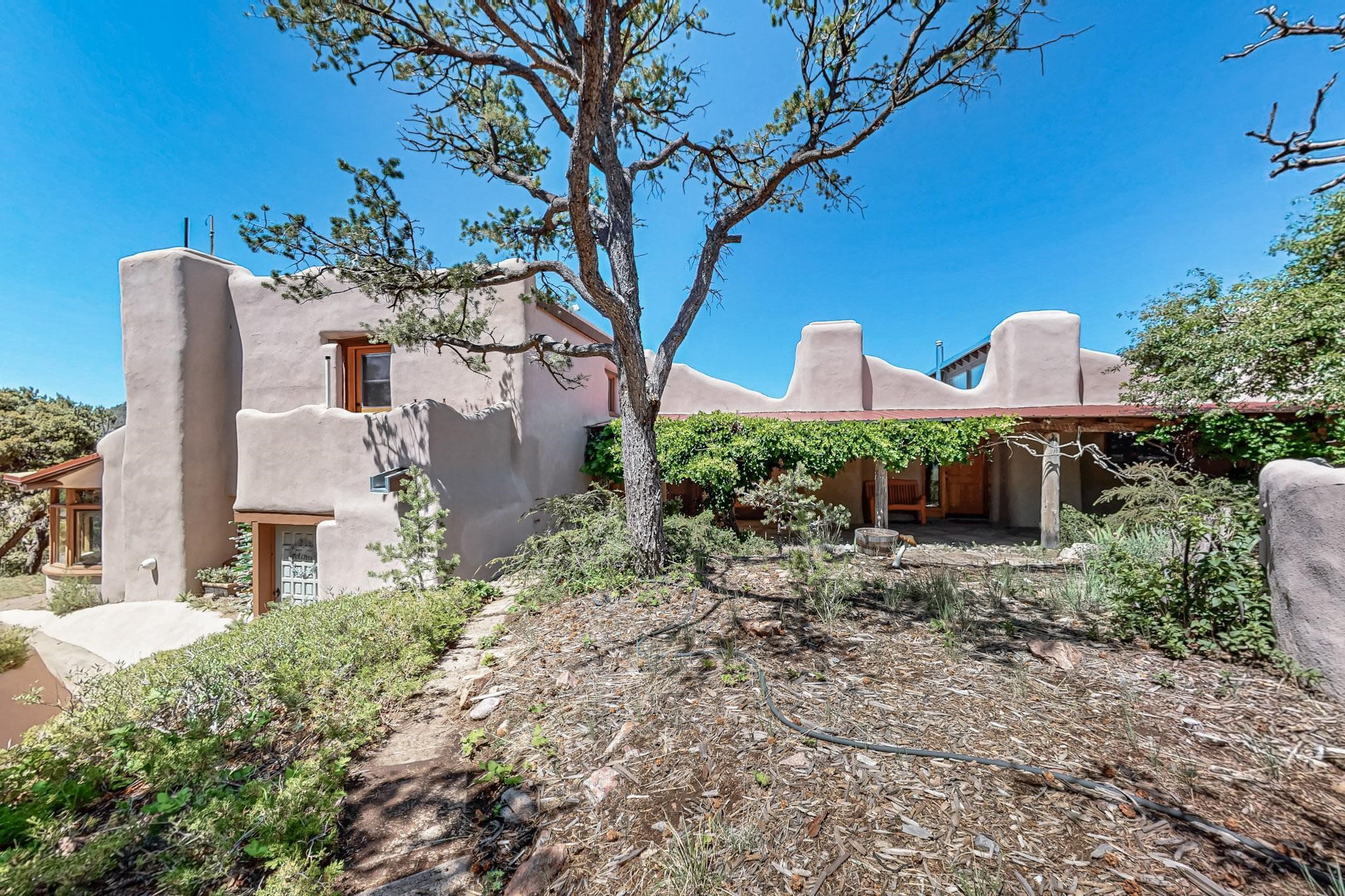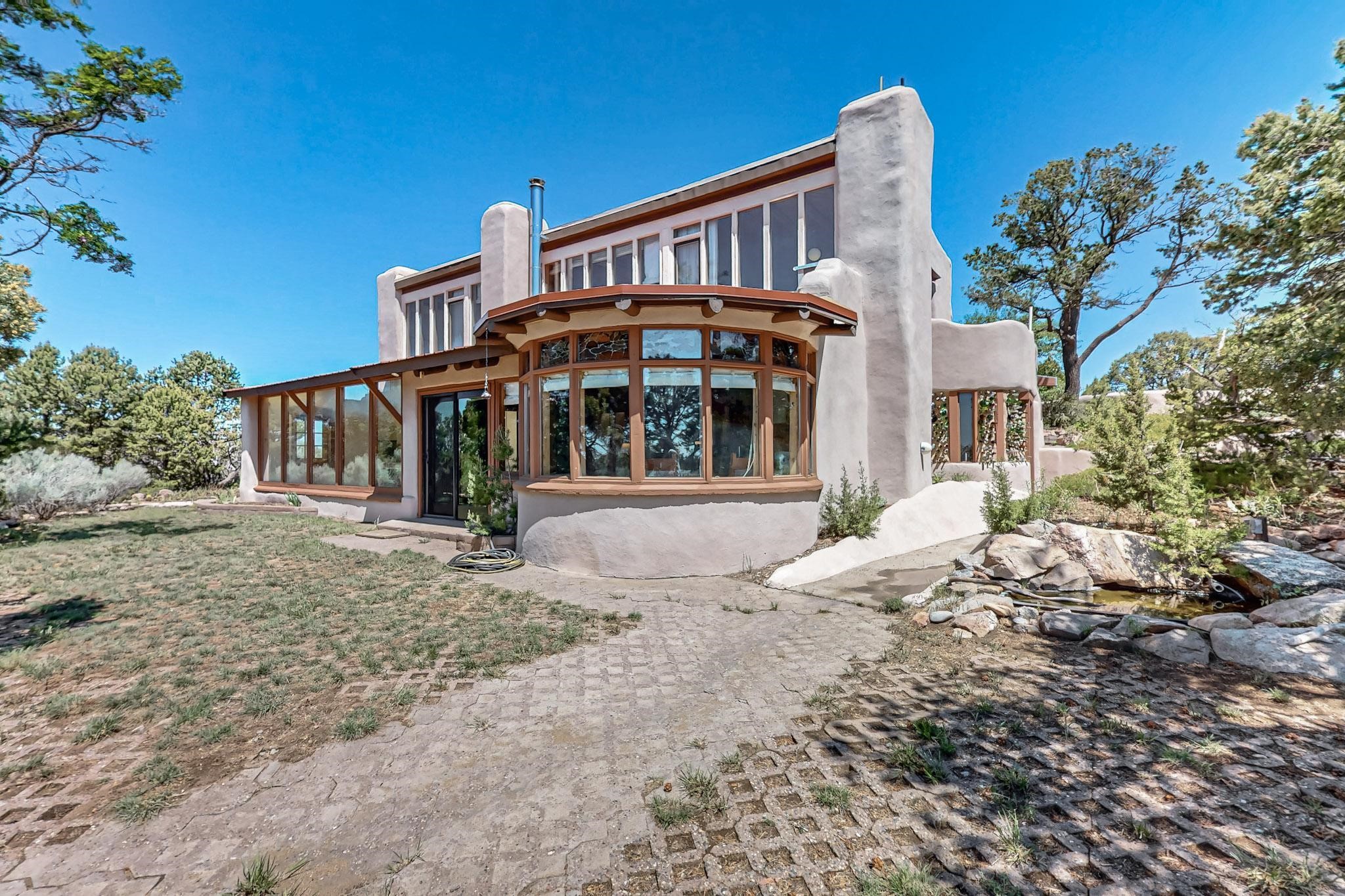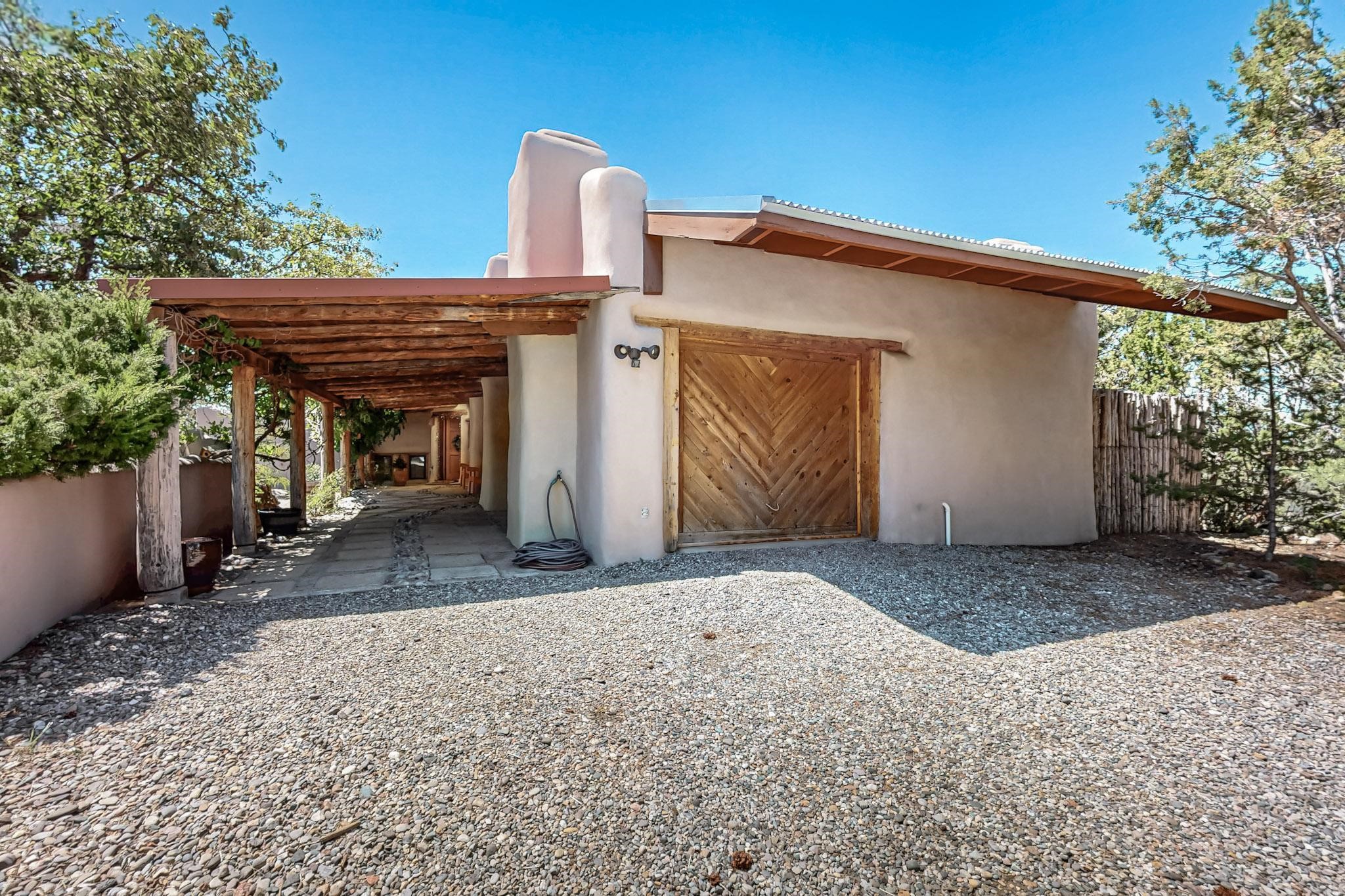 Tucked along the iconic Old Santa Fe Trail, ideal as a primary or get away residence, this enchanting adobe & frame-built appx 3147 sqft main home with an appx 480 sqft attached studio offers country living yet only 8 miles from the heart of downtown Santa Fe & close to amenities & restaurants (Harrys Rd House, El Gancho & more). Perfectly sited on 7.56 acres comprised of 4.56 acres + an additional lot of 3 acres, this property captures breathtaking panoramas of the Pecos & Galisteo Basins, Sandia & Jemez Mountains, & spectacular sunsets. Inside, you'll find a warm & inviting layout with a living room, kitchen with eat in nook, dining area, the charming "bottle" entry, a pantry, 3 bedrooms and 2.5 bathrooms, with a 3-car garage setup: a one-car attached garage w/ storage/workshop space, plus a detached two-car garage--all in an engaging split-level design full of Santa Fe charm & character with hand-crafted details including vigas, carved lintels, stain glass accents & more. The passive solar design with large south-facing windows & a pellet stove is efficient for heating, while adobe construction helps maintain comfortable indoor temperatures year-round. The wonderful appx 480-sqft studio with its own entrance, half bath, stainless steel work area, tongue & groove ceiling, sink & a propane heater--ideal as a home office, playroom, fitness or media room, or an easy guest suite conversion. Features/amenities include: NEW SEPTIC TANK, brick, tile & wood floors, kitchen with a conventional/convection oven, Bosch dishwasher & refrigerator, Pella windows, Artesanos fixtures, handmade tiles, solid wood doors, a balcony, peaceful patios, a pond, covered portals, walled courtyard, flagstone walkways, regraded and graveled driveway (no dirt) and more. There's even a dedicated "dog room" or additional storage leading to an appx 8-foot coyote-fenced enclosure. Gardeners will love the spacious greenhouse with sink & walled garden with apple trees ready for planting and harvest.