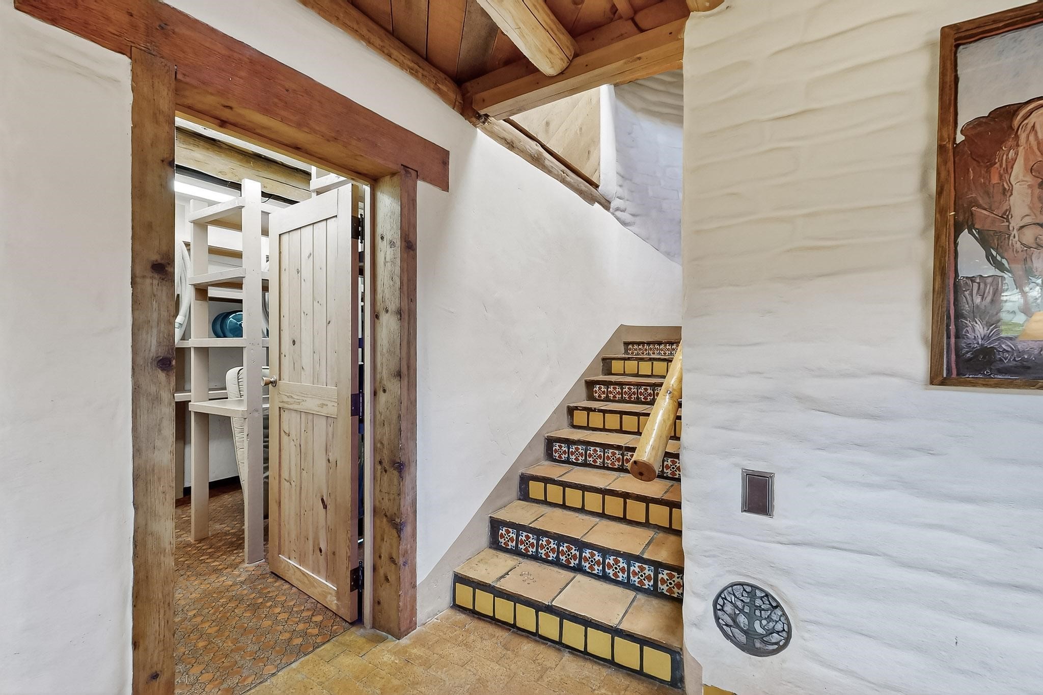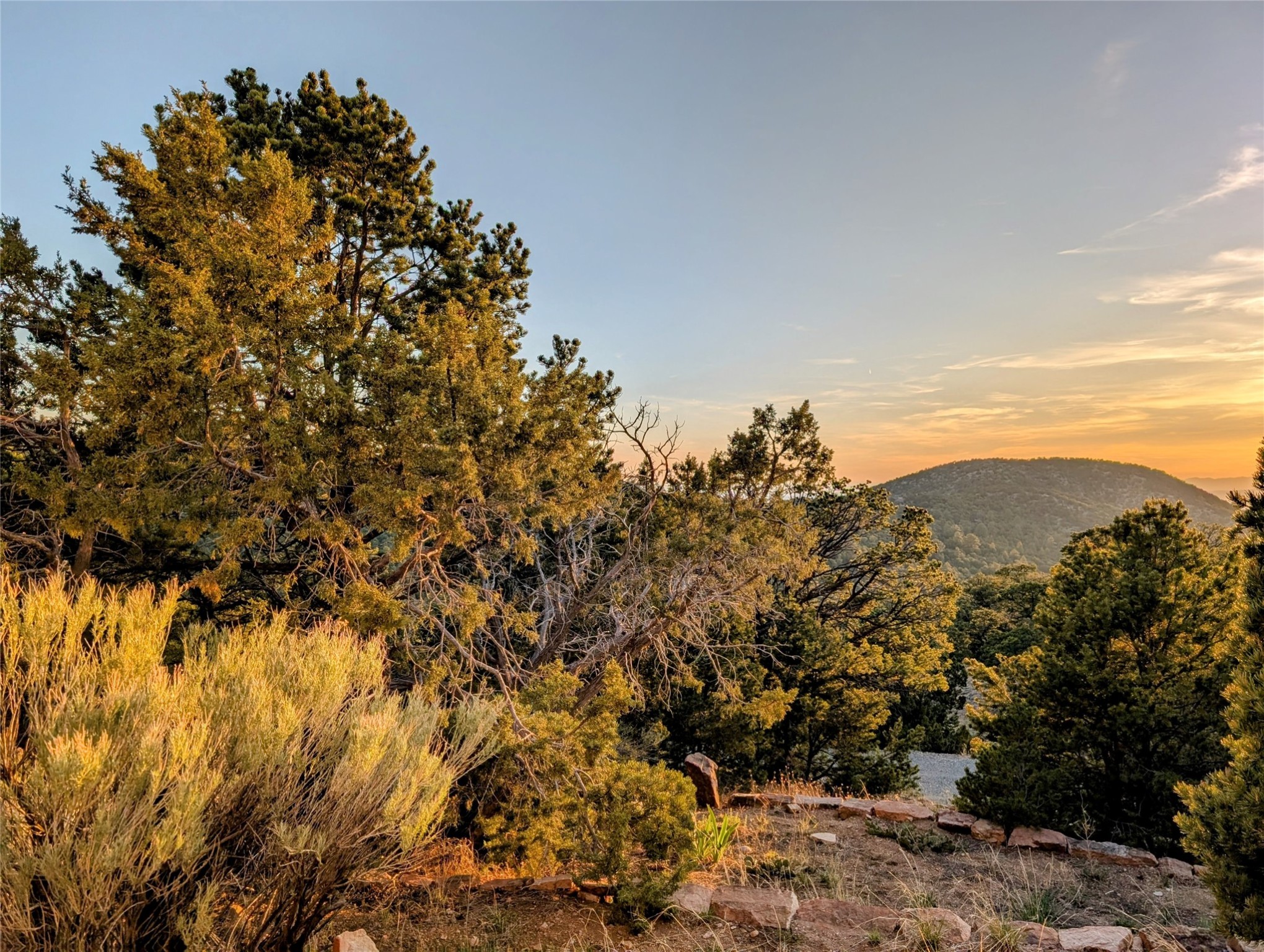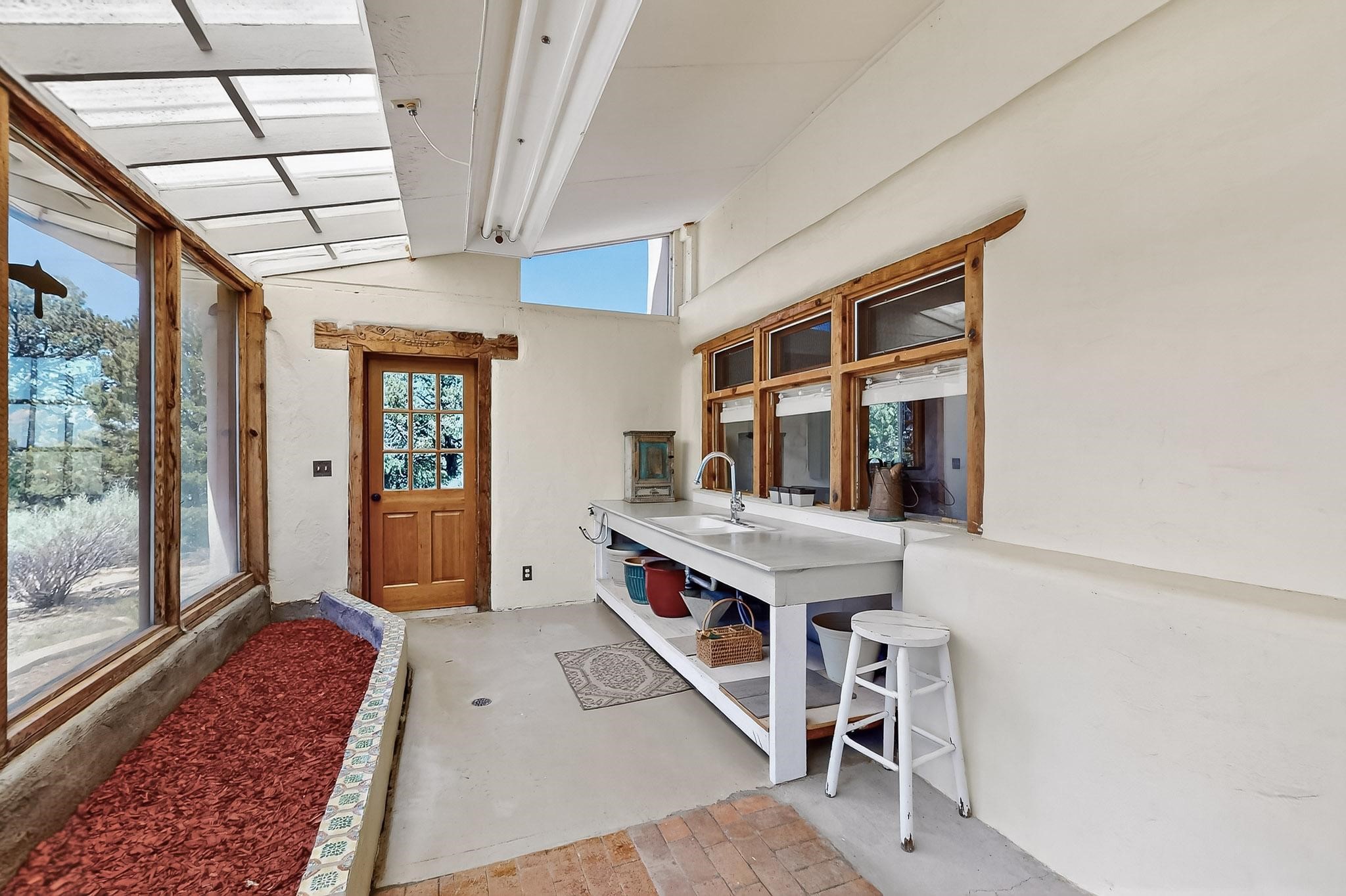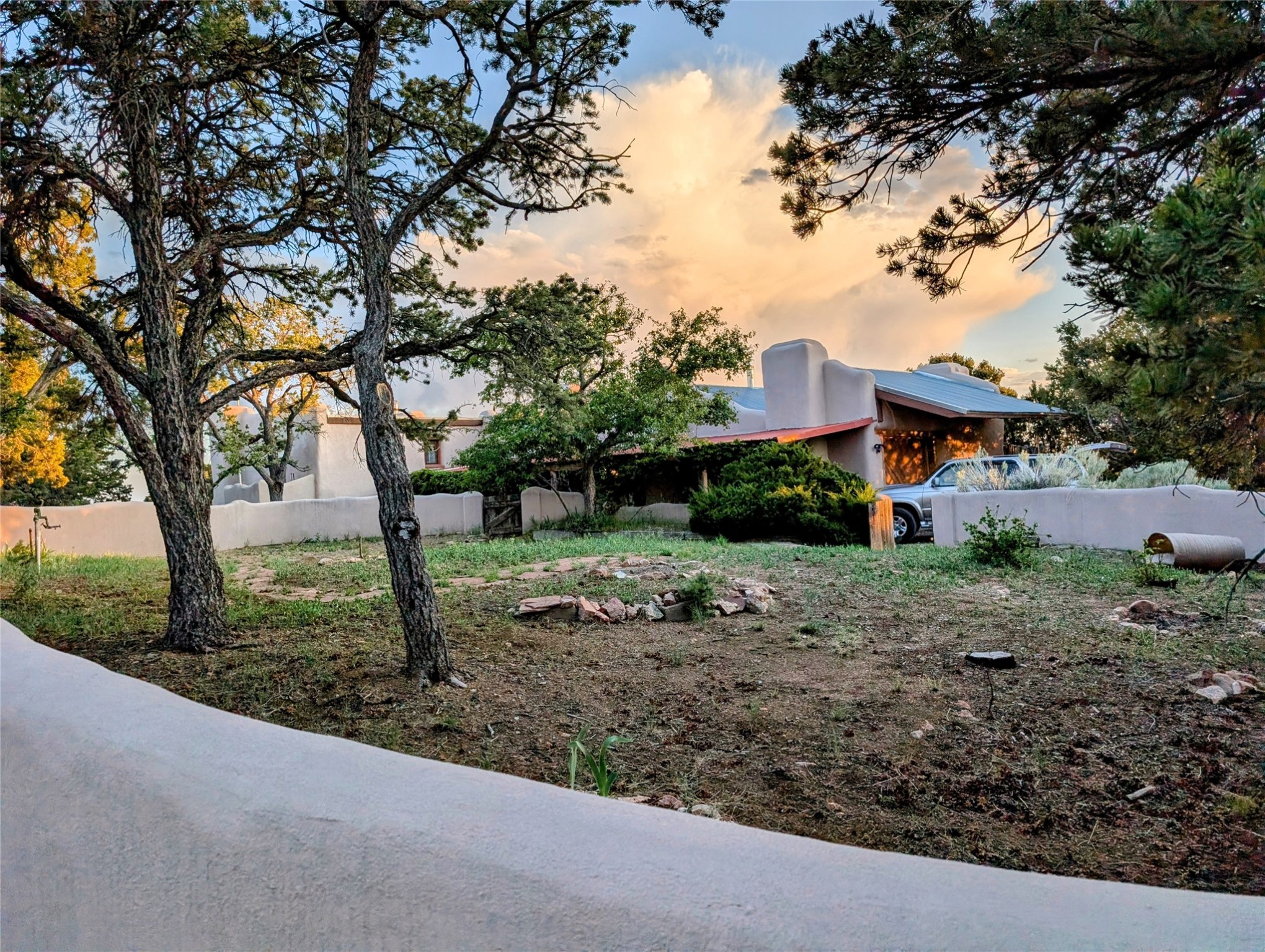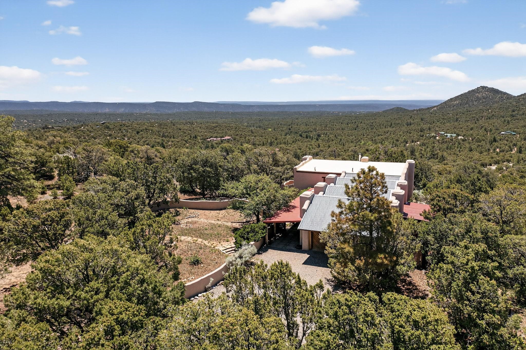 Tucked along the iconic Old Santa Fe Trail, ideal as a primary or get away residence, this enchanting adobe & frame-built appx 3147 sqft main home with an appx 480 sqft attached studio offers country living yet only 8 miles from the heart of downtown Santa Fe & close to amenities & restaurants (Harrys Rd House, El Gancho & more). Perfectly sited on 7.56 acres comprised of 4.56 acres + an additional lot of 3 acres, this property captures breathtaking panoramas of the Pecos & Galisteo Basins, Sandia & Jemez Mountains, & spectacular sunsets. Inside, you'll find a warm & inviting layout with a living room, kitchen with eat in nook, dining area, the charming "bottle" entry, a pantry, 3 bedrooms and 2.5 bathrooms, with a 3-car garage setup: a one-car attached garage w/ storage/workshop space, plus a detached two-car garage--all in an engaging split-level design full of Santa Fe charm & character with hand-crafted details including vigas, carved lintels, stain glass accents & more. The passive solar design with large south-facing windows & a pellet stove is efficient for heating, while adobe construction helps maintain comfortable indoor temperatures year-round. The wonderful appx 480-sqft studio with its own entrance, half bath, stainless steel work area, tongue & groove ceiling, sink & a propane heater--ideal as a home office, playroom, fitness or media room, or an easy guest suite conversion. Features/amenities include: NEW SEPTIC TANK, brick, tile & wood floors, kitchen with a conventional/convection oven, Bosch dishwasher & refrigerator, Pella windows, Artesanos fixtures, handmade tiles, solid wood doors, a balcony, peaceful patios, a pond, covered portals, walled courtyard, flagstone walkways, regraded and graveled driveway (no dirt) and more. There's even a dedicated "dog room" or additional storage leading to an appx 8-foot coyote-fenced enclosure. Gardeners will love the spacious greenhouse with sink & walled garden with apple trees ready for planting and harvest.