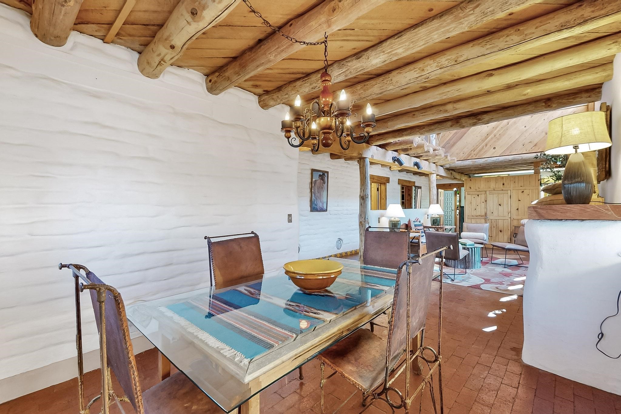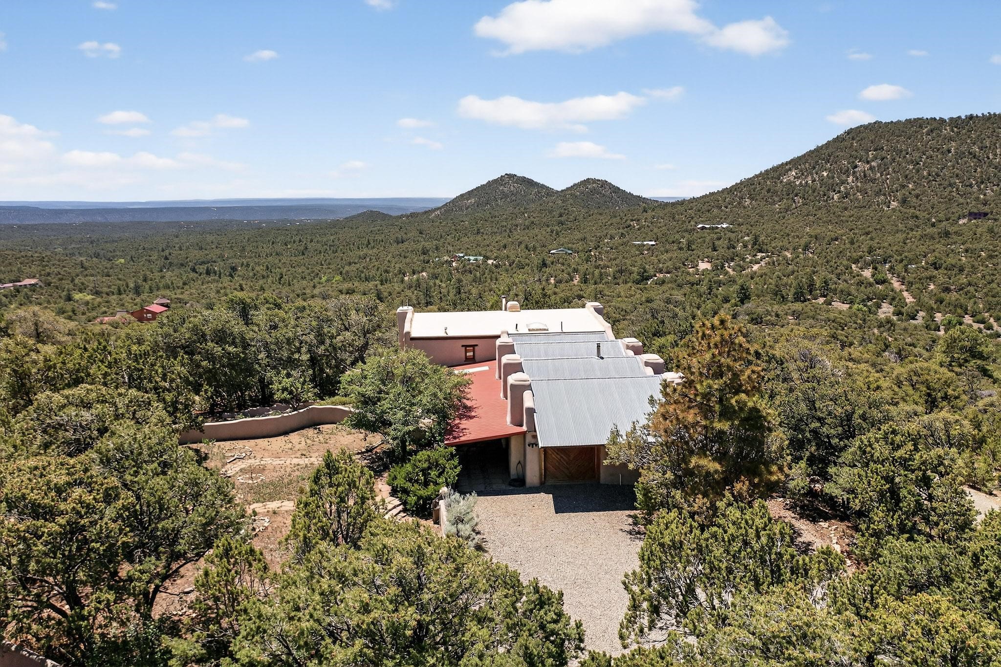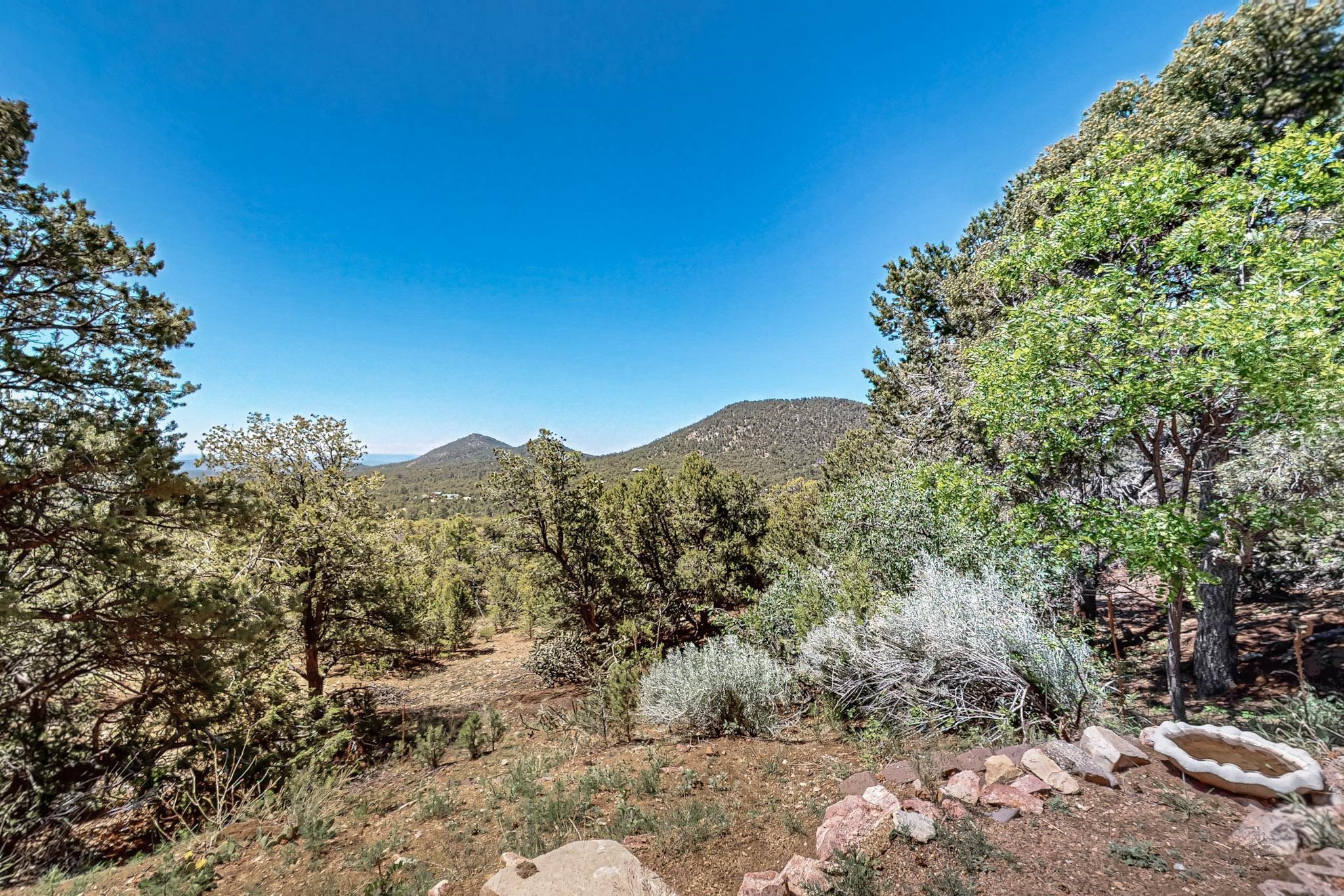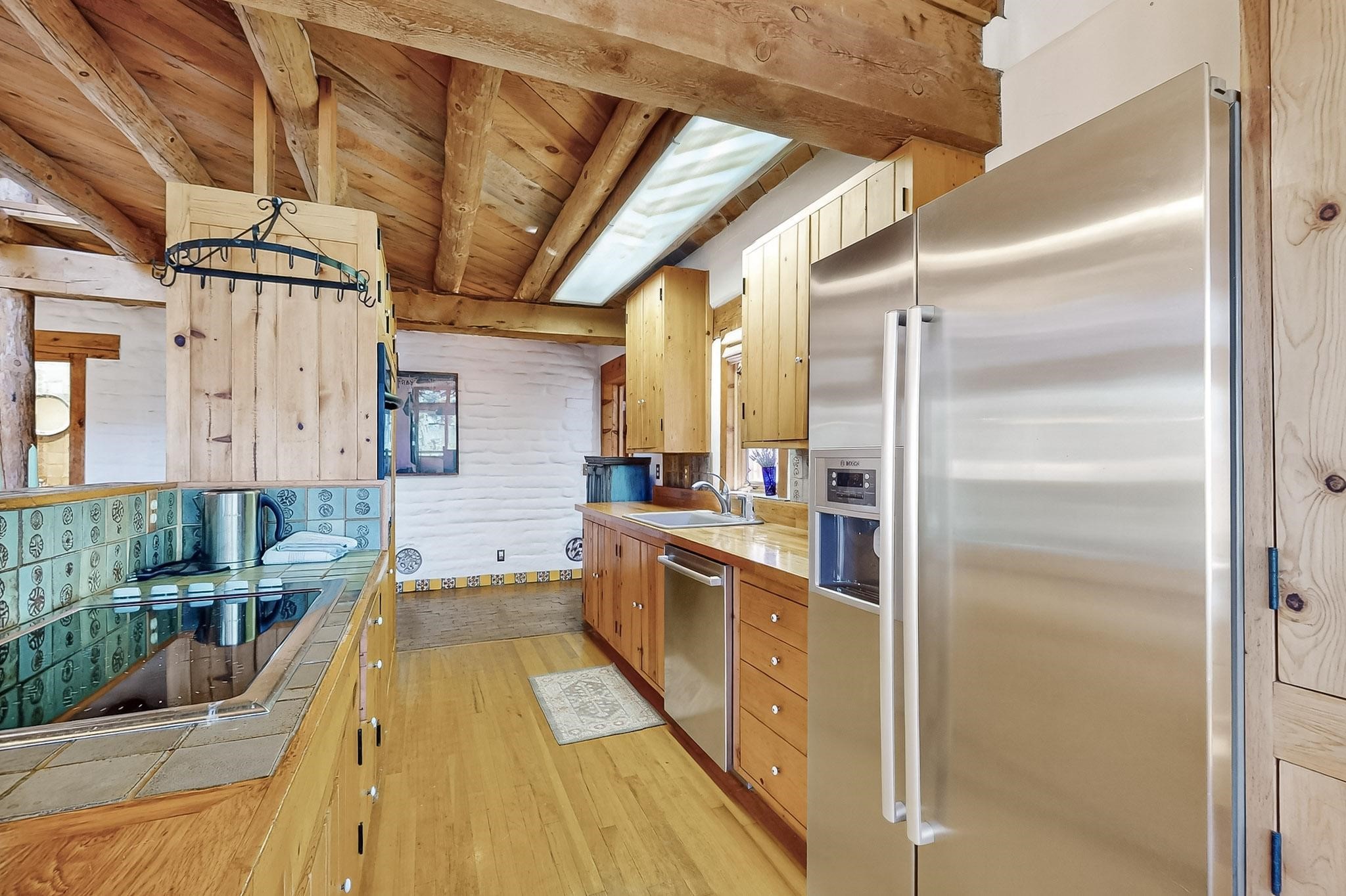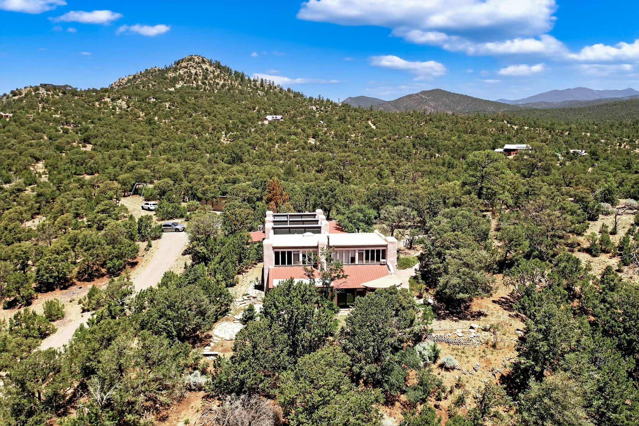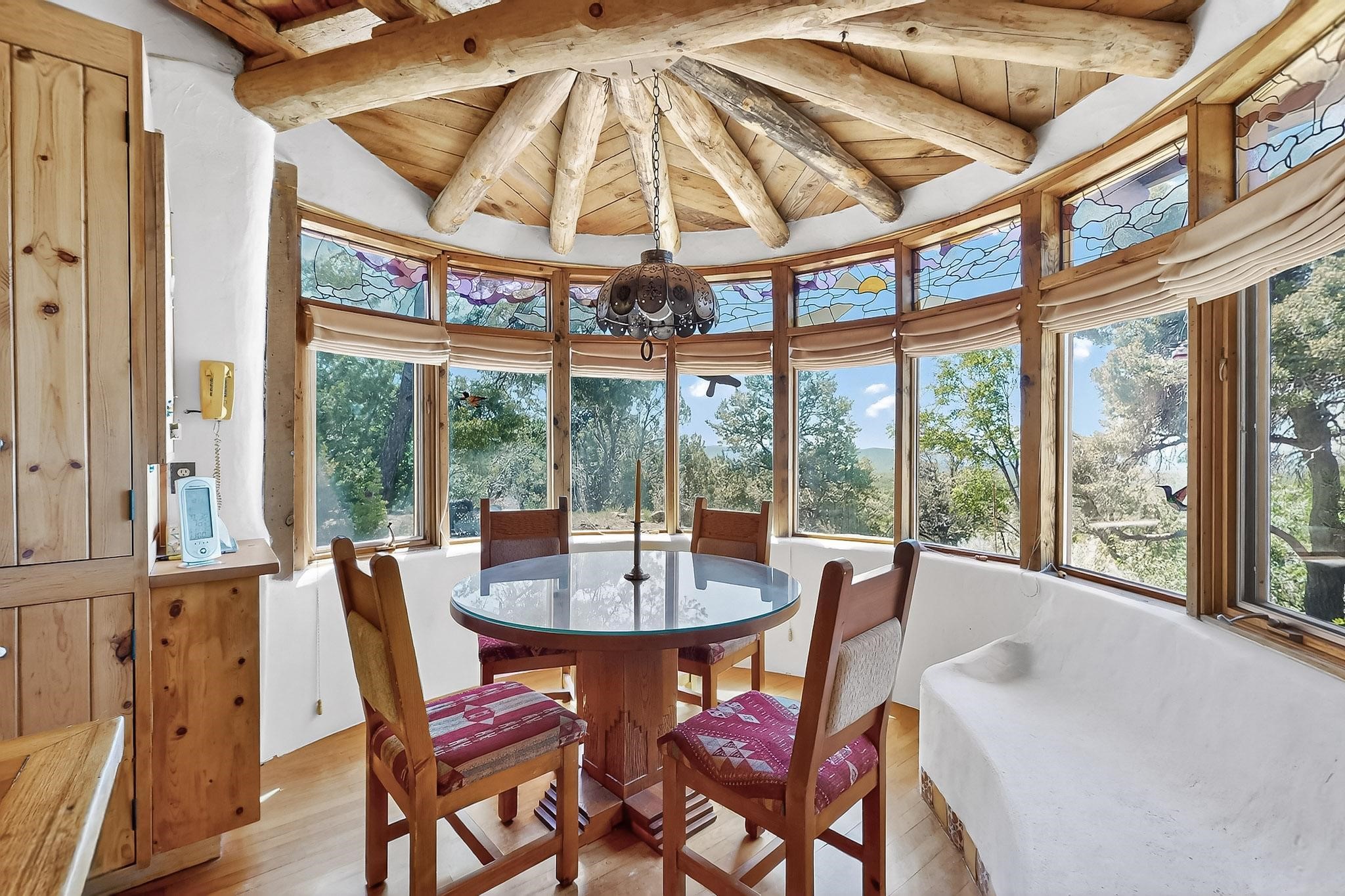 Tucked along the iconic Old Santa Fe Trail, ideal as a primary or get away residence, this enchanting adobe & frame-built appx 3147 sqft main home with an appx 480 sqft attached studio offers country living yet only 8 miles from the heart of downtown Santa Fe & close to amenities & restaurants (Harrys Rd House, El Gancho & more). Perfectly sited on 7.56 acres comprised of 4.56 acres + an additional lot of 3 acres, this property captures breathtaking panoramas of the Pecos & Galisteo Basins, Sandia & Jemez Mountains, & spectacular sunsets. Inside, you'll find a warm & inviting layout with a living room, kitchen with eat in nook, dining area, the charming "bottle" entry, a pantry, 3 bedrooms and 2.5 bathrooms, with a 3-car garage setup: a one-car attached garage w/ storage/workshop space, plus a detached two-car garage--all in an engaging split-level design full of Santa Fe charm & character with hand-crafted details including vigas, carved lintels, stain glass accents & more. The passive solar design with large south-facing windows & a pellet stove is efficient for heating, while adobe construction helps maintain comfortable indoor temperatures year-round. The wonderful appx 480-sqft studio with its own entrance, half bath, stainless steel work area, tongue & groove ceiling, sink & a propane heater--ideal as a home office, playroom, fitness or media room, or an easy guest suite conversion. Features/amenities include: NEW SEPTIC TANK, brick, tile & wood floors, kitchen with a conventional/convection oven, Bosch dishwasher & refrigerator, Pella windows, Artesanos fixtures, handmade tiles, solid wood doors, a balcony, peaceful patios, a pond, covered portals, walled courtyard, flagstone walkways, regraded and graveled driveway (no dirt) and more. There's even a dedicated "dog room" or additional storage leading to an appx 8-foot coyote-fenced enclosure. Gardeners will love the spacious greenhouse with sink & walled garden with apple trees ready for planting and harvest.