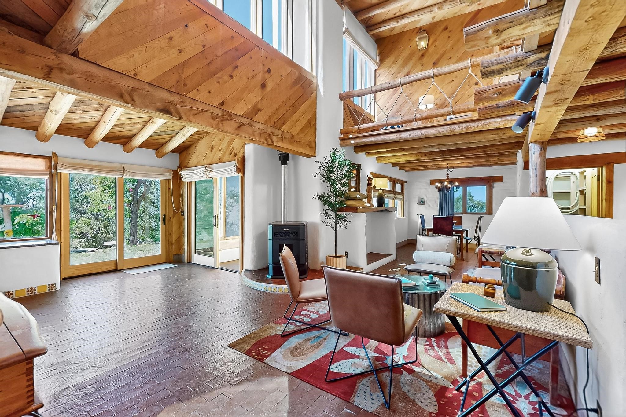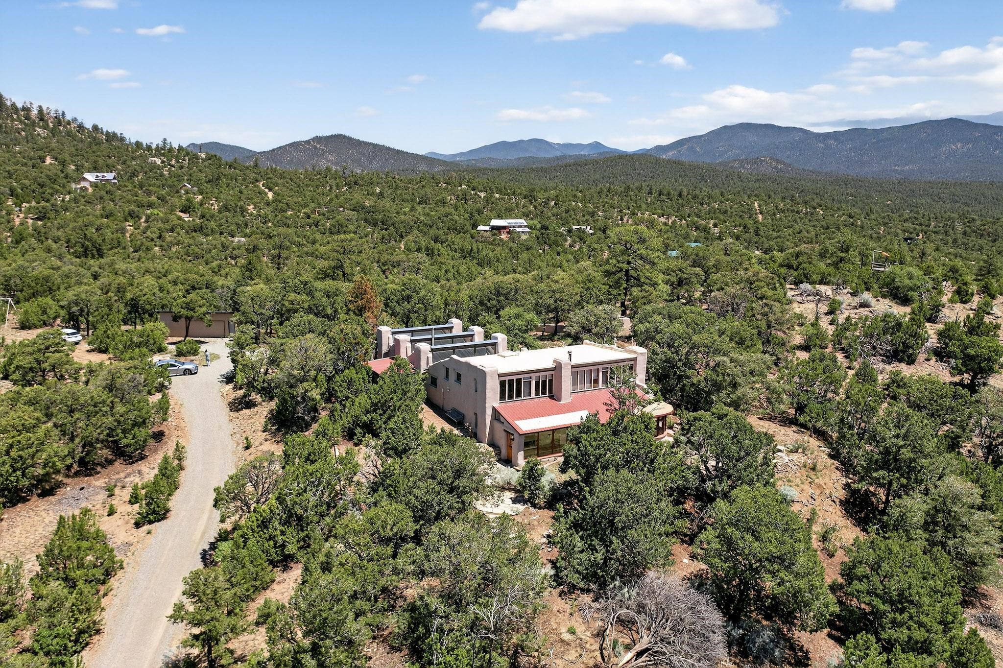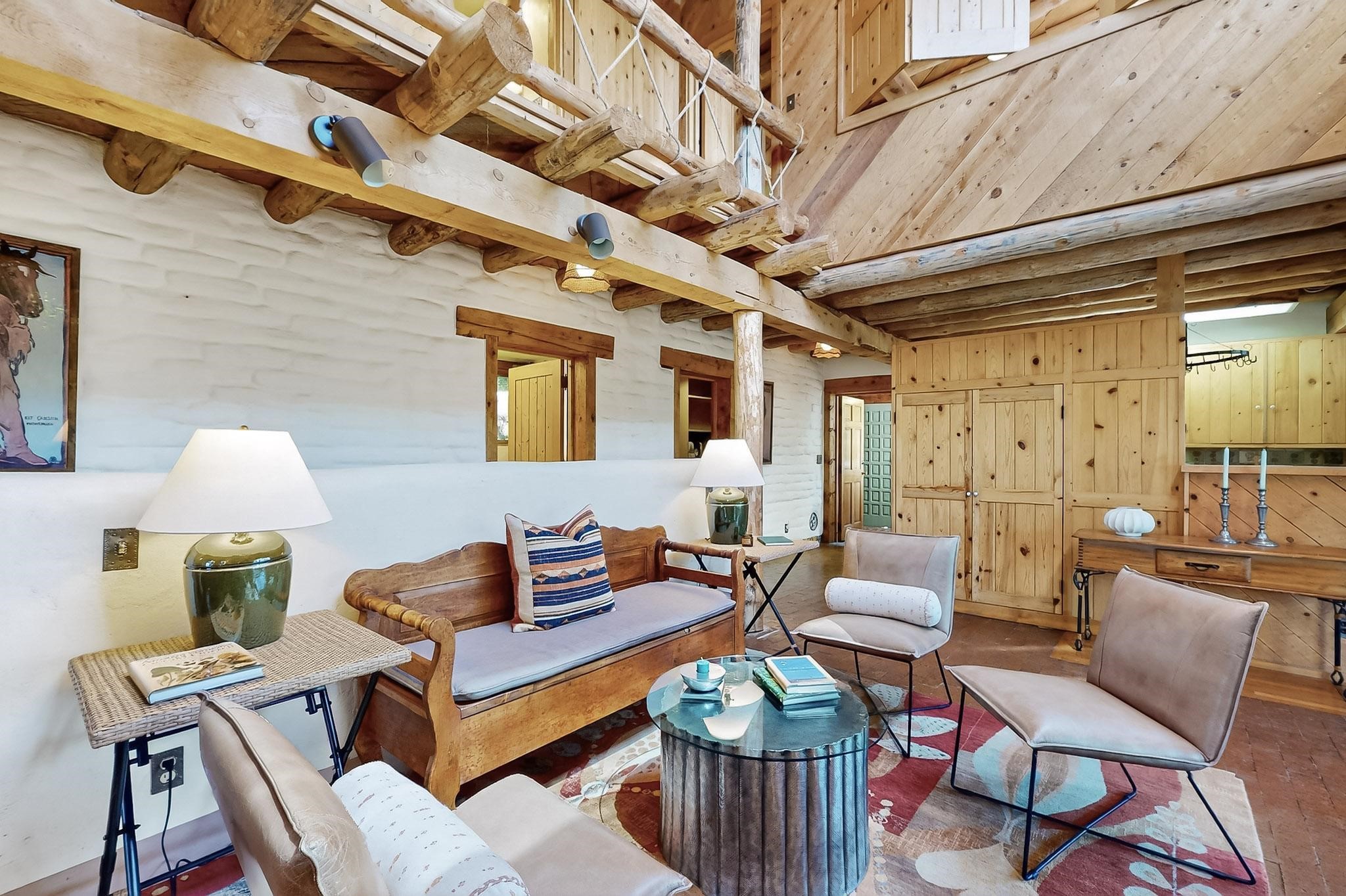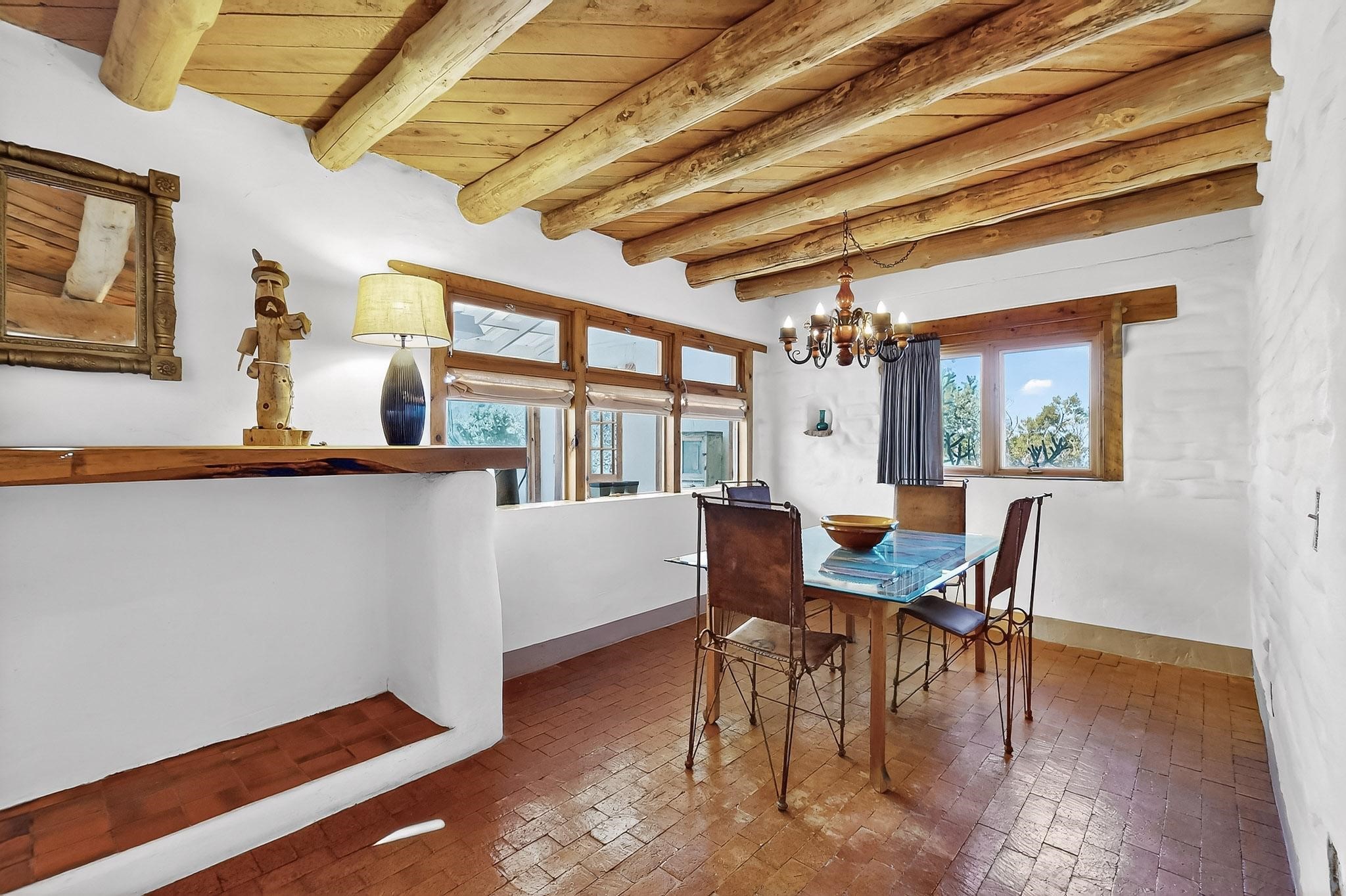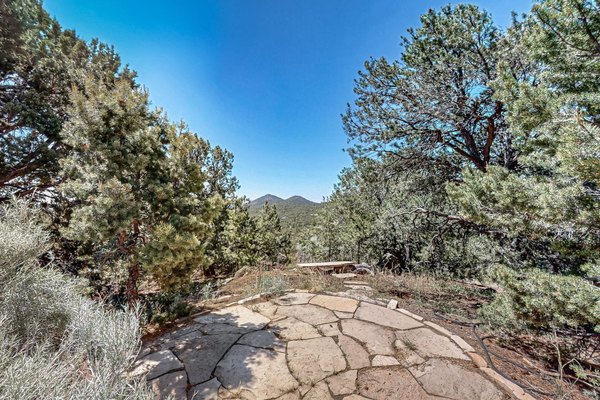 Tucked along the iconic Old Santa Fe Trail, ideal as a primary or get away residence, this enchanting adobe & frame-built appx 3147 sqft main home with an appx 480 sqft attached studio offers country living yet only 8 miles from the heart of downtown Santa Fe & close to amenities & restaurants (Harrys Rd House, El Gancho & more). Perfectly sited on 7.56 acres comprised of 4.56 acres + an additional lot of 3 acres, this property captures breathtaking panoramas of the Pecos & Galisteo Basins, Sandia & Jemez Mountains, & spectacular sunsets. Inside, you'll find a warm & inviting layout with a living room, kitchen with eat in nook, dining area, the charming "bottle" entry, a pantry, 3 bedrooms and 2.5 bathrooms, with a 3-car garage setup: a one-car attached garage w/ storage/workshop space, plus a detached two-car garage--all in an engaging split-level design full of Santa Fe charm & character with hand-crafted details including vigas, carved lintels, stain glass accents & more. The passive solar design with large south-facing windows & a pellet stove is efficient for heating, while adobe construction helps maintain comfortable indoor temperatures year-round. The wonderful appx 480-sqft studio with its own entrance, half bath, stainless steel work area, tongue & groove ceiling, sink & a propane heater--ideal as a home office, playroom, fitness or media room, or an easy guest suite conversion. Features/amenities include: NEW SEPTIC TANK, brick, tile & wood floors, kitchen with a conventional/convection oven, Bosch dishwasher & refrigerator, Pella windows, Artesanos fixtures, handmade tiles, solid wood doors, a balcony, peaceful patios, a pond, covered portals, walled courtyard, flagstone walkways, regraded and graveled driveway (no dirt) and more. There's even a dedicated "dog room" or additional storage leading to an appx 8-foot coyote-fenced enclosure. Gardeners will love the spacious greenhouse with sink & walled garden with apple trees ready for planting and harvest.