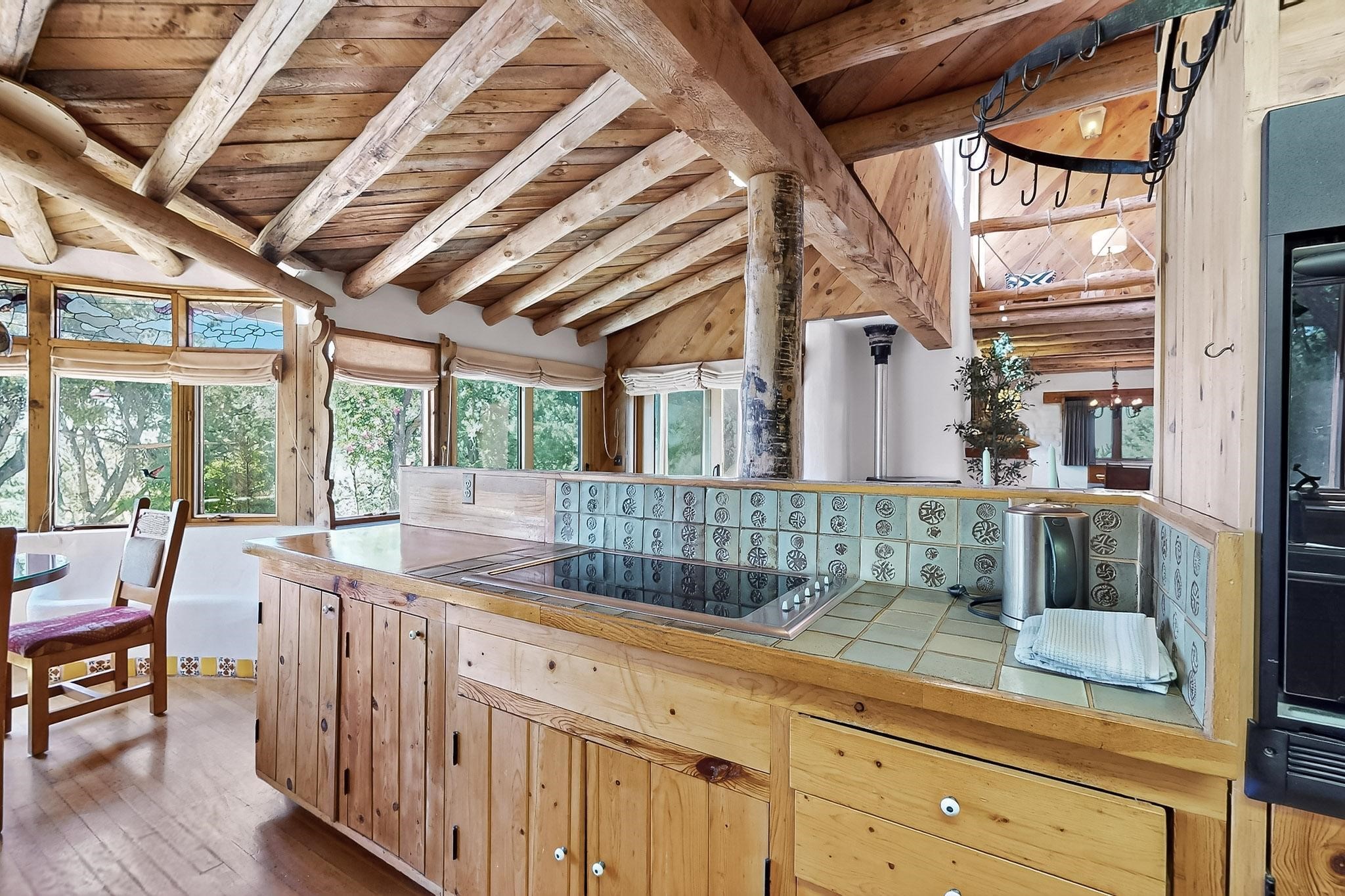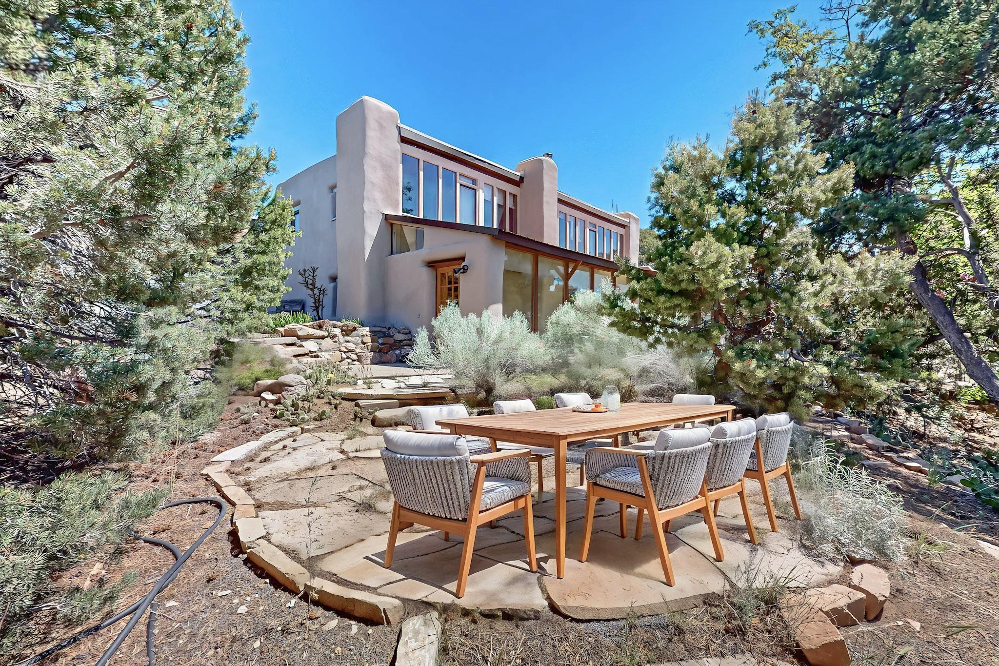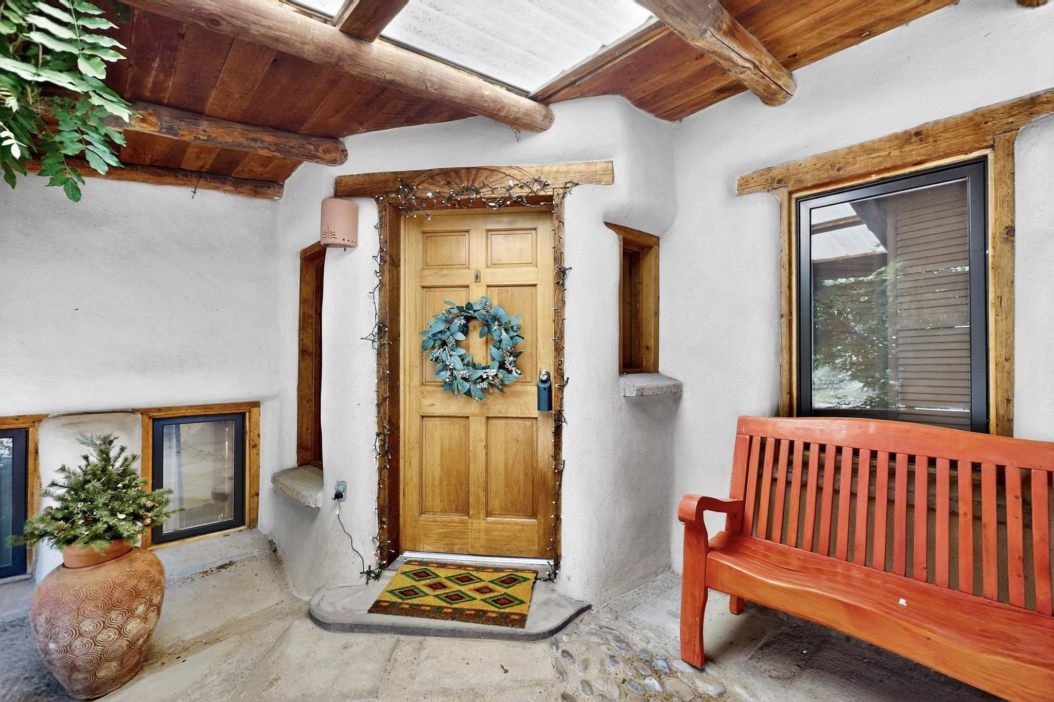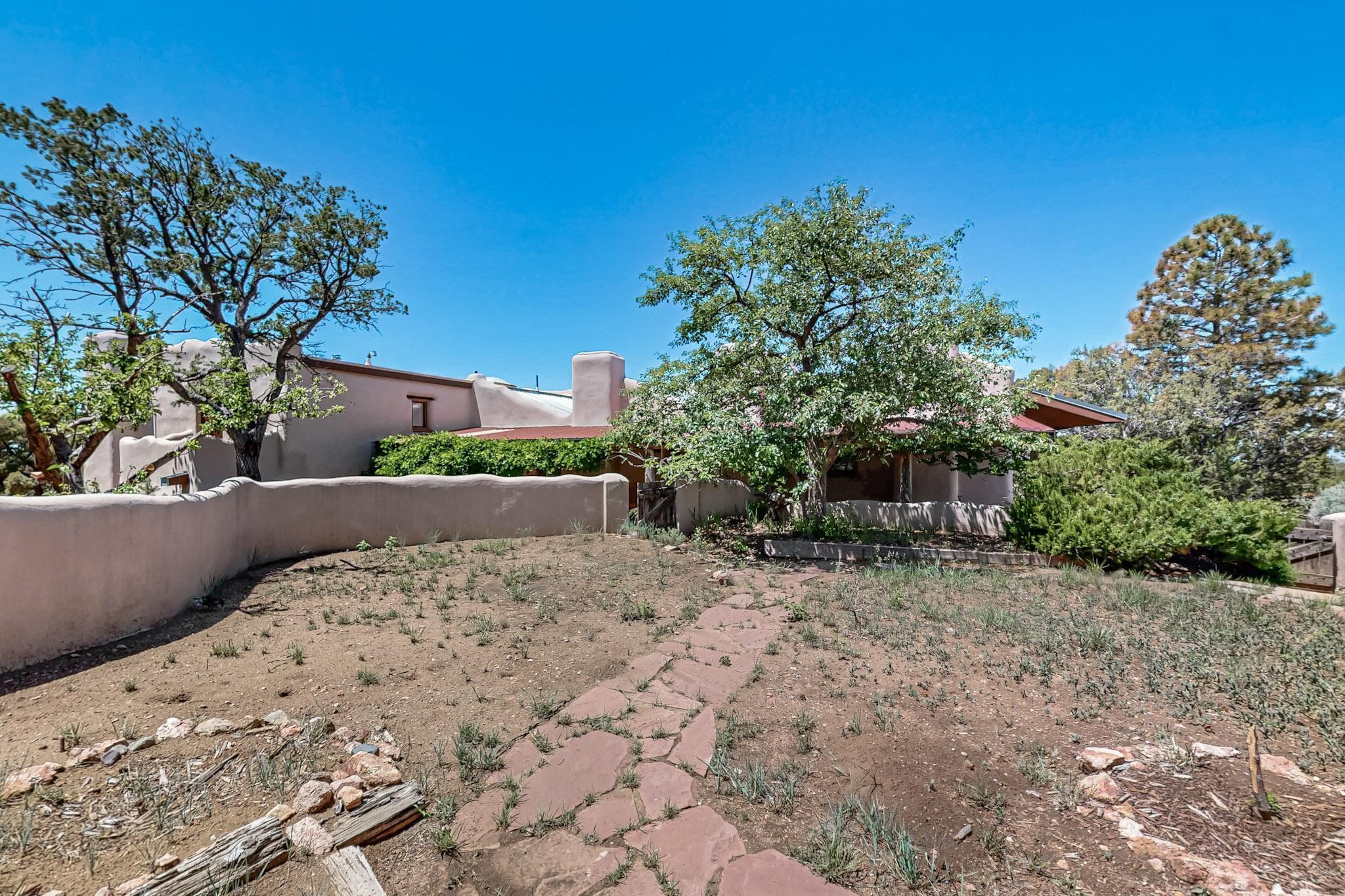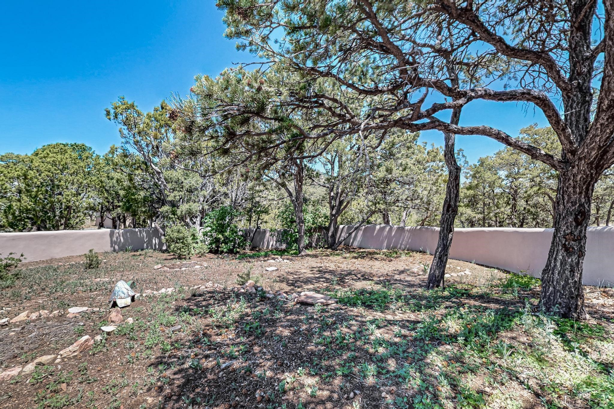 Tucked along the iconic Old Santa Fe Trail, ideal as a primary or get away residence, this enchanting adobe & frame-built appx 3147 sqft main home with an appx 480 sqft attached studio offers country living yet only 8 miles from the heart of downtown Santa Fe & close to amenities & restaurants (Harrys Rd House, El Gancho & more). Perfectly sited on 7.56 acres comprised of 4.56 acres + an additional lot of 3 acres, this property captures breathtaking panoramas of the Pecos & Galisteo Basins, Sandia & Jemez Mountains, & spectacular sunsets. Inside, you'll find a warm & inviting layout with a living room, kitchen with eat in nook, dining area, the charming "bottle" entry, a pantry, 3 bedrooms and 2.5 bathrooms, with a 3-car garage setup: a one-car attached garage w/ storage/workshop space, plus a detached two-car garage--all in an engaging split-level design full of Santa Fe charm & character with hand-crafted details including vigas, carved lintels, stain glass accents & more. The passive solar design with large south-facing windows & a pellet stove is efficient for heating, while adobe construction helps maintain comfortable indoor temperatures year-round. The wonderful appx 480-sqft studio with its own entrance, half bath, stainless steel work area, tongue & groove ceiling, sink & a propane heater--ideal as a home office, playroom, fitness or media room, or an easy guest suite conversion. Features/amenities include: NEW SEPTIC TANK, brick, tile & wood floors, kitchen with a conventional/convection oven, Bosch dishwasher & refrigerator, Pella windows, Artesanos fixtures, handmade tiles, solid wood doors, a balcony, peaceful patios, a pond, covered portals, walled courtyard, flagstone walkways, regraded and graveled driveway (no dirt) and more. There's even a dedicated "dog room" or additional storage leading to an appx 8-foot coyote-fenced enclosure. Gardeners will love the spacious greenhouse with sink & walled garden with apple trees ready for planting and harvest.