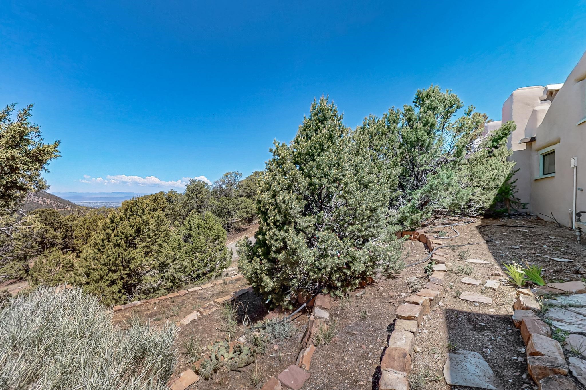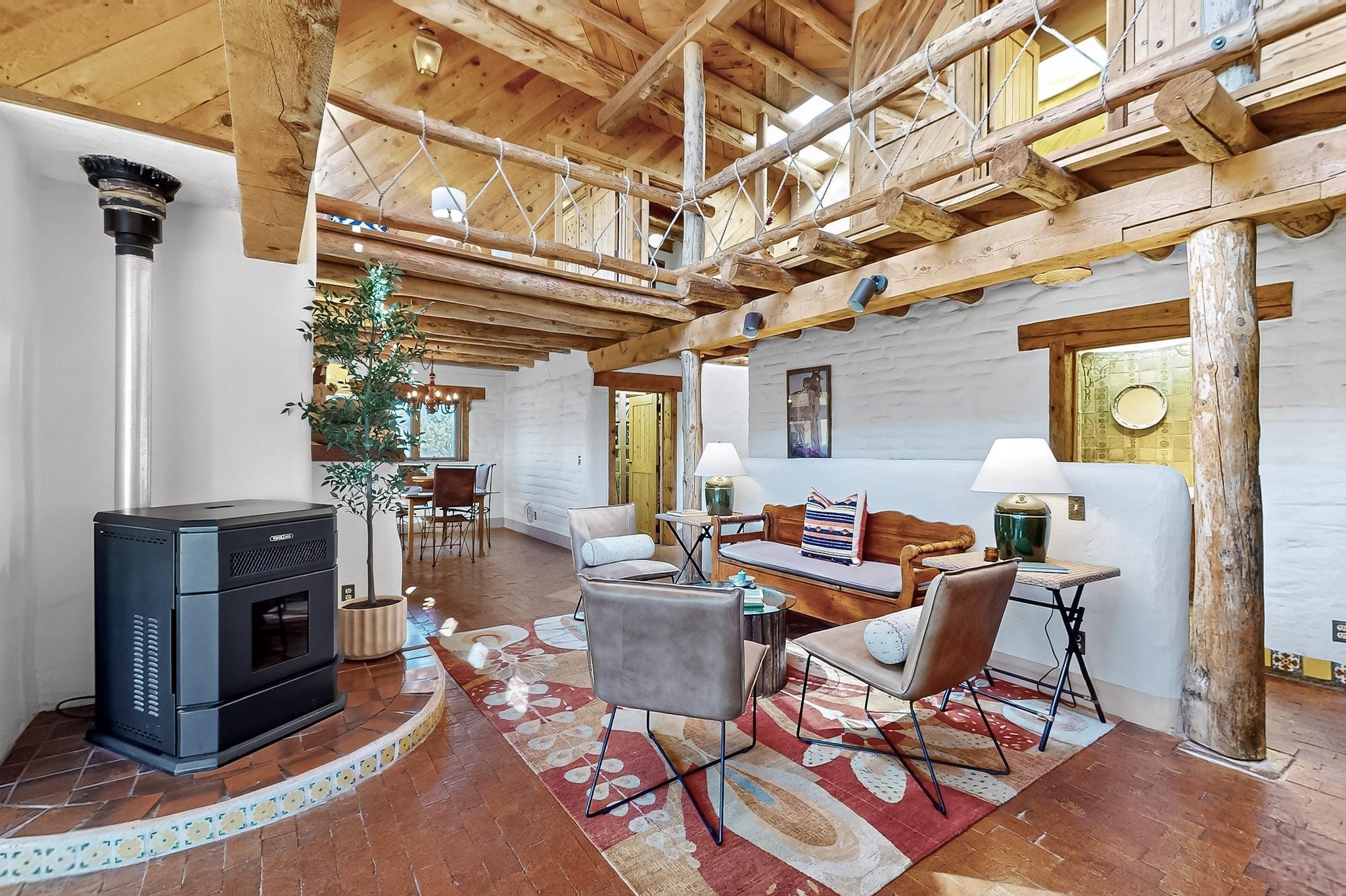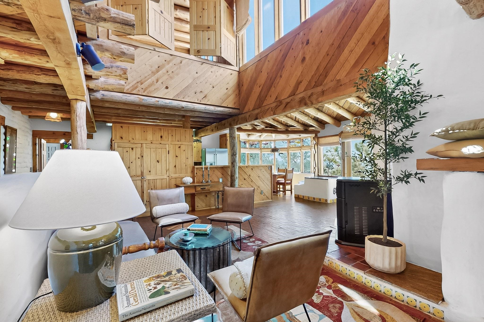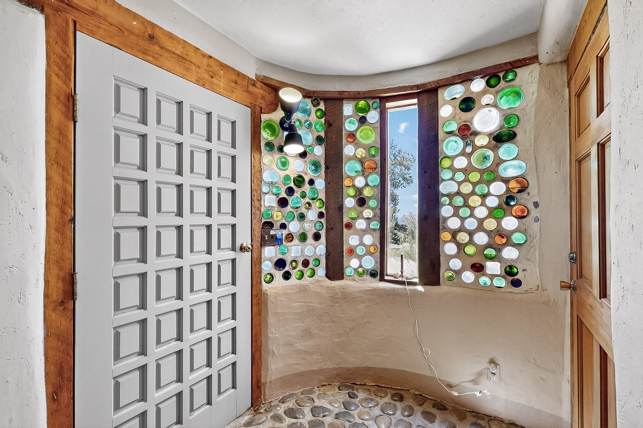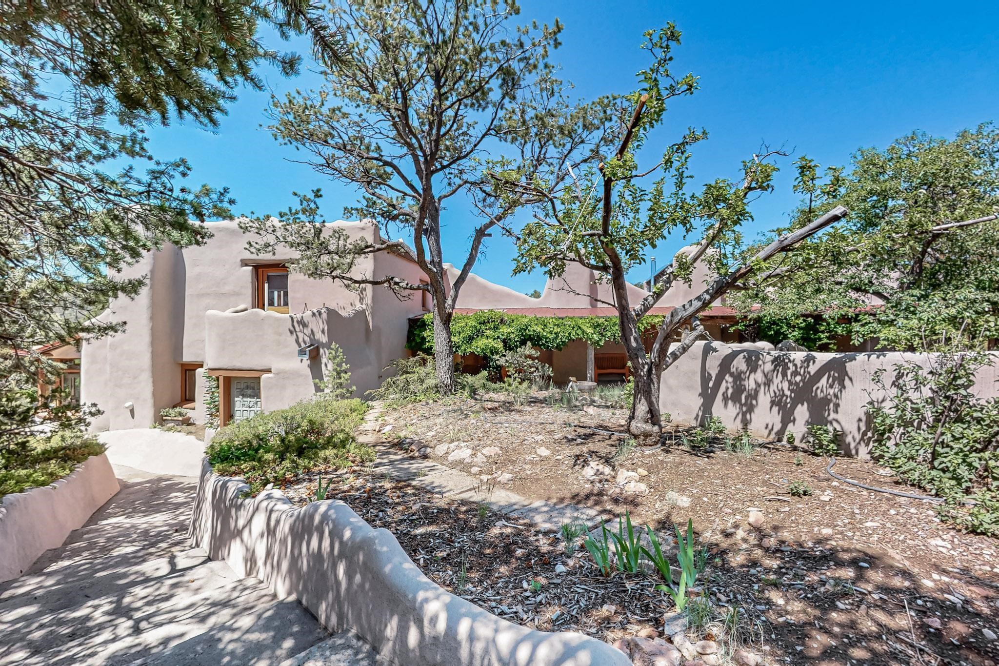 Tucked along the iconic Old Santa Fe Trail, ideal as a primary or get away residence, this enchanting adobe & frame-built appx 3147 sqft main home with an appx 480 sqft attached studio offers country living yet only 8 miles from the heart of downtown Santa Fe & close to amenities & restaurants (Harrys Rd House, El Gancho & more). Perfectly sited on 7.56 acres comprised of 4.56 acres + an additional lot of 3 acres, this property captures breathtaking panoramas of the Pecos & Galisteo Basins, Sandia & Jemez Mountains, & spectacular sunsets. Inside, you'll find a warm & inviting layout with a living room, kitchen with eat in nook, dining area, the charming "bottle" entry, a pantry, 3 bedrooms and 2.5 bathrooms, with a 3-car garage setup: a one-car attached garage w/ storage/workshop space, plus a detached two-car garage--all in an engaging split-level design full of Santa Fe charm & character with hand-crafted details including vigas, carved lintels, stain glass accents & more. The passive solar design with large south-facing windows & a pellet stove is efficient for heating, while adobe construction helps maintain comfortable indoor temperatures year-round. The wonderful appx 480-sqft studio with its own entrance, half bath, stainless steel work area, tongue & groove ceiling, sink & a propane heater--ideal as a home office, playroom, fitness or media room, or an easy guest suite conversion. Features/amenities include: NEW SEPTIC TANK, brick, tile & wood floors, kitchen with a conventional/convection oven, Bosch dishwasher & refrigerator, Pella windows, Artesanos fixtures, handmade tiles, solid wood doors, a balcony, peaceful patios, a pond, covered portals, walled courtyard, flagstone walkways, regraded and graveled driveway (no dirt) and more. There's even a dedicated "dog room" or additional storage leading to an appx 8-foot coyote-fenced enclosure. Gardeners will love the spacious greenhouse with sink & walled garden with apple trees ready for planting and harvest.