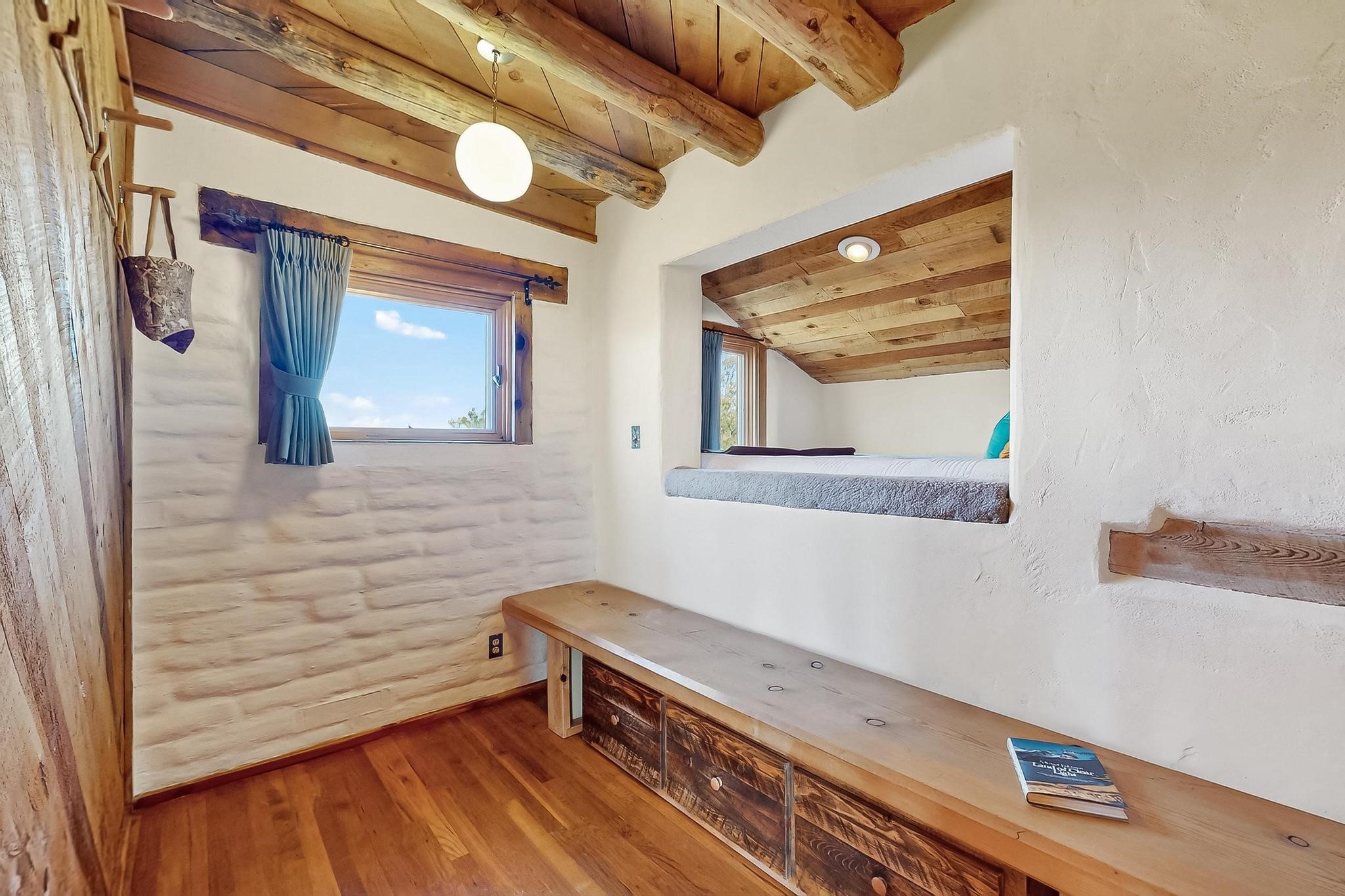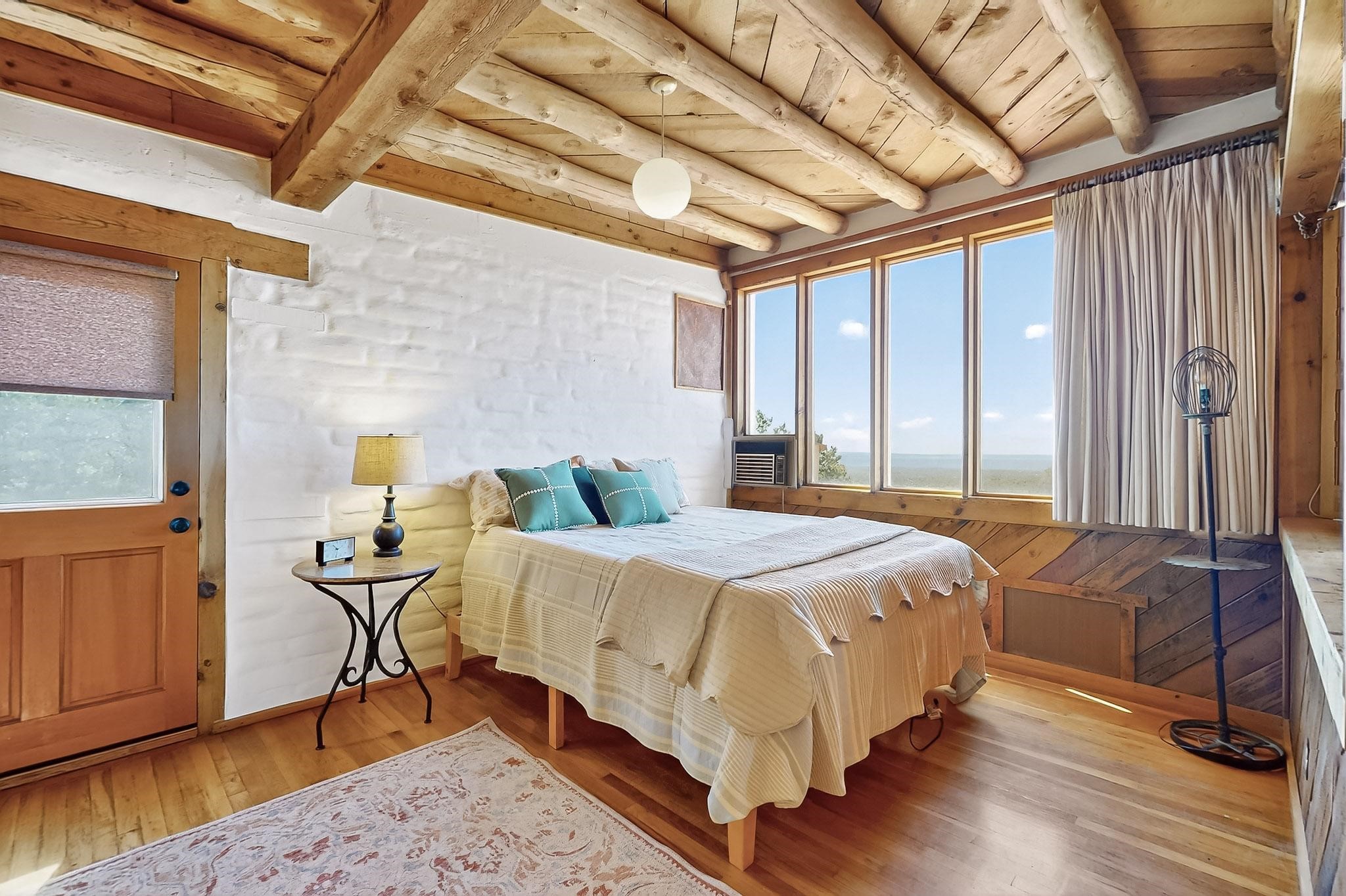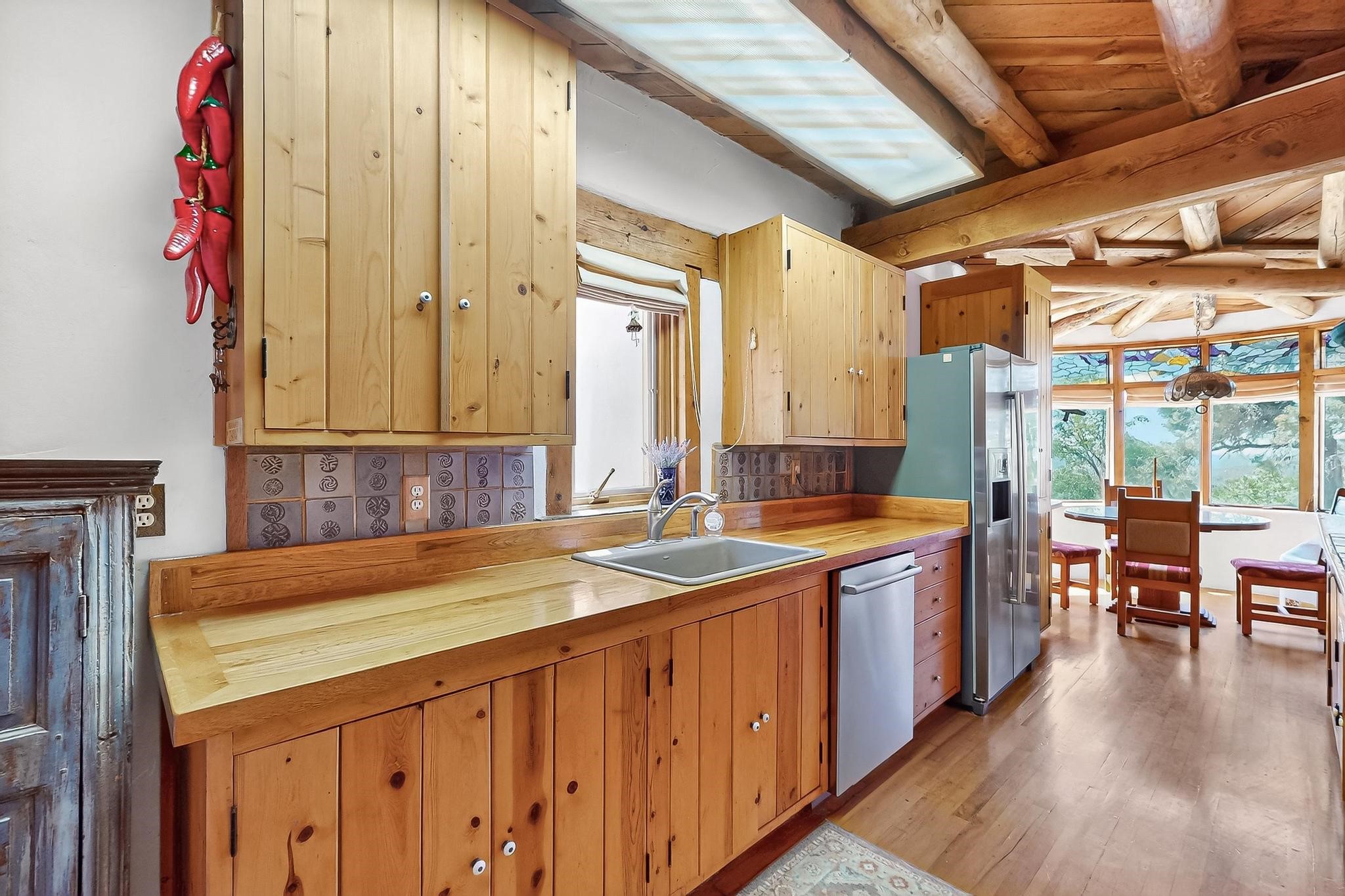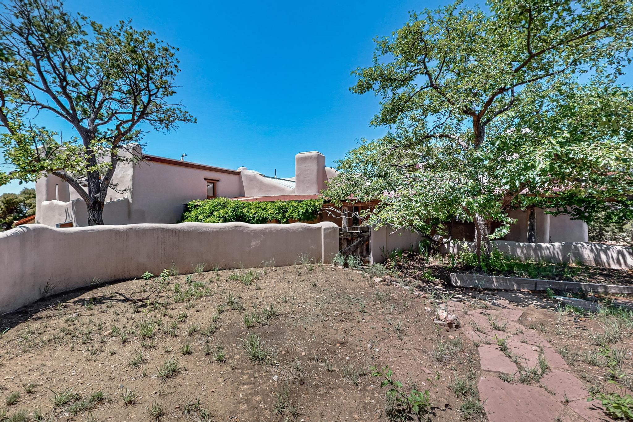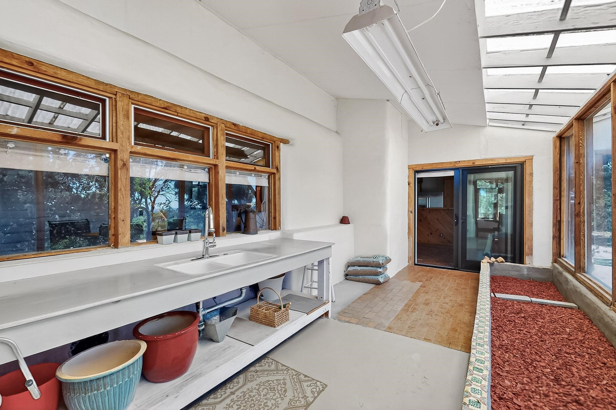 Tucked along the iconic Old Santa Fe Trail, ideal as a primary or get away residence, this enchanting adobe & frame-built appx 3147 sqft main home with an appx 480 sqft attached studio offers country living yet only 8 miles from the heart of downtown Santa Fe & close to amenities & restaurants (Harrys Rd House, El Gancho & more). Perfectly sited on 7.56 acres comprised of 4.56 acres + an additional lot of 3 acres, this property captures breathtaking panoramas of the Pecos & Galisteo Basins, Sandia & Jemez Mountains, & spectacular sunsets. Inside, you'll find a warm & inviting layout with a living room, kitchen with eat in nook, dining area, the charming "bottle" entry, a pantry, 3 bedrooms and 2.5 bathrooms, with a 3-car garage setup: a one-car attached garage w/ storage/workshop space, plus a detached two-car garage--all in an engaging split-level design full of Santa Fe charm & character with hand-crafted details including vigas, carved lintels, stain glass accents & more. The passive solar design with large south-facing windows & a pellet stove is efficient for heating, while adobe construction helps maintain comfortable indoor temperatures year-round. The wonderful appx 480-sqft studio with its own entrance, half bath, stainless steel work area, tongue & groove ceiling, sink & a propane heater--ideal as a home office, playroom, fitness or media room, or an easy guest suite conversion. Features/amenities include: NEW SEPTIC TANK, brick, tile & wood floors, kitchen with a conventional/convection oven, Bosch dishwasher & refrigerator, Pella windows, Artesanos fixtures, handmade tiles, solid wood doors, a balcony, peaceful patios, a pond, covered portals, walled courtyard, flagstone walkways, regraded and graveled driveway (no dirt) and more. There's even a dedicated "dog room" or additional storage leading to an appx 8-foot coyote-fenced enclosure. Gardeners will love the spacious greenhouse with sink & walled garden with apple trees ready for planting and harvest.