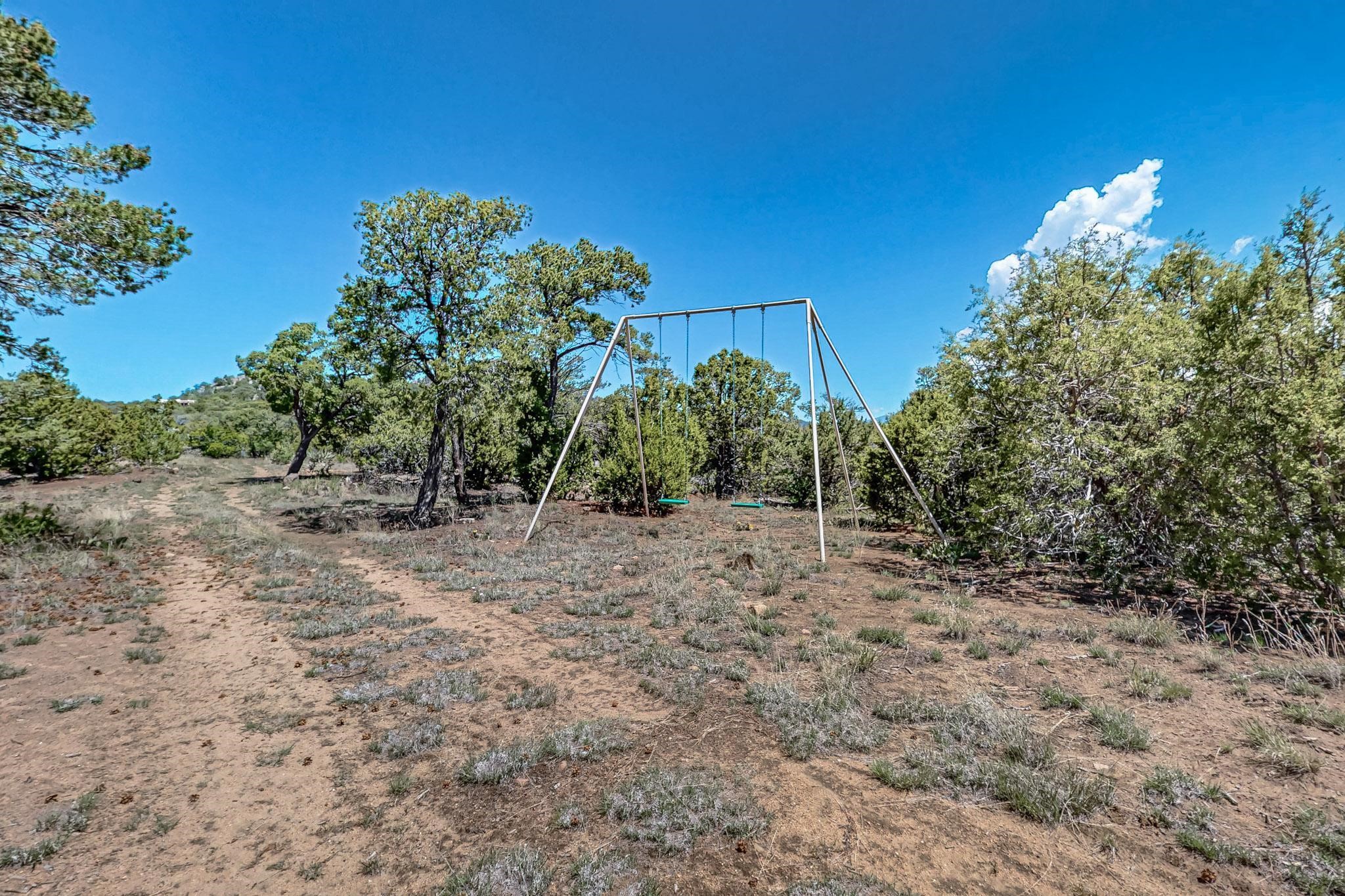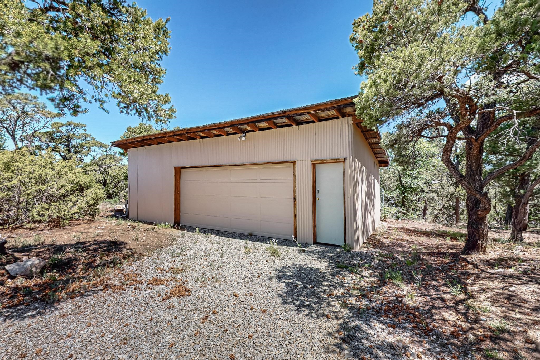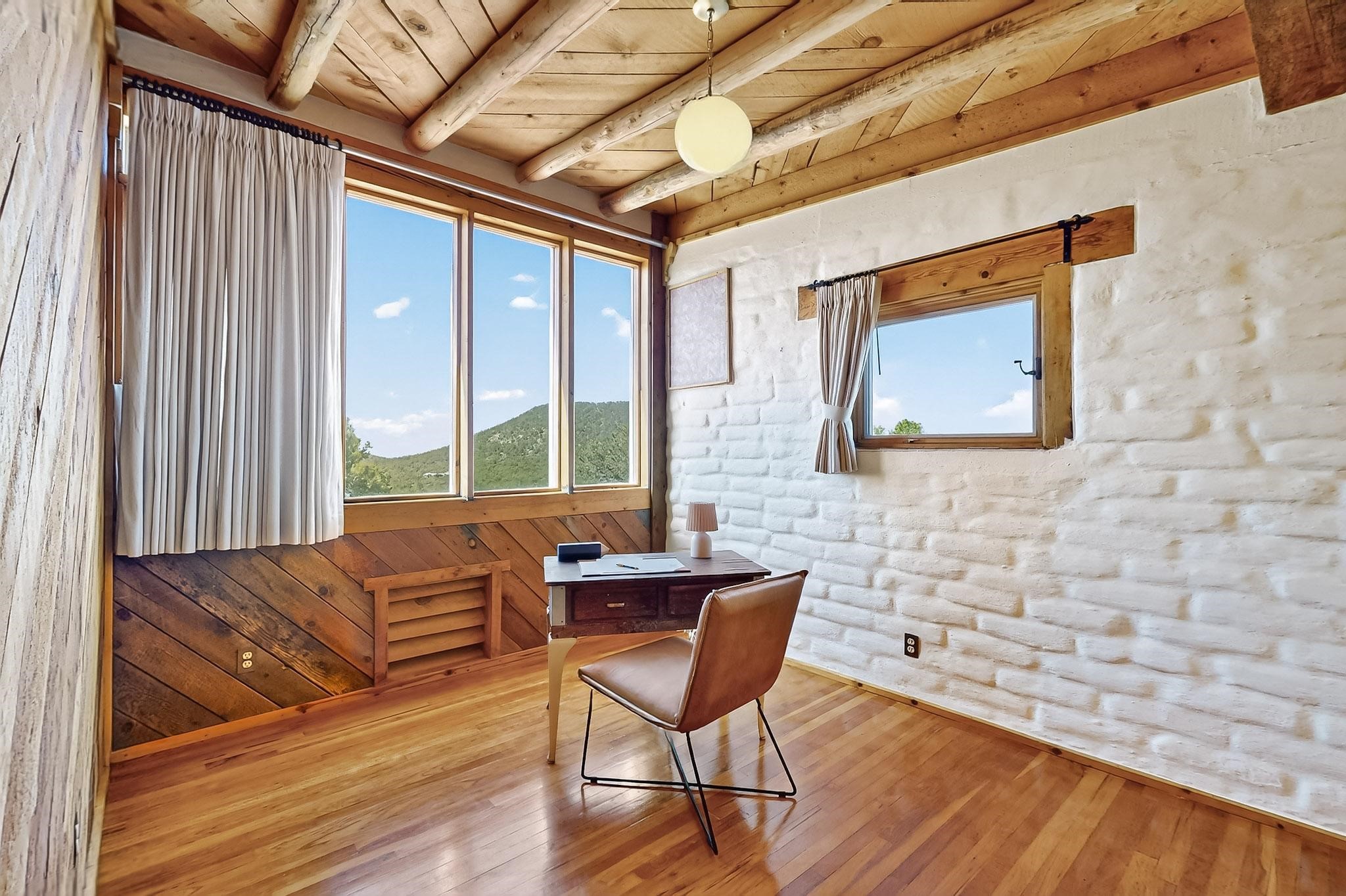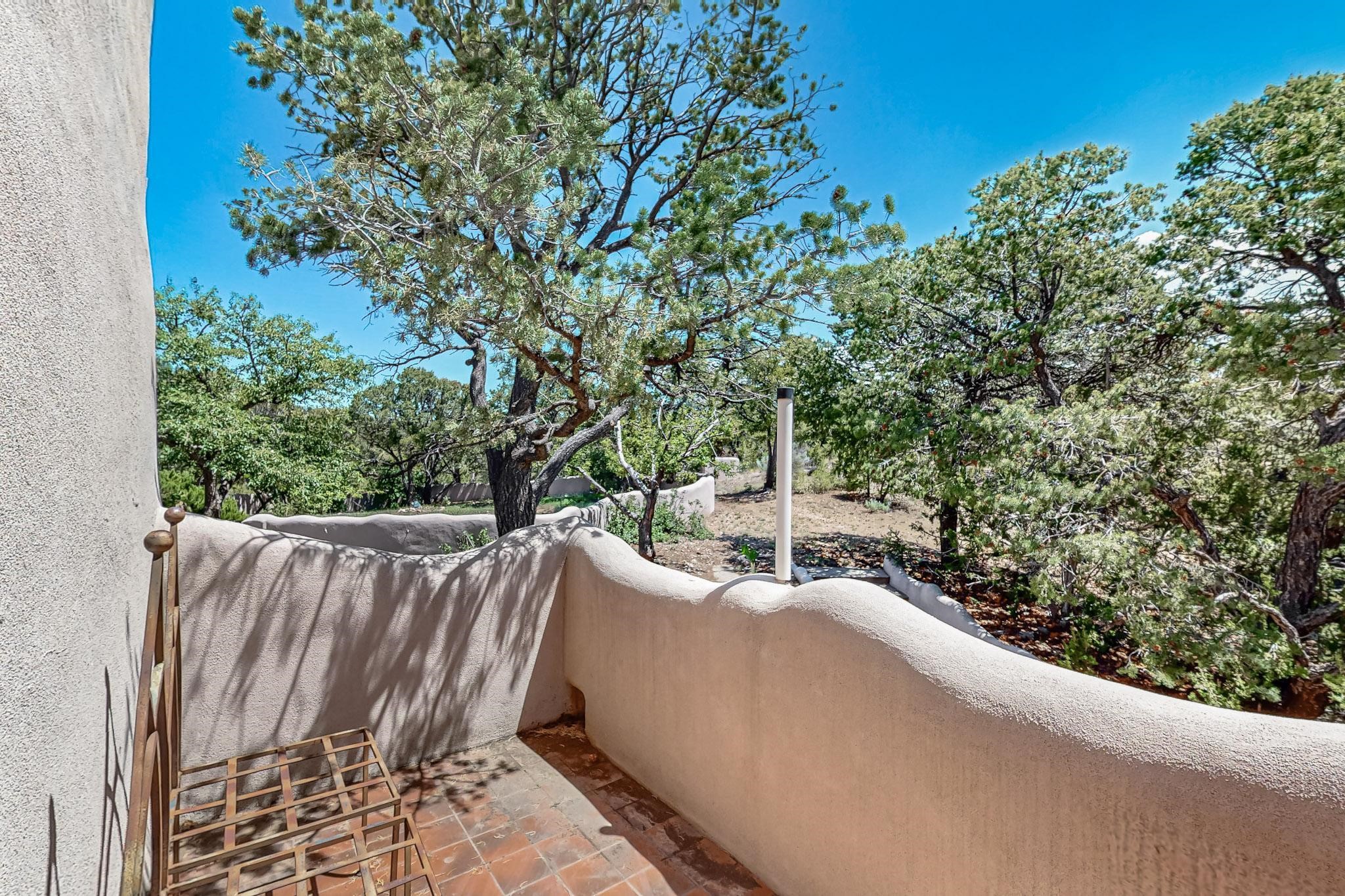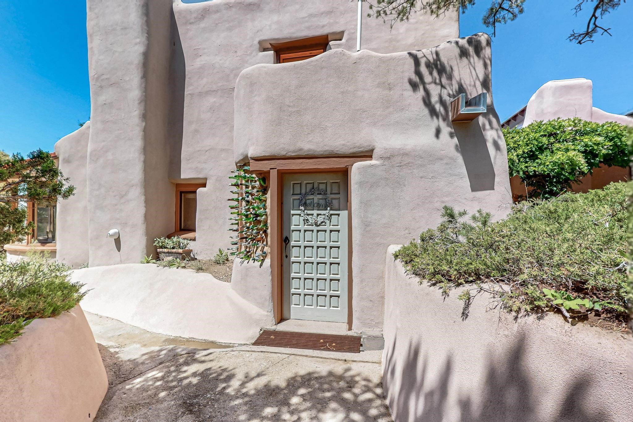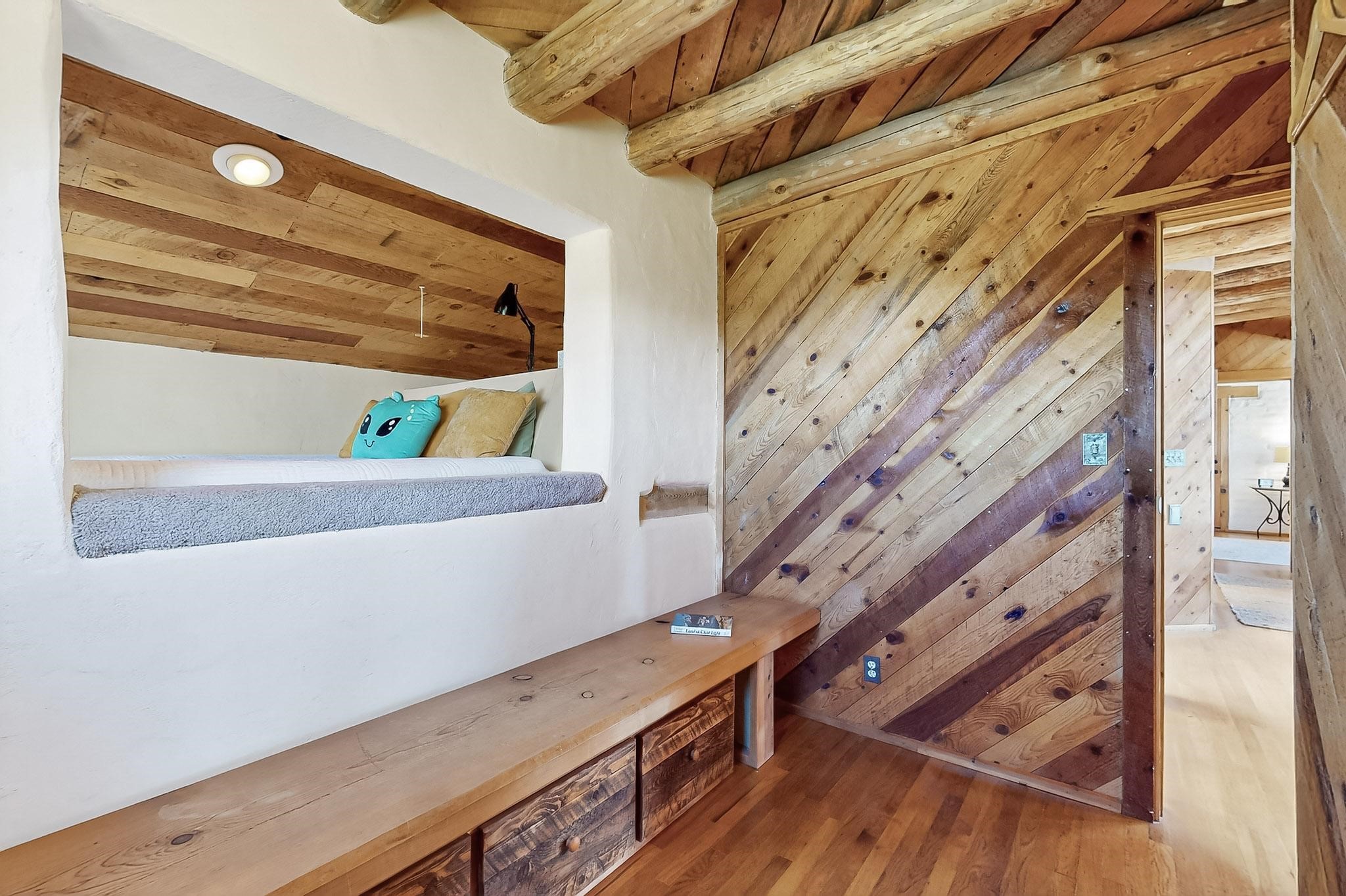 Tucked along the iconic Old Santa Fe Trail, ideal as a primary or get away residence, this enchanting adobe & frame-built appx 3147 sqft main home with an appx 480 sqft attached studio offers country living yet only 8 miles from the heart of downtown Santa Fe & close to amenities & restaurants (Harrys Rd House, El Gancho & more). Perfectly sited on 7.56 acres comprised of 4.56 acres + an additional lot of 3 acres, this property captures breathtaking panoramas of the Pecos & Galisteo Basins, Sandia & Jemez Mountains, & spectacular sunsets. Inside, you'll find a warm & inviting layout with a living room, kitchen with eat in nook, dining area, the charming "bottle" entry, a pantry, 3 bedrooms and 2.5 bathrooms, with a 3-car garage setup: a one-car attached garage w/ storage/workshop space, plus a detached two-car garage--all in an engaging split-level design full of Santa Fe charm & character with hand-crafted details including vigas, carved lintels, stain glass accents & more. The passive solar design with large south-facing windows & a pellet stove is efficient for heating, while adobe construction helps maintain comfortable indoor temperatures year-round. The wonderful appx 480-sqft studio with its own entrance, half bath, stainless steel work area, tongue & groove ceiling, sink & a propane heater--ideal as a home office, playroom, fitness or media room, or an easy guest suite conversion. Features/amenities include: NEW SEPTIC TANK, brick, tile & wood floors, kitchen with a conventional/convection oven, Bosch dishwasher & refrigerator, Pella windows, Artesanos fixtures, handmade tiles, solid wood doors, a balcony, peaceful patios, a pond, covered portals, walled courtyard, flagstone walkways, regraded and graveled driveway (no dirt) and more. There's even a dedicated "dog room" or additional storage leading to an appx 8-foot coyote-fenced enclosure. Gardeners will love the spacious greenhouse with sink & walled garden with apple trees ready for planting and harvest.