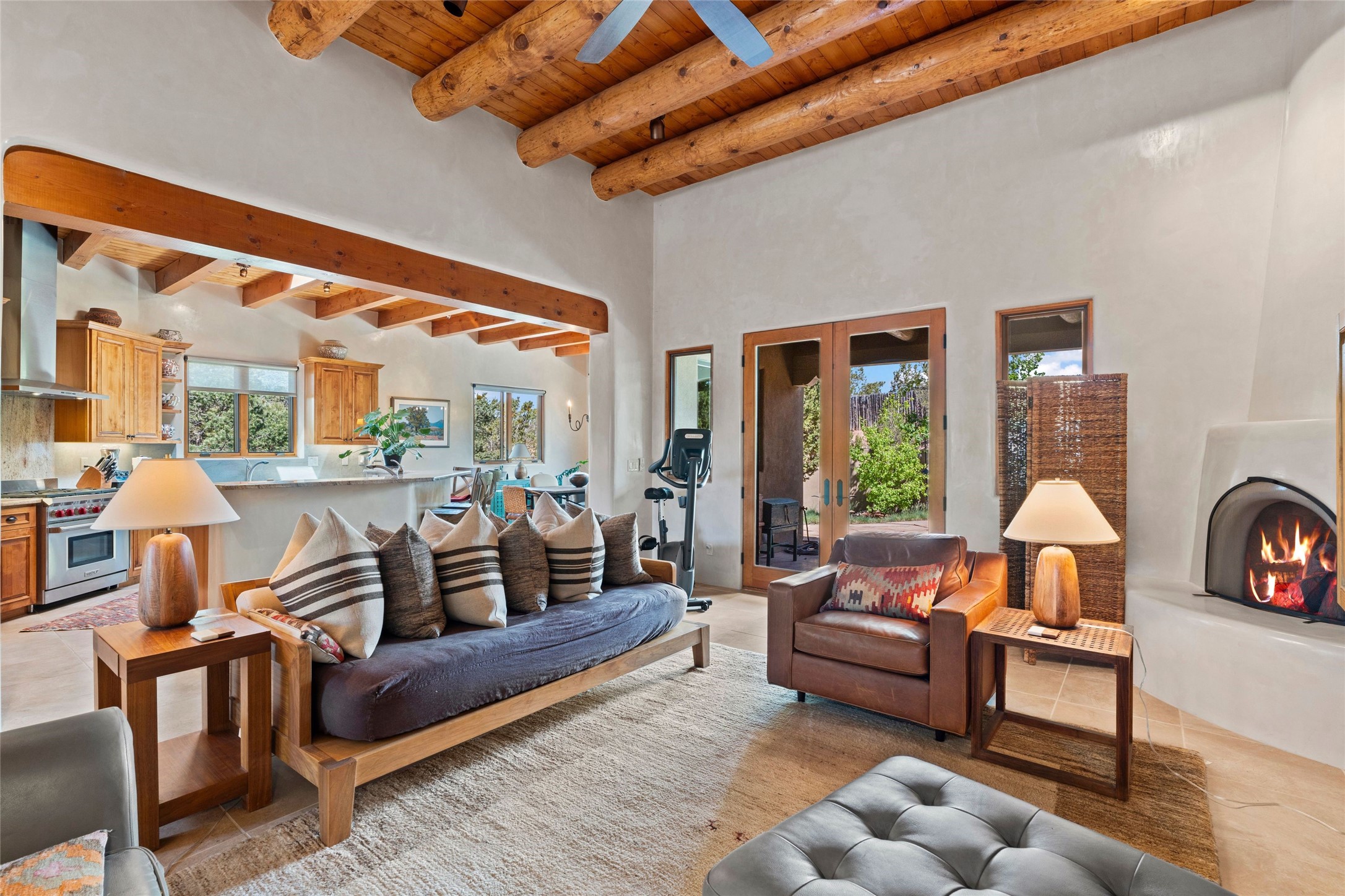 Explore the inviting three-bedroom, two-bath home situated on a cul-de-sac lot on 1.06 acres in the highly desirable, close in neighborhood of Valle Chamiso. Constructed in 2013 by John Di Janni Homes, this residence showcases high-end finishes that elevate its appeal, including expertly plastered walls and three fireplaces, featuring a distinctive outdoor kiva. The interior is enhanced with knotty alder doors, tile and wood flooring, and traditional vigas and beams that add a touch of elegance. The kitchen stands out with premium appliances, including a 36" Wolf range, creating an ideal space for culinary exploration. This single-level home offers convenience with no interior steps, making it accessible for everyone. Recognized with the 2013 Hacienda Homes Parade 2013 People's Choice Award, this property reflects a commitment to quality and thoughtful design. An oversized, insulated two-car garage provides generous space for vehicles and storage needs. Environmentally conscious features include compliance with the City of Santa Fe Green Code, a 57 HERS rating, Energy Star appliances, and a tankless water heater, ensuring energy efficiency and sustainability. Enjoy outdoor living with the charming portal and patio, perfect for gatherings or relaxation. The enclosed backyard features ample green space, ideal for gardening or leisure activities. Conveniently located near Santa Fe Plaza, Museum Hill, and a variety of dining, medical facilities, and shopping options, this property combines luxury with practicality in a vibrant community.