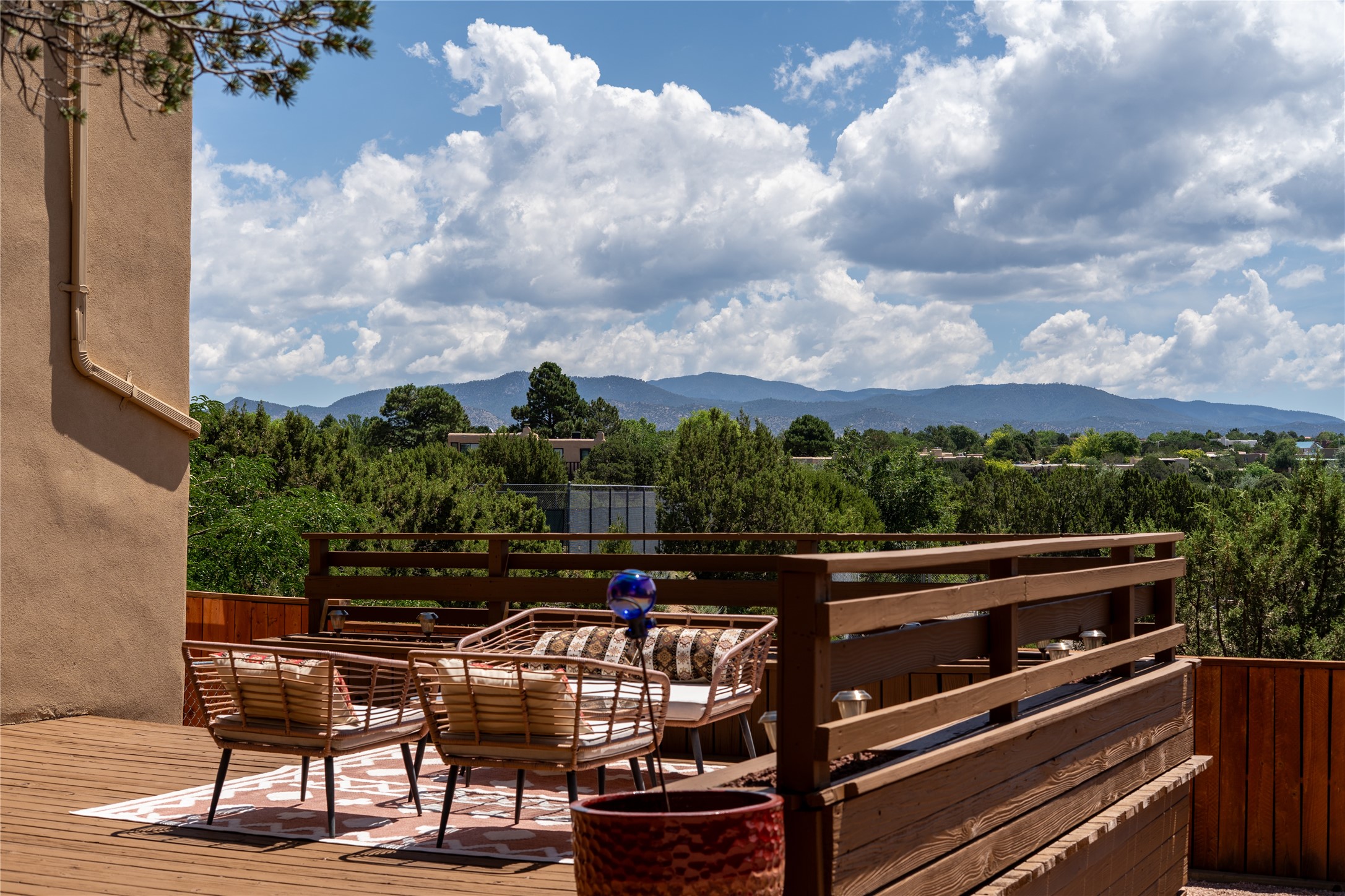 Tucked at the end of a peaceful cul-de-sac in Santa Fe's highly sought-after Park Plazas neighborhood, this charming and character-rich 3-bed, 3-bath home offers a distinctive layout with zones for spirited gatherings and quiet reflection alike. An abundance of bright, natural light fills the home. Vignettes of lush greenery beckon at every turn through large picture windows. Bathe amidst mature juniper trees in the primary suite with views southward to the Sandias. Soak in stunning Sangre de Cristo mountain vistas to the east from a generous living space inside, or from one of the multiple inviting outdoor spaces. Al fresco dining, entertaining, relaxing, and star-gazing--possibilities abound! Tranquil ponds and a waterfall set around gorgeous stonework, a Zen-inspired feature brings the serene ambiance to another level in this immersive sanctuary.A rare sense of privacy and quietude are found at this particular property--thanks to open green space wrapping around roughly 180 degrees of the home. With Park Plazas offering a dynamic blend of tranquility and convenience, you're mere steps from miles of walking trails, tennis courts, and a dog park. And yet - the mall, I-25, and the historic Plaza are all minutes away.With fully paid-off solar panels (resulting in electric bills as low as $1.25 per month), this home is both special and efficient. A brand new washer and dryer(c. 2025), and bonus fridge(2023) round out a generous move-in ready utility room served by a laundry chute. An additional flex room can be converted into many different uses.Custom tile, stonework and light fixtures throughout the home blend New Mexico authenticity with an elevated modern touch. A true oasis where thoughtful design, natural beauty, and modern amenities converge. All inspired by indoor-outdoor living, with mountain views from multiple vantage points and boundless mature trees near and far that feel, quite simply, like home.
