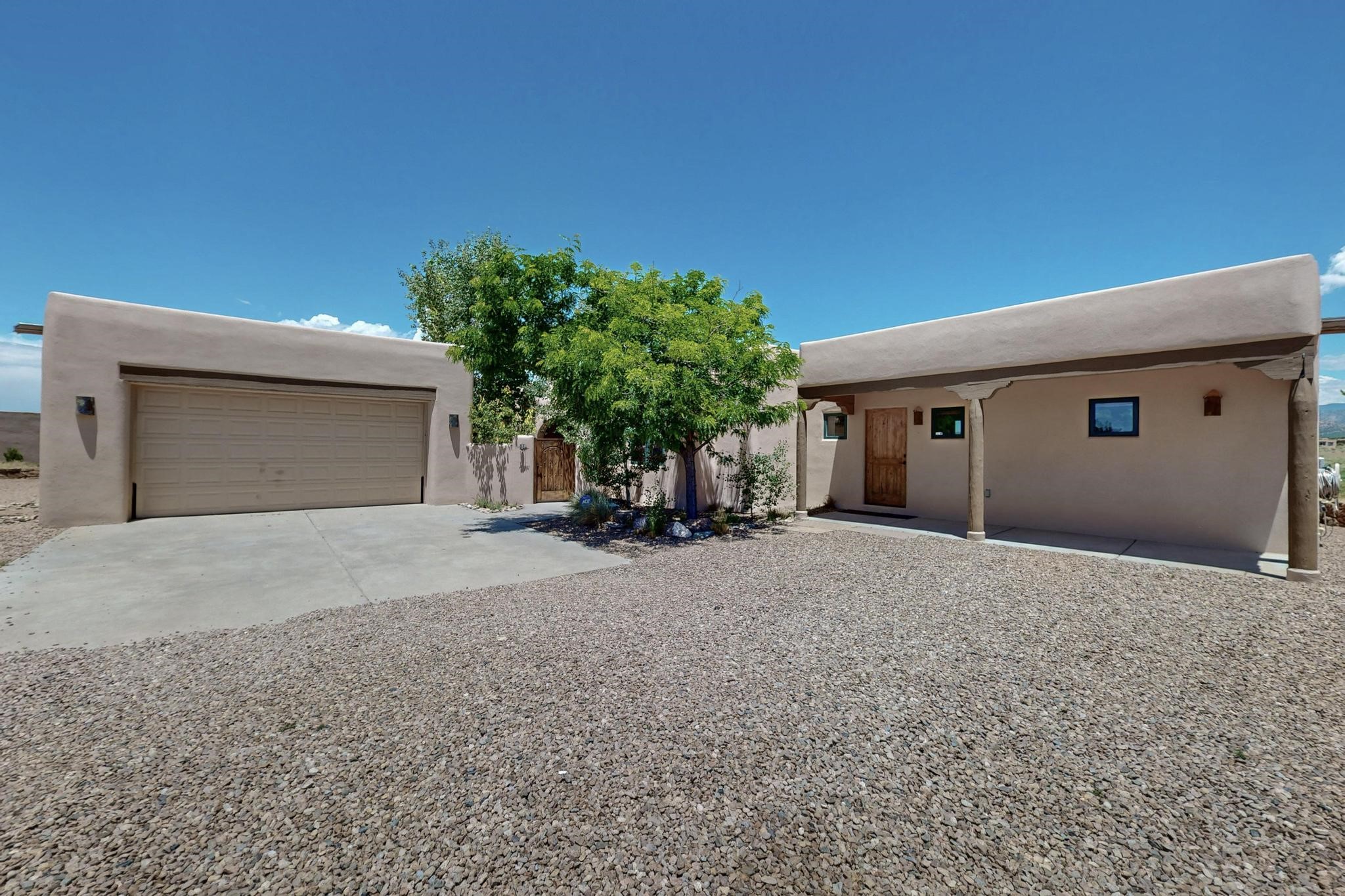 Wonderful custom design built by CPA Construction maximizing panoramic mountain views from across a large greenbelt. A private oasis with large picture windows from which to watch the wildlife go by. A large owners suite, totally separated from the guest wing, features high viga ceilings, a kiva fireplace and large walk in closet. The great room, dining room and kitchen open plan design allows for flexible use of space. There is a WirsboPex natural gas radiant heating system plus mini splits added in 2016 and annually maintained create comfortable summer and winter living. The roof was replaced with TPO in 2021, and stucco maintained recently. An additional 2 room and 1 bath casita /studio area with both direct entry from the home and an exterior entry. A private well supplies the domestic water and maintains the gardens, and an oversized 2 car finished garage with guest parking. Easy access to Eldorado amenities, parks and trails, local shopping, library, schools and only minutes into Santa Fe.