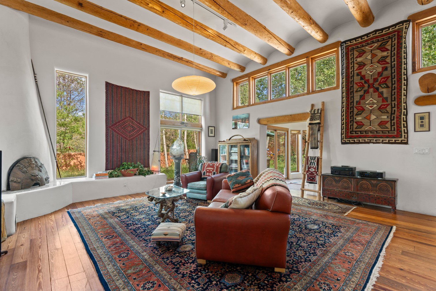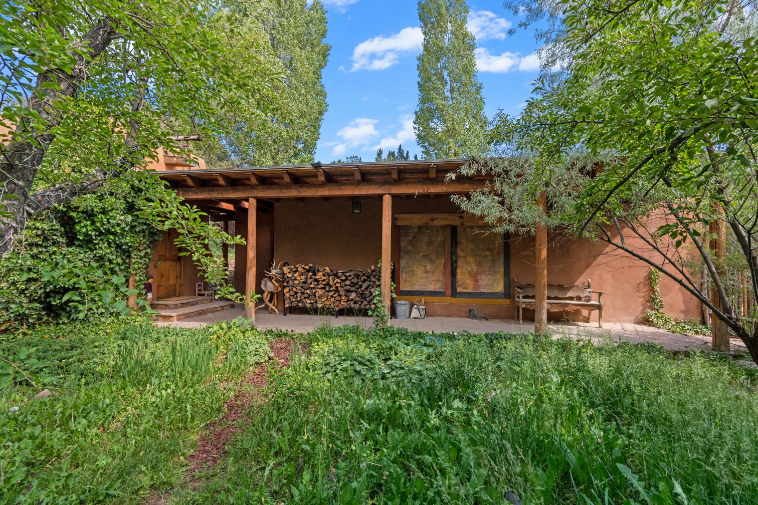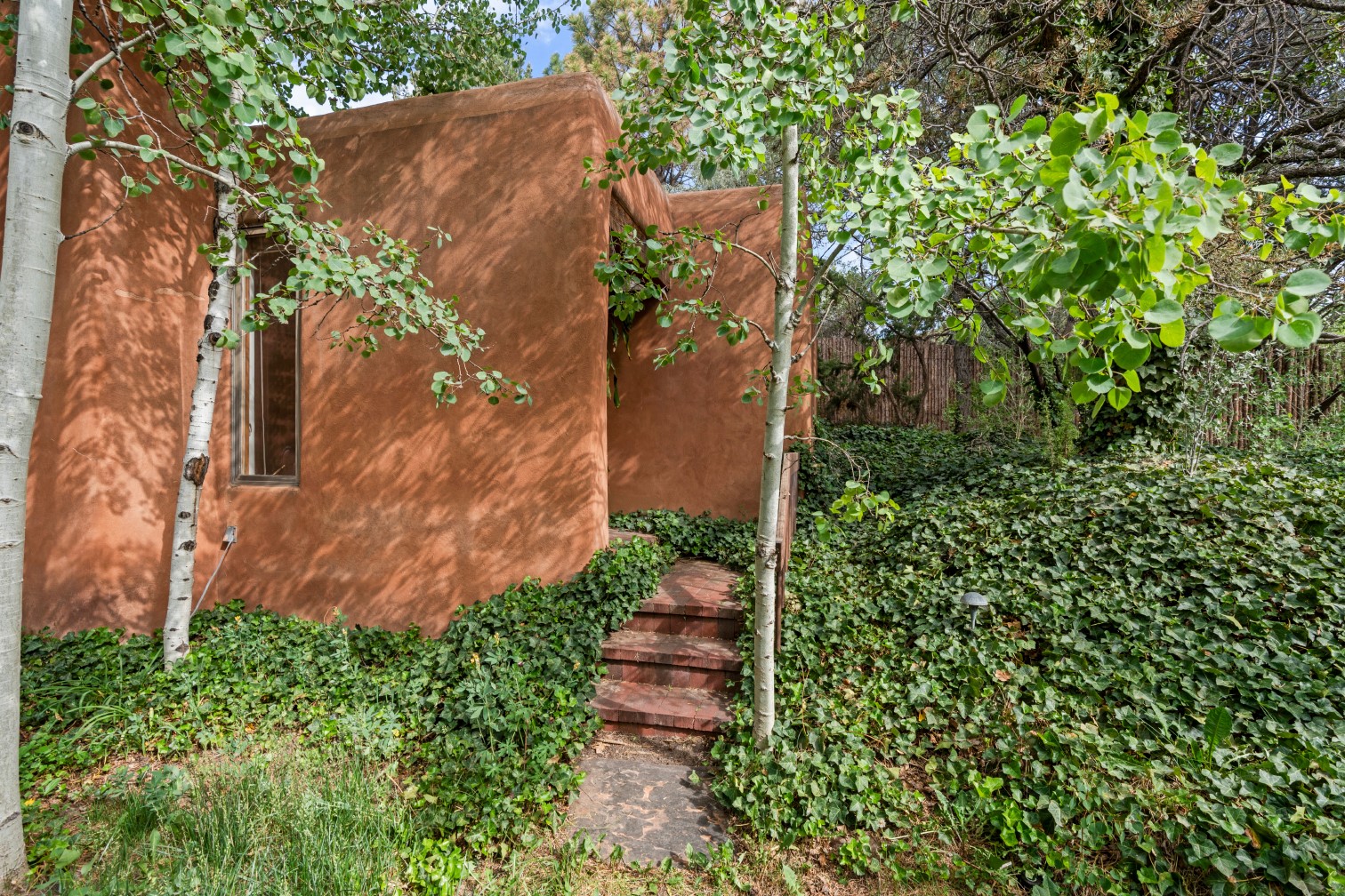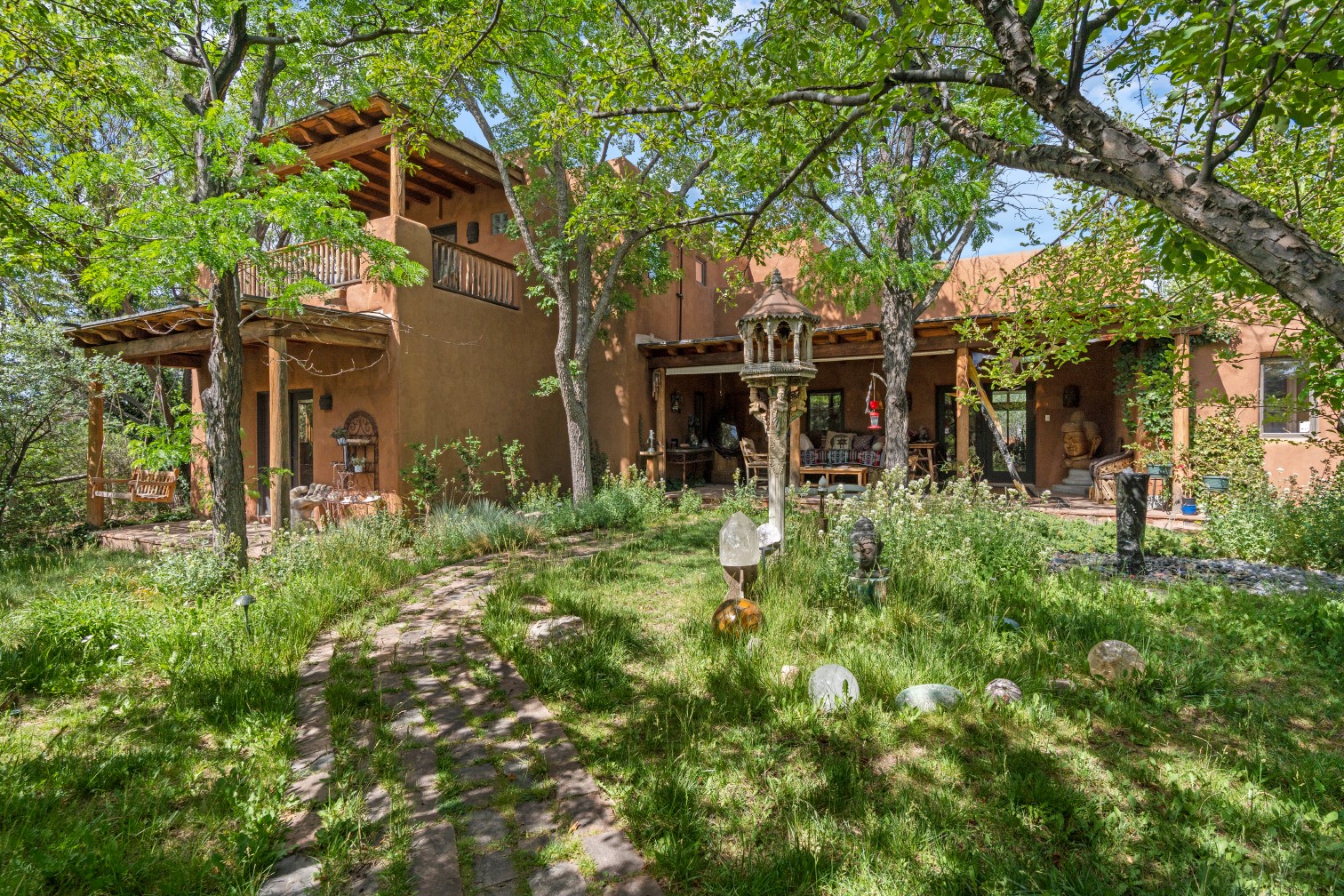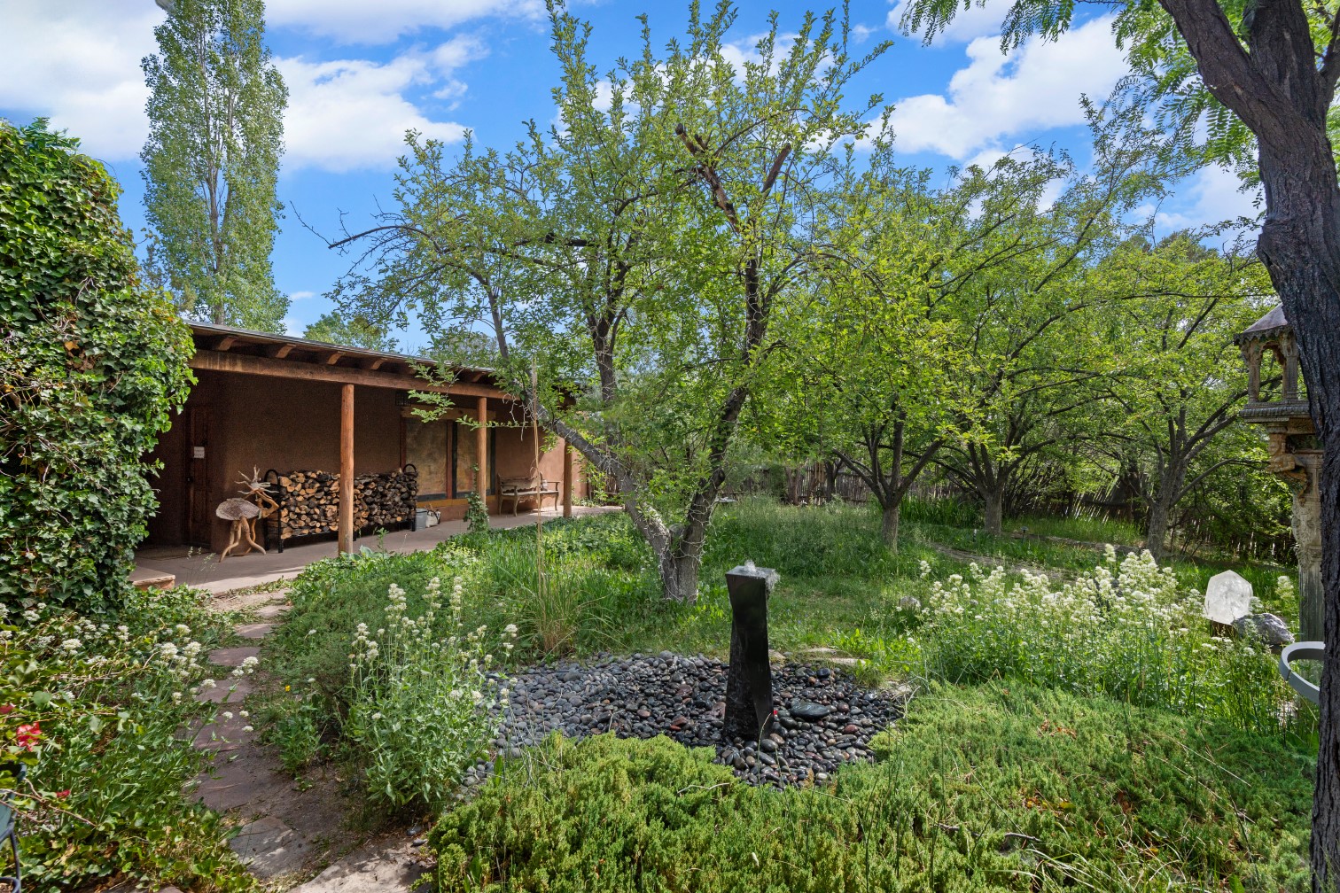 MAJESTIC UPPER EASTSIDE ESTATE - Discover the magic of this classic pueblo-style adobe compound off Upper Canyon Road - a serene oasis with magnificent views of the Sangre de Cristo and Jemez Mountains. Gated and fenced with private access to protected trails (Dorothy Stewart Trails), and on a cul-de-sac, the compound's gates swing open to reveal a stream and waterfall surrounded by day lilies, water lilies, irises, and verdant grasses embellishing extraordinary landscaping and gardens (featured in the 1997 Rizzoli book, Secret Gardens of Santa Fe). The adobe 4-bedroom main residence and 1-bedroom guest house are nestled within 1.14 acres of abundant aspens and towering blue spruce that frame the drama of distant mountains. Features of the main house include 6 fireplaces, ceilings of vigas, latillas and coves, antique doors, custom hardware, radiant under-floor heating, outdoor patios and portals, a media room, yoga studio, and 2-car garage. The upstairs primary suite includes a separate office and three outdoor spaces - a patio / portal, a separate balcony, and a spacious deck - and an elegant bath suite with a custom steam shower and whirlpool tub.