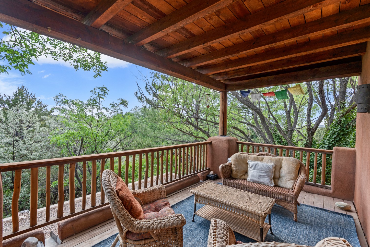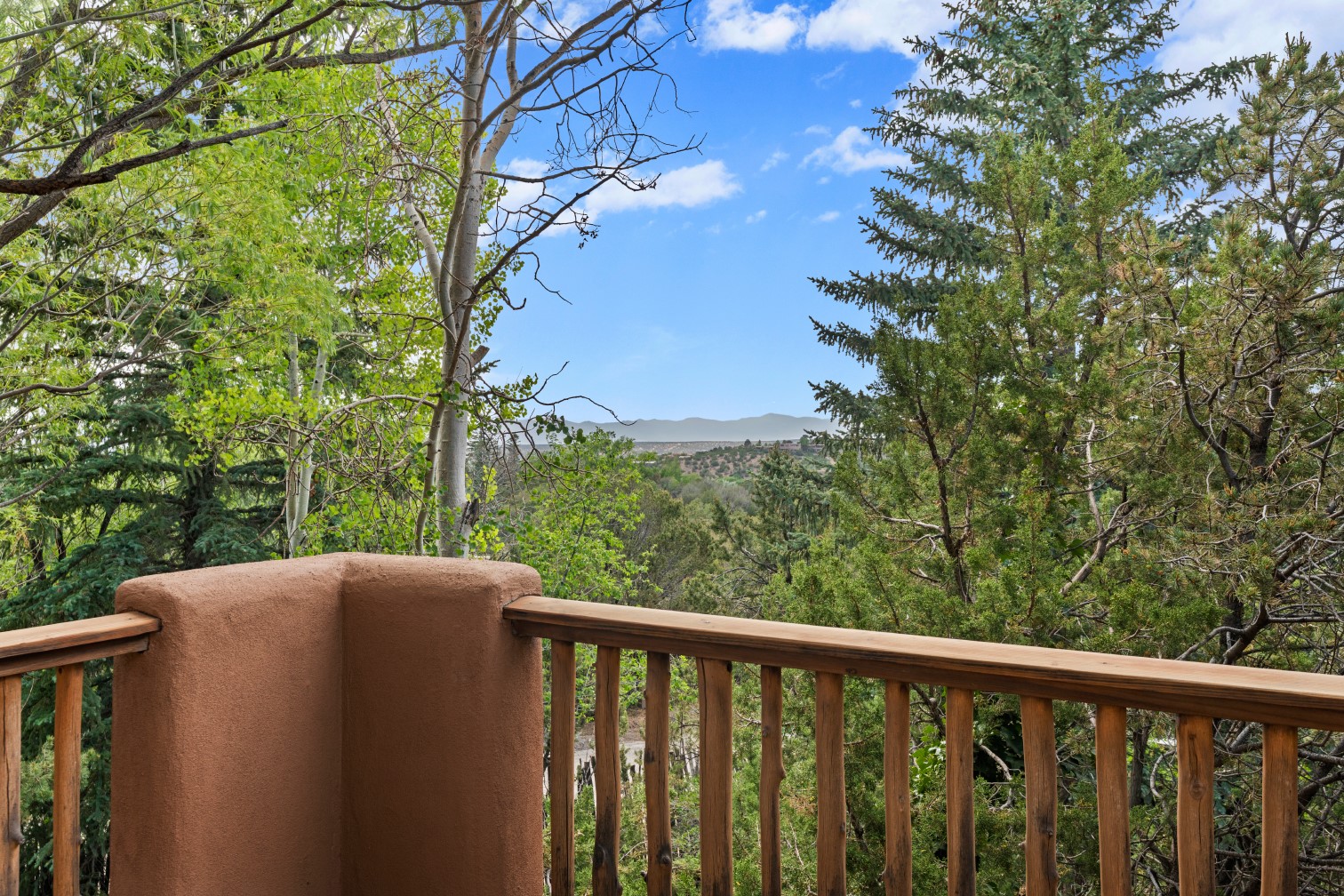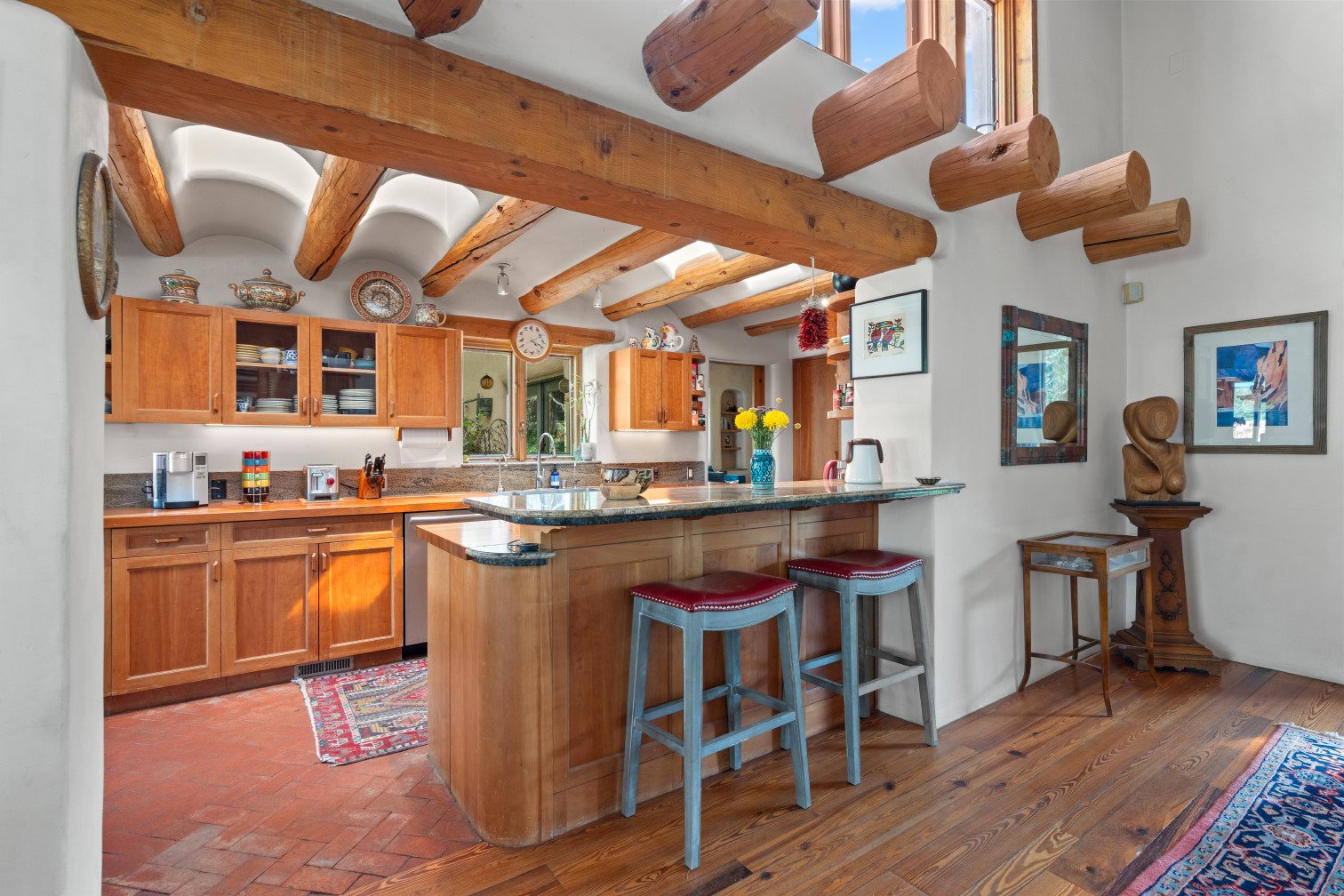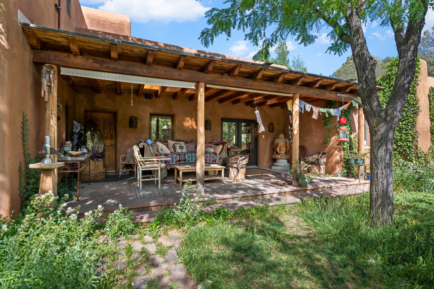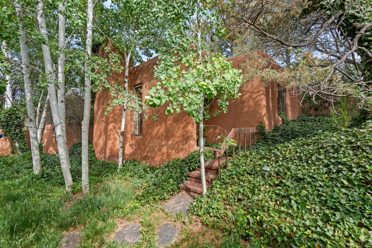 MAJESTIC UPPER EASTSIDE ESTATE - Discover the magic of this classic pueblo-style adobe compound off Upper Canyon Road - a serene oasis with magnificent views of the Sangre de Cristo and Jemez Mountains. Gated and fenced with private access to protected trails (Dorothy Stewart Trails), and on a cul-de-sac, the compound's gates swing open to reveal a stream and waterfall surrounded by day lilies, water lilies, irises, and verdant grasses embellishing extraordinary landscaping and gardens (featured in the 1997 Rizzoli book, Secret Gardens of Santa Fe). The adobe 4-bedroom main residence and 1-bedroom guest house are nestled within 1.14 acres of abundant aspens and towering blue spruce that frame the drama of distant mountains. Features of the main house include 6 fireplaces, ceilings of vigas, latillas and coves, antique doors, custom hardware, radiant under-floor heating, outdoor patios and portals, a media room, yoga studio, and 2-car garage. The upstairs primary suite includes a separate office and three outdoor spaces - a patio / portal, a separate balcony, and a spacious deck - and an elegant bath suite with a custom steam shower and whirlpool tub.