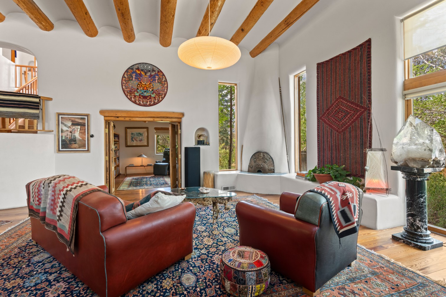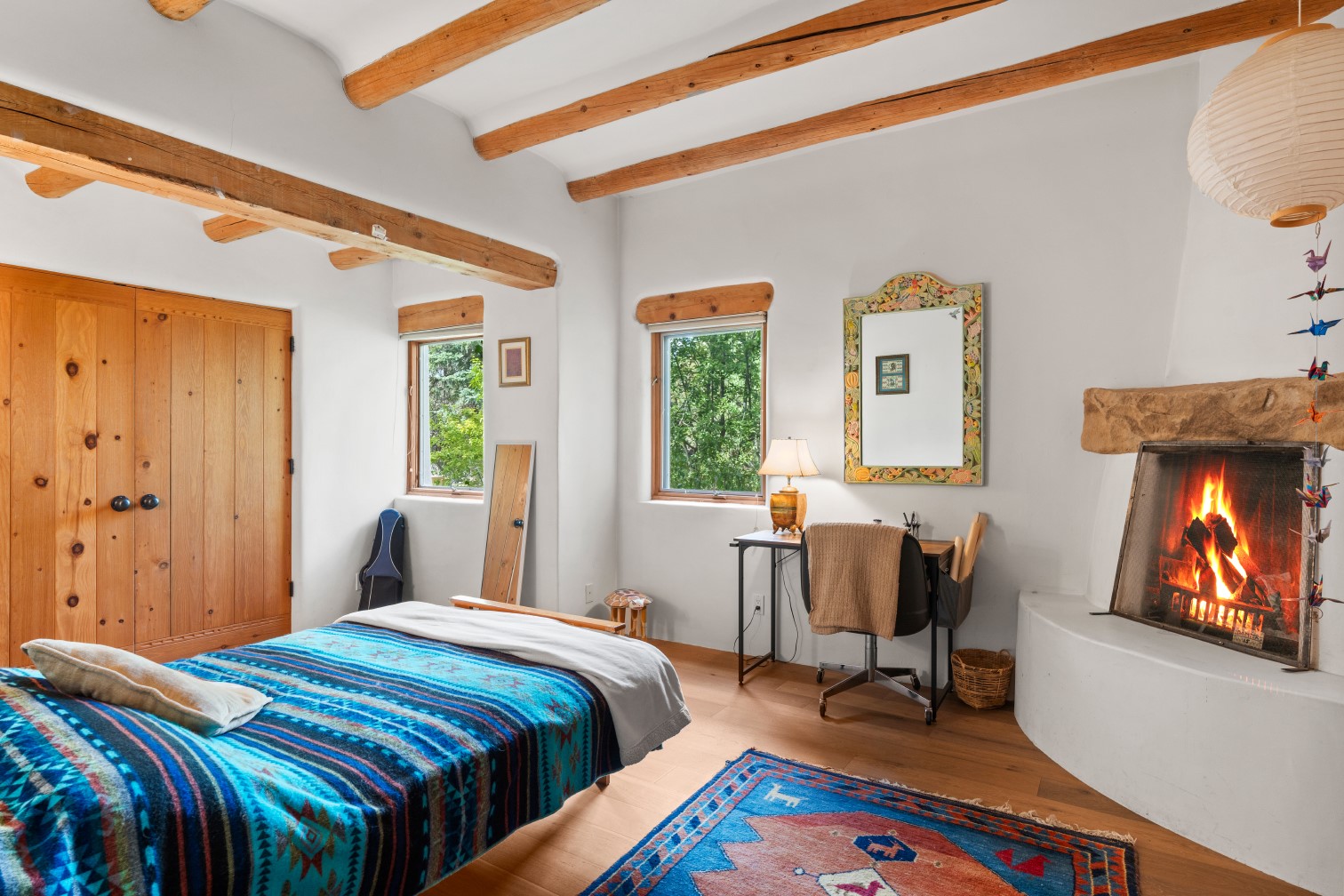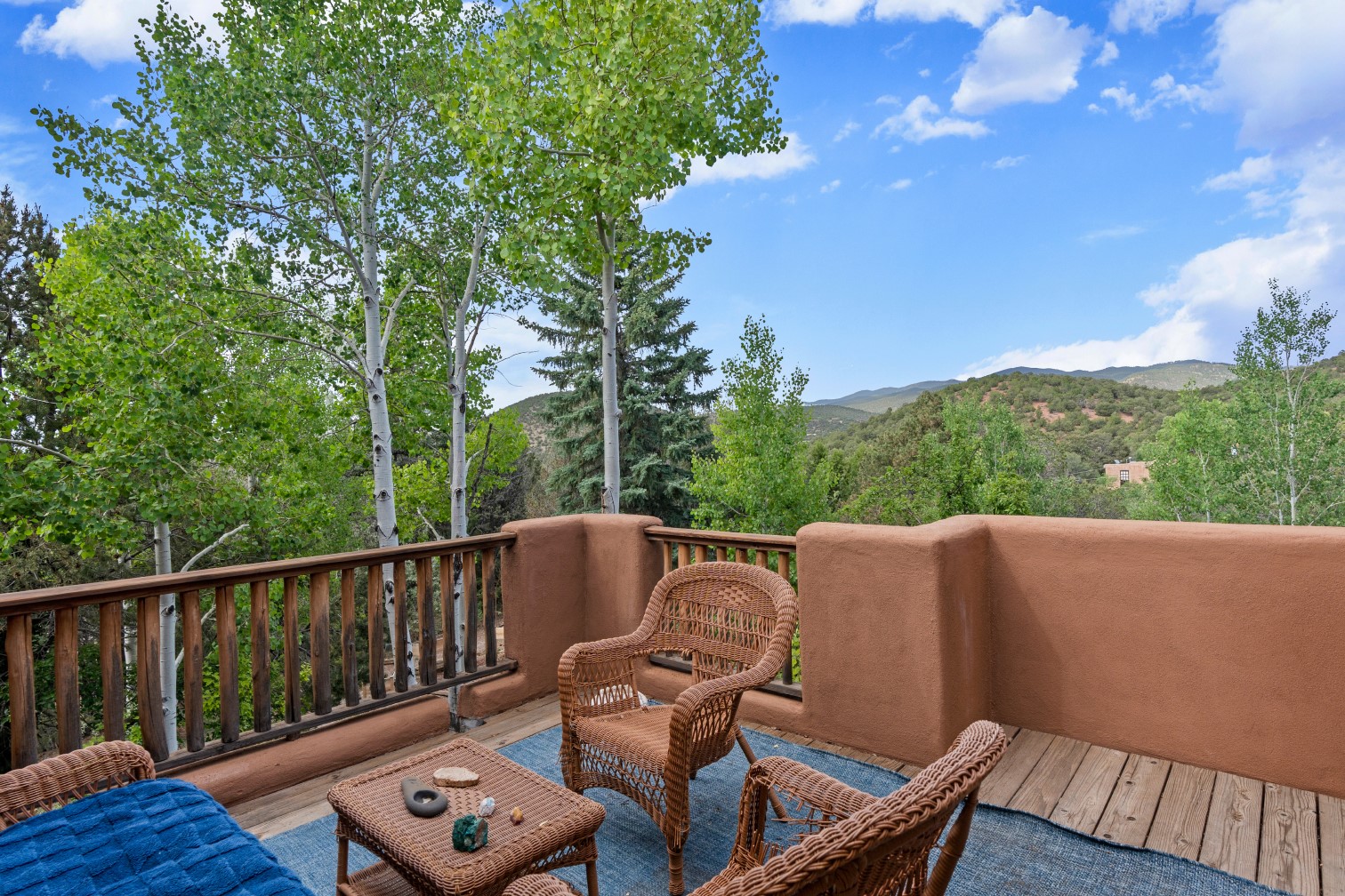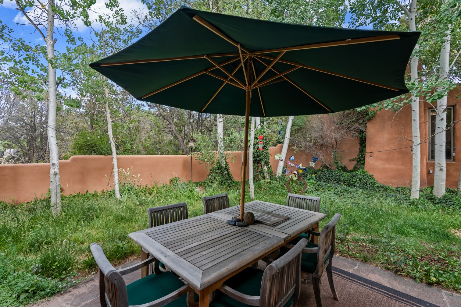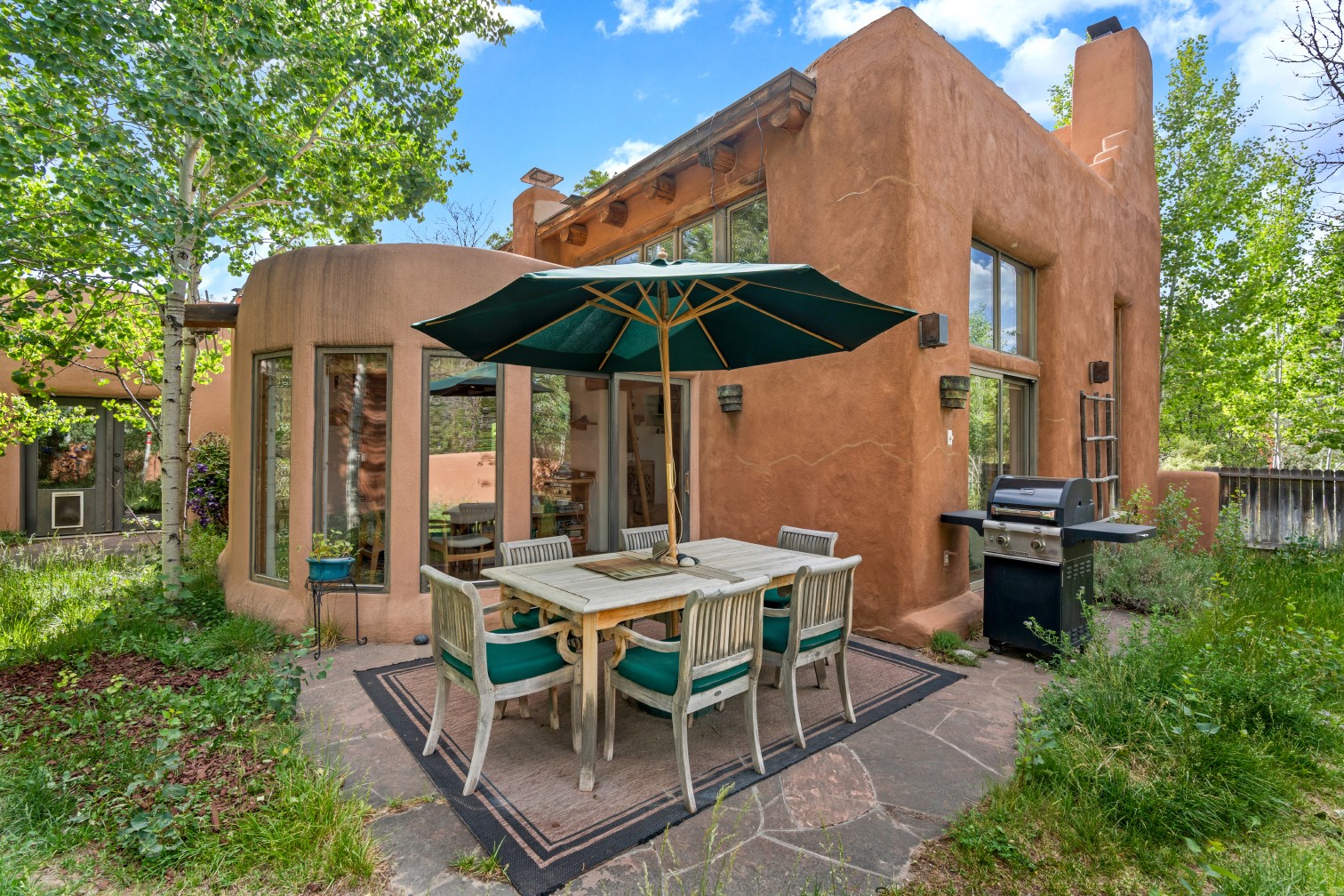 MAJESTIC UPPER EASTSIDE ESTATE - Discover the magic of this classic pueblo-style adobe compound off Upper Canyon Road - a serene oasis with magnificent views of the Sangre de Cristo and Jemez Mountains. Gated and fenced with private access to protected trails (Dorothy Stewart Trails), and on a cul-de-sac, the compound's gates swing open to reveal a stream and waterfall surrounded by day lilies, water lilies, irises, and verdant grasses embellishing extraordinary landscaping and gardens (featured in the 1997 Rizzoli book, Secret Gardens of Santa Fe). The adobe 4-bedroom main residence and 1-bedroom guest house are nestled within 1.14 acres of abundant aspens and towering blue spruce that frame the drama of distant mountains. Features of the main house include 6 fireplaces, ceilings of vigas, latillas and coves, antique doors, custom hardware, radiant under-floor heating, outdoor patios and portals, a media room, yoga studio, and 2-car garage. The upstairs primary suite includes a separate office and three outdoor spaces - a patio / portal, a separate balcony, and a spacious deck - and an elegant bath suite with a custom steam shower and whirlpool tub.