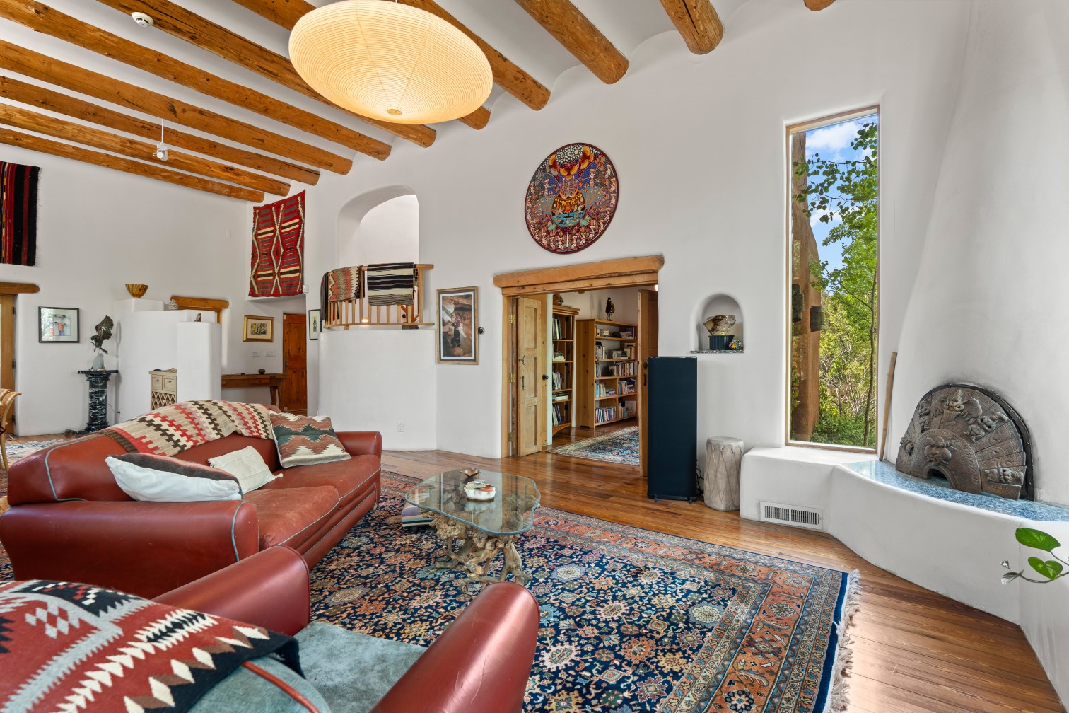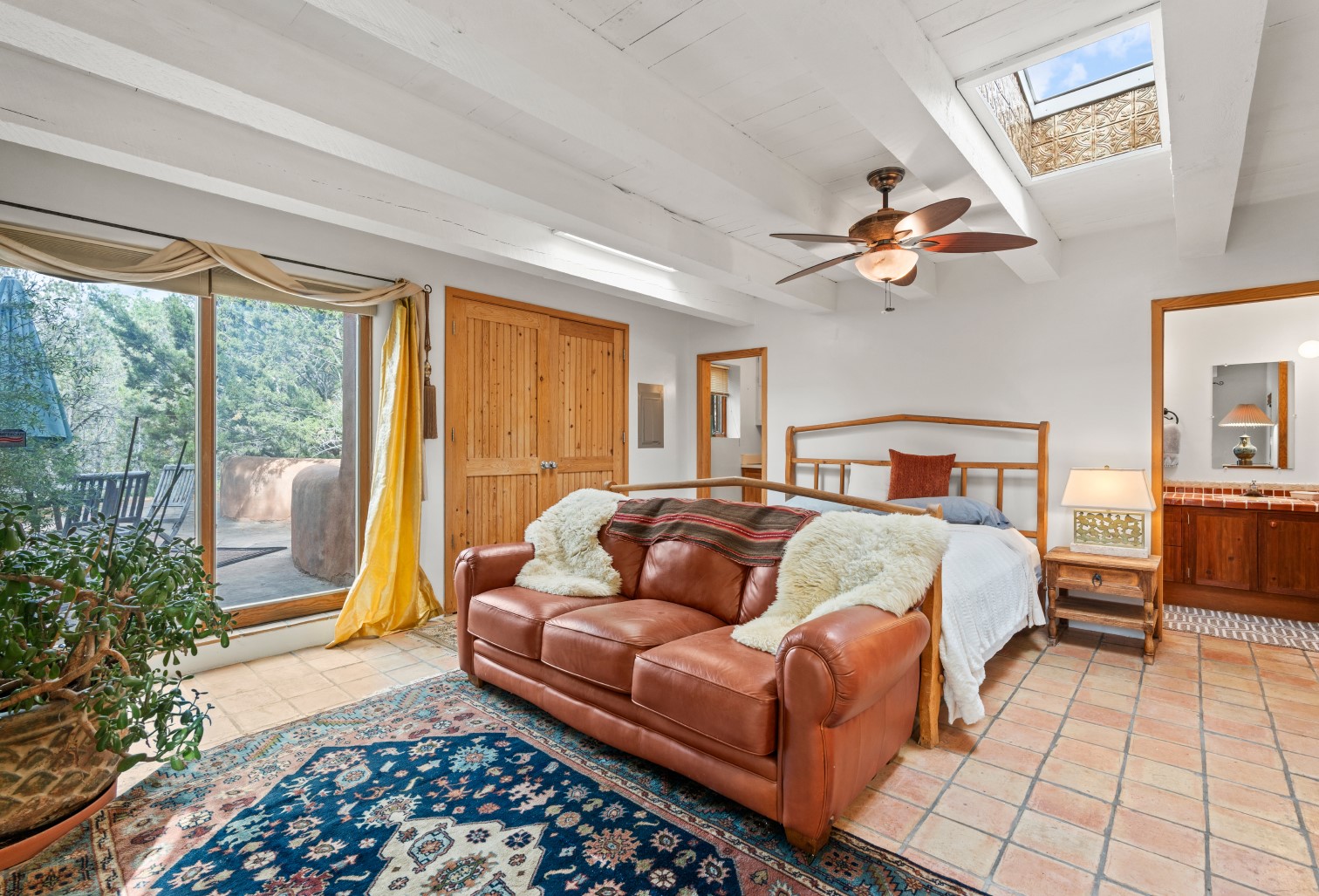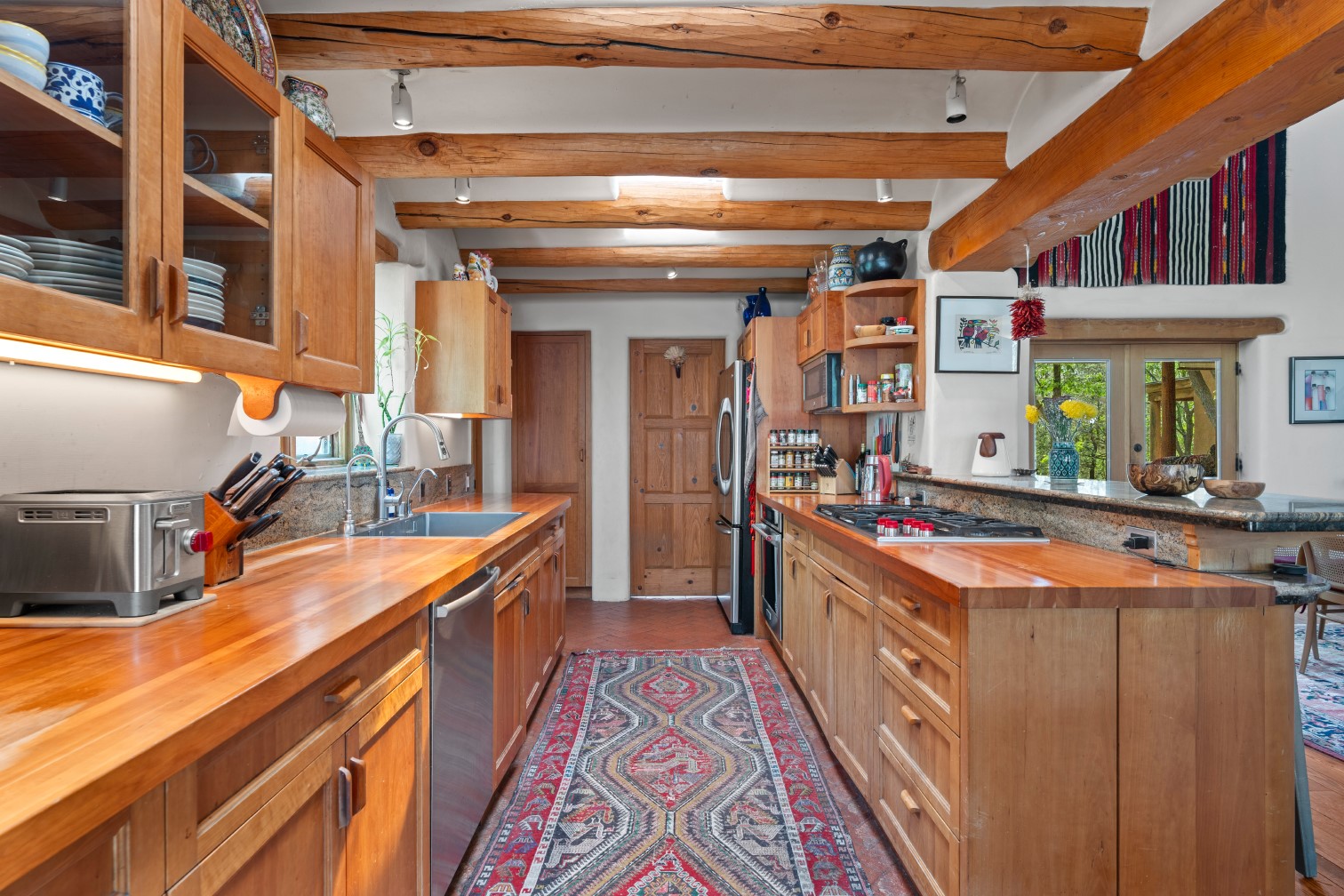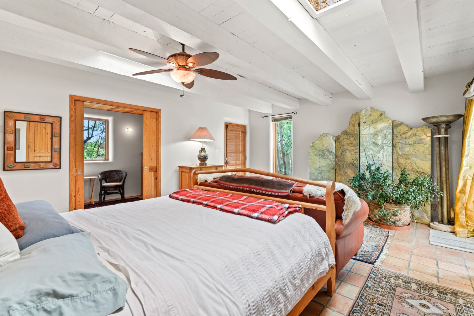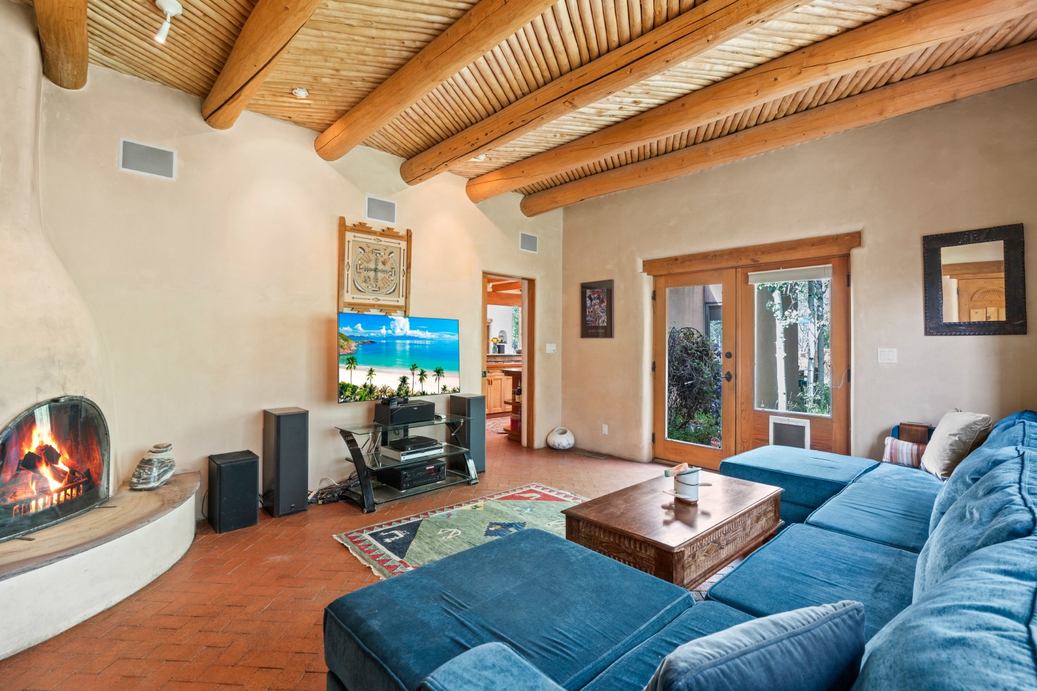 MAJESTIC UPPER EASTSIDE ESTATE - Discover the magic of this classic pueblo-style adobe compound off Upper Canyon Road - a serene oasis with magnificent views of the Sangre de Cristo and Jemez Mountains. Gated and fenced with private access to protected trails (Dorothy Stewart Trails), and on a cul-de-sac, the compound's gates swing open to reveal a stream and waterfall surrounded by day lilies, water lilies, irises, and verdant grasses embellishing extraordinary landscaping and gardens (featured in the 1997 Rizzoli book, Secret Gardens of Santa Fe). The adobe 4-bedroom main residence and 1-bedroom guest house are nestled within 1.14 acres of abundant aspens and towering blue spruce that frame the drama of distant mountains. Features of the main house include 6 fireplaces, ceilings of vigas, latillas and coves, antique doors, custom hardware, radiant under-floor heating, outdoor patios and portals, a media room, yoga studio, and 2-car garage. The upstairs primary suite includes a separate office and three outdoor spaces - a patio / portal, a separate balcony, and a spacious deck - and an elegant bath suite with a custom steam shower and whirlpool tub.