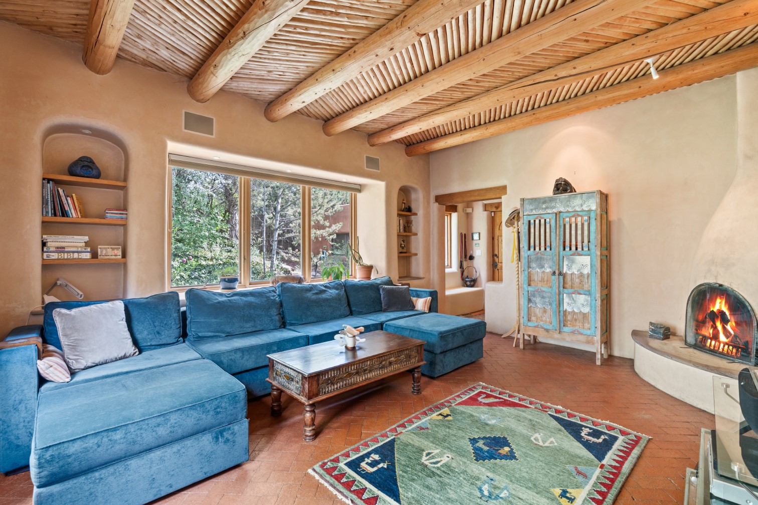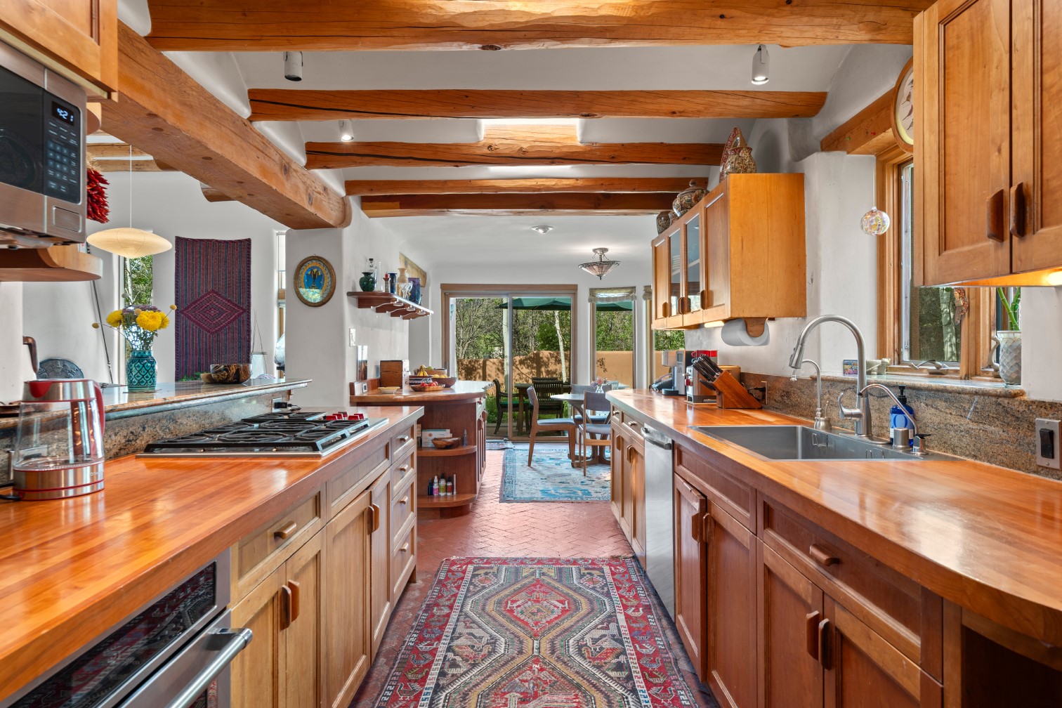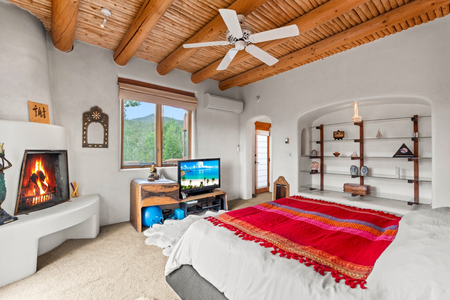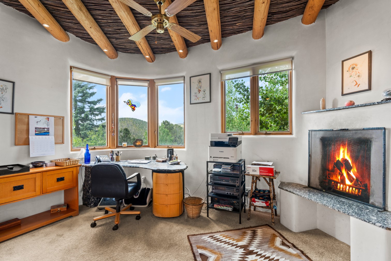 MAJESTIC UPPER EASTSIDE ESTATE - Discover the magic of this classic pueblo-style adobe compound off Upper Canyon Road - a serene oasis with magnificent views of the Sangre de Cristo and Jemez Mountains. Gated and fenced with private access to protected trails (Dorothy Stewart Trails), and on a cul-de-sac, the compound's gates swing open to reveal a stream and waterfall surrounded by day lilies, water lilies, irises, and verdant grasses embellishing extraordinary landscaping and gardens (featured in the 1997 Rizzoli book, Secret Gardens of Santa Fe). The adobe 4-bedroom main residence and 1-bedroom guest house are nestled within 1.14 acres of abundant aspens and towering blue spruce that frame the drama of distant mountains. Features of the main house include 6 fireplaces, ceilings of vigas, latillas and coves, antique doors, custom hardware, radiant under-floor heating, outdoor patios and portals, a media room, yoga studio, and 2-car garage. The upstairs primary suite includes a separate office and three outdoor spaces - a patio / portal, a separate balcony, and a spacious deck - and an elegant bath suite with a custom steam shower and whirlpool tub.