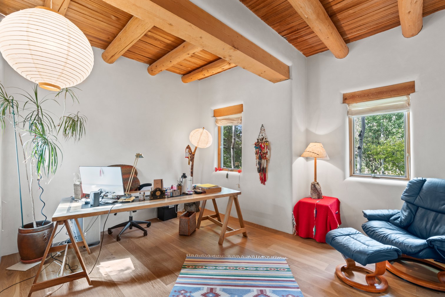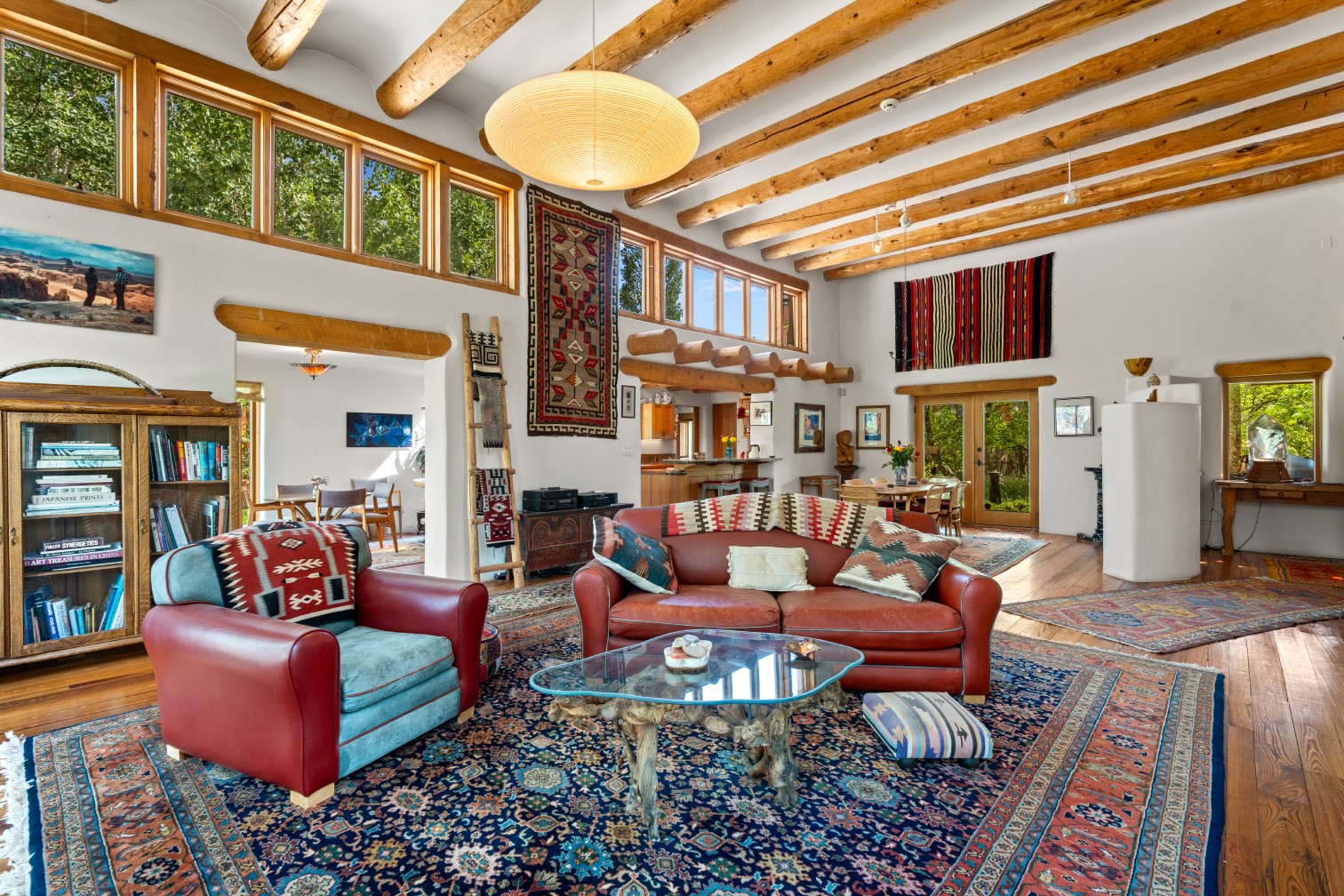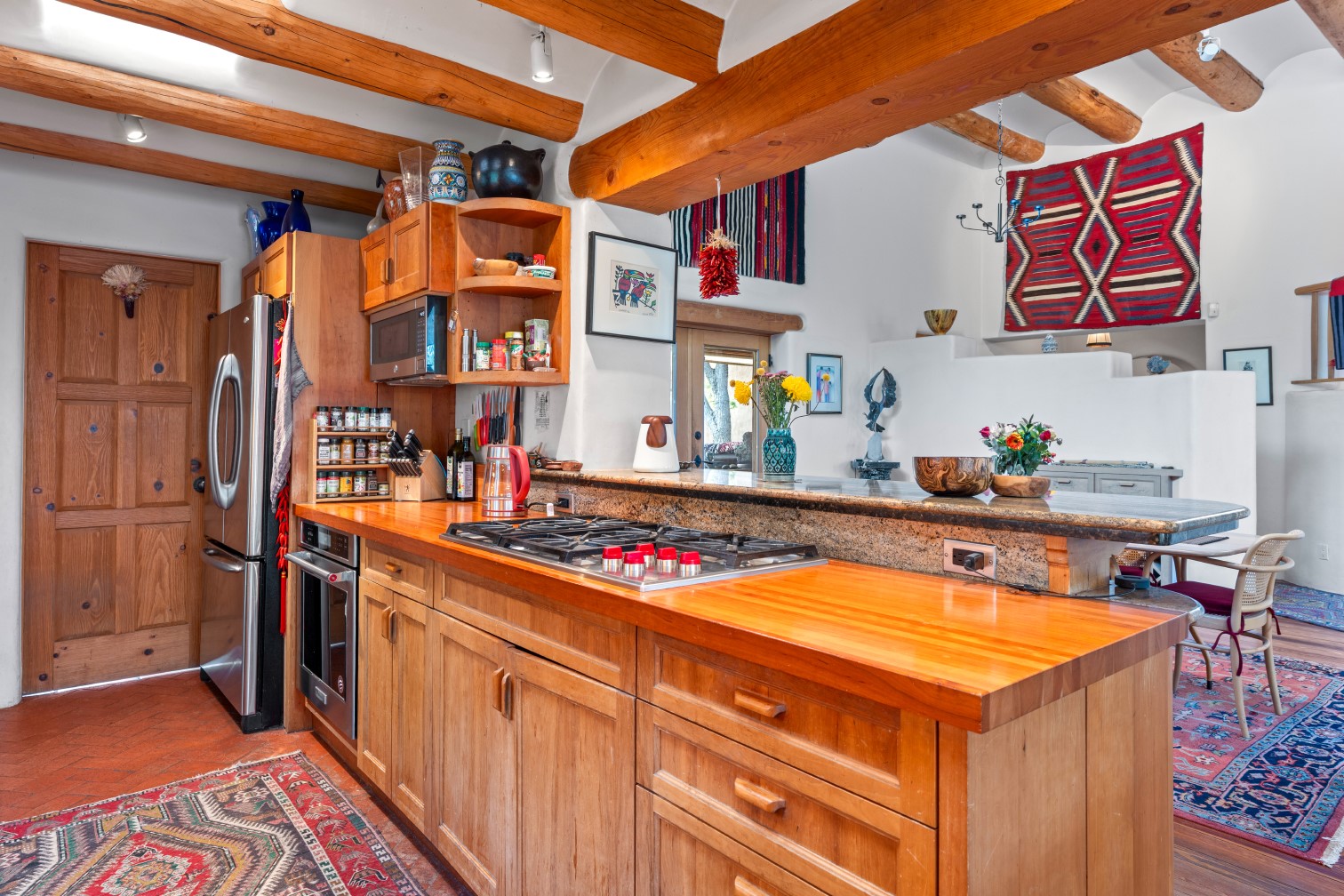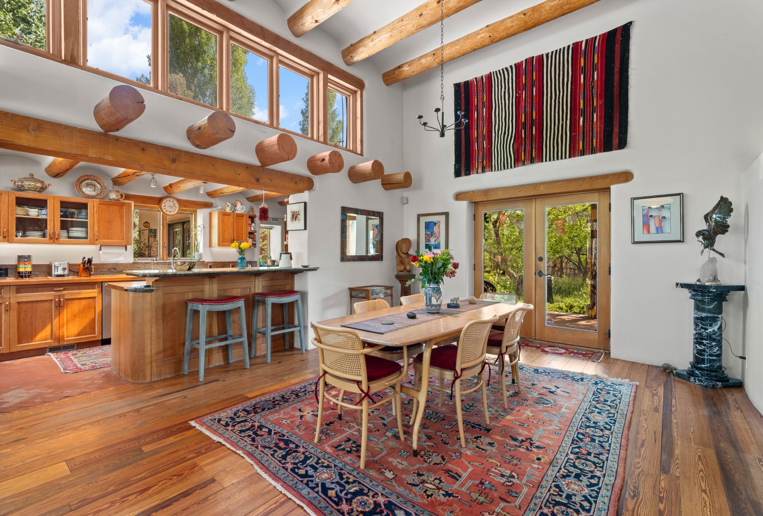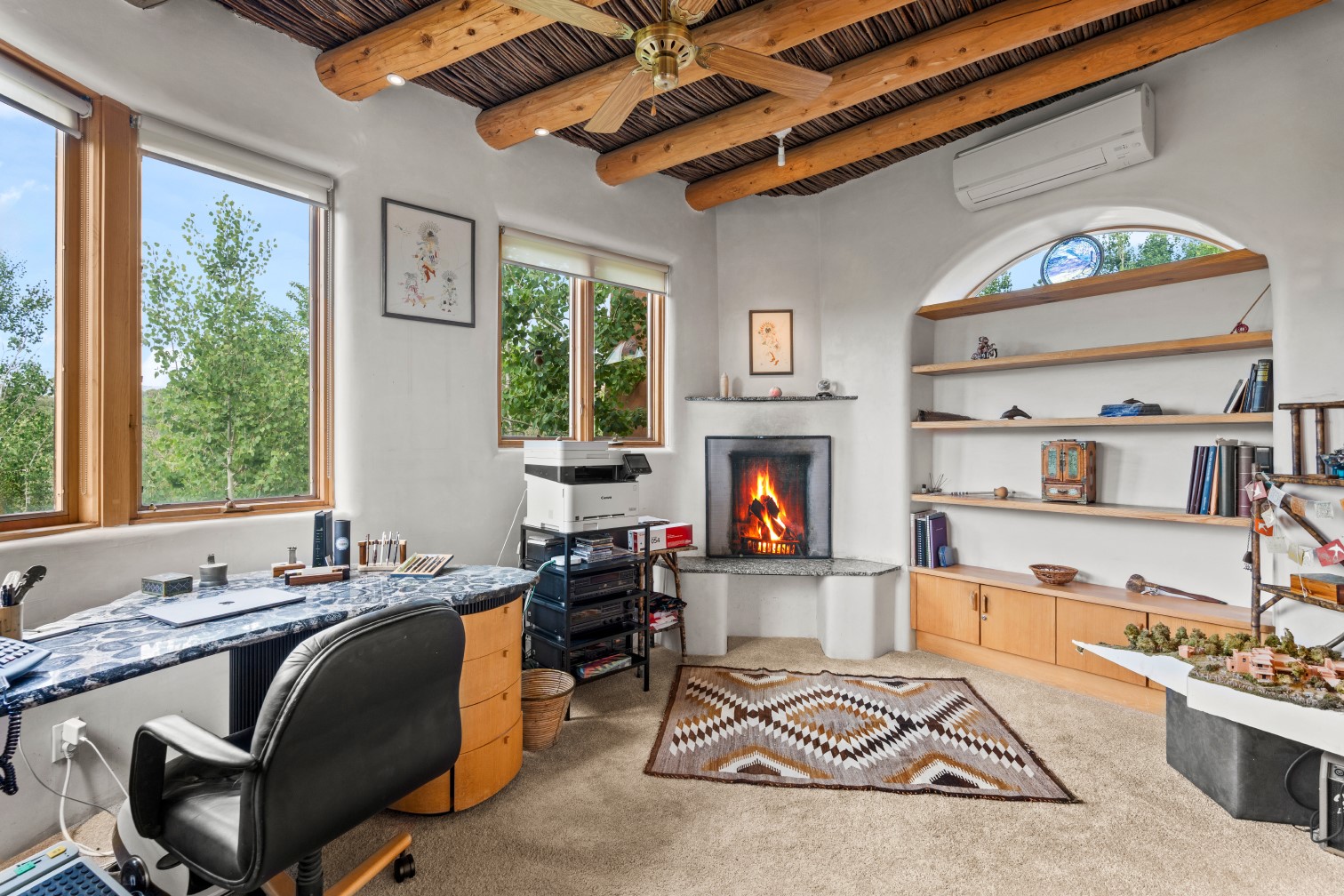 MAJESTIC UPPER EASTSIDE ESTATE - Discover the magic of this classic pueblo-style adobe compound off Upper Canyon Road - a serene oasis with magnificent views of the Sangre de Cristo and Jemez Mountains. Gated and fenced with private access to protected trails (Dorothy Stewart Trails), and on a cul-de-sac, the compound's gates swing open to reveal a stream and waterfall surrounded by day lilies, water lilies, irises, and verdant grasses embellishing extraordinary landscaping and gardens (featured in the 1997 Rizzoli book, Secret Gardens of Santa Fe). The adobe 4-bedroom main residence and 1-bedroom guest house are nestled within 1.14 acres of abundant aspens and towering blue spruce that frame the drama of distant mountains. Features of the main house include 6 fireplaces, ceilings of vigas, latillas and coves, antique doors, custom hardware, radiant under-floor heating, outdoor patios and portals, a media room, yoga studio, and 2-car garage. The upstairs primary suite includes a separate office and three outdoor spaces - a patio / portal, a separate balcony, and a spacious deck - and an elegant bath suite with a custom steam shower and whirlpool tub.