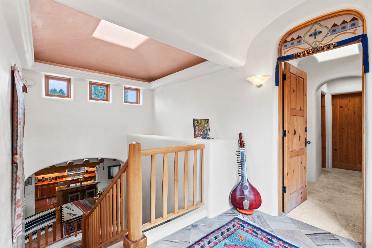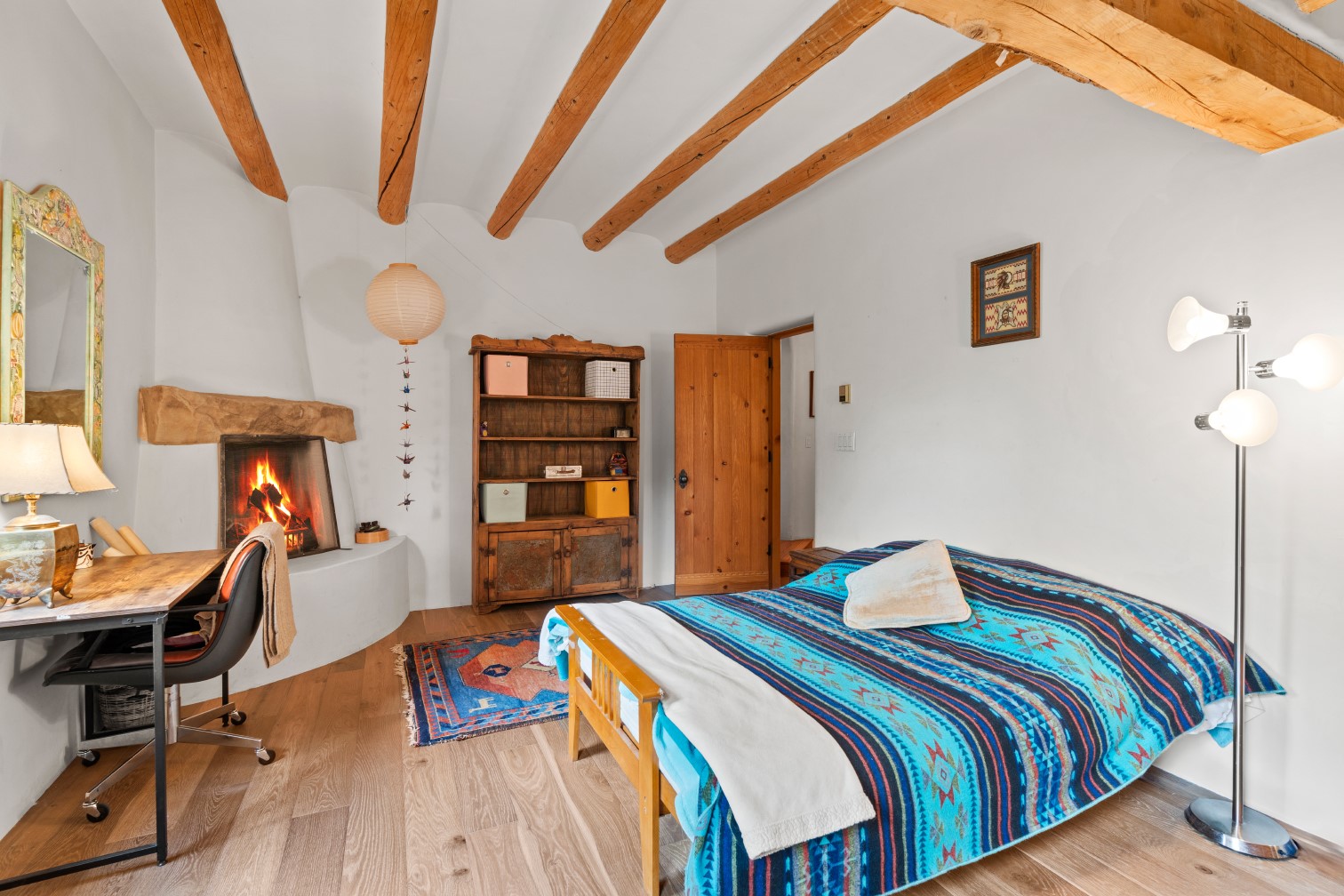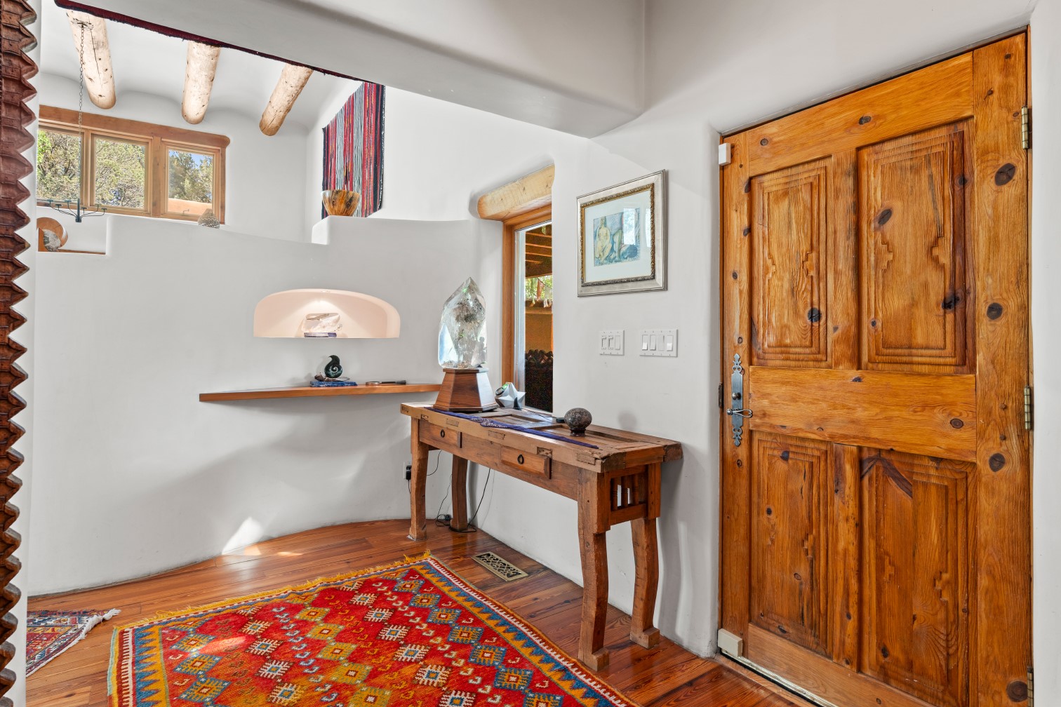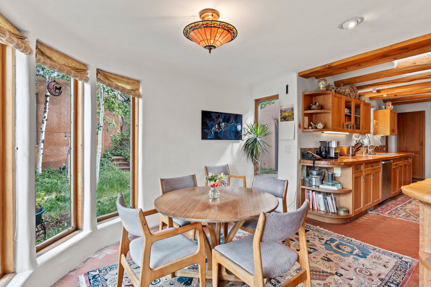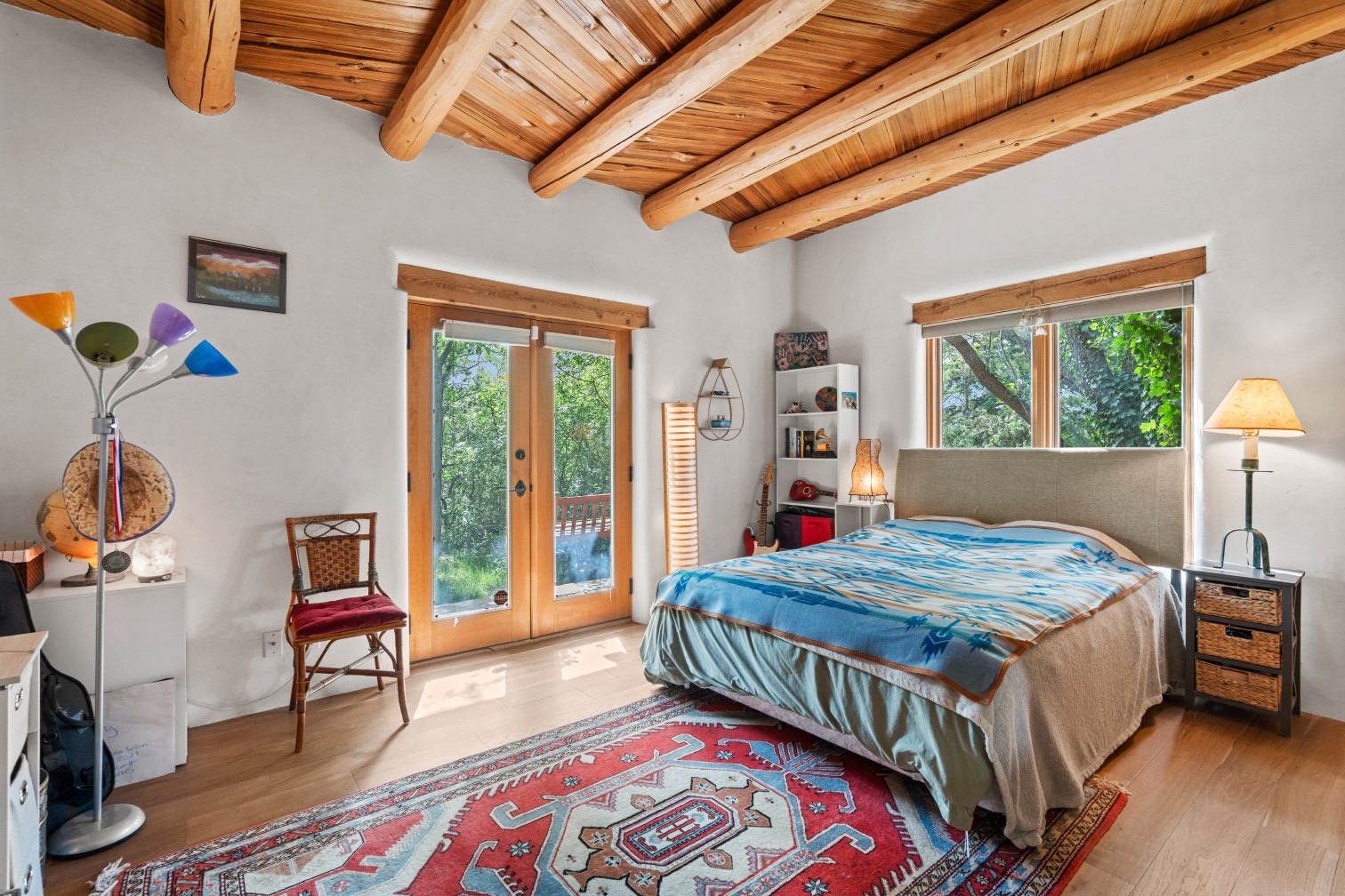 MAJESTIC UPPER EASTSIDE ESTATE - Discover the magic of this classic pueblo-style adobe compound off Upper Canyon Road - a serene oasis with magnificent views of the Sangre de Cristo and Jemez Mountains. Gated and fenced with private access to protected trails (Dorothy Stewart Trails), and on a cul-de-sac, the compound's gates swing open to reveal a stream and waterfall surrounded by day lilies, water lilies, irises, and verdant grasses embellishing extraordinary landscaping and gardens (featured in the 1997 Rizzoli book, Secret Gardens of Santa Fe). The adobe 4-bedroom main residence and 1-bedroom guest house are nestled within 1.14 acres of abundant aspens and towering blue spruce that frame the drama of distant mountains. Features of the main house include 6 fireplaces, ceilings of vigas, latillas and coves, antique doors, custom hardware, radiant under-floor heating, outdoor patios and portals, a media room, yoga studio, and 2-car garage. The upstairs primary suite includes a separate office and three outdoor spaces - a patio / portal, a separate balcony, and a spacious deck - and an elegant bath suite with a custom steam shower and whirlpool tub.