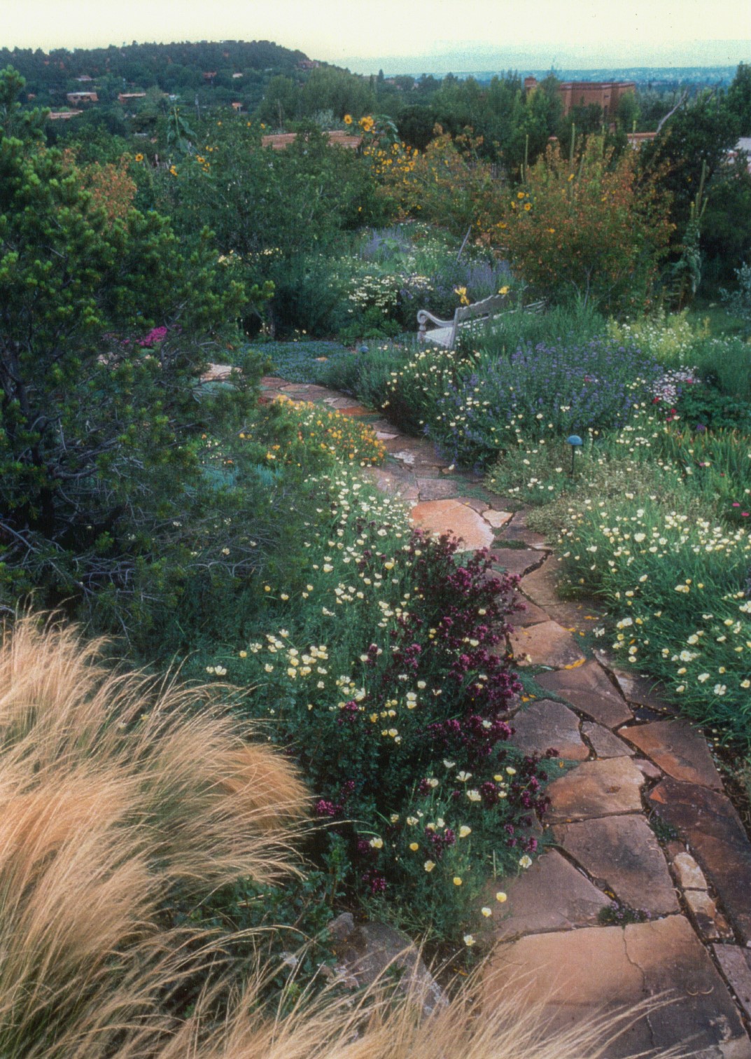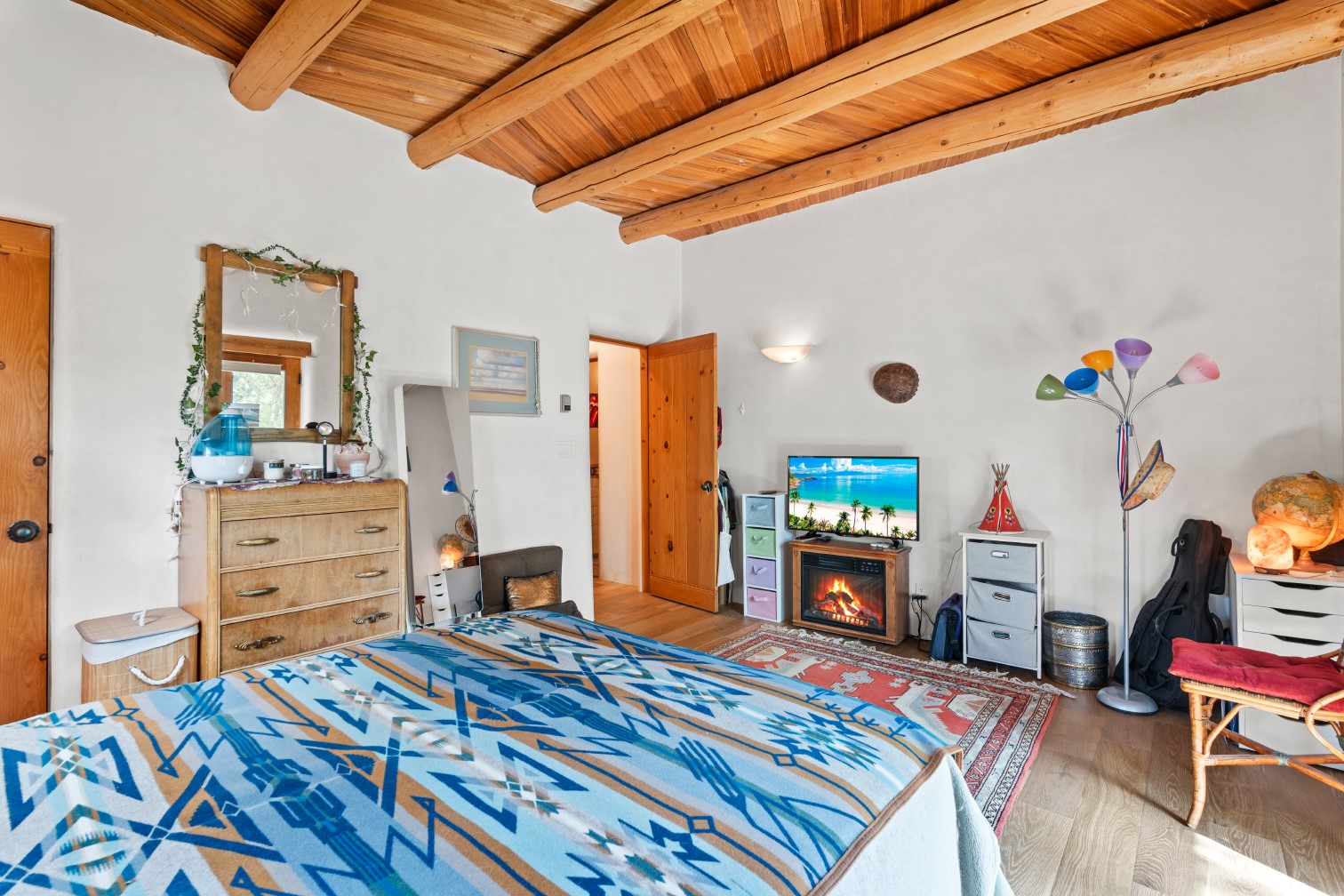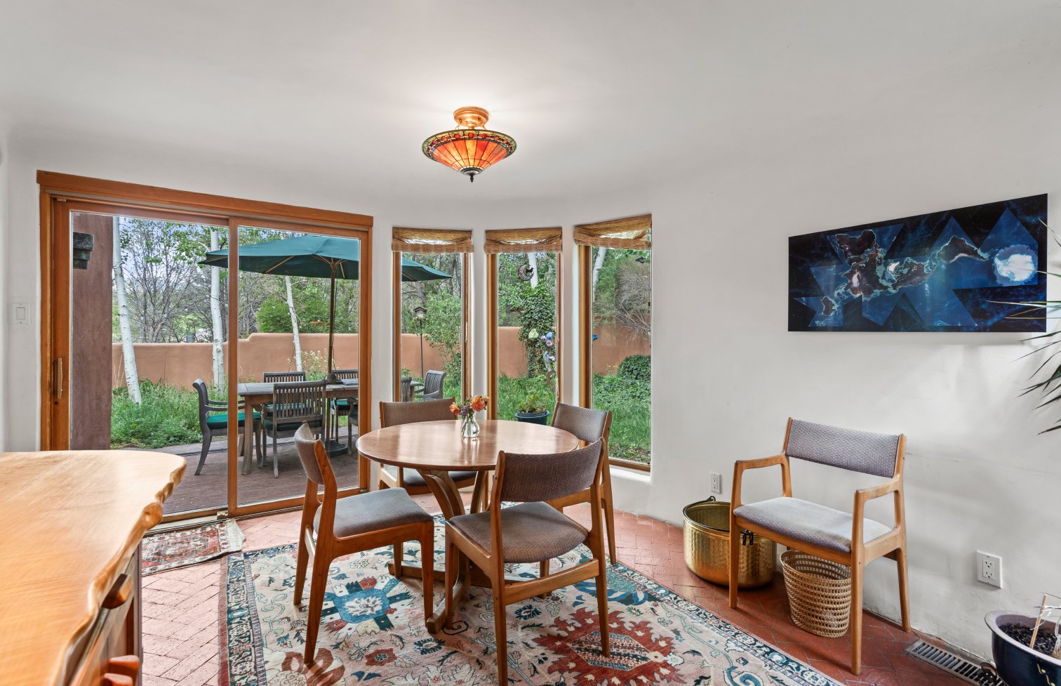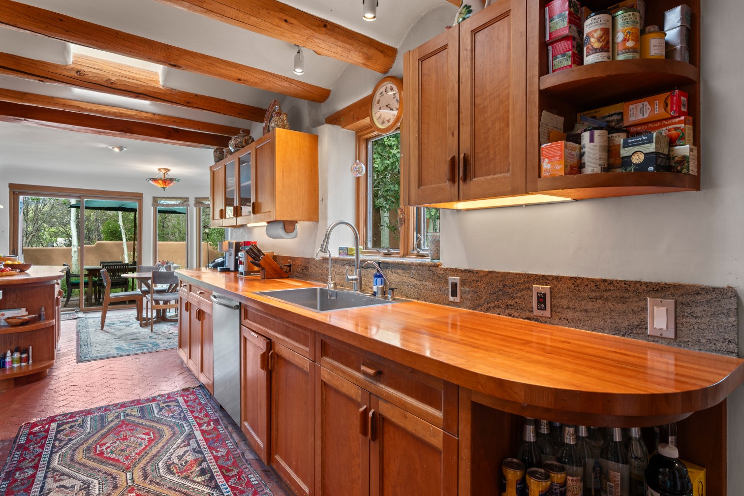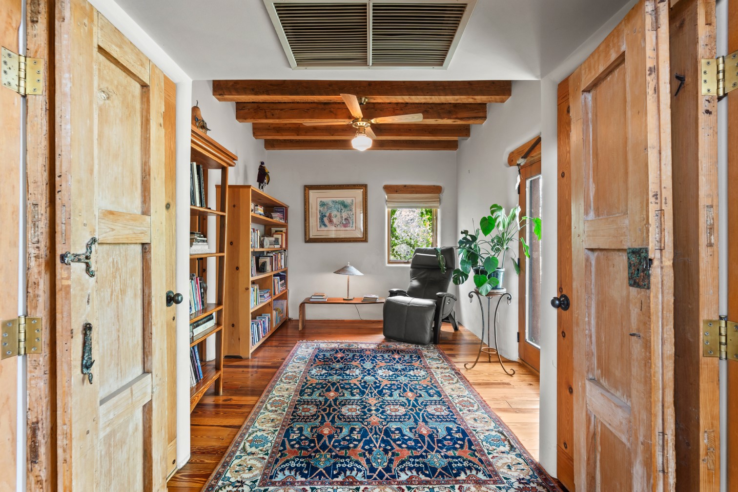 MAJESTIC UPPER EASTSIDE ESTATE - Discover the magic of this classic pueblo-style adobe compound off Upper Canyon Road - a serene oasis with magnificent views of the Sangre de Cristo and Jemez Mountains. Gated and fenced with private access to protected trails (Dorothy Stewart Trails), and on a cul-de-sac, the compound's gates swing open to reveal a stream and waterfall surrounded by day lilies, water lilies, irises, and verdant grasses embellishing extraordinary landscaping and gardens (featured in the 1997 Rizzoli book, Secret Gardens of Santa Fe). The adobe 4-bedroom main residence and 1-bedroom guest house are nestled within 1.14 acres of abundant aspens and towering blue spruce that frame the drama of distant mountains. Features of the main house include 6 fireplaces, ceilings of vigas, latillas and coves, antique doors, custom hardware, radiant under-floor heating, outdoor patios and portals, a media room, yoga studio, and 2-car garage. The upstairs primary suite includes a separate office and three outdoor spaces - a patio / portal, a separate balcony, and a spacious deck - and an elegant bath suite with a custom steam shower and whirlpool tub.