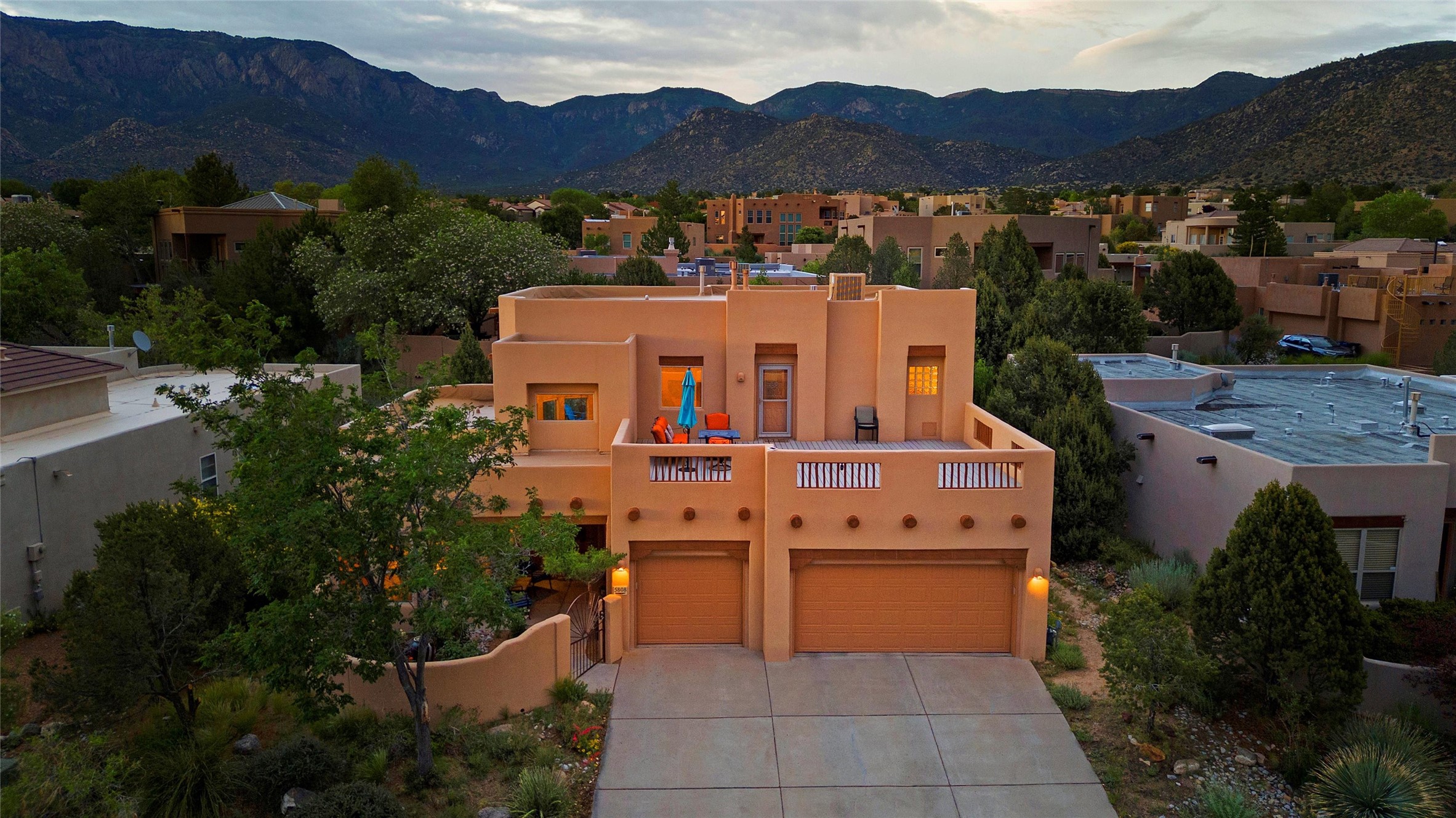 Tucked away on a no-through street, in the coveted Solterra at High Desert community, this serene sanctuary offers a rare blend of comfort and elegance. Passing through the peaceful courtyard into the home you are welcomed with Brazilian cherry wood floors, soaring cathedral ceilings, and a dramatic wall of windows that flood the living space with natural light. The entire top floor is dedicated to the comfort and enjoyment of the primary residents - with a spacious bedroom that includes a reading nook or office, a luxurious bath, and an organized closet space. Opposite the bedroom is a stunning balcony with mountain views and a peek of the city, ideal for sunrise coffee, intimate stargazing, or inviting friends up to watch fireworks or balloons. One of the three downstairs bedrooms has an ensuite bath and separate entrance - perfect for guests or multi-generational living. The kitchen and living areas flow seamlessly into a beautifully landscaped backyard with a water feature --an ideal spot for outdoor dining or quiet reflection. With a 3-car garage, an oversized under-stair closet, and thoughtful upgrades like a whole house humidifier, NUVO water softener, and TPO roof, this home balances beauty and practicality in a premier Albuquerque neighborhood.