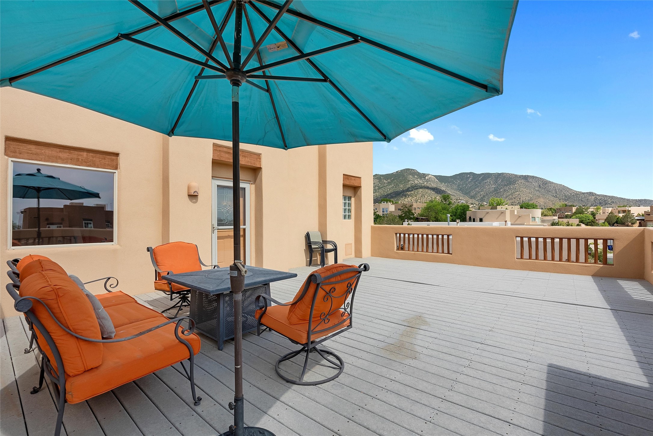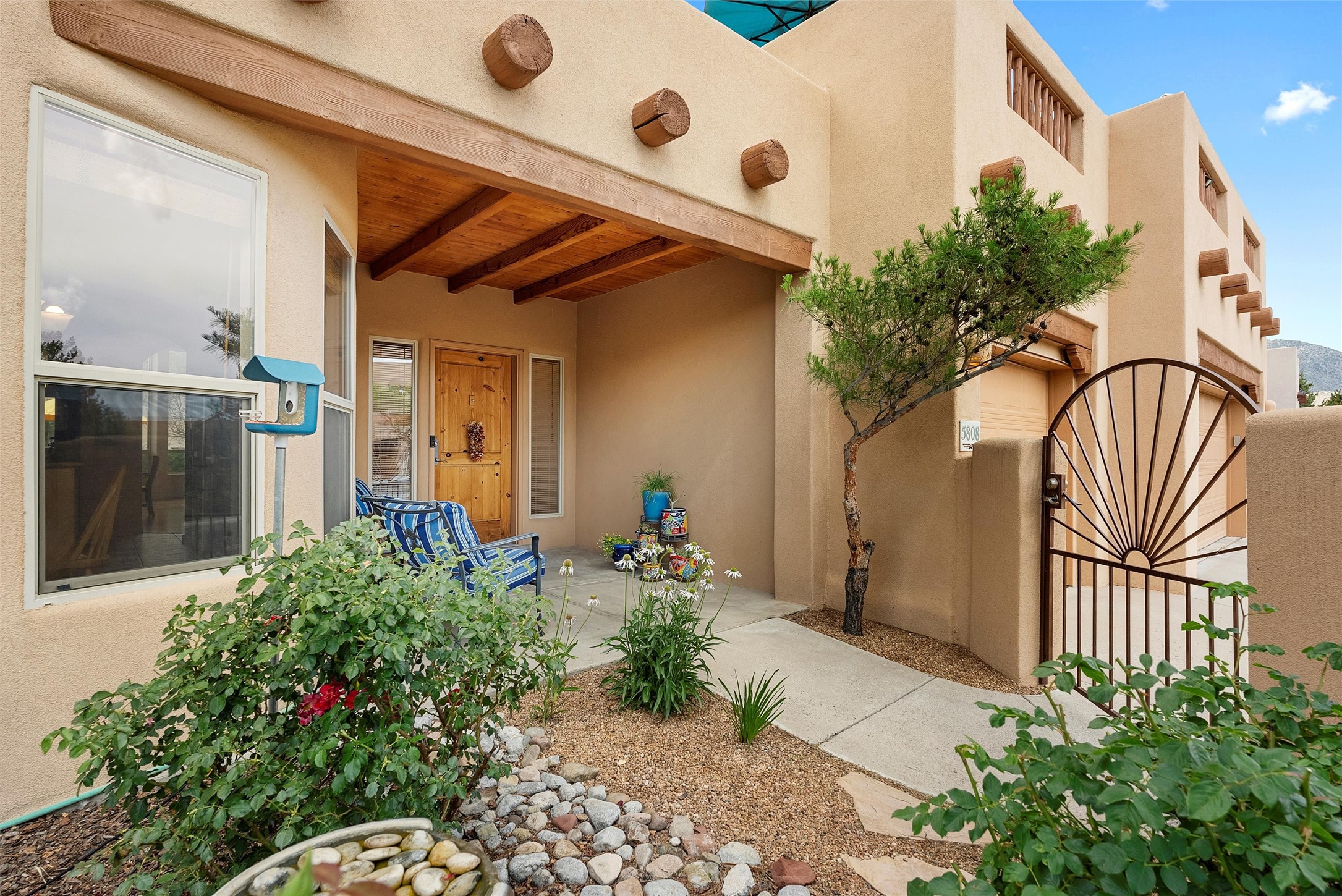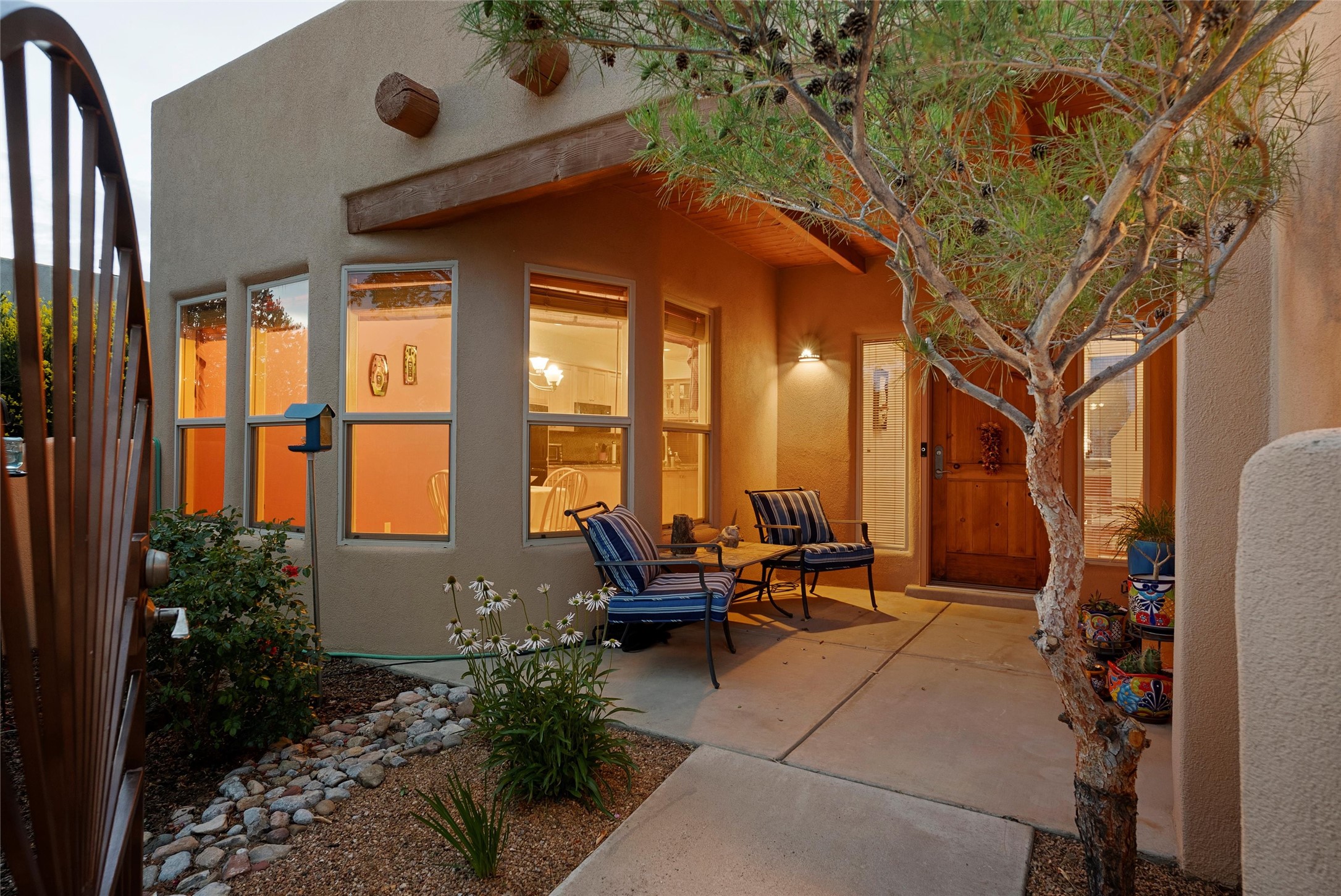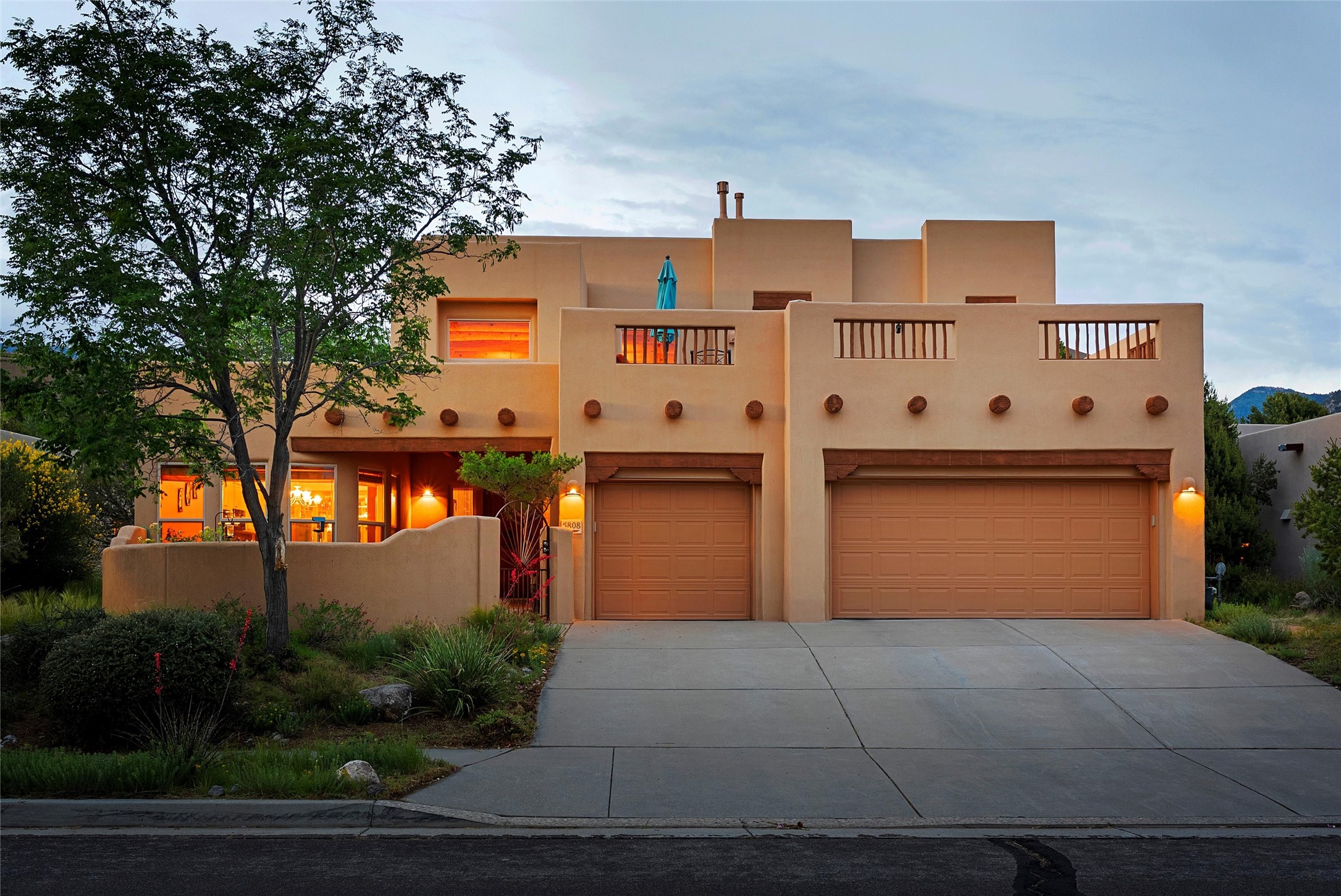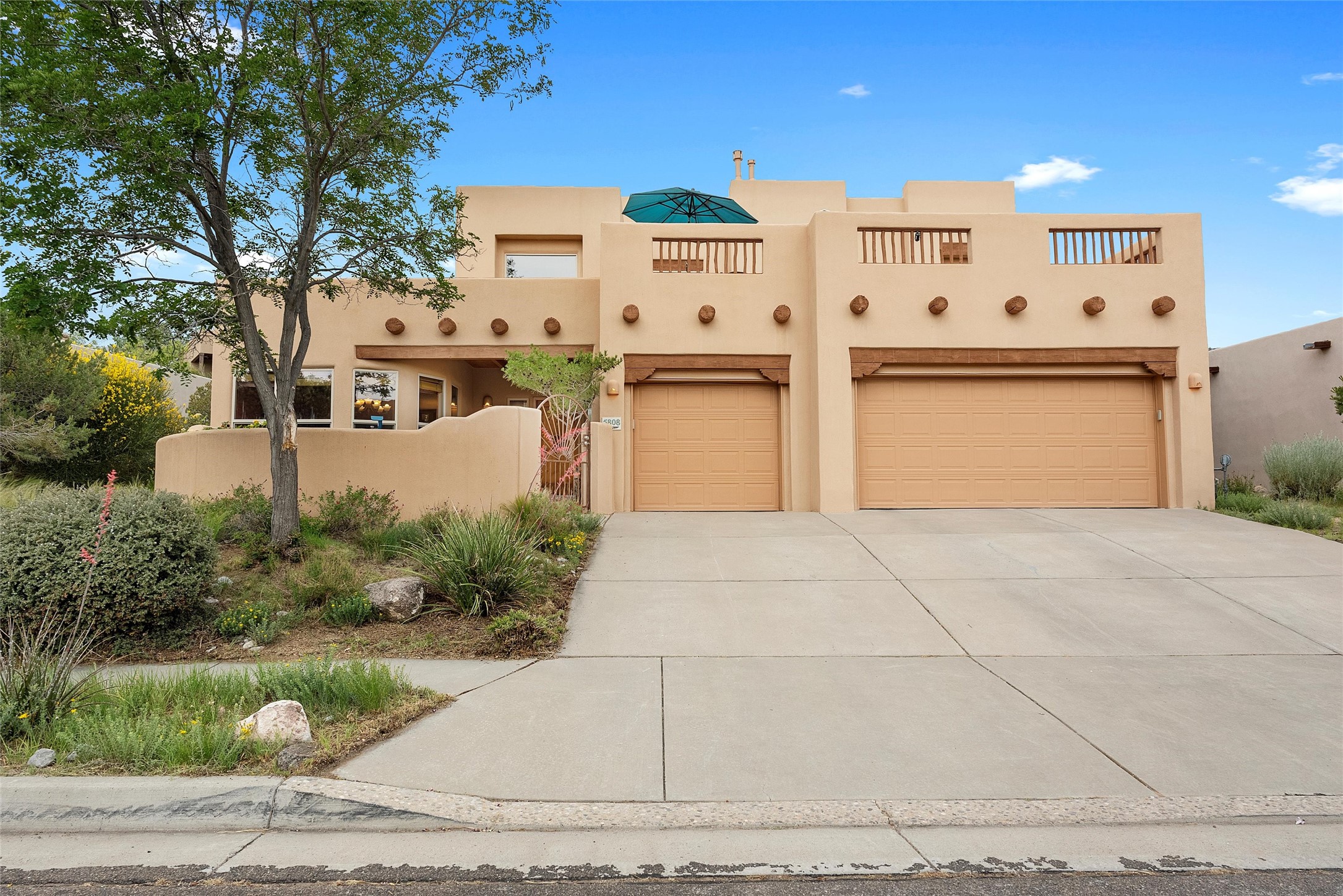 Tucked away on a no-through street, in the coveted Solterra at High Desert community, this serene sanctuary offers a rare blend of comfort and elegance. Passing through the peaceful courtyard into the home you are welcomed with Brazilian cherry wood floors, soaring cathedral ceilings, and a dramatic wall of windows that flood the living space with natural light. The entire top floor is dedicated to the comfort and enjoyment of the primary residents - with a spacious bedroom that includes a reading nook or office, a luxurious bath, and an organized closet space. Opposite the bedroom is a stunning balcony with mountain views and a peek of the city, ideal for sunrise coffee, intimate stargazing, or inviting friends up to watch fireworks or balloons. One of the three downstairs bedrooms has an ensuite bath and separate entrance - perfect for guests or multi-generational living. The kitchen and living areas flow seamlessly into a beautifully landscaped backyard with a water feature --an ideal spot for outdoor dining or quiet reflection. With a 3-car garage, an oversized under-stair closet, and thoughtful upgrades like a whole house humidifier, NUVO water softener, and TPO roof, this home balances beauty and practicality in a premier Albuquerque neighborhood.