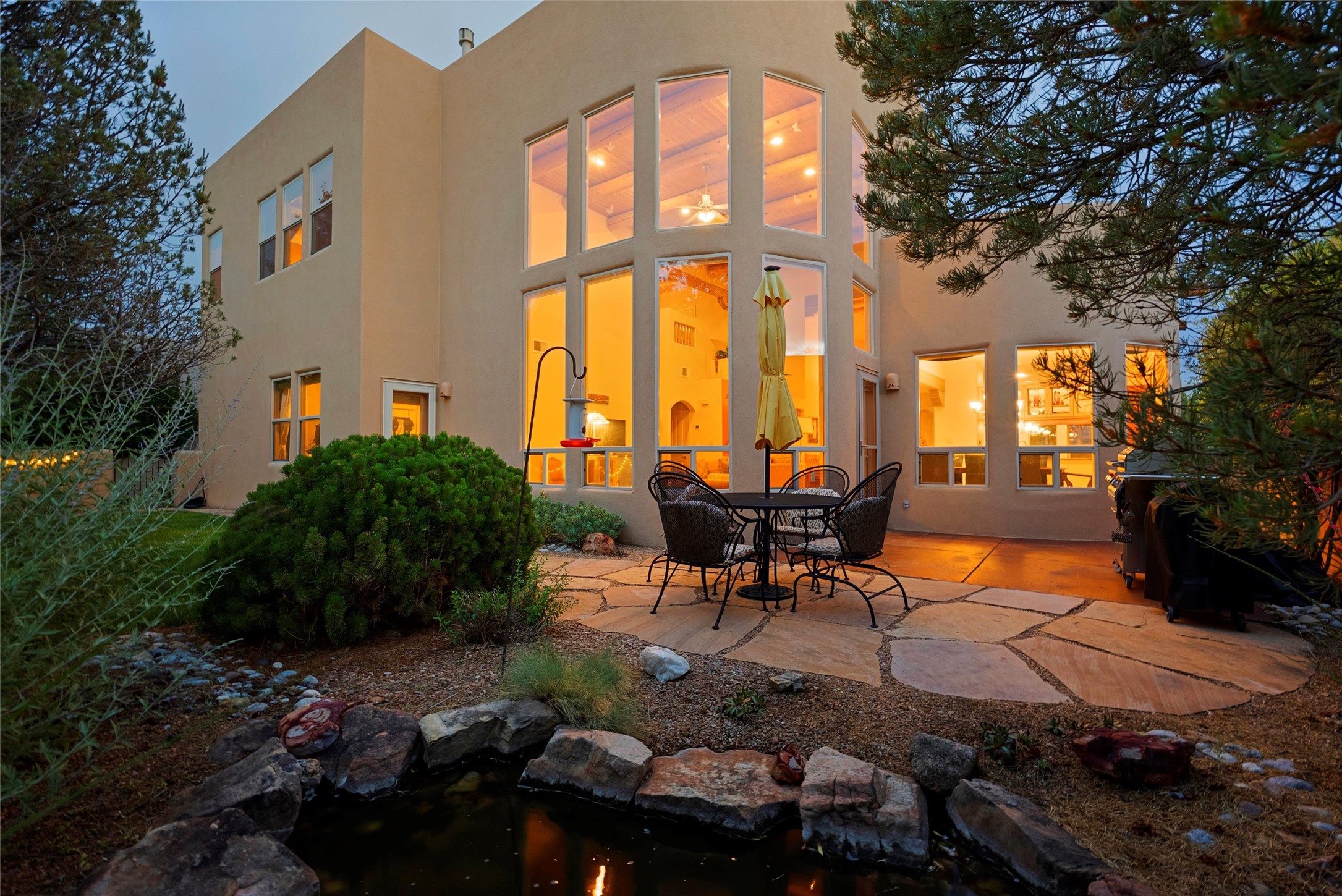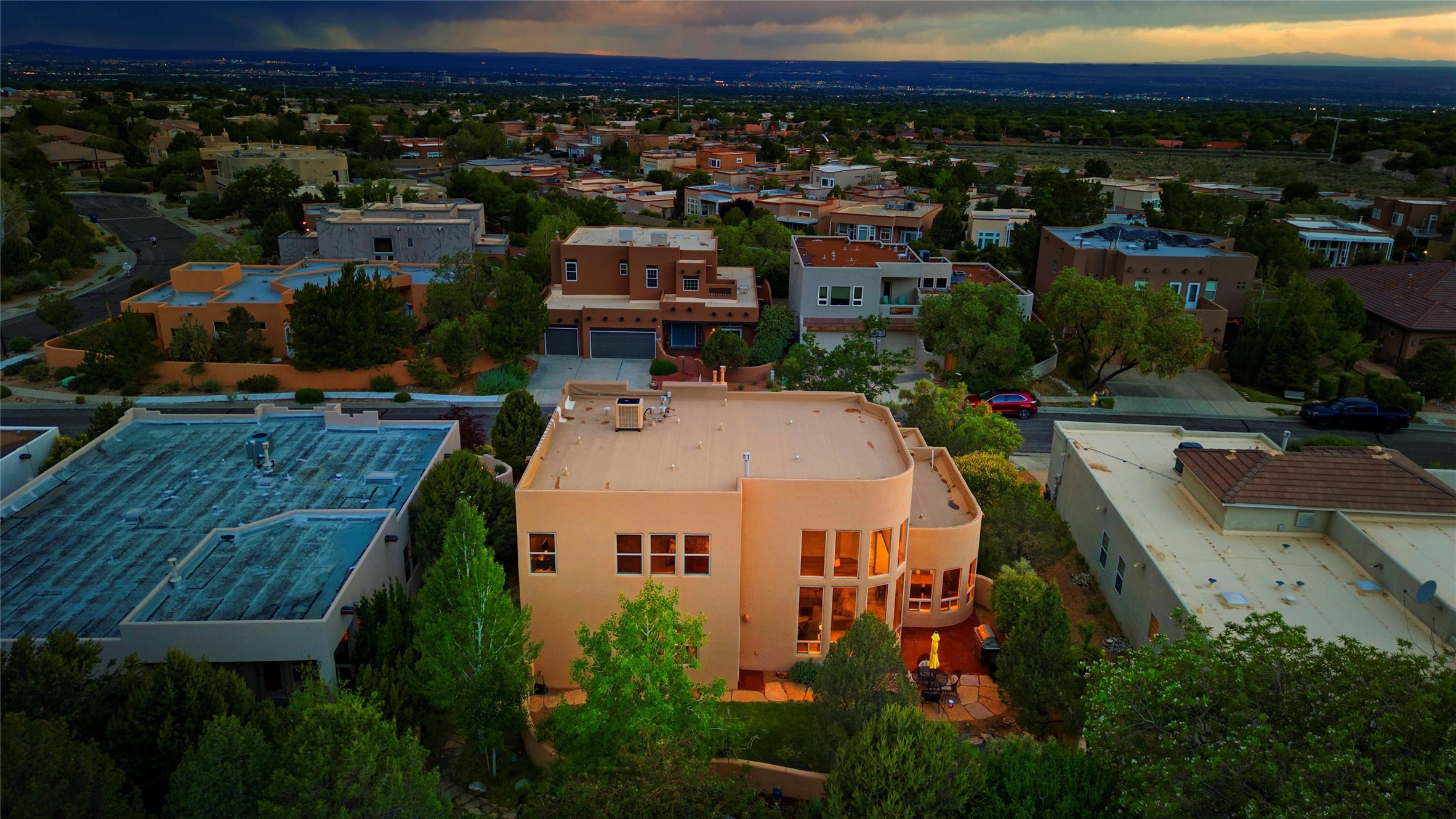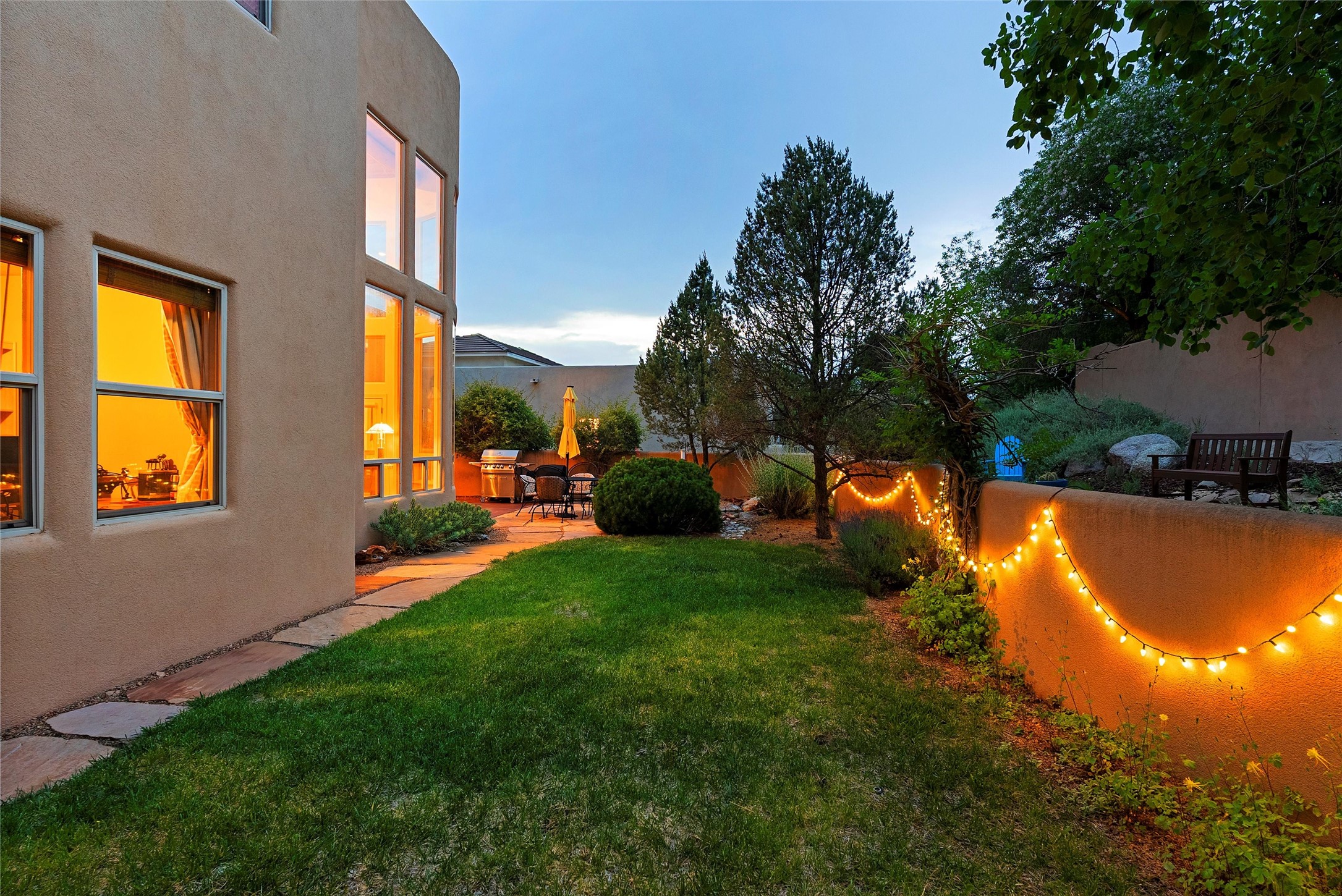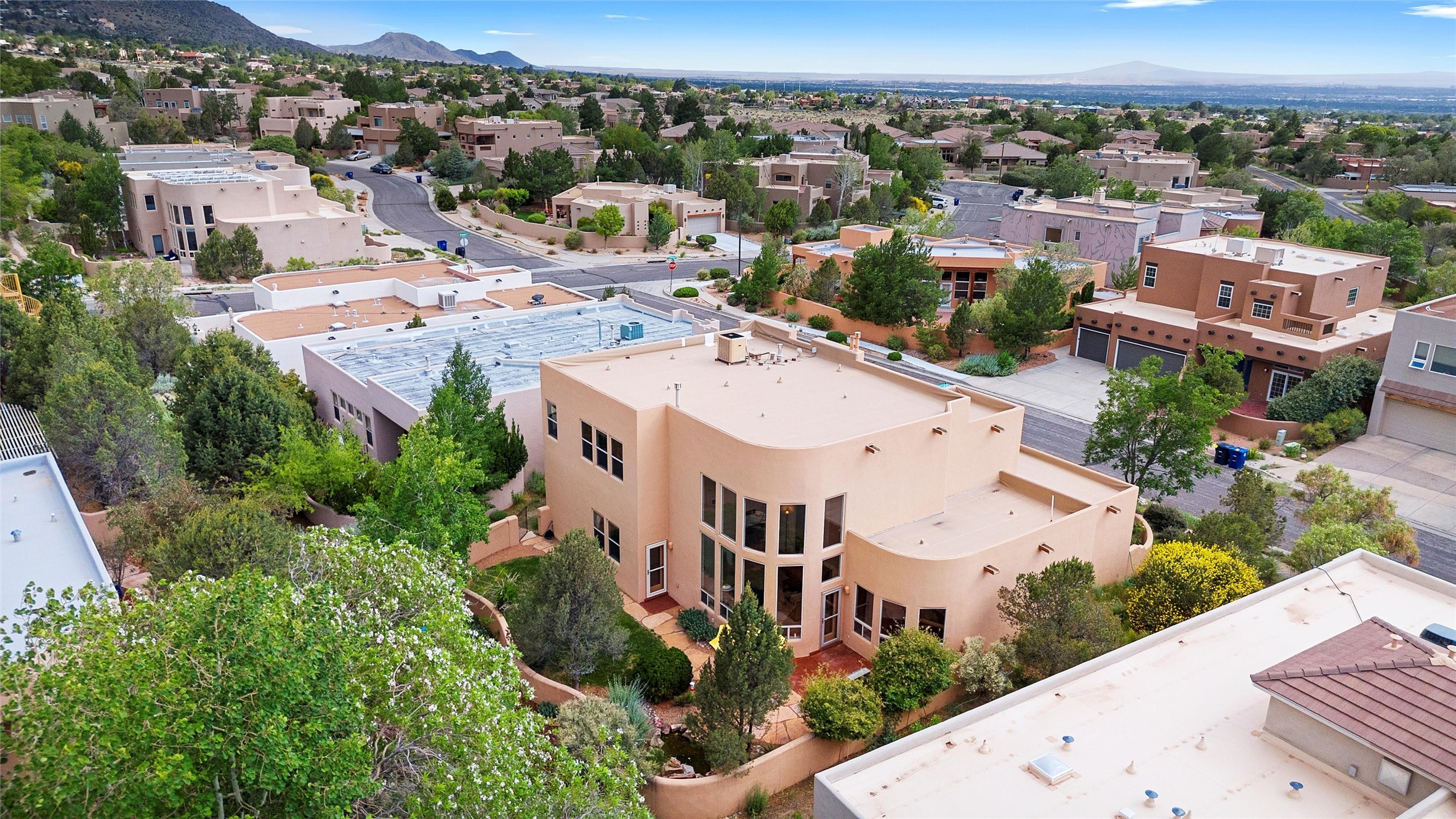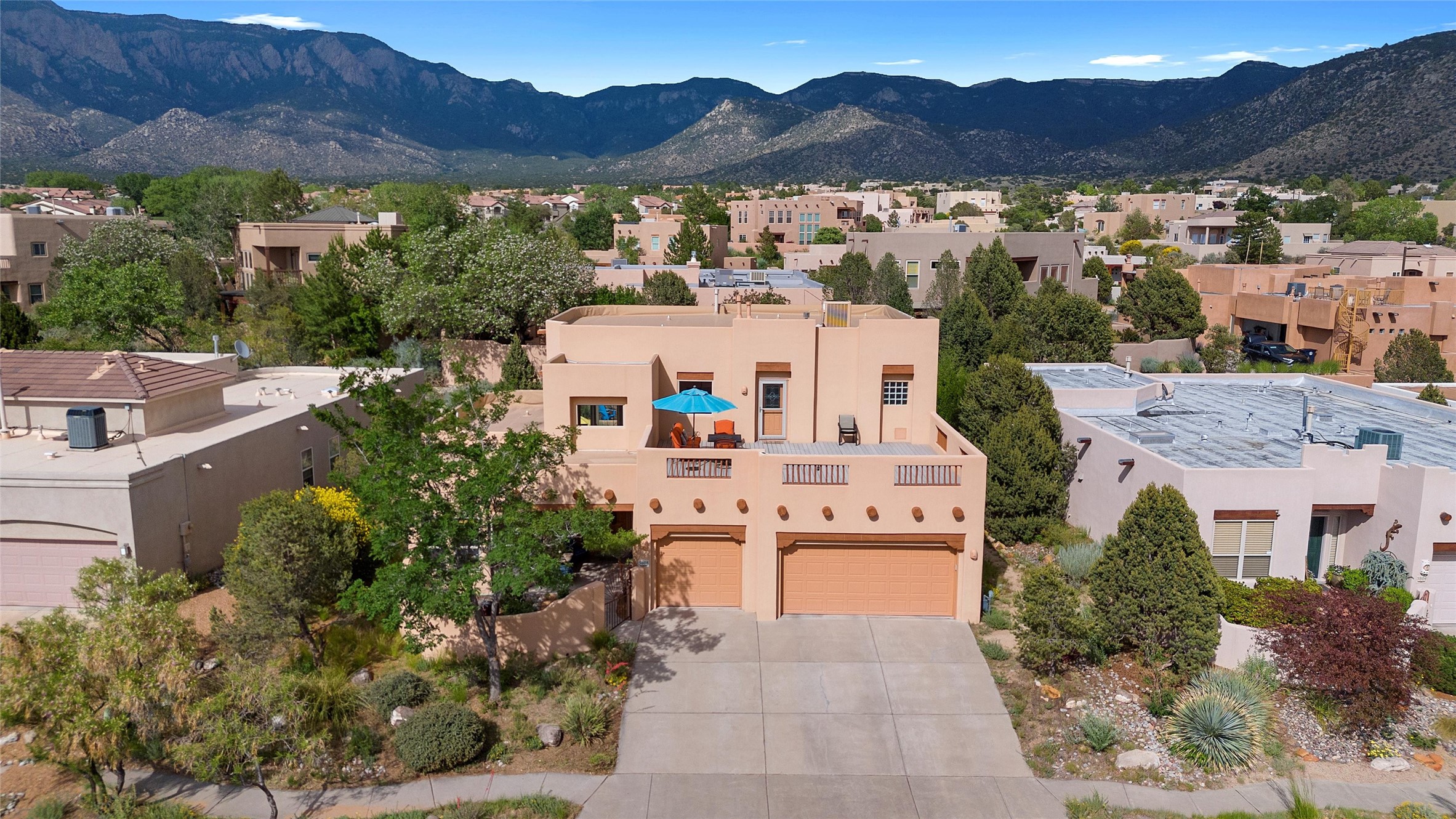Tucked away on a no-through street, in the coveted Solterra at High Desert community, this serene sanctuary offers a rare blend of comfort and elegance. Passing through the peaceful courtyard into the home you are welcomed with Brazilian cherry wood floors, soaring cathedral ceilings, and a dramatic wall of windows that flood the living space with natural light. The entire top floor is dedicated to the comfort and enjoyment of the primary residents - with a spacious bedroom that includes a reading nook or office, a luxurious bath, and an organized closet space. Opposite the bedroom is a stunning balcony with mountain views and a peek of the city, ideal for sunrise coffee, intimate stargazing, or inviting friends up to watch fireworks or balloons. One of the three downstairs bedrooms has an ensuite bath and separate entrance - perfect for guests or multi-generational living. The kitchen and living areas flow seamlessly into a beautifully landscaped backyard with a water feature --an ideal spot for outdoor dining or quiet reflection. With a 3-car garage, an oversized under-stair closet, and thoughtful upgrades like a whole house humidifier, NUVO water softener, and TPO roof, this home balances beauty and practicality in a premier Albuquerque neighborhood.