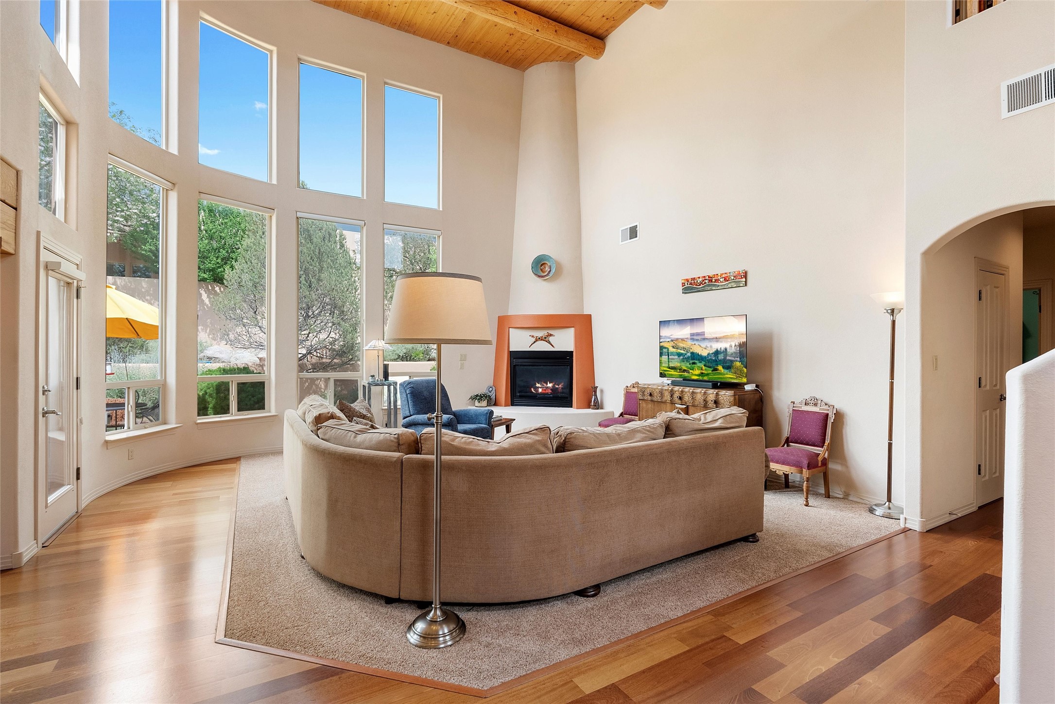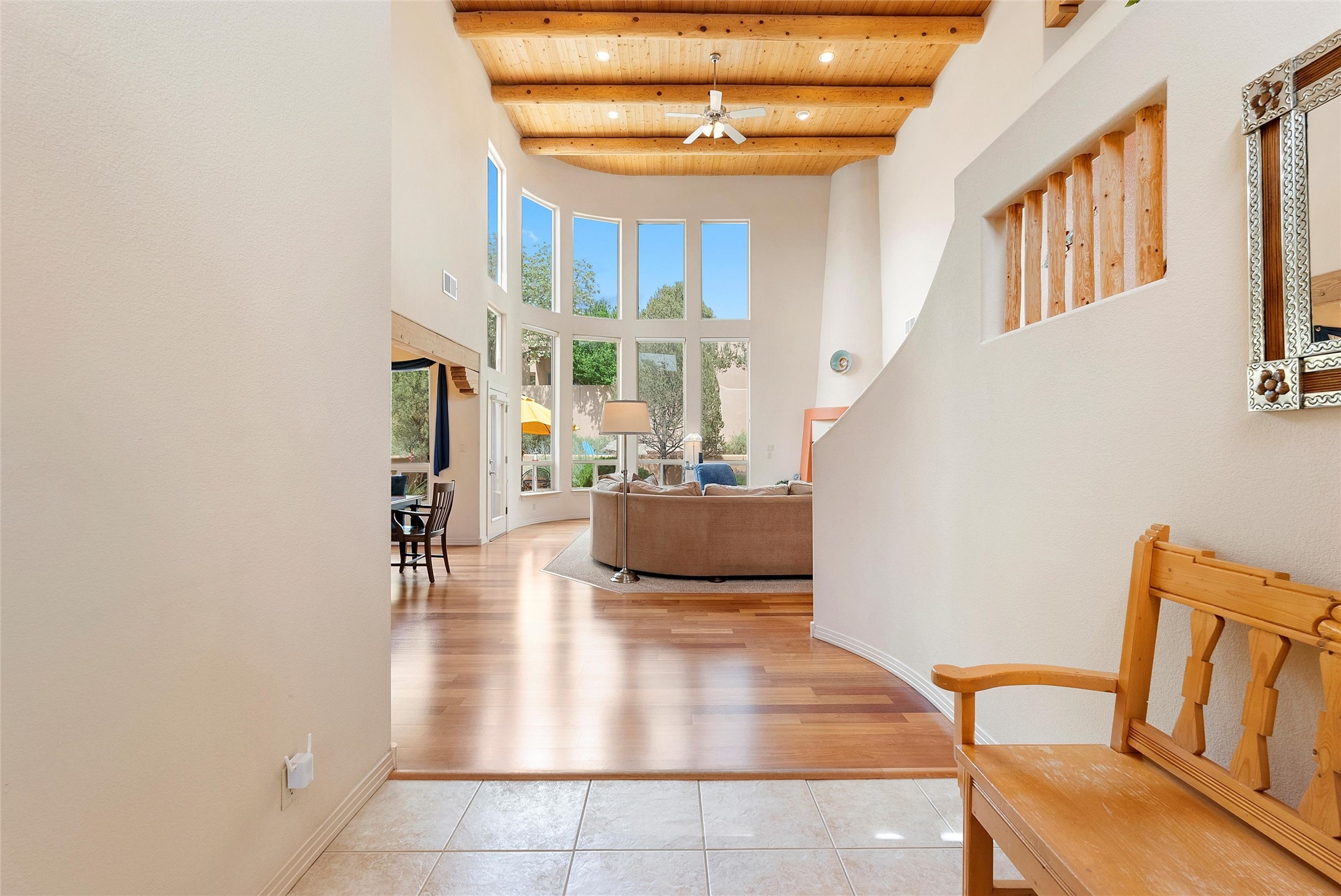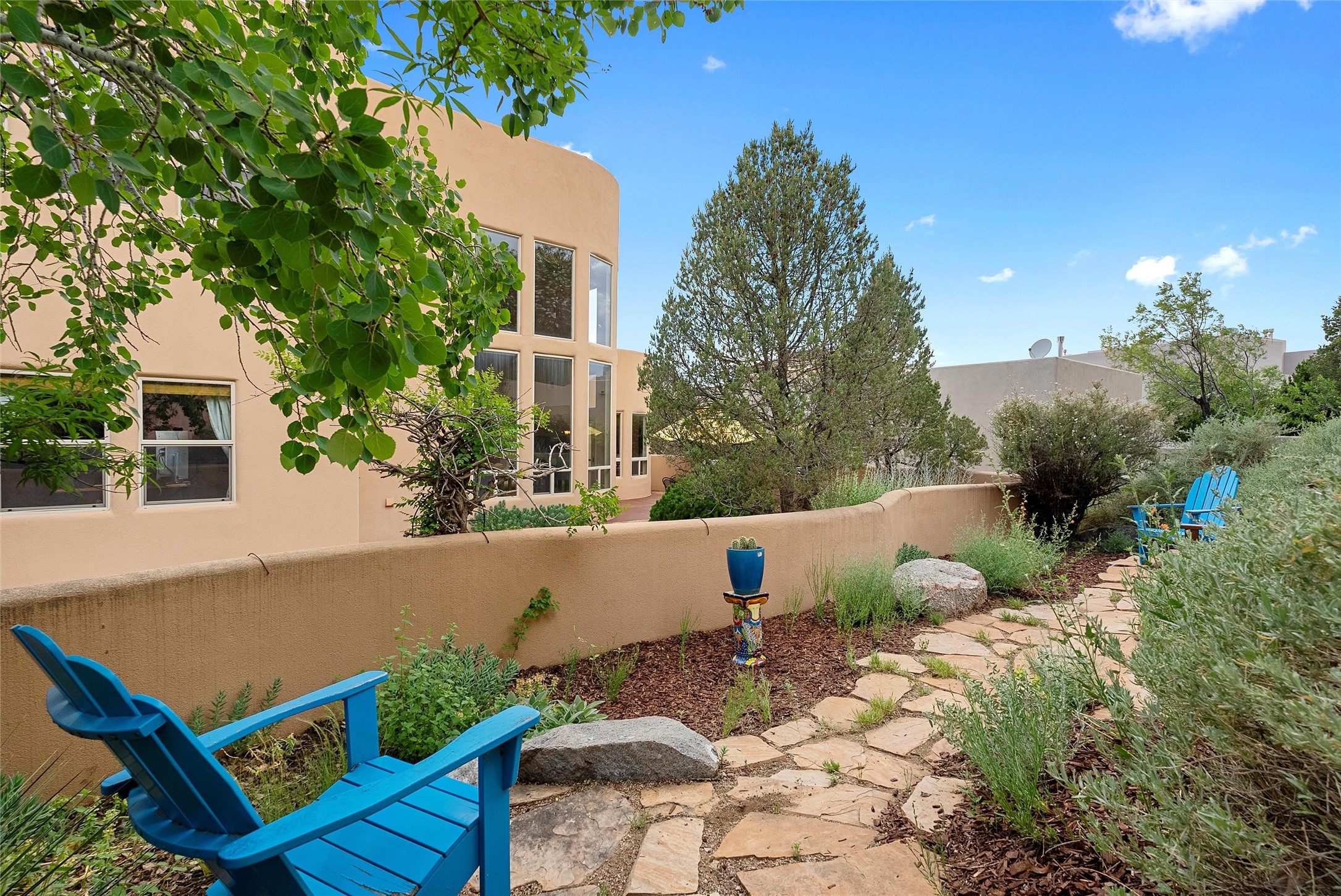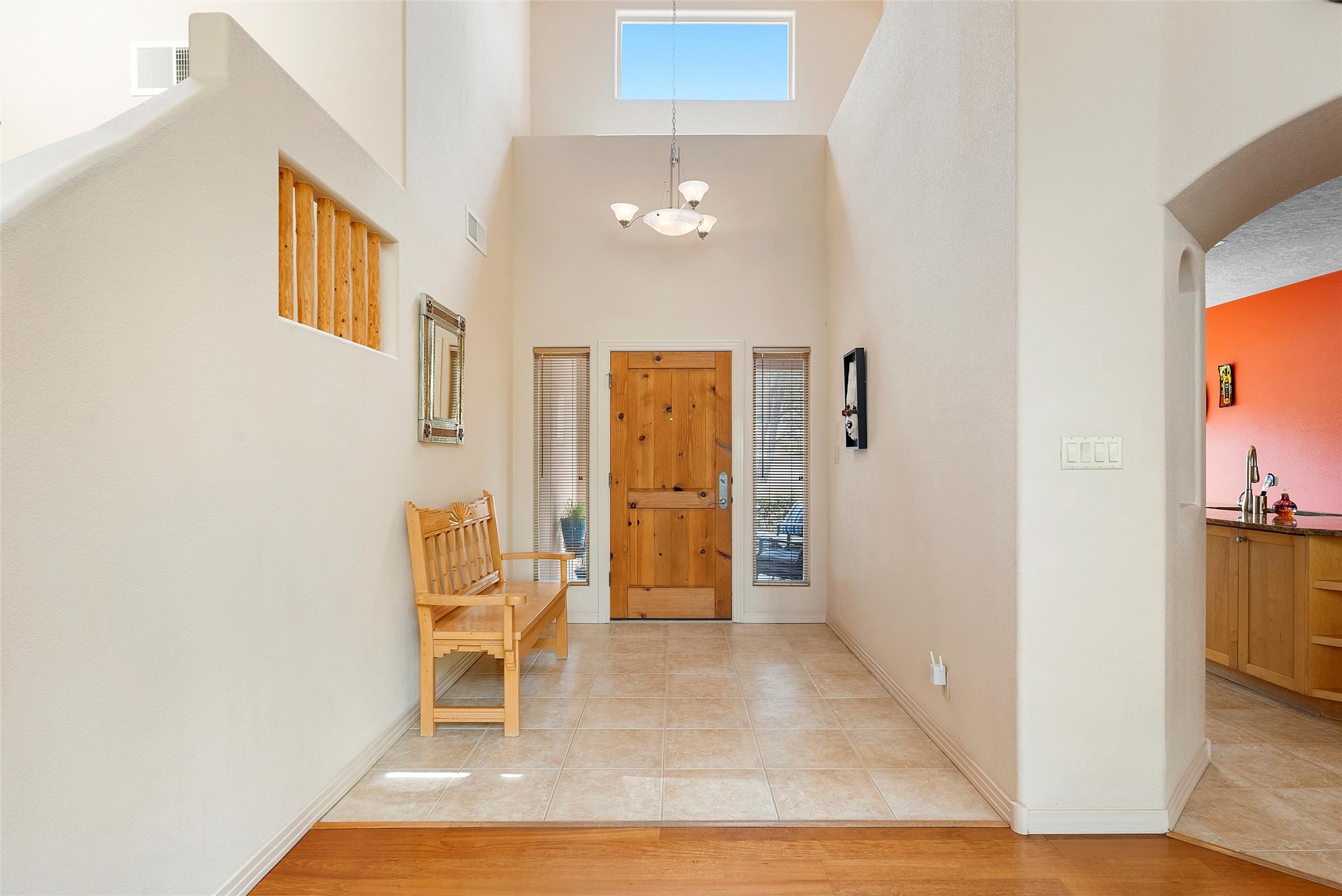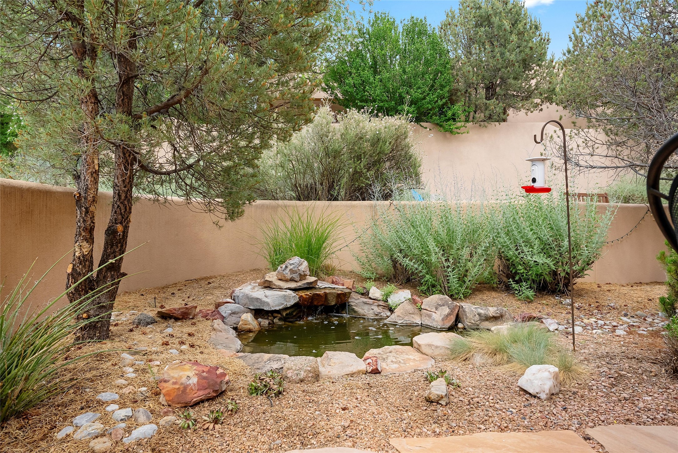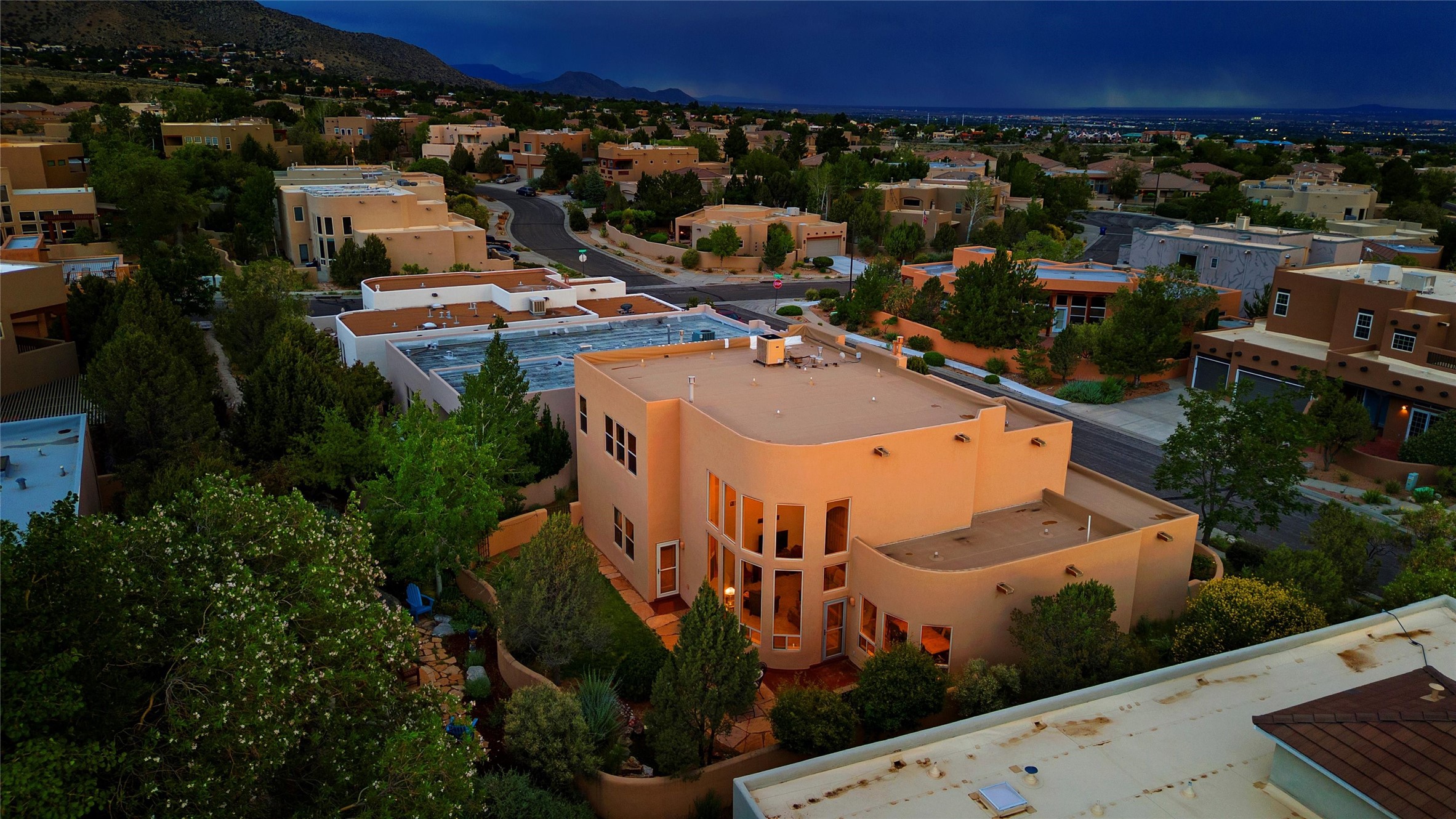 Tucked away on a no-through street, in the coveted Solterra at High Desert community, this serene sanctuary offers a rare blend of comfort and elegance. Passing through the peaceful courtyard into the home you are welcomed with Brazilian cherry wood floors, soaring cathedral ceilings, and a dramatic wall of windows that flood the living space with natural light. The entire top floor is dedicated to the comfort and enjoyment of the primary residents - with a spacious bedroom that includes a reading nook or office, a luxurious bath, and an organized closet space. Opposite the bedroom is a stunning balcony with mountain views and a peek of the city, ideal for sunrise coffee, intimate stargazing, or inviting friends up to watch fireworks or balloons. One of the three downstairs bedrooms has an ensuite bath and separate entrance - perfect for guests or multi-generational living. The kitchen and living areas flow seamlessly into a beautifully landscaped backyard with a water feature --an ideal spot for outdoor dining or quiet reflection. With a 3-car garage, an oversized under-stair closet, and thoughtful upgrades like a whole house humidifier, NUVO water softener, and TPO roof, this home balances beauty and practicality in a premier Albuquerque neighborhood.