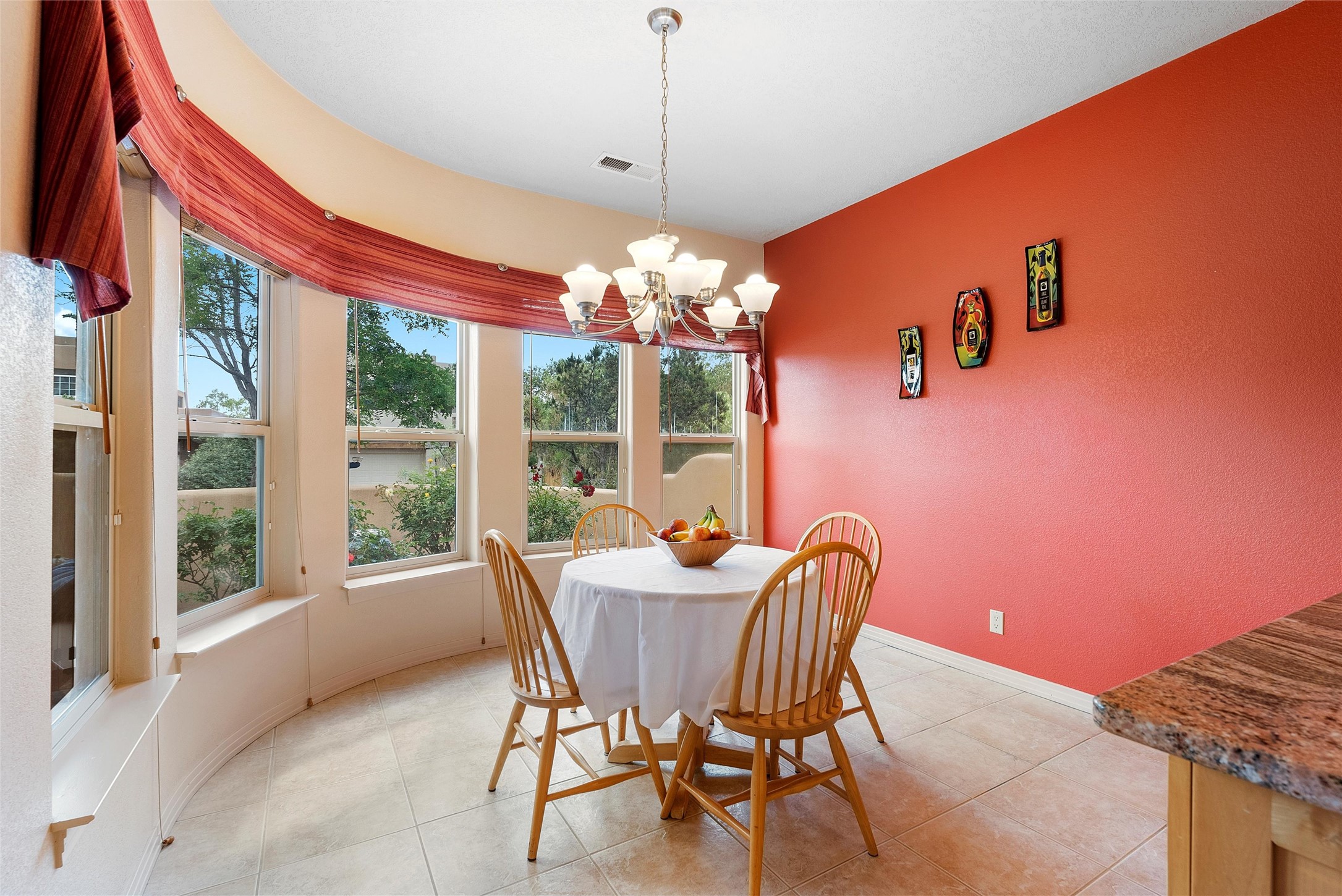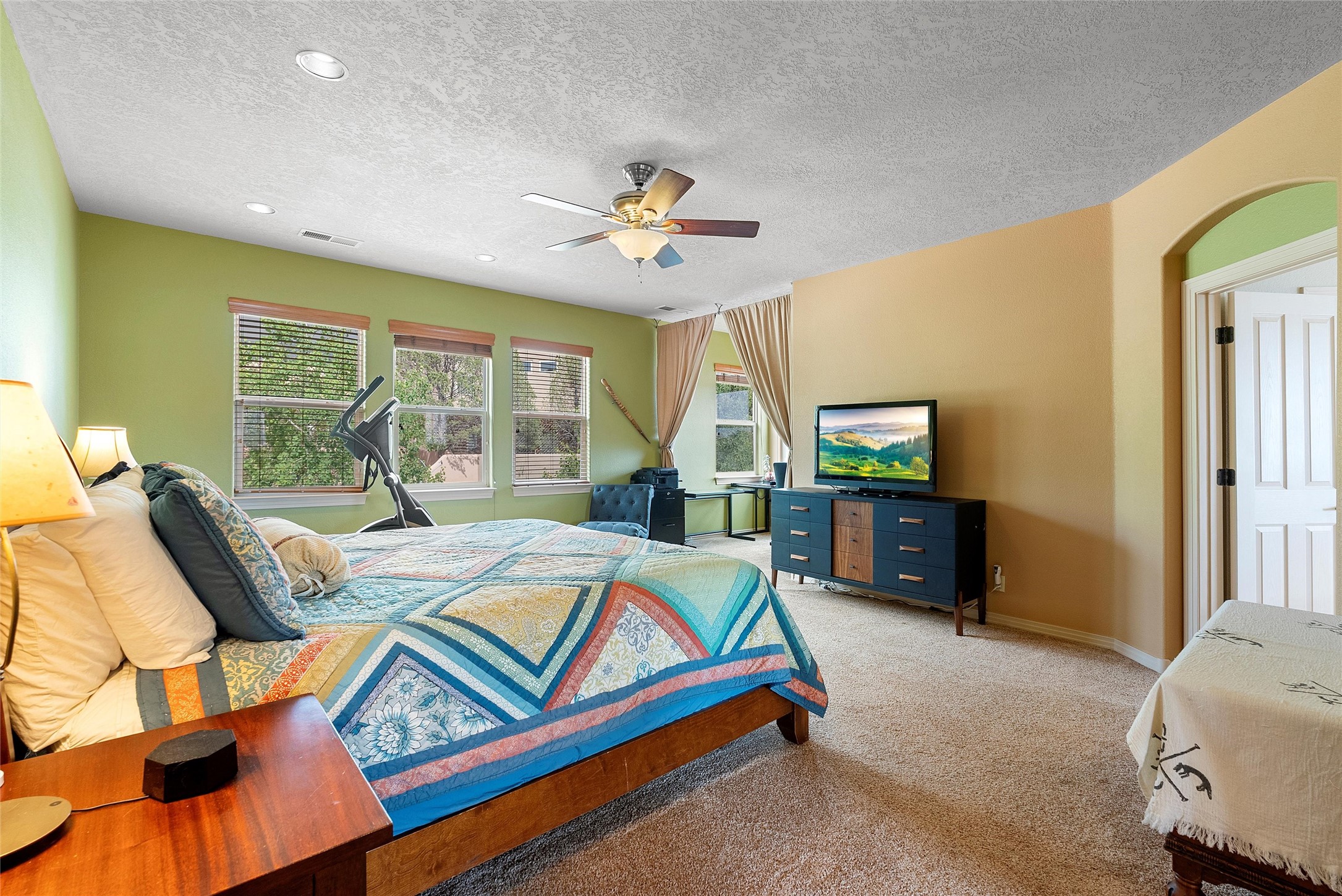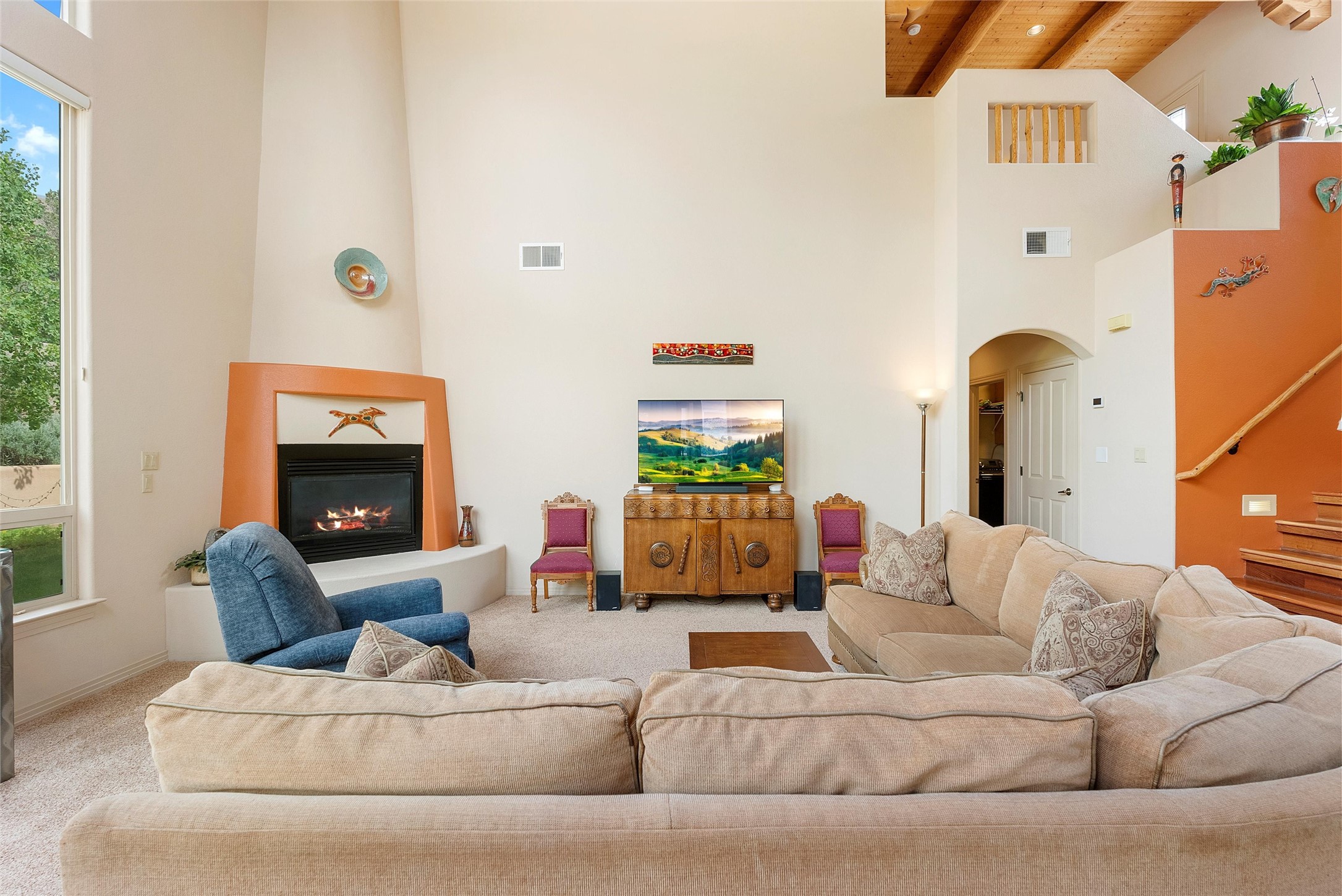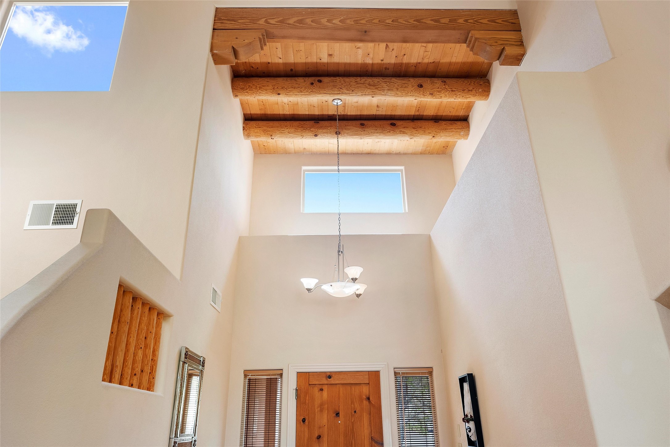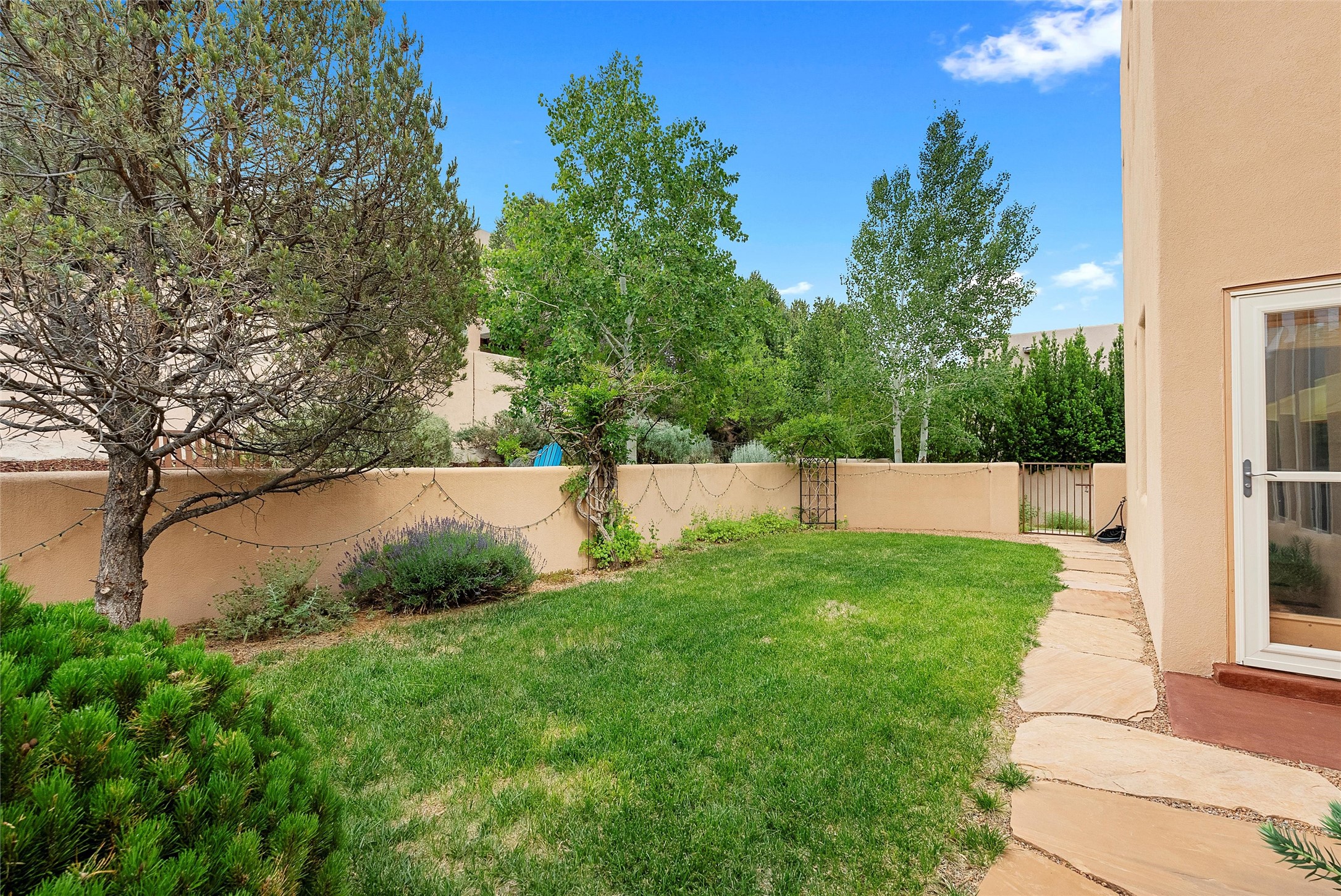 Tucked away on a no-through street, in the coveted Solterra at High Desert community, this serene sanctuary offers a rare blend of comfort and elegance. Passing through the peaceful courtyard into the home you are welcomed with Brazilian cherry wood floors, soaring cathedral ceilings, and a dramatic wall of windows that flood the living space with natural light. The entire top floor is dedicated to the comfort and enjoyment of the primary residents - with a spacious bedroom that includes a reading nook or office, a luxurious bath, and an organized closet space. Opposite the bedroom is a stunning balcony with mountain views and a peek of the city, ideal for sunrise coffee, intimate stargazing, or inviting friends up to watch fireworks or balloons. One of the three downstairs bedrooms has an ensuite bath and separate entrance - perfect for guests or multi-generational living. The kitchen and living areas flow seamlessly into a beautifully landscaped backyard with a water feature --an ideal spot for outdoor dining or quiet reflection. With a 3-car garage, an oversized under-stair closet, and thoughtful upgrades like a whole house humidifier, NUVO water softener, and TPO roof, this home balances beauty and practicality in a premier Albuquerque neighborhood.