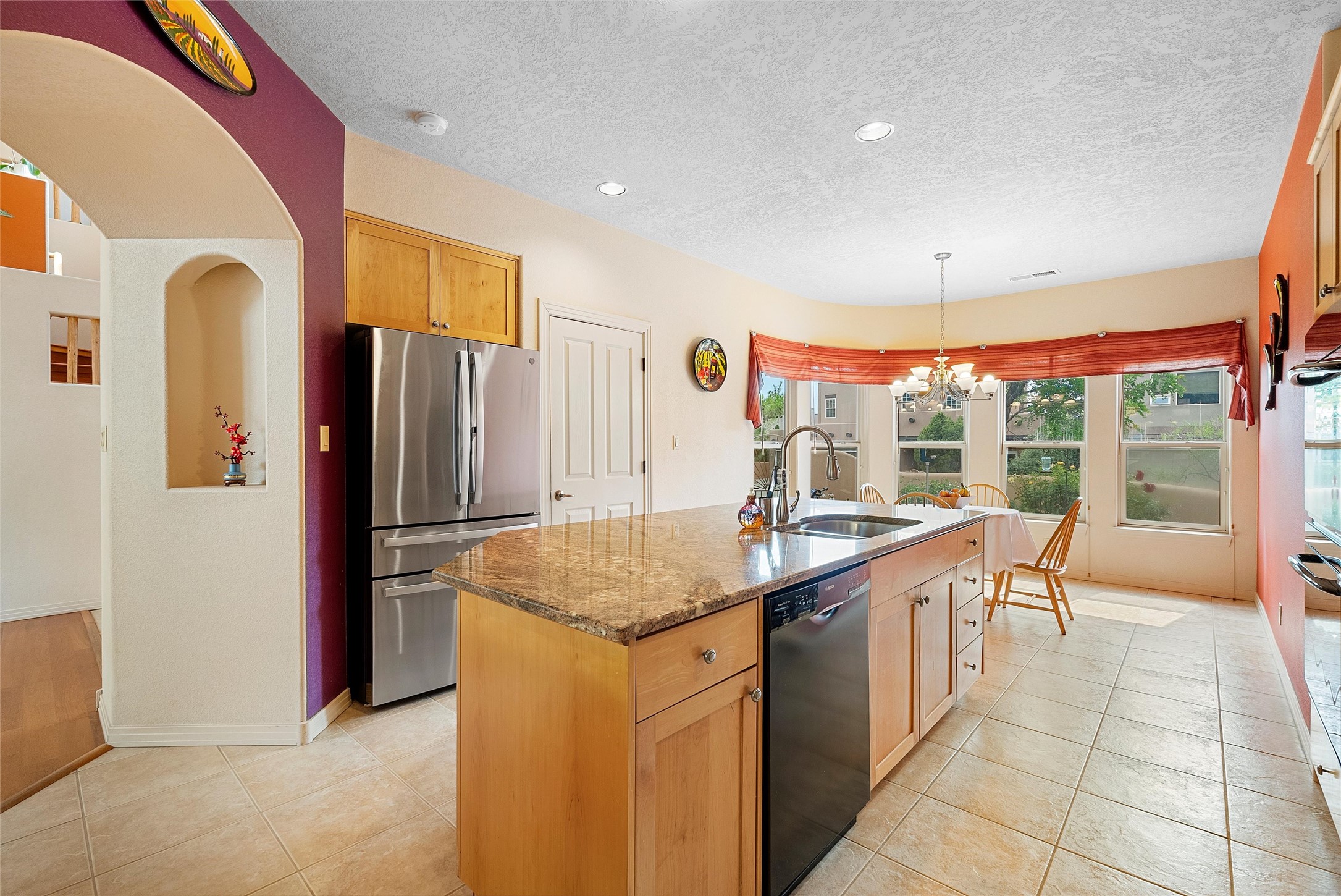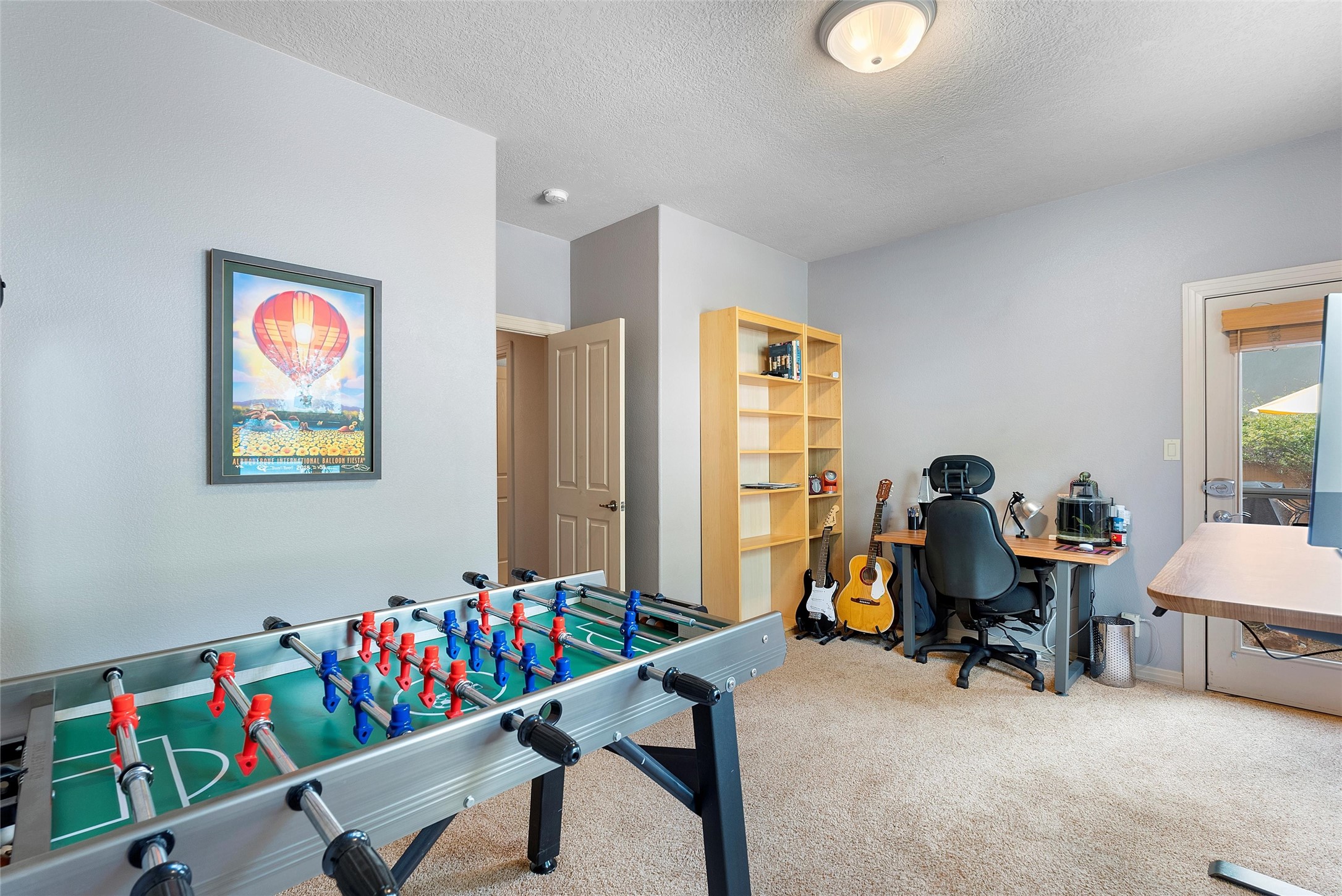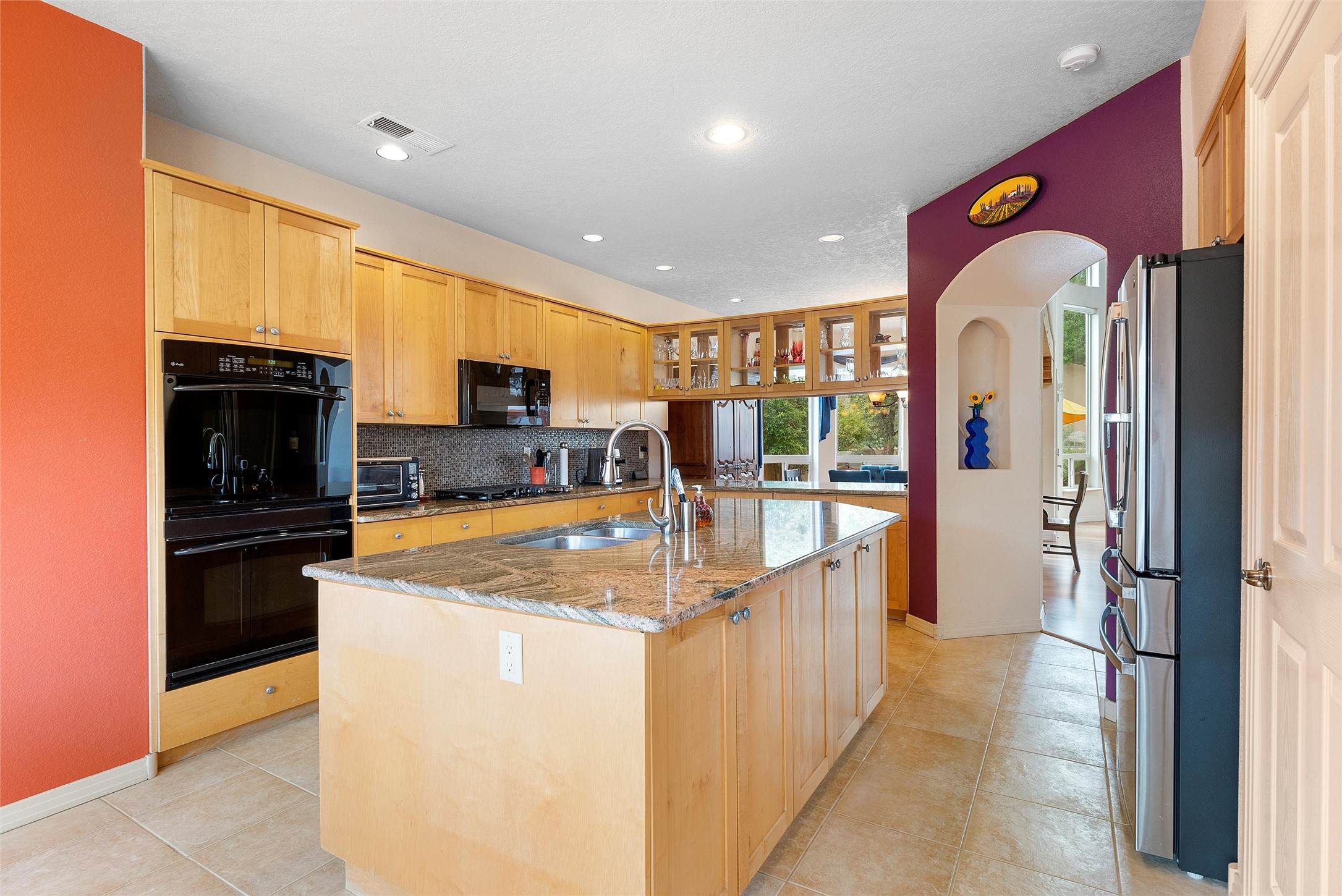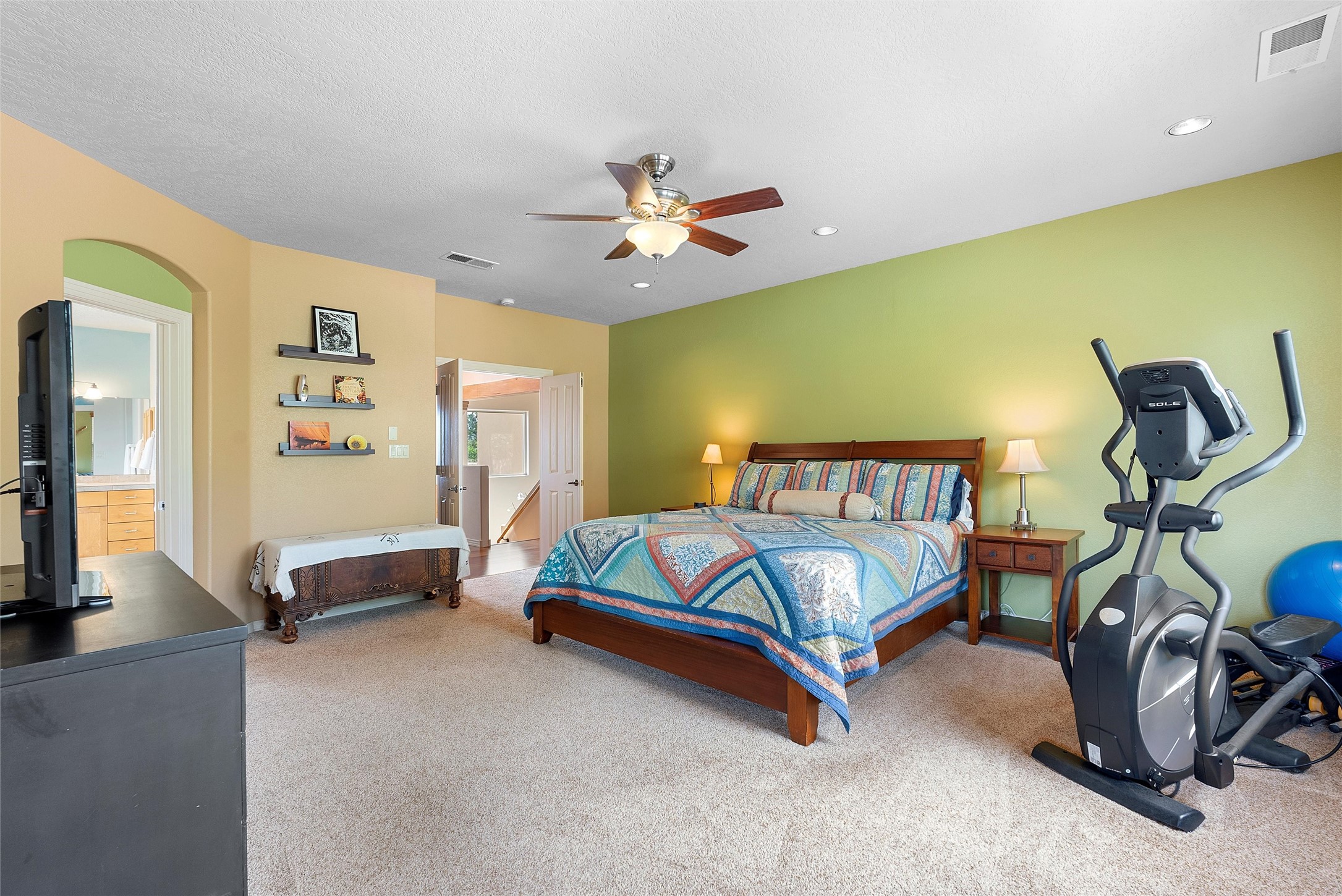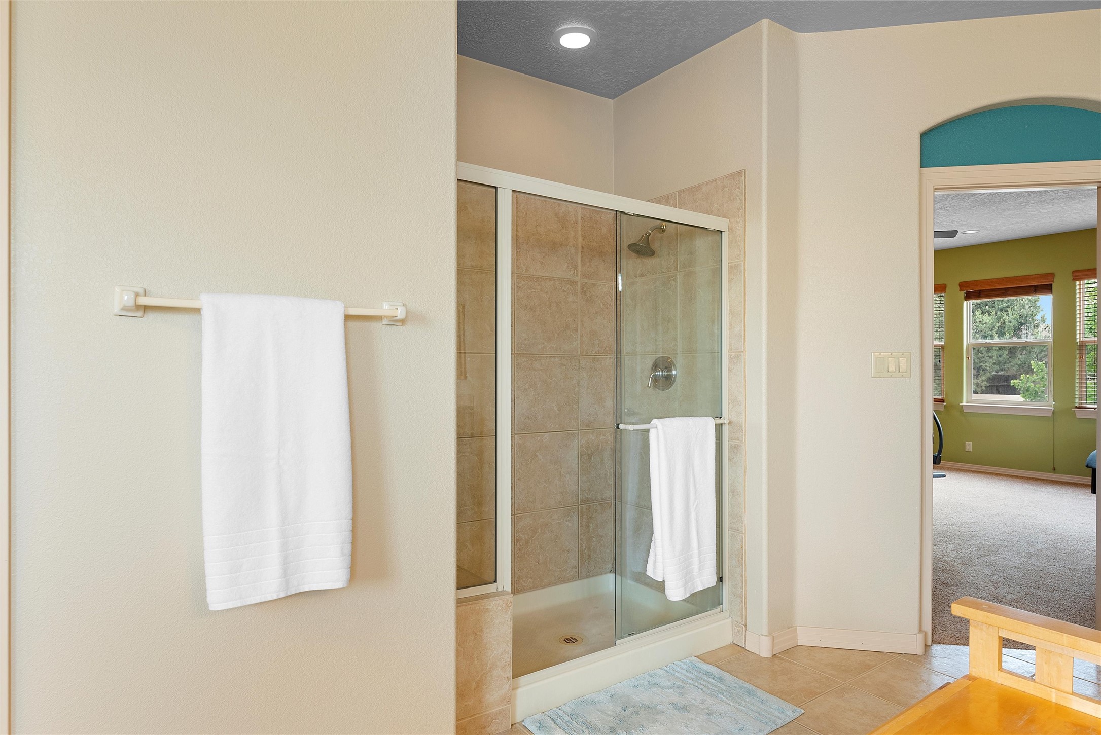 Tucked away on a no-through street, in the coveted Solterra at High Desert community, this serene sanctuary offers a rare blend of comfort and elegance. Passing through the peaceful courtyard into the home you are welcomed with Brazilian cherry wood floors, soaring cathedral ceilings, and a dramatic wall of windows that flood the living space with natural light. The entire top floor is dedicated to the comfort and enjoyment of the primary residents - with a spacious bedroom that includes a reading nook or office, a luxurious bath, and an organized closet space. Opposite the bedroom is a stunning balcony with mountain views and a peek of the city, ideal for sunrise coffee, intimate stargazing, or inviting friends up to watch fireworks or balloons. One of the three downstairs bedrooms has an ensuite bath and separate entrance - perfect for guests or multi-generational living. The kitchen and living areas flow seamlessly into a beautifully landscaped backyard with a water feature --an ideal spot for outdoor dining or quiet reflection. With a 3-car garage, an oversized under-stair closet, and thoughtful upgrades like a whole house humidifier, NUVO water softener, and TPO roof, this home balances beauty and practicality in a premier Albuquerque neighborhood.