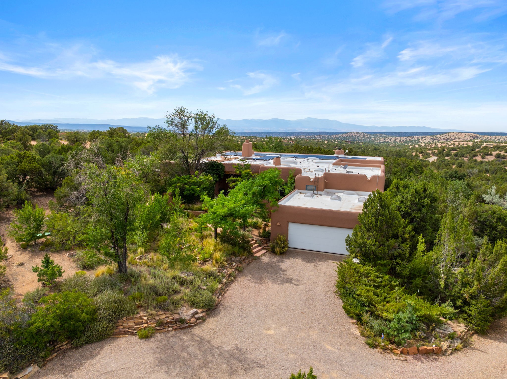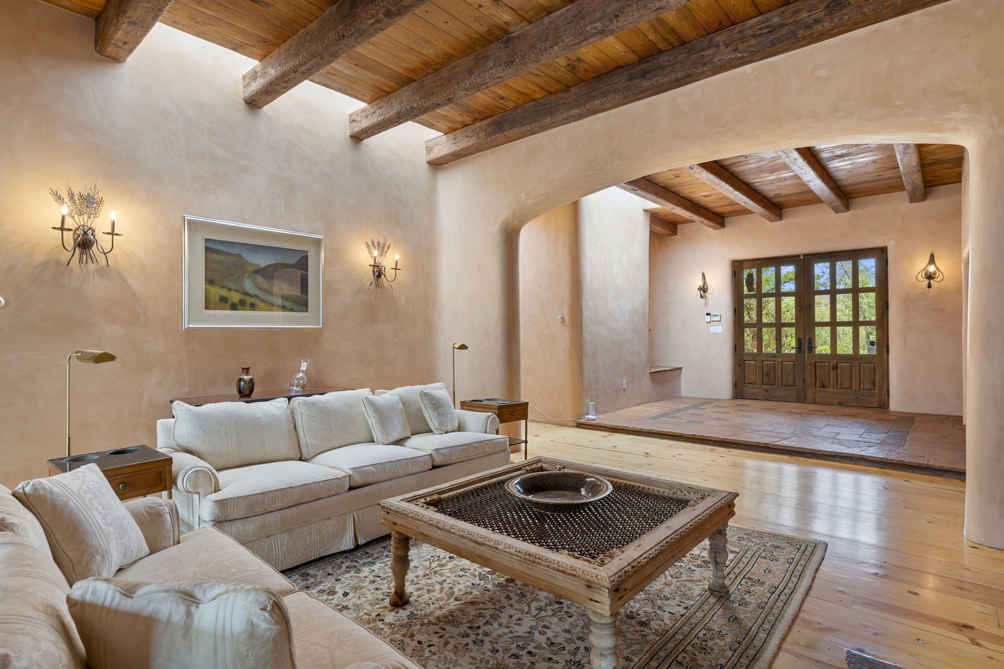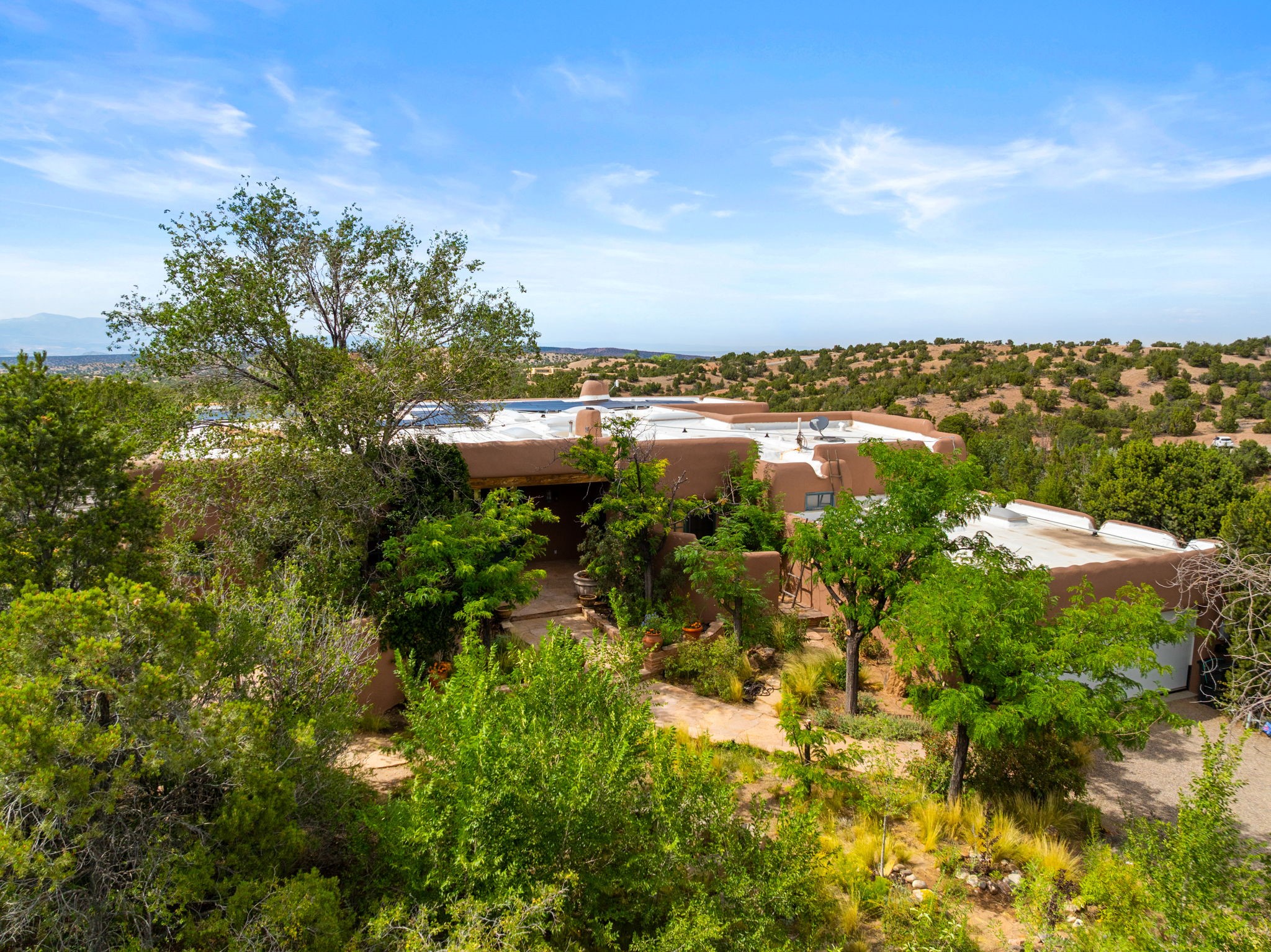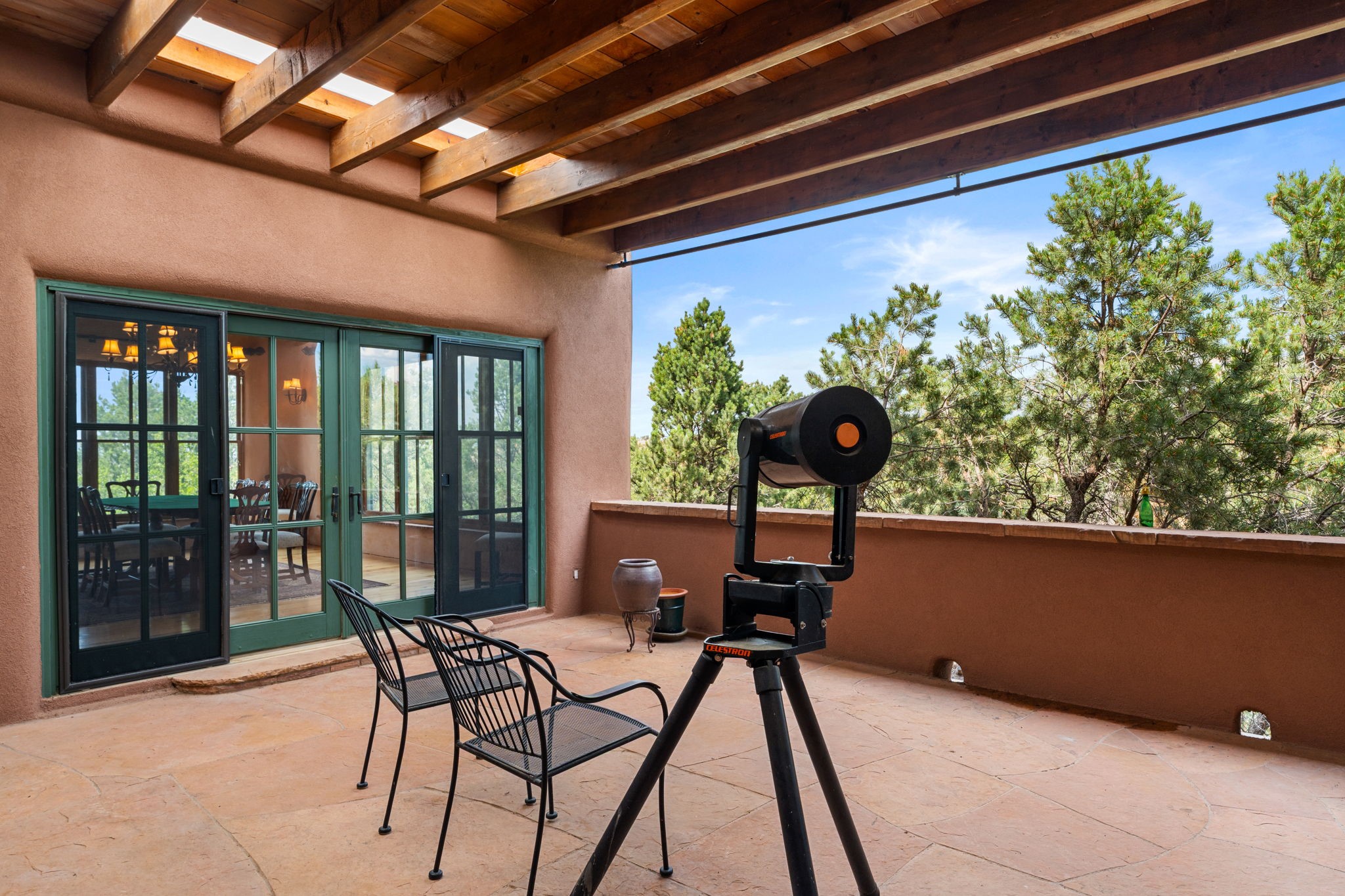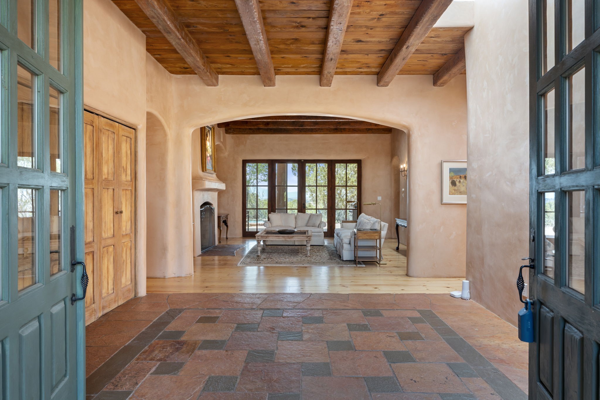 What kind of story are you ready for?? Santa Fe style meets European Country Estate! This 4 bedroom, 4 bathroom, high-quality Rastra construction features soaring ceilings, hand carved vigas, and far-reaching mountain views. Walking into the grand entrance, you are greeted by voluminous curved walls, golden-soft natural light, wide-plank pine floors, and a stately fireplace, which set the stage for an elegant Santa Fe lifestyle. The open concept French country kitchen faces a spacious den with views framed by large picture windows, and features an oversized island topped with granite. There is plenty of counter space for cooking and for entertaining guests. High-end appliances include a large Sub-Zero refrigerator, a six-burner Viking range, and a Bosch dishwasher. Additionally, this home's temperature-controlled wine cave accommodates 1500-2000 bottles for the serious aficionado. Relax in front of one of five fireplaces, and enjoy a large, formal dining room with views that will sweep guests off their feet! Or, linger over a morning cup of coffee on the grand portal overlooking the koi pond and the Jemez mountains. The lavish primary suite is on the main level and will have you living in luxury with a large deep, soaking tub, a private cedar-lined sauna, and a steam shower. There are several rooms downstairs (including a bathroom) which could be used as a mother-in-law suite, offices, or an artist studio. Complete with a TPO roof, an oversized two-car garage, and beautiful landscaping on drip irrigation, this is a timeless space you'll never want to leave. Rastra construction and owned solar panels create an extremely energy efficient environment, with almost non-existent electric bills. New stucco was done in 2025. Enjoy proximity to the club at Las Campanas, but without the high HOA fees. Don't miss this chance to live your dream Santa Fe lifestyle!