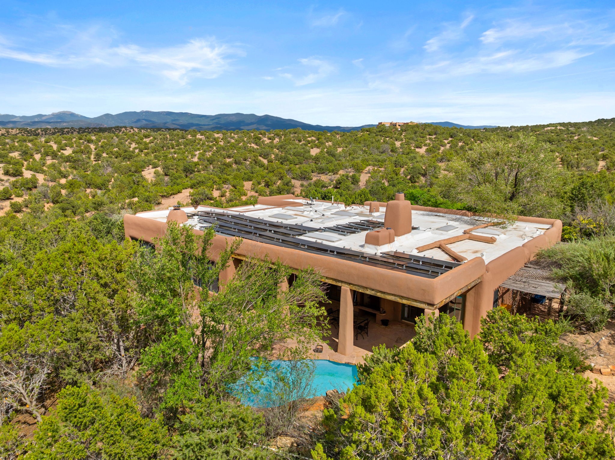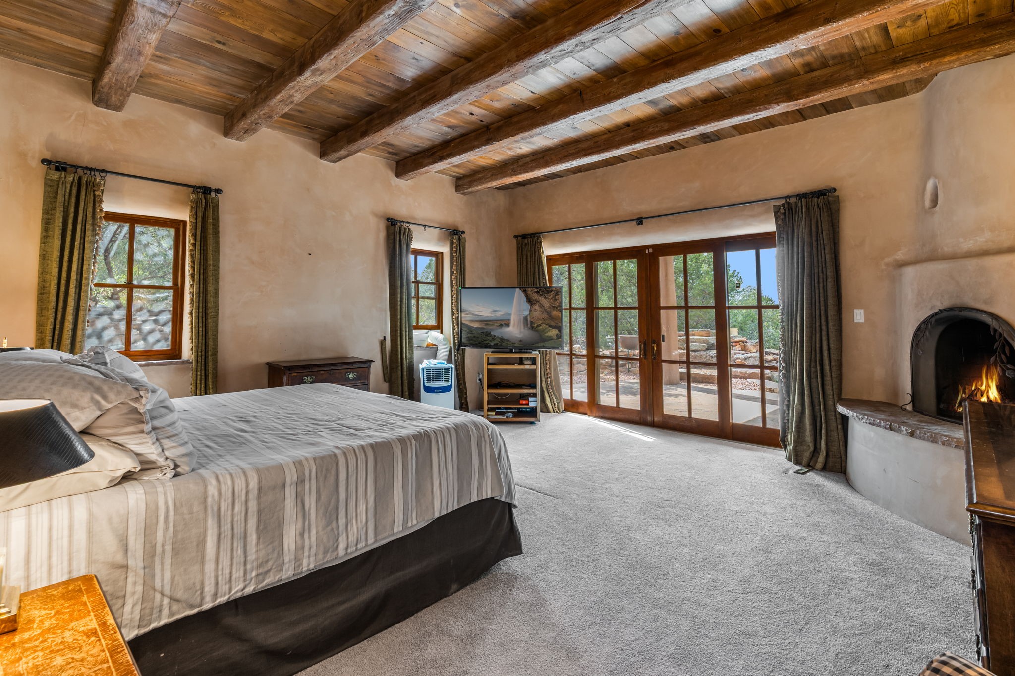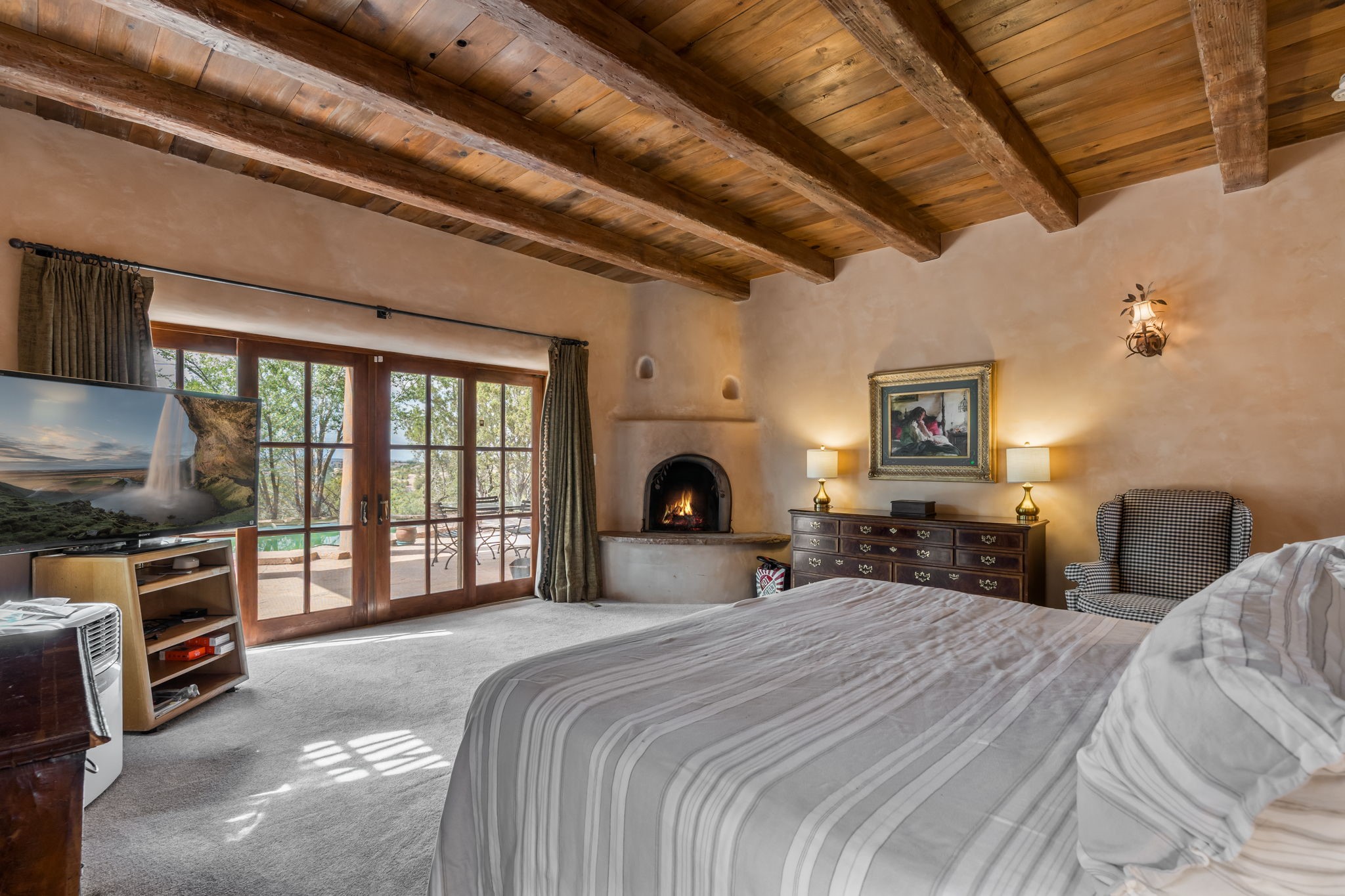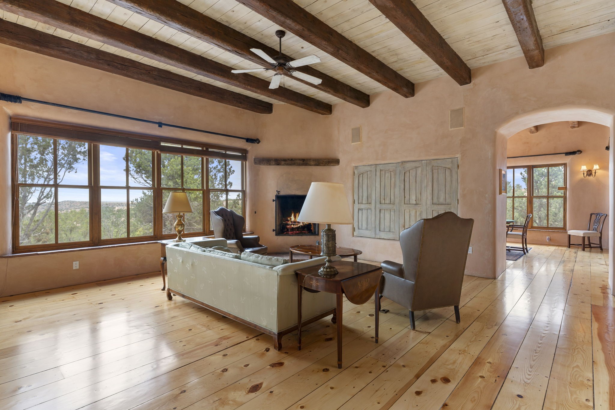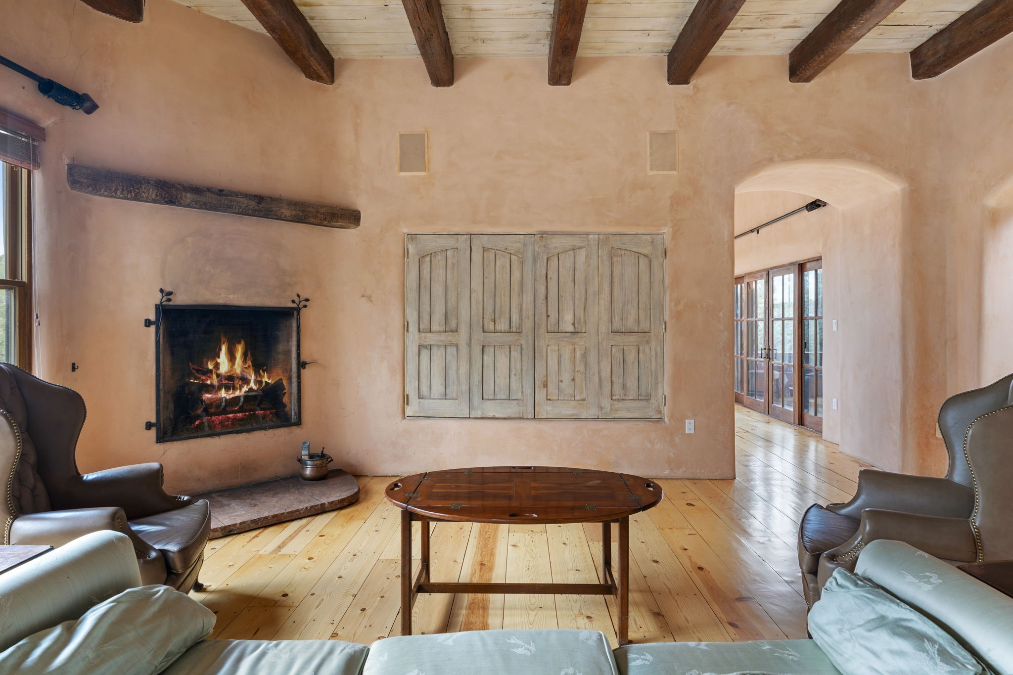 What kind of story are you ready for?? Santa Fe style meets European Country Estate! This 4 bedroom, 4 bathroom, high-quality Rastra construction features soaring ceilings, hand carved vigas, and far-reaching mountain views. Walking into the grand entrance, you are greeted by voluminous curved walls, golden-soft natural light, wide-plank pine floors, and a stately fireplace, which set the stage for an elegant Santa Fe lifestyle. The open concept French country kitchen faces a spacious den with views framed by large picture windows, and features an oversized island topped with granite. There is plenty of counter space for cooking and for entertaining guests. High-end appliances include a large Sub-Zero refrigerator, a six-burner Viking range, and a Bosch dishwasher. Additionally, this home's temperature-controlled wine cave accommodates 1500-2000 bottles for the serious aficionado. Relax in front of one of five fireplaces, and enjoy a large, formal dining room with views that will sweep guests off their feet! Or, linger over a morning cup of coffee on the grand portal overlooking the koi pond and the Jemez mountains. The lavish primary suite is on the main level and will have you living in luxury with a large deep, soaking tub, a private cedar-lined sauna, and a steam shower. There are several rooms downstairs (including a bathroom) which could be used as a mother-in-law suite, offices, or an artist studio. Complete with a TPO roof, an oversized two-car garage, and beautiful landscaping on drip irrigation, this is a timeless space you'll never want to leave. Rastra construction and owned solar panels create an extremely energy efficient environment, with almost non-existent electric bills. New stucco was done in 2025. Enjoy proximity to the club at Las Campanas, but without the high HOA fees. Don't miss this chance to live your dream Santa Fe lifestyle!