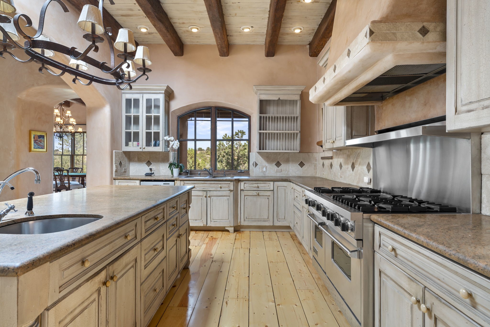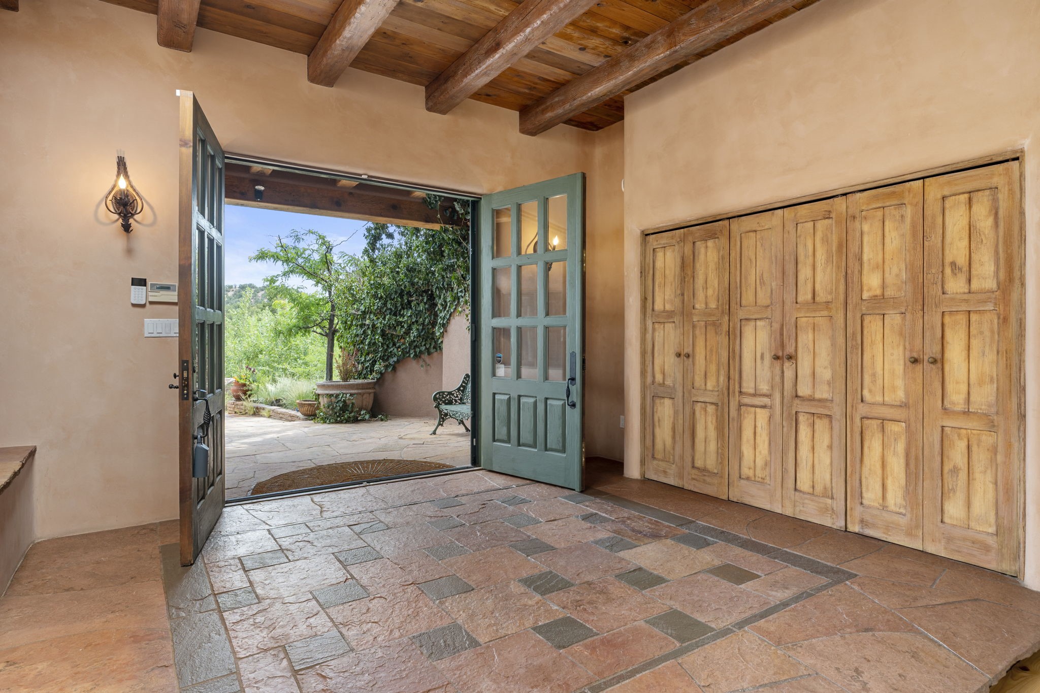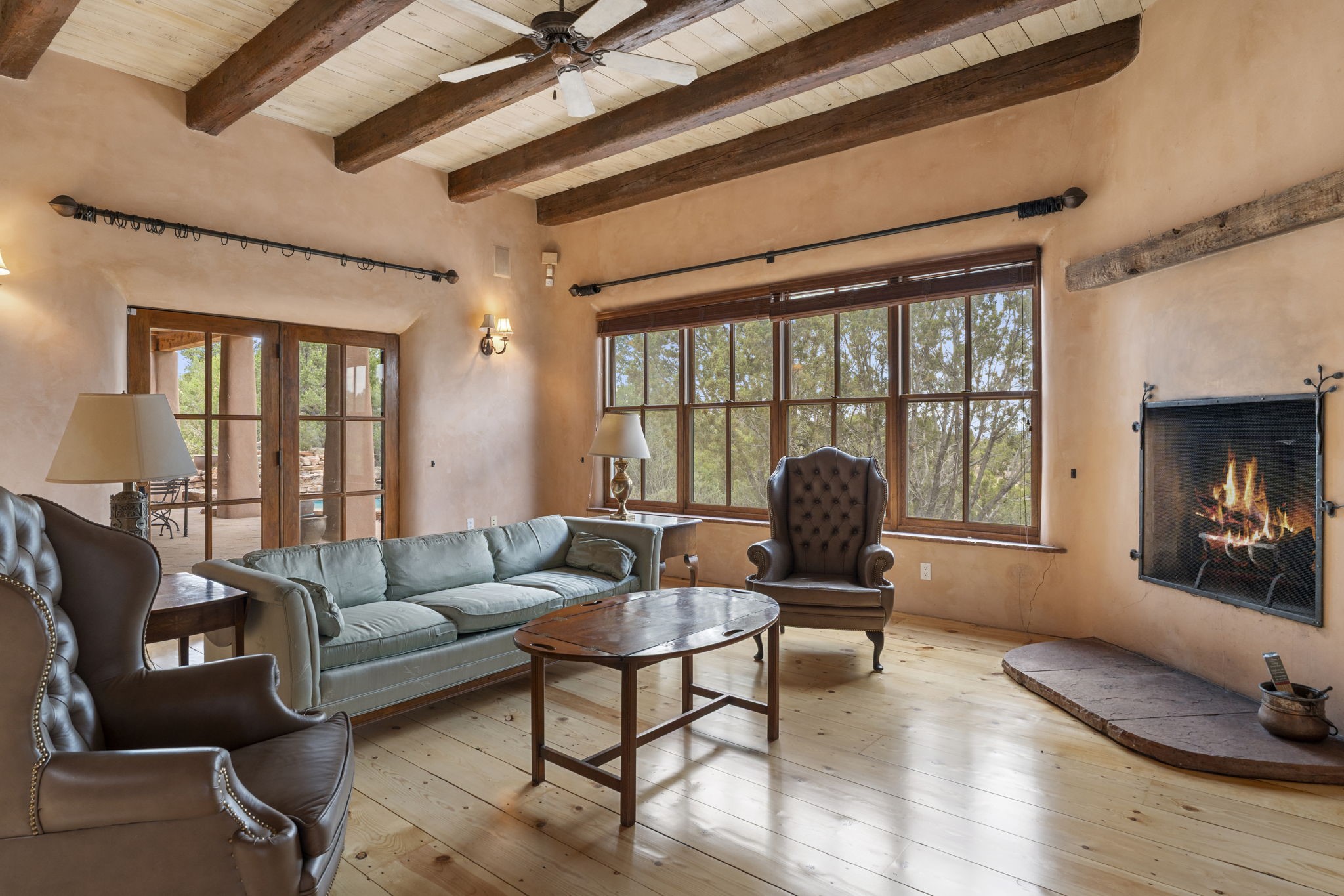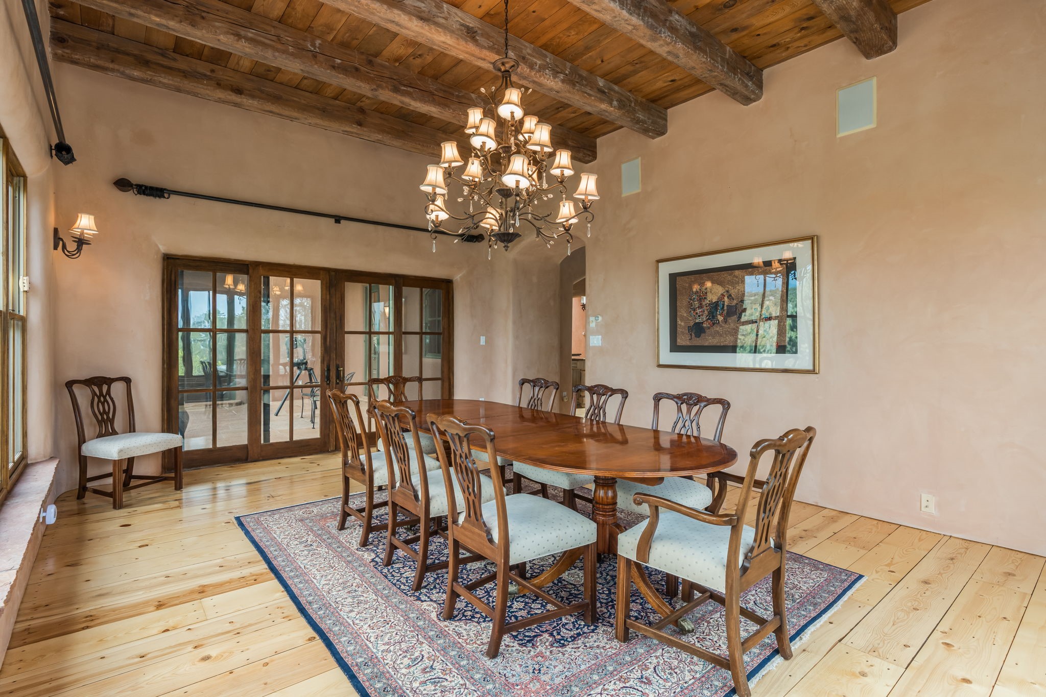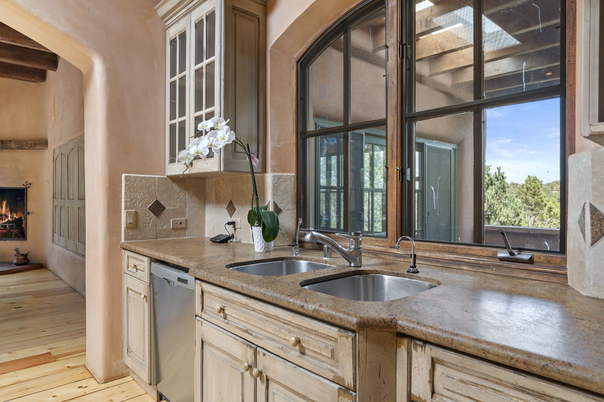 What kind of story are you ready for?? Santa Fe style meets European Country Estate! This 4 bedroom, 4 bathroom, high-quality Rastra construction features soaring ceilings, hand carved vigas, and far-reaching mountain views. Walking into the grand entrance, you are greeted by voluminous curved walls, golden-soft natural light, wide-plank pine floors, and a stately fireplace, which set the stage for an elegant Santa Fe lifestyle. The open concept French country kitchen faces a spacious den with views framed by large picture windows, and features an oversized island topped with granite. There is plenty of counter space for cooking and for entertaining guests. High-end appliances include a large Sub-Zero refrigerator, a six-burner Viking range, and a Bosch dishwasher. Additionally, this home's temperature-controlled wine cave accommodates 1500-2000 bottles for the serious aficionado. Relax in front of one of five fireplaces, and enjoy a large, formal dining room with views that will sweep guests off their feet! Or, linger over a morning cup of coffee on the grand portal overlooking the koi pond and the Jemez mountains. The lavish primary suite is on the main level and will have you living in luxury with a large deep, soaking tub, a private cedar-lined sauna, and a steam shower. There are several rooms downstairs (including a bathroom) which could be used as a mother-in-law suite, offices, or an artist studio. Complete with a TPO roof, an oversized two-car garage, and beautiful landscaping on drip irrigation, this is a timeless space you'll never want to leave. Rastra construction and owned solar panels create an extremely energy efficient environment, with almost non-existent electric bills. New stucco was done in 2025. Enjoy proximity to the club at Las Campanas, but without the high HOA fees. Don't miss this chance to live your dream Santa Fe lifestyle!