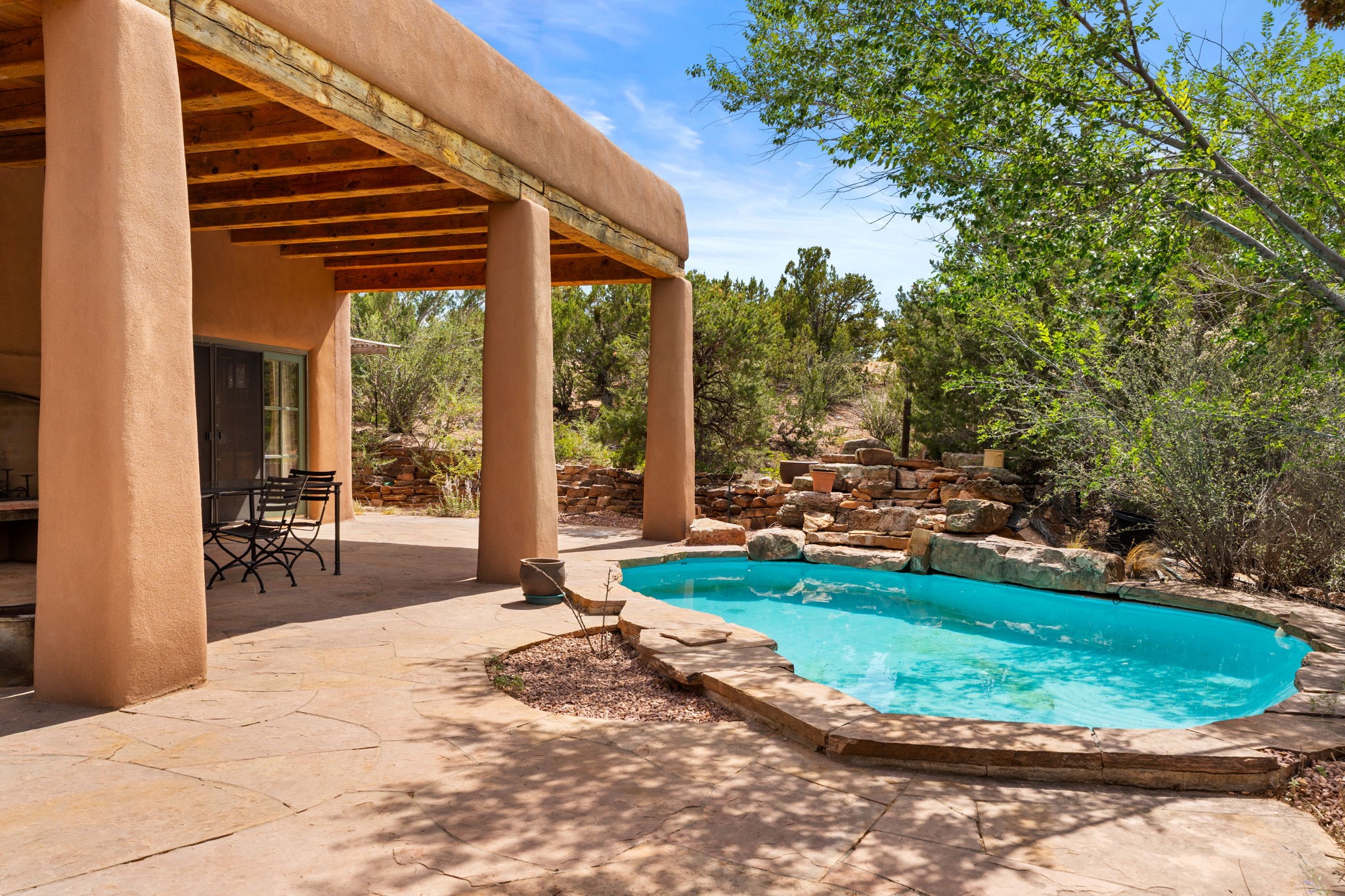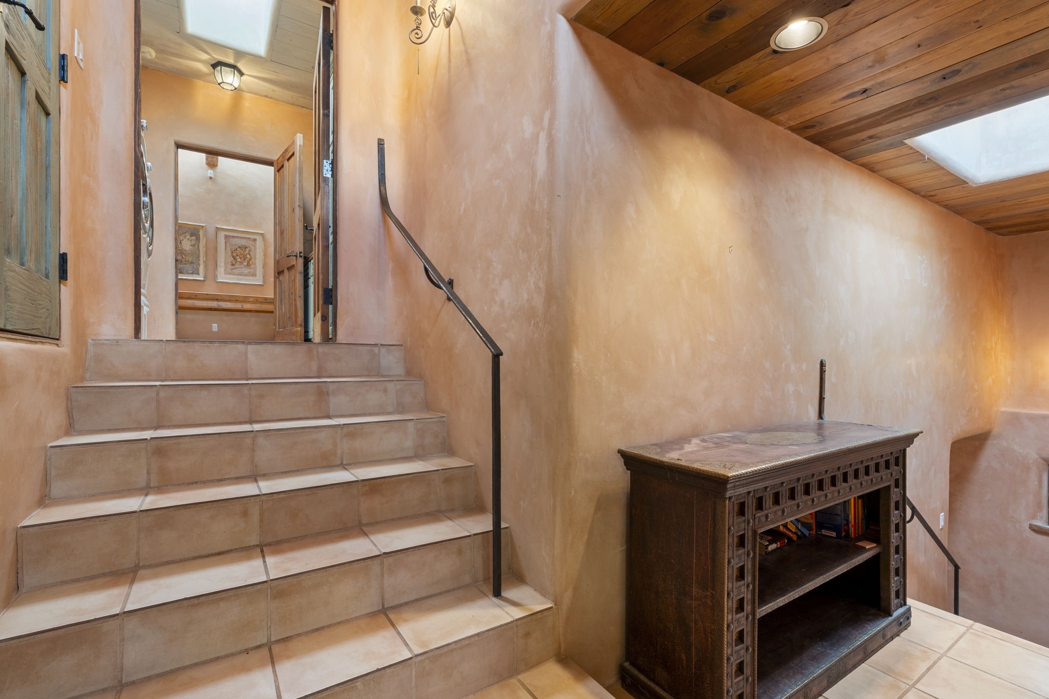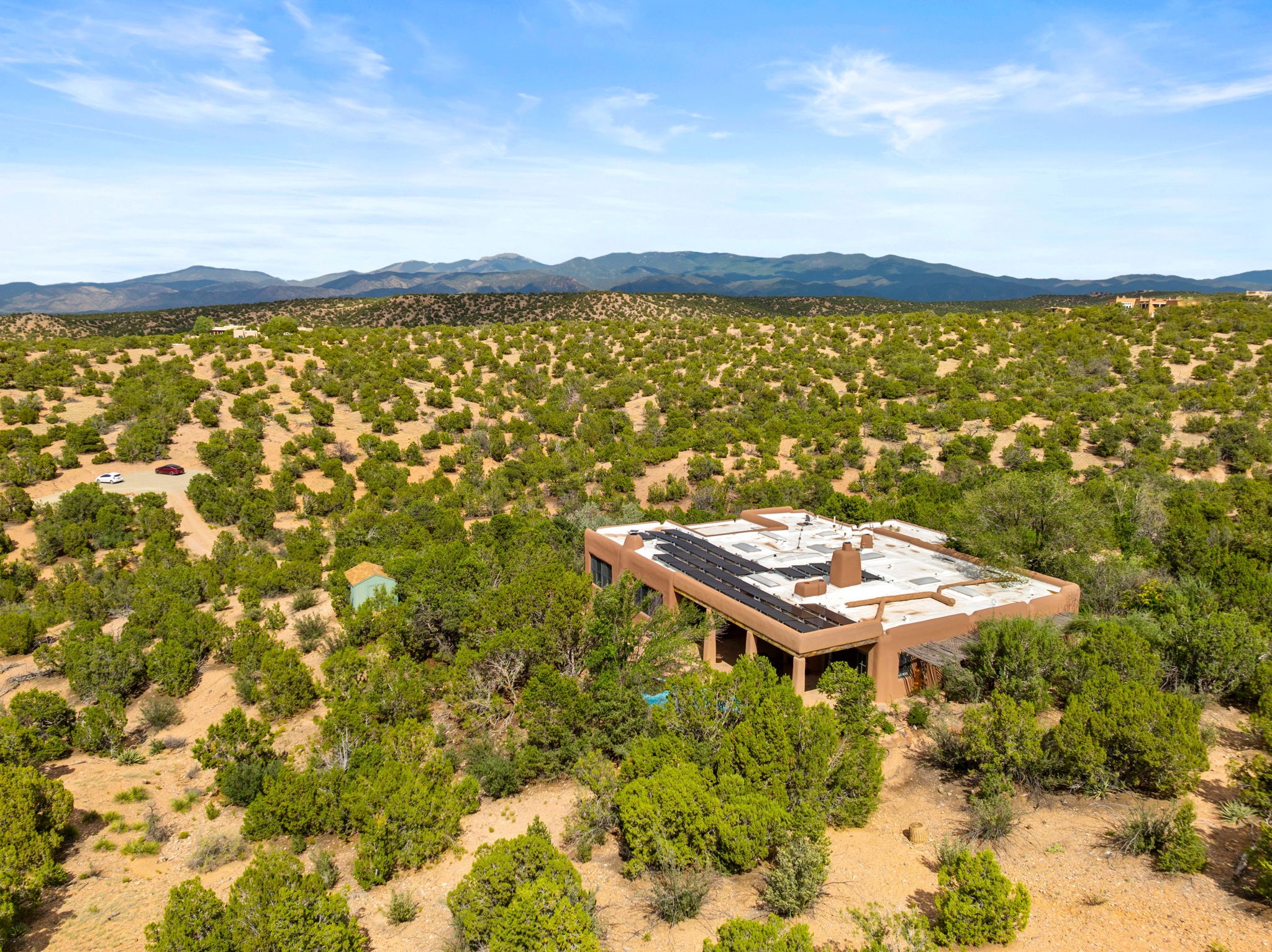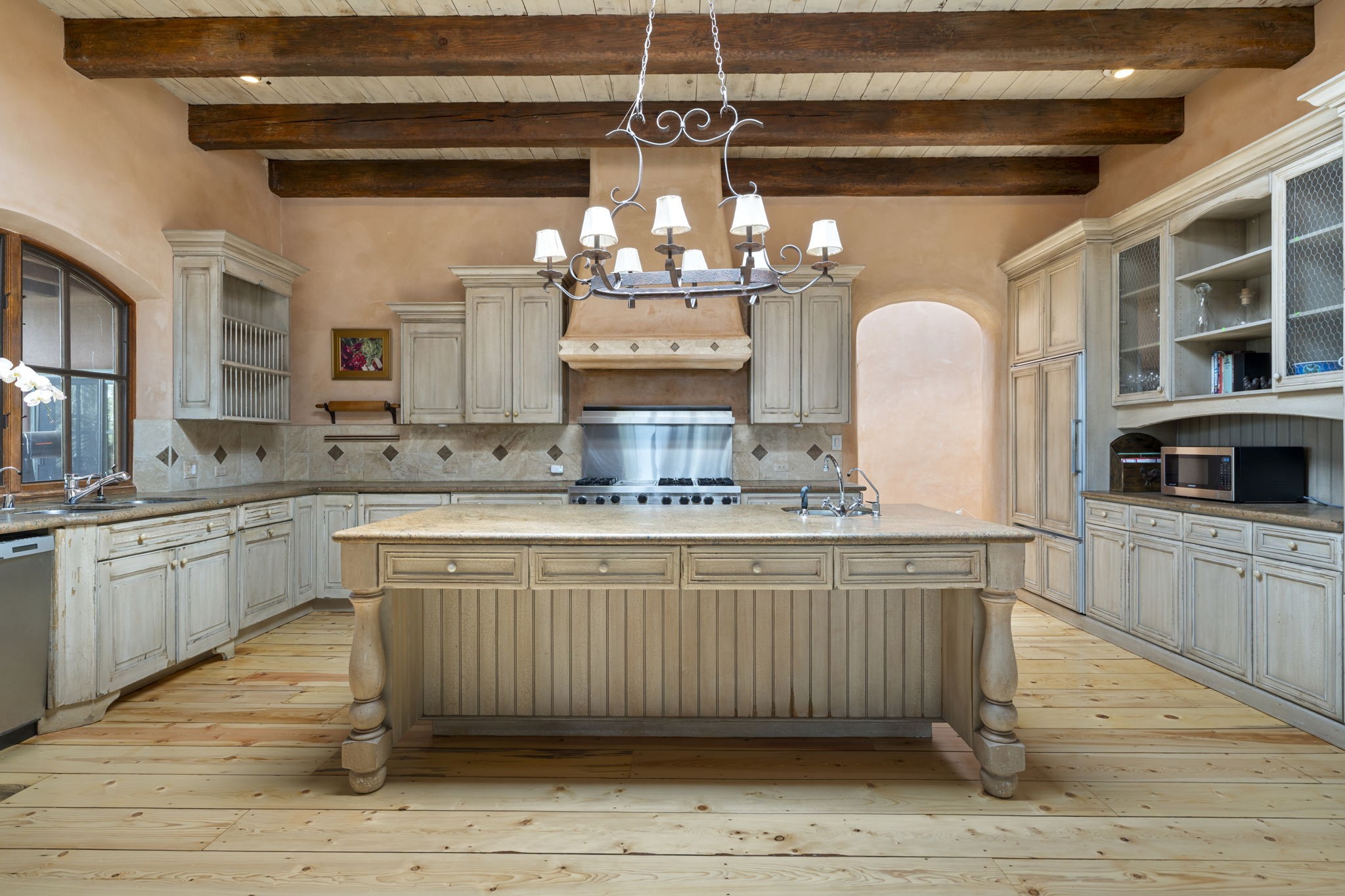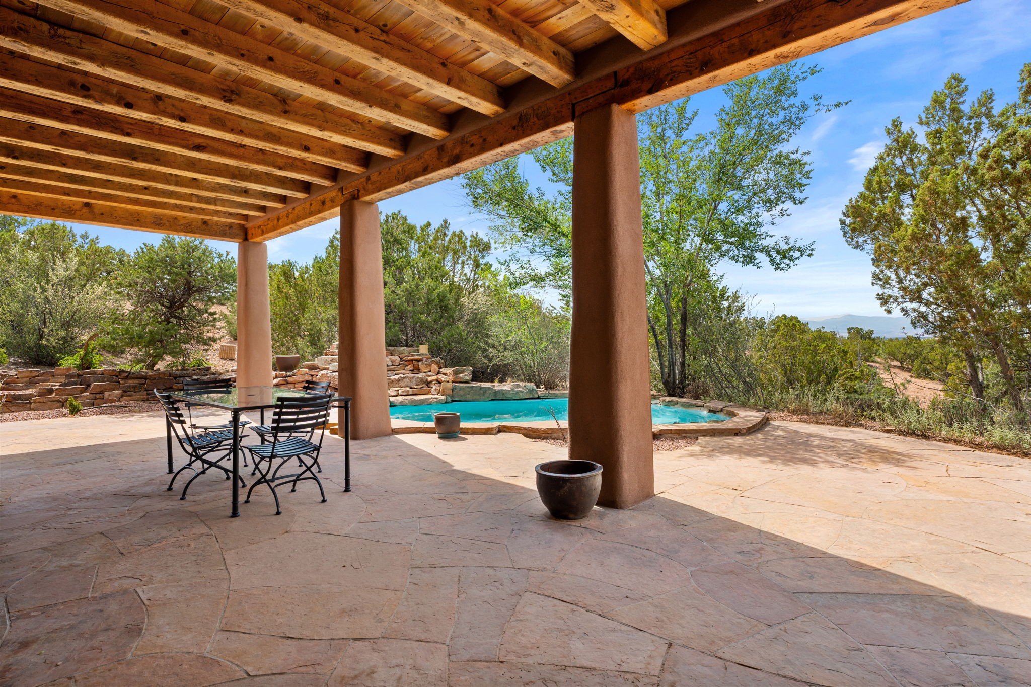What kind of story are you ready for?? Santa Fe style meets European Country Estate! This 4 bedroom, 4 bathroom, high-quality Rastra construction features soaring ceilings, hand carved vigas, and far-reaching mountain views. Walking into the grand entrance, you are greeted by voluminous curved walls, golden-soft natural light, wide-plank pine floors, and a stately fireplace, which set the stage for an elegant Santa Fe lifestyle. The open concept French country kitchen faces a spacious den with views framed by large picture windows, and features an oversized island topped with granite. There is plenty of counter space for cooking and for entertaining guests. High-end appliances include a large Sub-Zero refrigerator, a six-burner Viking range, and a Bosch dishwasher. Additionally, this home's temperature-controlled wine cave accommodates 1500-2000 bottles for the serious aficionado. Relax in front of one of five fireplaces, and enjoy a large, formal dining room with views that will sweep guests off their feet! Or, linger over a morning cup of coffee on the grand portal overlooking the koi pond and the Jemez mountains. The lavish primary suite is on the main level and will have you living in luxury with a large deep, soaking tub, a private cedar-lined sauna, and a steam shower. There are several rooms downstairs (including a bathroom) which could be used as a mother-in-law suite, offices, or an artist studio. Complete with a TPO roof, an oversized two-car garage, and beautiful landscaping on drip irrigation, this is a timeless space you'll never want to leave. Rastra construction and owned solar panels create an extremely energy efficient environment, with almost non-existent electric bills. New stucco was done in 2025. Enjoy proximity to the club at Las Campanas, but without the high HOA fees. Don't miss this chance to live your dream Santa Fe lifestyle!