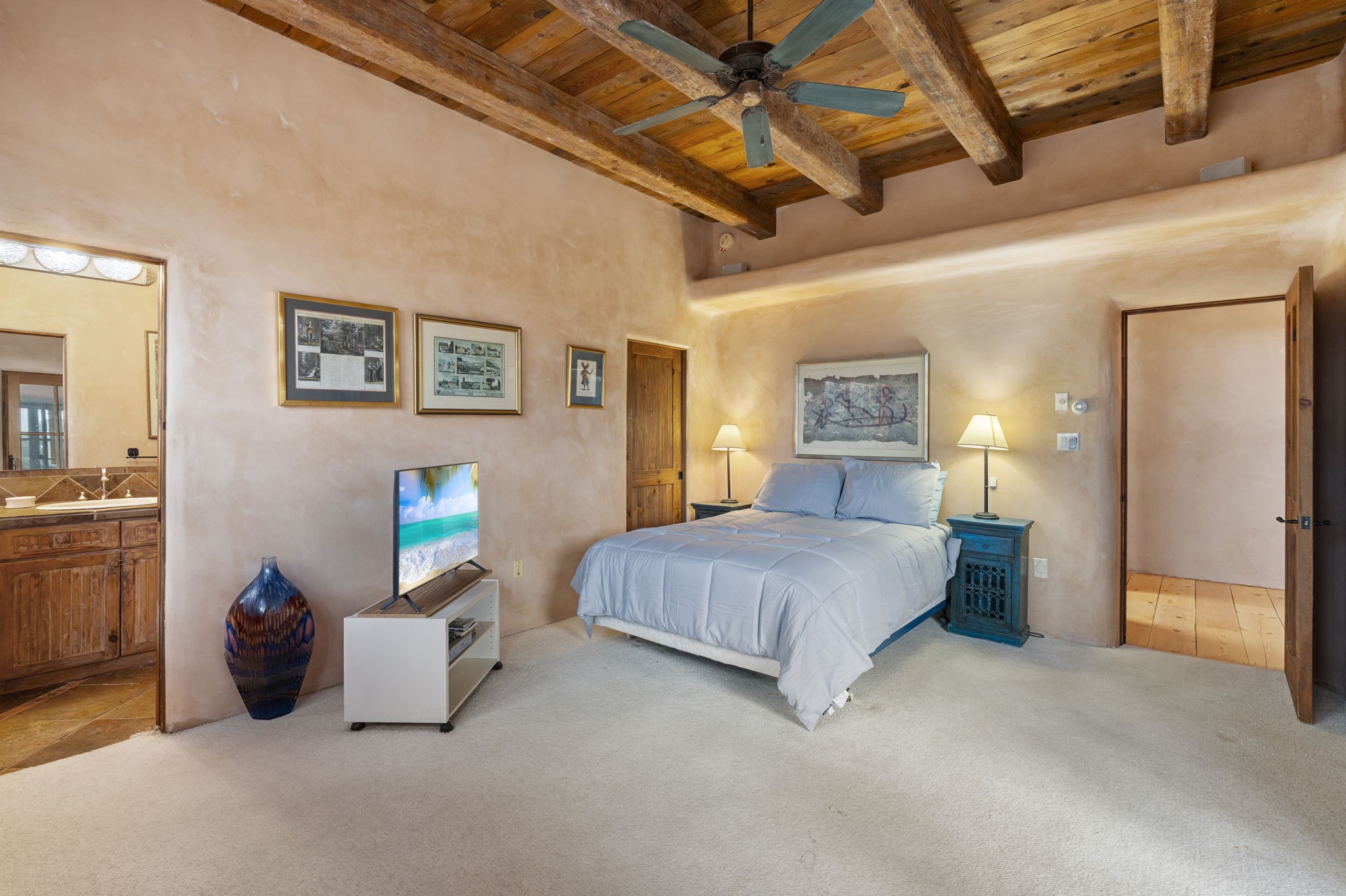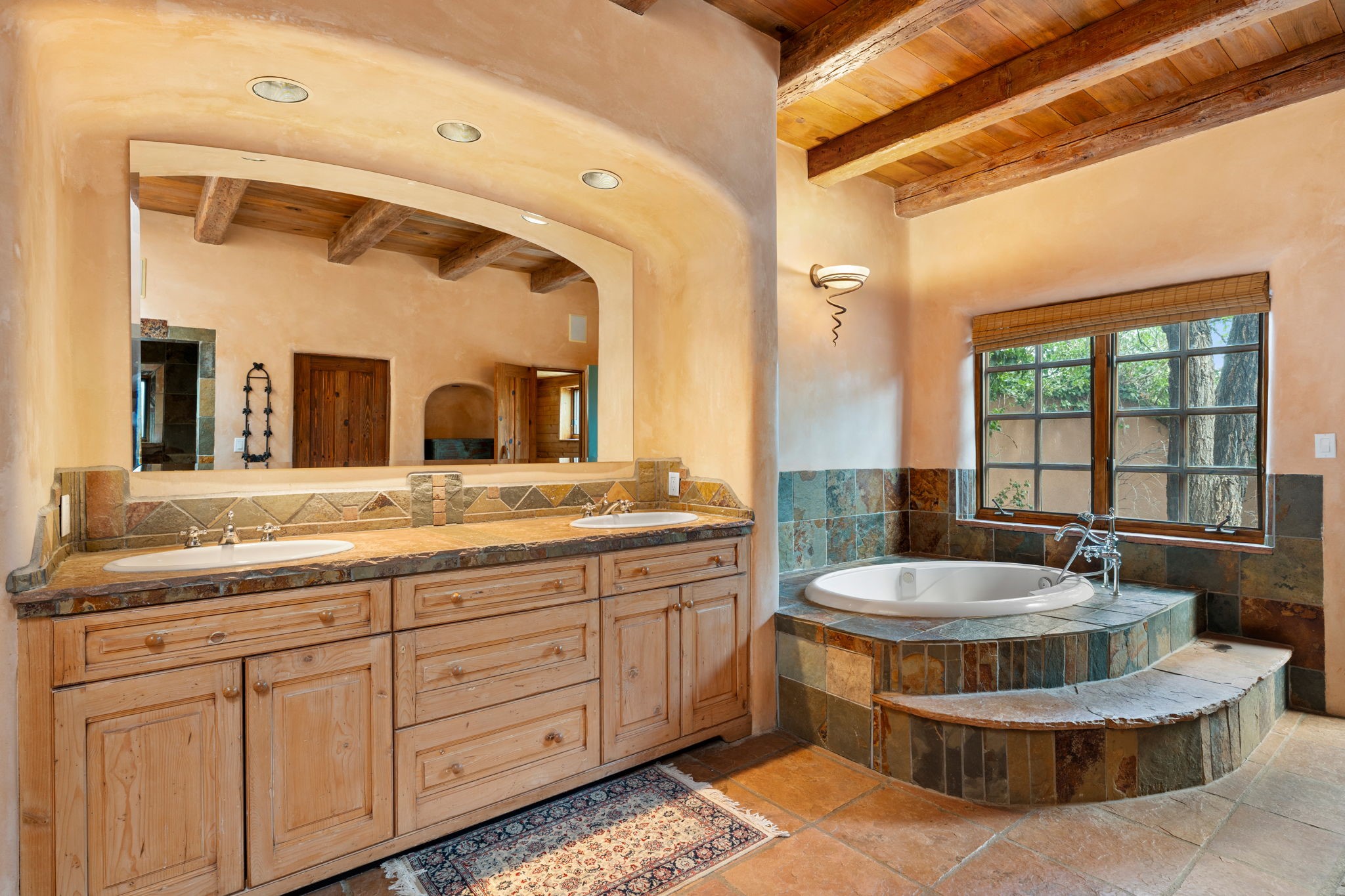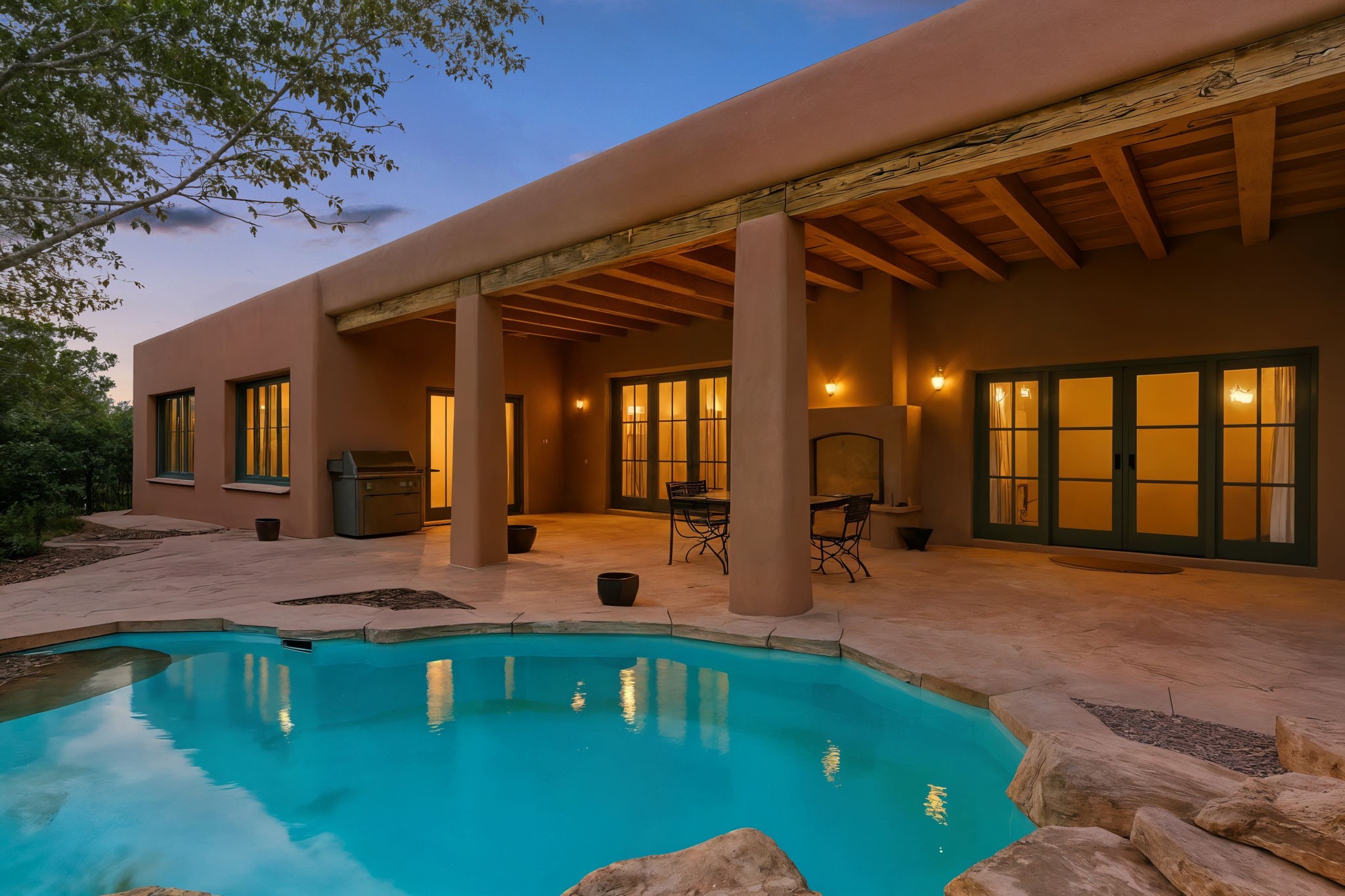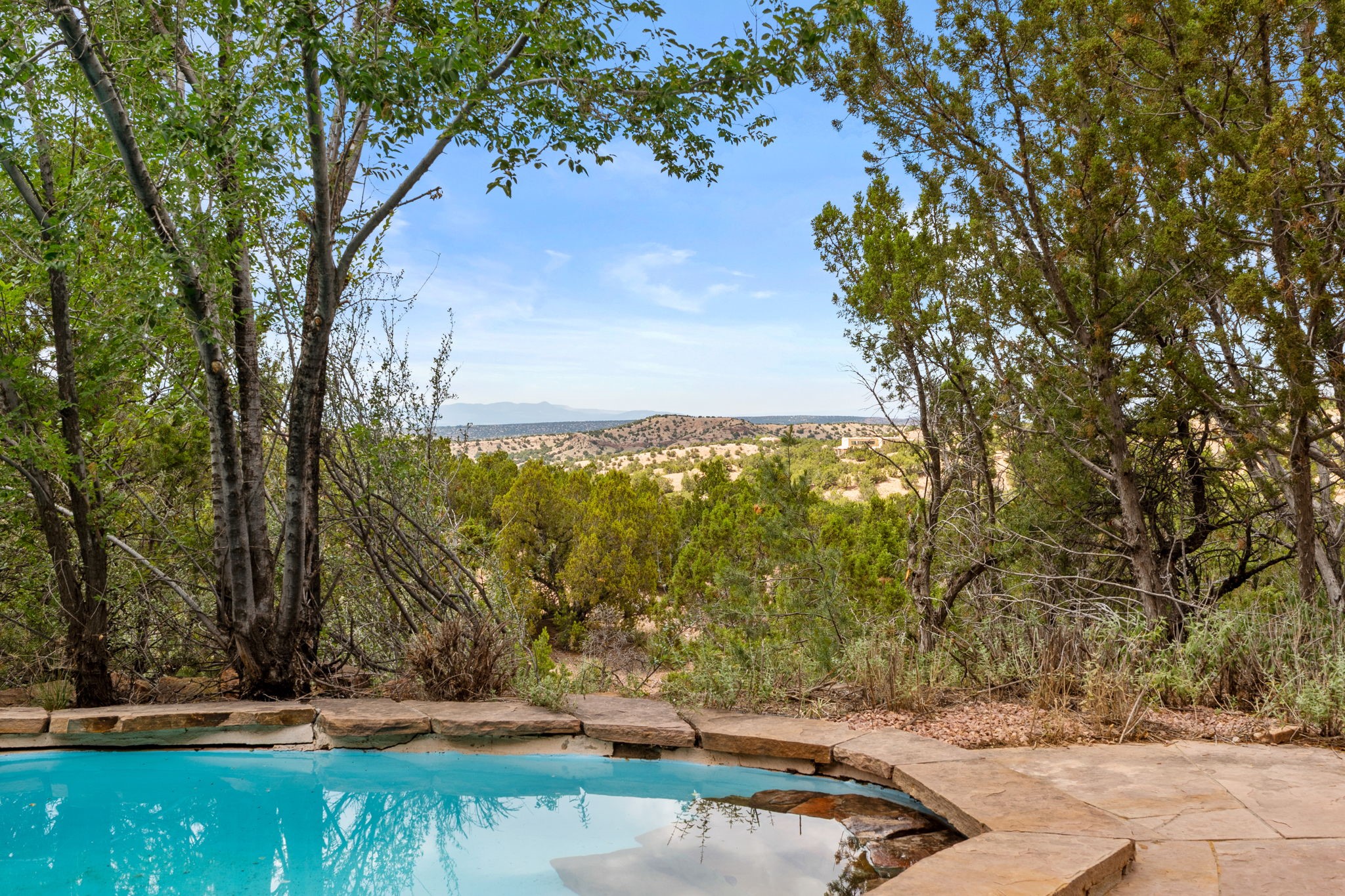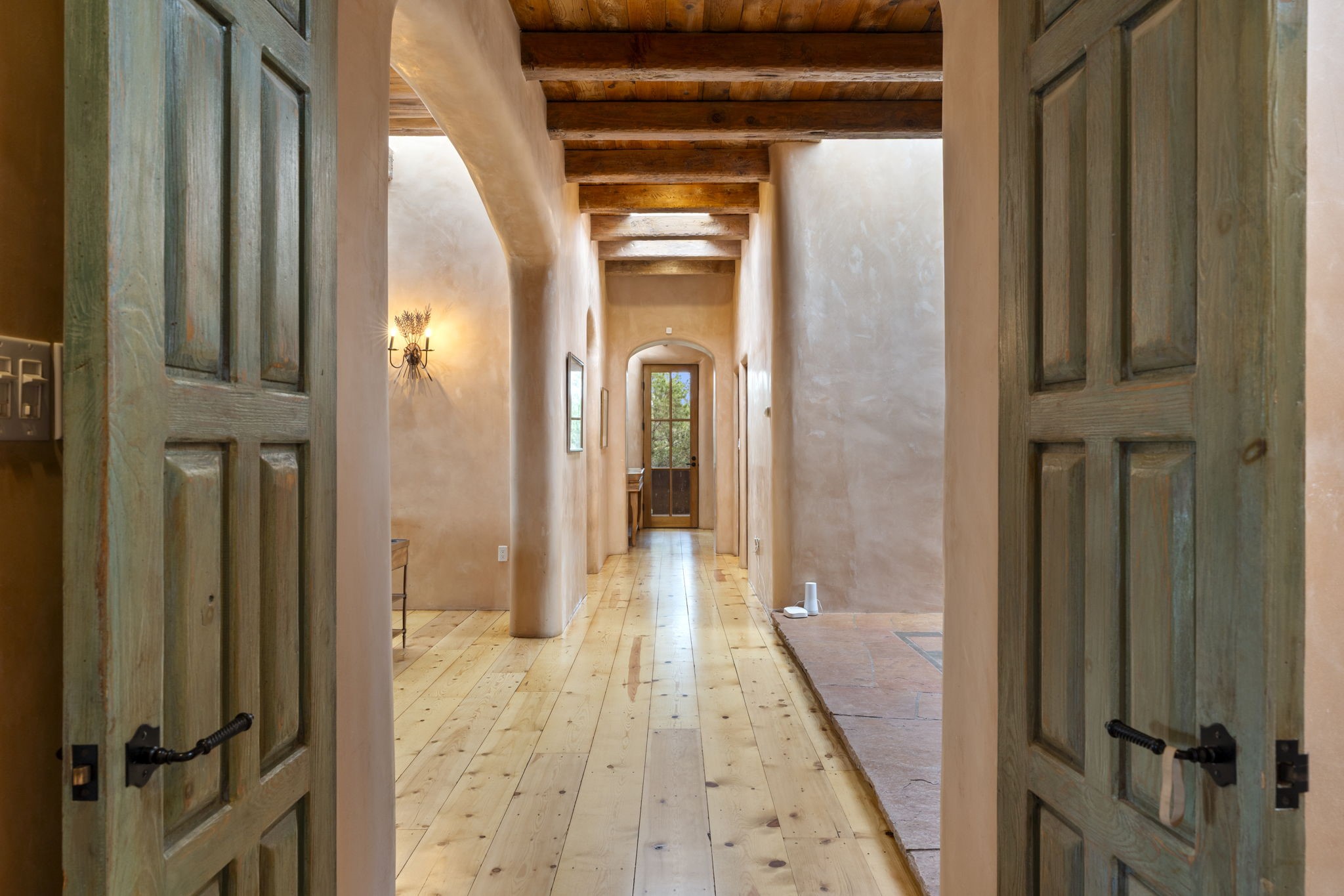 What kind of story are you ready for?? Santa Fe style meets European Country Estate! This 4 bedroom, 4 bathroom, high-quality Rastra construction features soaring ceilings, hand carved vigas, and far-reaching mountain views. Walking into the grand entrance, you are greeted by voluminous curved walls, golden-soft natural light, wide-plank pine floors, and a stately fireplace, which set the stage for an elegant Santa Fe lifestyle. The open concept French country kitchen faces a spacious den with views framed by large picture windows, and features an oversized island topped with granite. There is plenty of counter space for cooking and for entertaining guests. High-end appliances include a large Sub-Zero refrigerator, a six-burner Viking range, and a Bosch dishwasher. Additionally, this home's temperature-controlled wine cave accommodates 1500-2000 bottles for the serious aficionado. Relax in front of one of five fireplaces, and enjoy a large, formal dining room with views that will sweep guests off their feet! Or, linger over a morning cup of coffee on the grand portal overlooking the koi pond and the Jemez mountains. The lavish primary suite is on the main level and will have you living in luxury with a large deep, soaking tub, a private cedar-lined sauna, and a steam shower. There are several rooms downstairs (including a bathroom) which could be used as a mother-in-law suite, offices, or an artist studio. Complete with a TPO roof, an oversized two-car garage, and beautiful landscaping on drip irrigation, this is a timeless space you'll never want to leave. Rastra construction and owned solar panels create an extremely energy efficient environment, with almost non-existent electric bills. New stucco was done in 2025. Enjoy proximity to the club at Las Campanas, but without the high HOA fees. Don't miss this chance to live your dream Santa Fe lifestyle!
