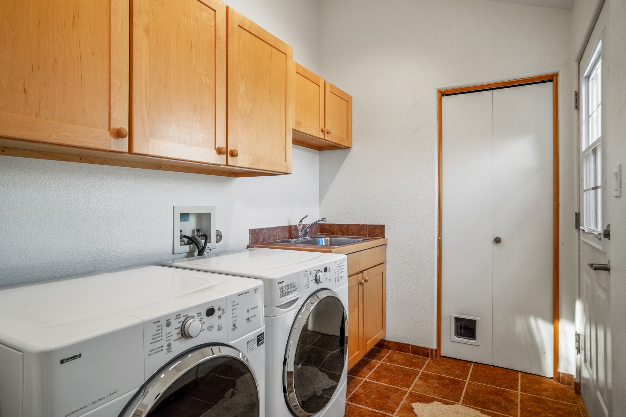 Discover a true work of art, designed and built by the artist who cherished it for 18 years. This private sanctuary sits on 10 acres of serene high-desert landscape just south of Santa Fe. Located off the scenic Turquoise Trail (Hwy 14), the gated property offers commanding views from its high point, showcasing the majestic Sangre de Cristo, Jemez, and Sandia Mountains, as well as Cerro Pelon, the Ortiz Mountains, and the Cerrillos Hills.This move-in ready home masterfully blends a light-filled, soft contemporary feel with the soul of an authentic New Mexican ranch home. The clean, sophisticated design features a pitched metal roof, passive solar principles, and beautiful Saltillo tile floors accented with small decorative tiles.The heart of the home is the great room, boasting vaulted ceilings with exposed beams, and an open concept kitchen, dining, and living area with a fireplace. The kitchen is appointed with stainless appliances and a large island topped with hand-poured concrete countertops.Retreat to the luxurious owner's suite, complete with its own kiva fireplace. The spa-like bathroom is a masterpiece of natural light, featuring stunning floor stones from Brazil, a deep footed tub, a walk-in shower, and hand-poured concrete counters. This private oasis also provides access to a walled patio and an outdoor shower.The second floor reveals a versatile studio, an ideal workspace with durable rubber flooring and a viewing deck that captures spectacular western sunsets over the Jemez and Ortiz Mountains. With views from almost every window and a rainwater catchment system, this 2-bedroom, 2-full-bathroom home is a sophisticated perch offering unmatched solitude and privacy.
