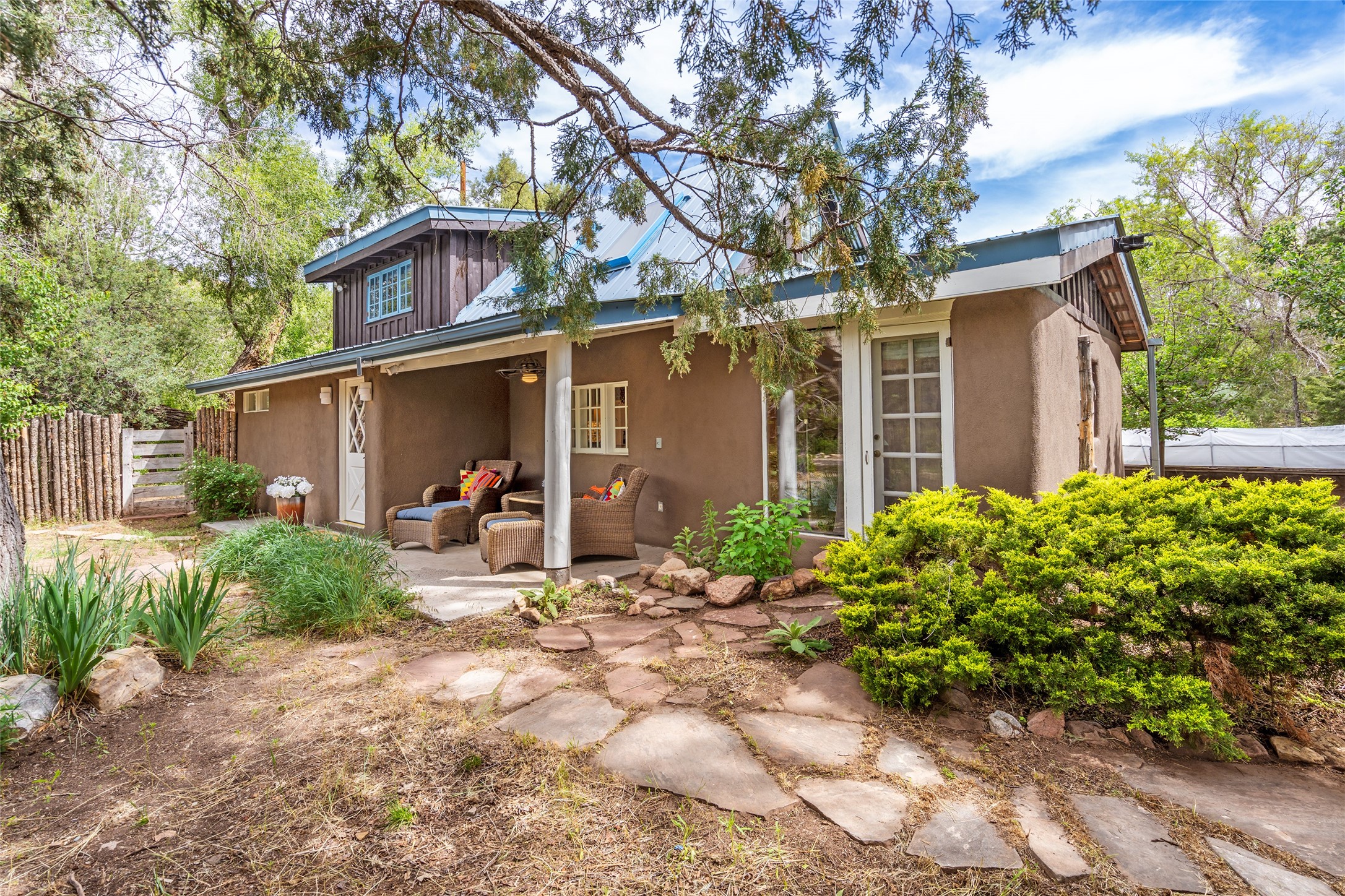 Nature-lover's paradise on 6 Acres- Tucked beneath red rock hills--Cross the bridge from Sibley Road and enter your private sanctuary nestled on six acres of lush, mature land in the serene community of Caoncito. This one-of-a-kind property features a thoughtfully updated three-bedroom, two-bathroom adobe and frame main house that blends timeless charm with modern luxury. Highlights include fully renovated luxury bathrooms and a gourmet kitchen with artisan tile, locally crafted ironwork throughout, and new sustainable wood floors. The home showcases diamond finish plaster and low-VOC finishes, ensuring both beauty and environmental consciousness. The hand-built guest house, perfect for visitors, rental income, or a creative studio, includes a cozy bedroom, bath, kitchenette, and a loft. Attached is a greenhouse for year-round gardening. Outdoors, you'll find a detached carport/shop featuring stonework sourced from the nearby Glorieta Mesa, which doubles as an open-air workspace or additional storage. A traditional underground kiva structure provides a private ceremonial space.The grounds are a horticultural haven with old-growth cottonwoods, pions, and raised garden beds. A private well adds to the property's potential for self-sufficient living. Whether you're a homesteader, gardener, artist, or seeking a peaceful retreat, this property offers the perfect setting.Set in a classic rural NM neighborhood, the house sits on three acres fenced in with coyote fencing, providing safety and privacy. An additional three acres remain wild, with a neighborhood path leading you to public hiking trails and sunset views. Located just 25 minutes from downtown Santa Fe, this tranquil retreat offers the best of both worlds: a private haven with access to the vibrant city. With its artisanal remodel and high desert landscape, this property is an extraordinary opportunity for those seeking comfort, luxury, and self-sufficient living.