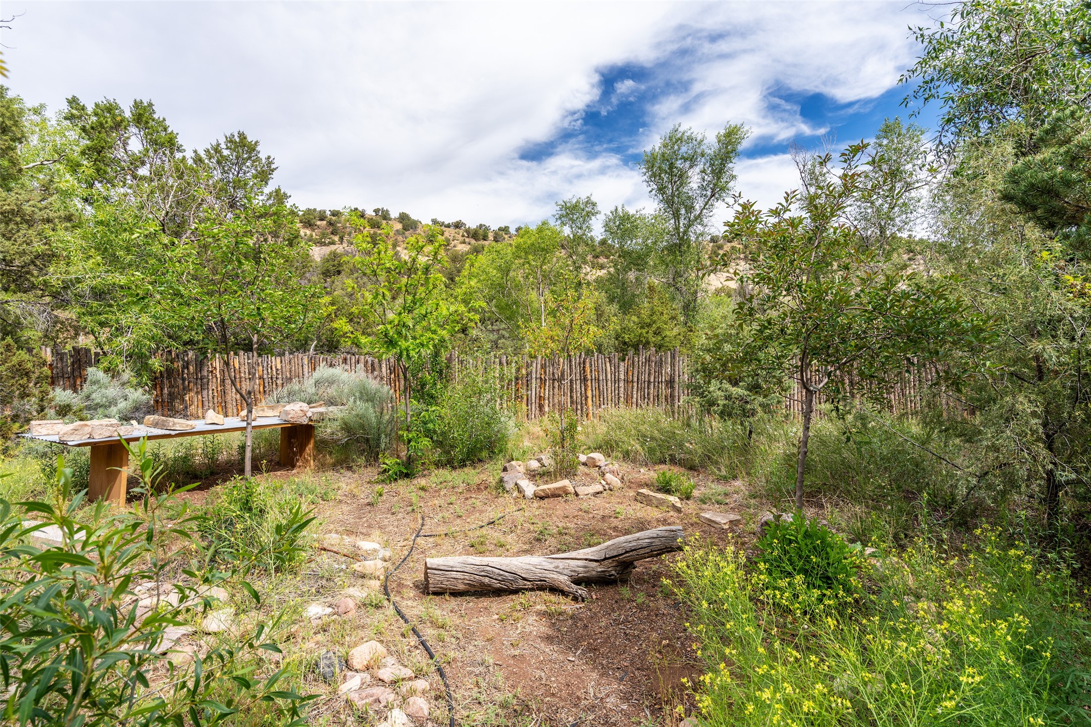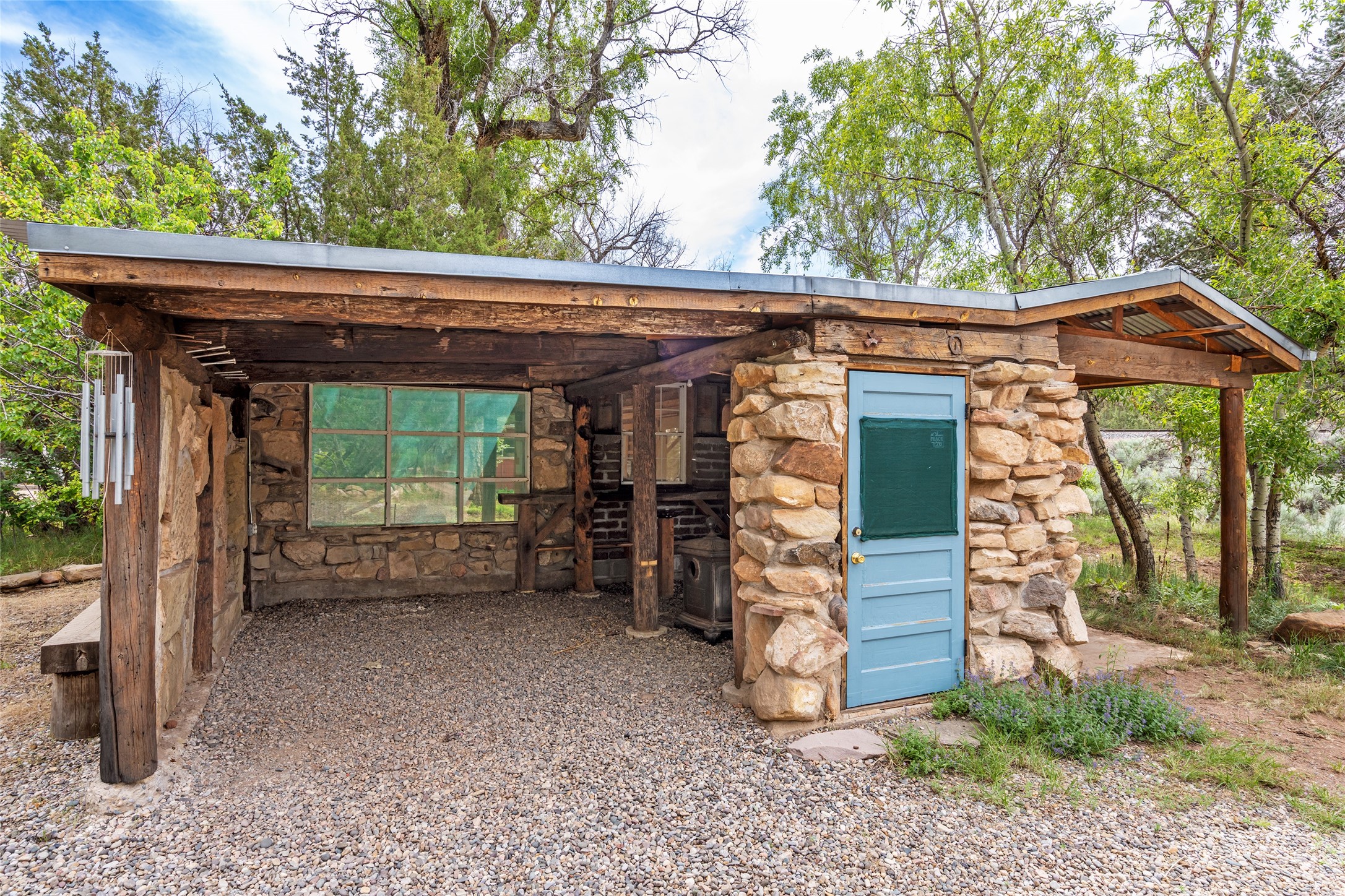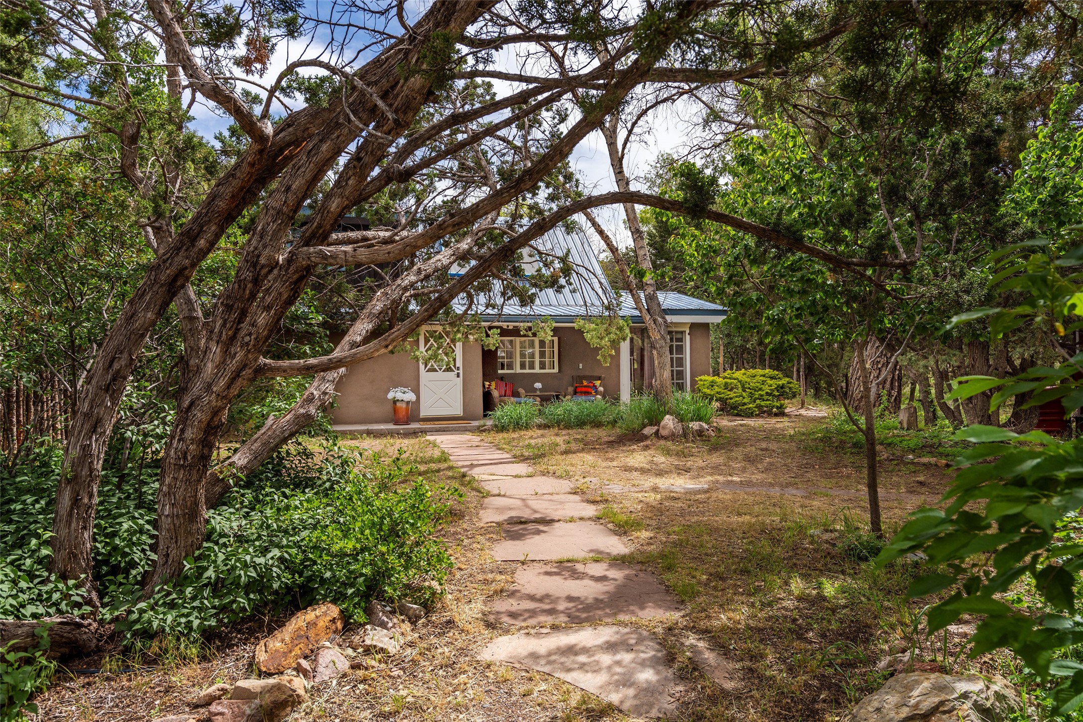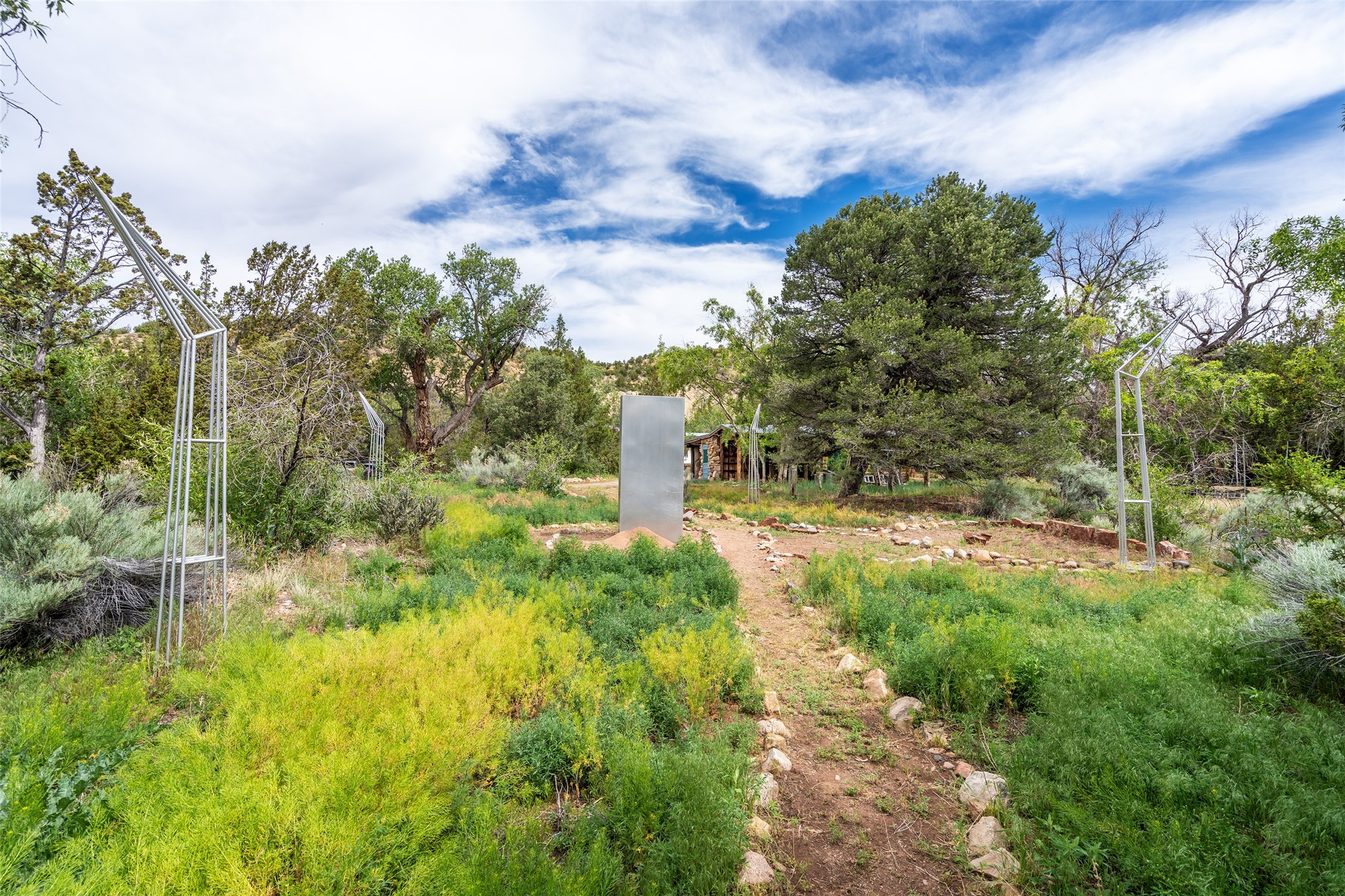 Nature-lover's paradise on 6 Acres- Tucked beneath red rock hills--Cross the bridge from Sibley Road and enter your private sanctuary nestled on six acres of lush, mature land in the serene community of Caoncito. This one-of-a-kind property features a thoughtfully updated three-bedroom, two-bathroom adobe and frame main house that blends timeless charm with modern luxury. Highlights include fully renovated luxury bathrooms and a gourmet kitchen with artisan tile, locally crafted ironwork throughout, and new sustainable wood floors. The home showcases diamond finish plaster and low-VOC finishes, ensuring both beauty and environmental consciousness. The hand-built guest house, perfect for visitors, rental income, or a creative studio, includes a cozy bedroom, bath, kitchenette, and a loft. Attached is a greenhouse for year-round gardening. Outdoors, you'll find a detached carport/shop featuring stonework sourced from the nearby Glorieta Mesa, which doubles as an open-air workspace or additional storage. A traditional underground kiva structure provides a private ceremonial space.The grounds are a horticultural haven with old-growth cottonwoods, pions, and raised garden beds. A private well adds to the property's potential for self-sufficient living. Whether you're a homesteader, gardener, artist, or seeking a peaceful retreat, this property offers the perfect setting.Set in a classic rural NM neighborhood, the house sits on three acres fenced in with coyote fencing, providing safety and privacy. An additional three acres remain wild, with a neighborhood path leading you to public hiking trails and sunset views. Located just 25 minutes from downtown Santa Fe, this tranquil retreat offers the best of both worlds: a private haven with access to the vibrant city. With its artisanal remodel and high desert landscape, this property is an extraordinary opportunity for those seeking comfort, luxury, and self-sufficient living.