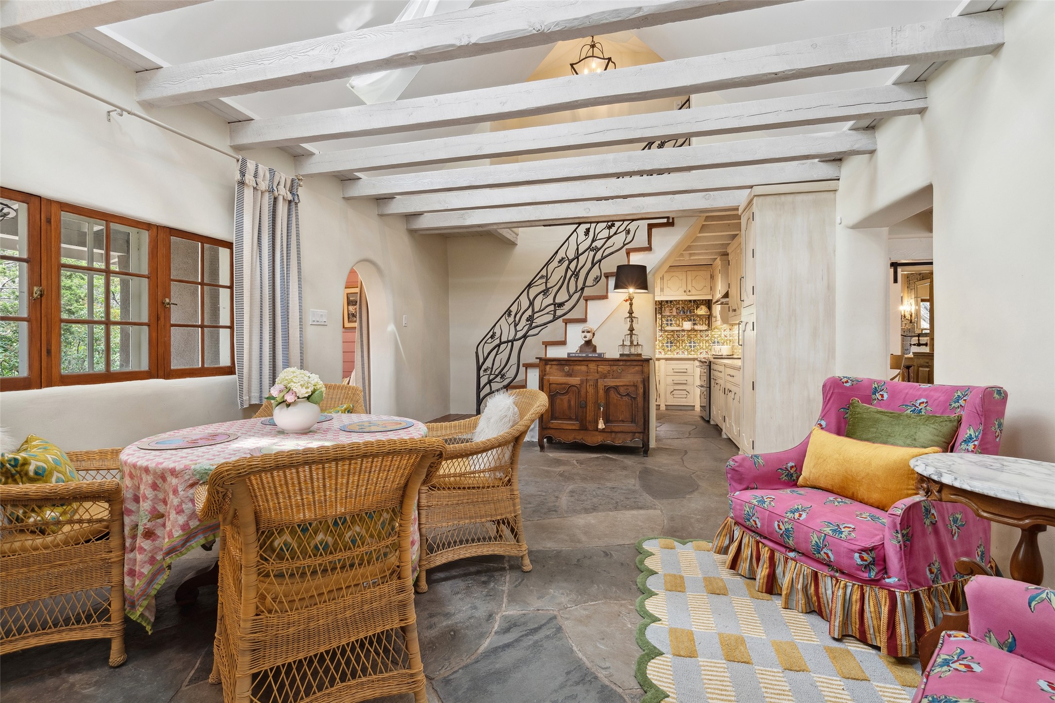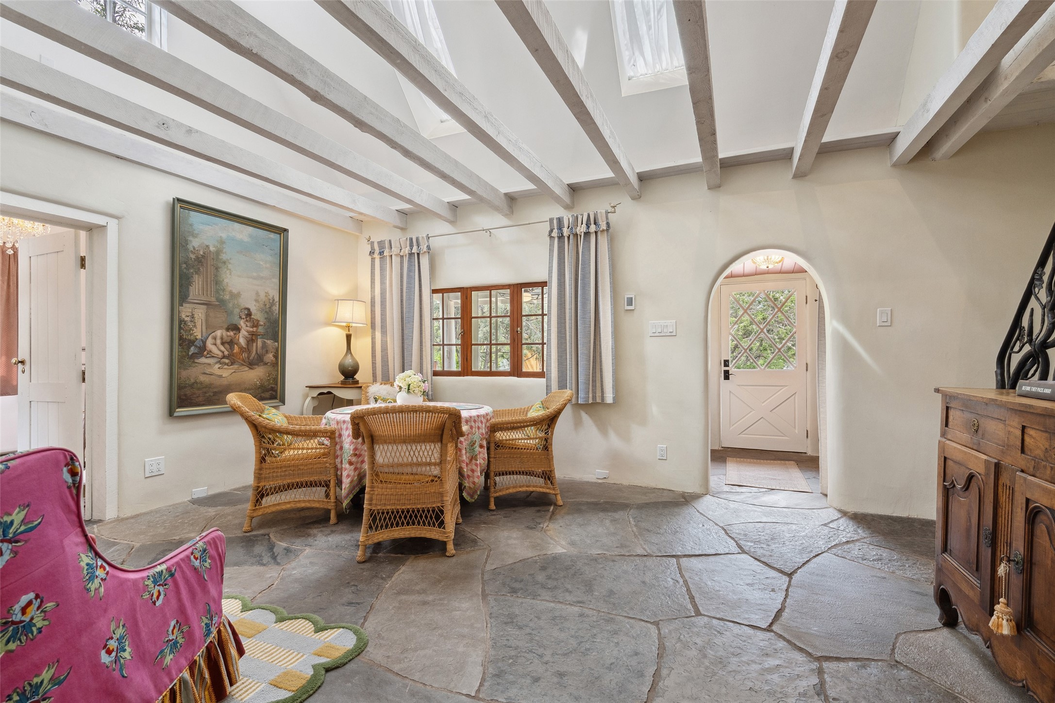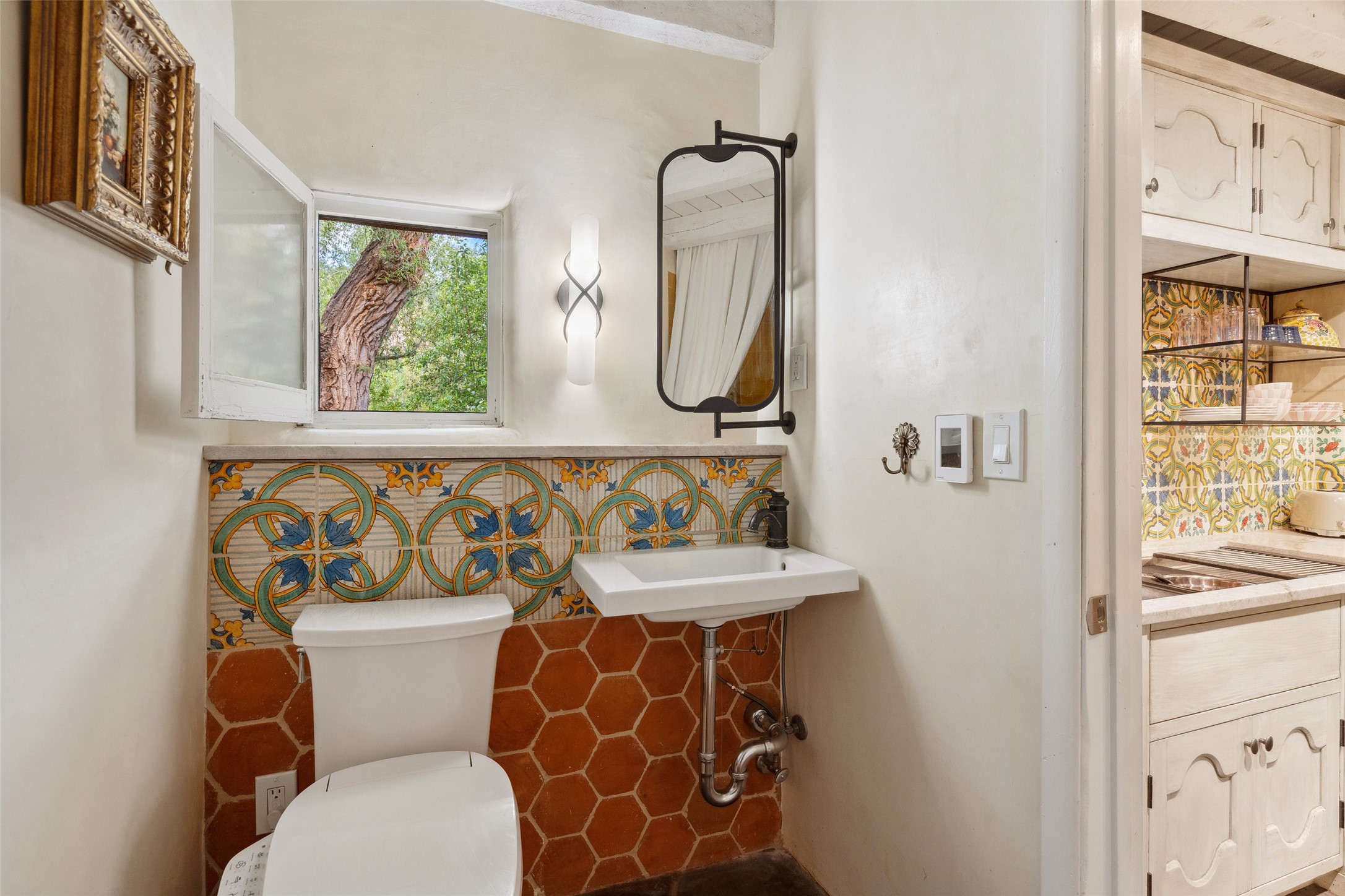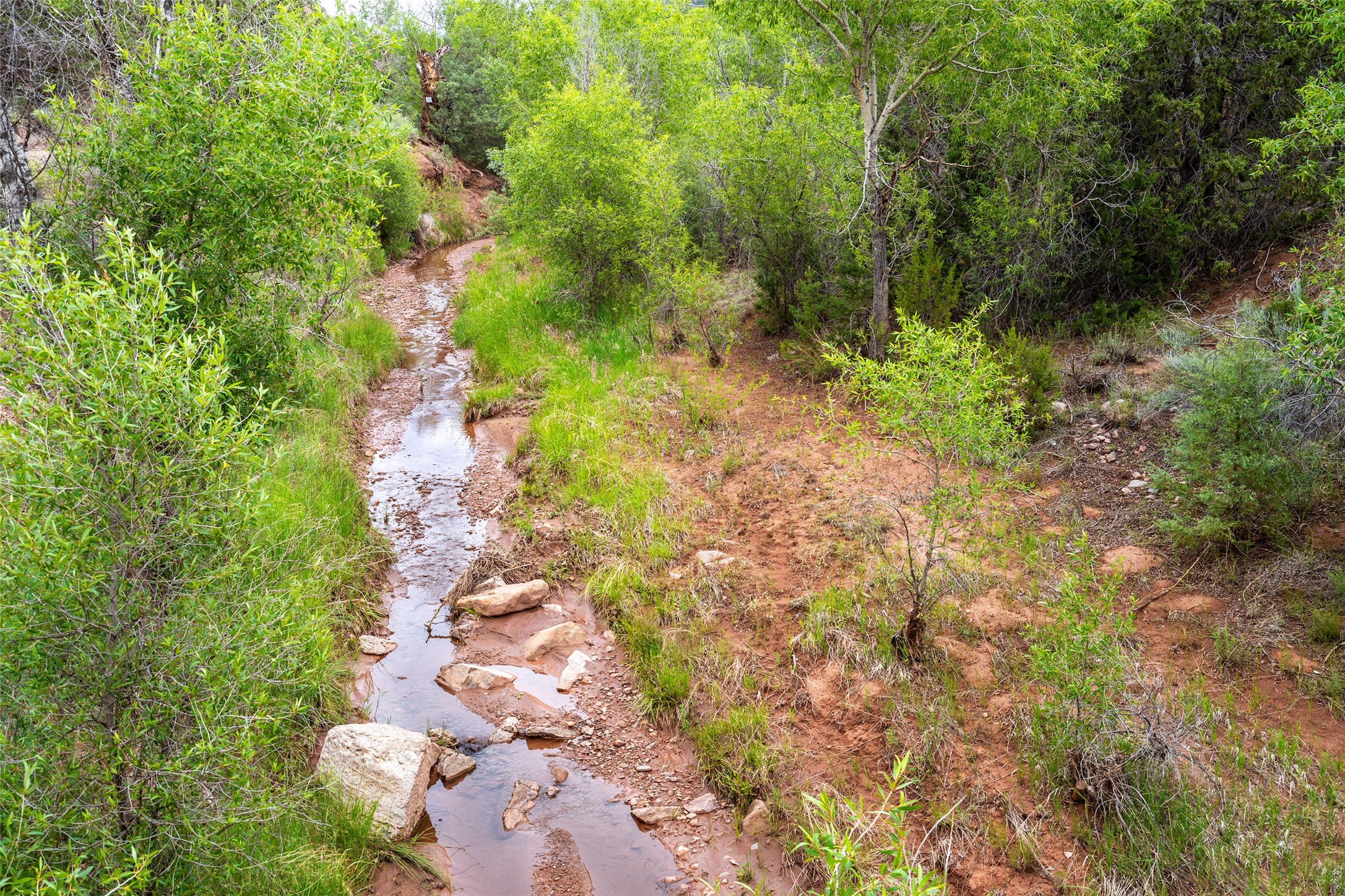 Nature-lover's paradise on 6 Acres- Tucked beneath red rock hills--Cross the bridge from Sibley Road and enter your private sanctuary nestled on six acres of lush, mature land in the serene community of Caoncito. This one-of-a-kind property features a thoughtfully updated three-bedroom, two-bathroom adobe and frame main house that blends timeless charm with modern luxury. Highlights include fully renovated luxury bathrooms and a gourmet kitchen with artisan tile, locally crafted ironwork throughout, and new sustainable wood floors. The home showcases diamond finish plaster and low-VOC finishes, ensuring both beauty and environmental consciousness. The hand-built guest house, perfect for visitors, rental income, or a creative studio, includes a cozy bedroom, bath, kitchenette, and a loft. Attached is a greenhouse for year-round gardening. Outdoors, you'll find a detached carport/shop featuring stonework sourced from the nearby Glorieta Mesa, which doubles as an open-air workspace or additional storage. A traditional underground kiva structure provides a private ceremonial space.The grounds are a horticultural haven with old-growth cottonwoods, pions, and raised garden beds. A private well adds to the property's potential for self-sufficient living. Whether you're a homesteader, gardener, artist, or seeking a peaceful retreat, this property offers the perfect setting.Set in a classic rural NM neighborhood, the house sits on three acres fenced in with coyote fencing, providing safety and privacy. An additional three acres remain wild, with a neighborhood path leading you to public hiking trails and sunset views. Located just 25 minutes from downtown Santa Fe, this tranquil retreat offers the best of both worlds: a private haven with access to the vibrant city. With its artisanal remodel and high desert landscape, this property is an extraordinary opportunity for those seeking comfort, luxury, and self-sufficient living.