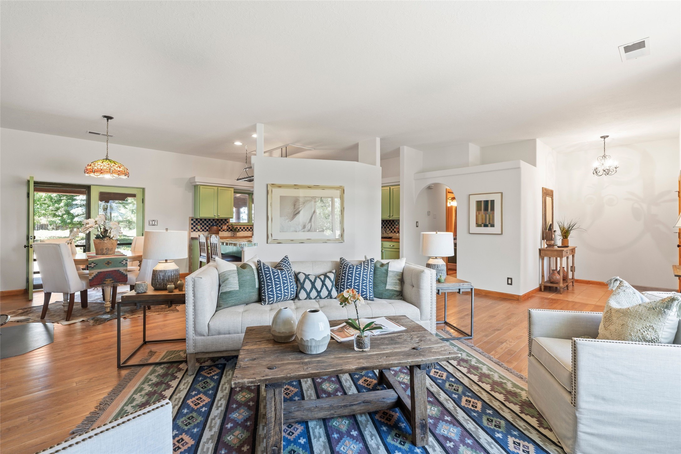 Here's the beautiful setting and property you've been looking for in Taos! An acre with great views and lots of big trees affords wonderful outdoor living, and there's a fabulous huge portal wrapping around the home. The residence is full of charm, light and bright with a very comfortable open floor plan, and the colorfully updated kitchen and bathrooms are quite appealing. The portal offers plenty of space for seating and dining, and it includes your own home spa with a new hot tub and large Finnleo sauna. The bonus is an outbuilding with a big six-car carport, plus two nice workshops, and a small storage/studio area. About three quarters of the lot is enclosed with coyote fencing and an electronically-controlled gate. The property is just a short distance to lots of hiking, biking, or horseback riding trails in the national forest. It's a convenient location close-in, yet with a lovely rural feeling, and the views of Taos Mountain and the Sangre de Cristo foothills are gorgeous!