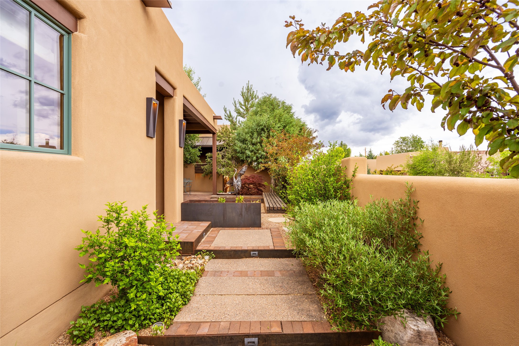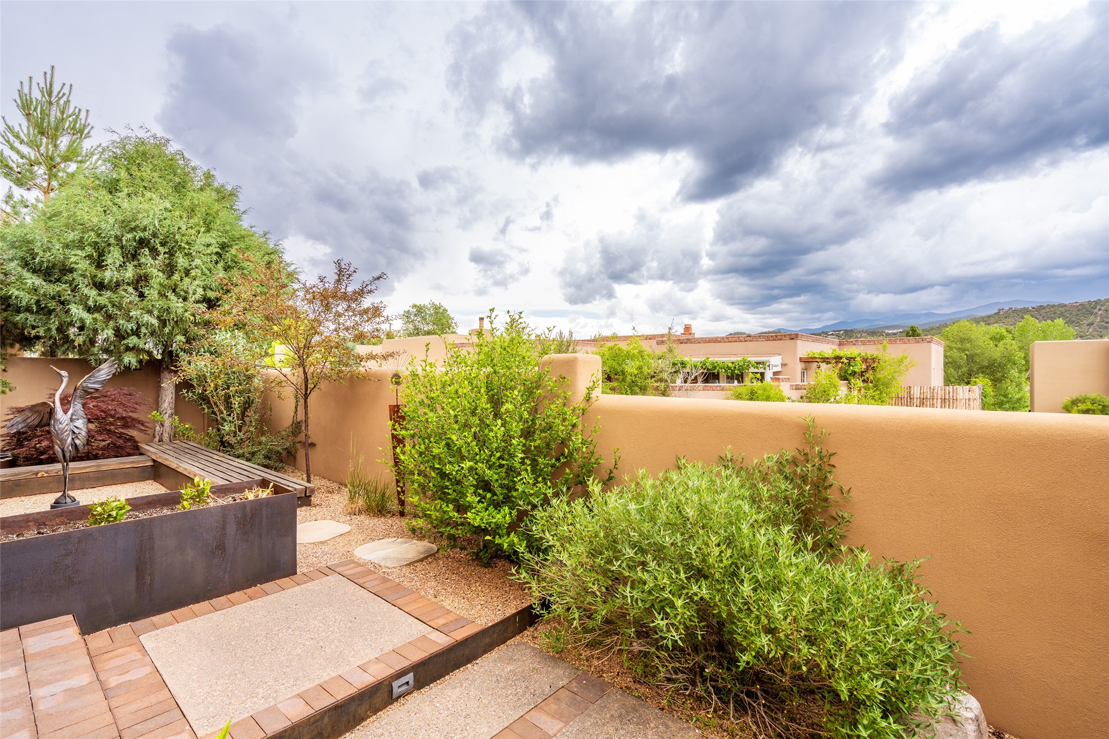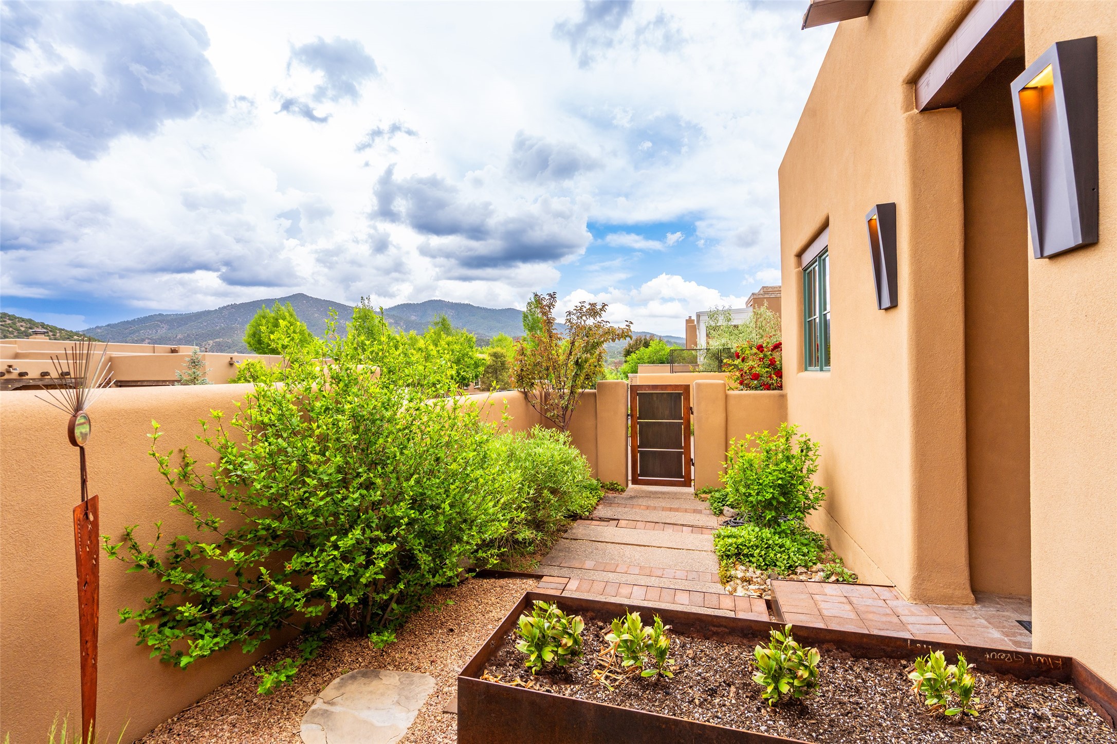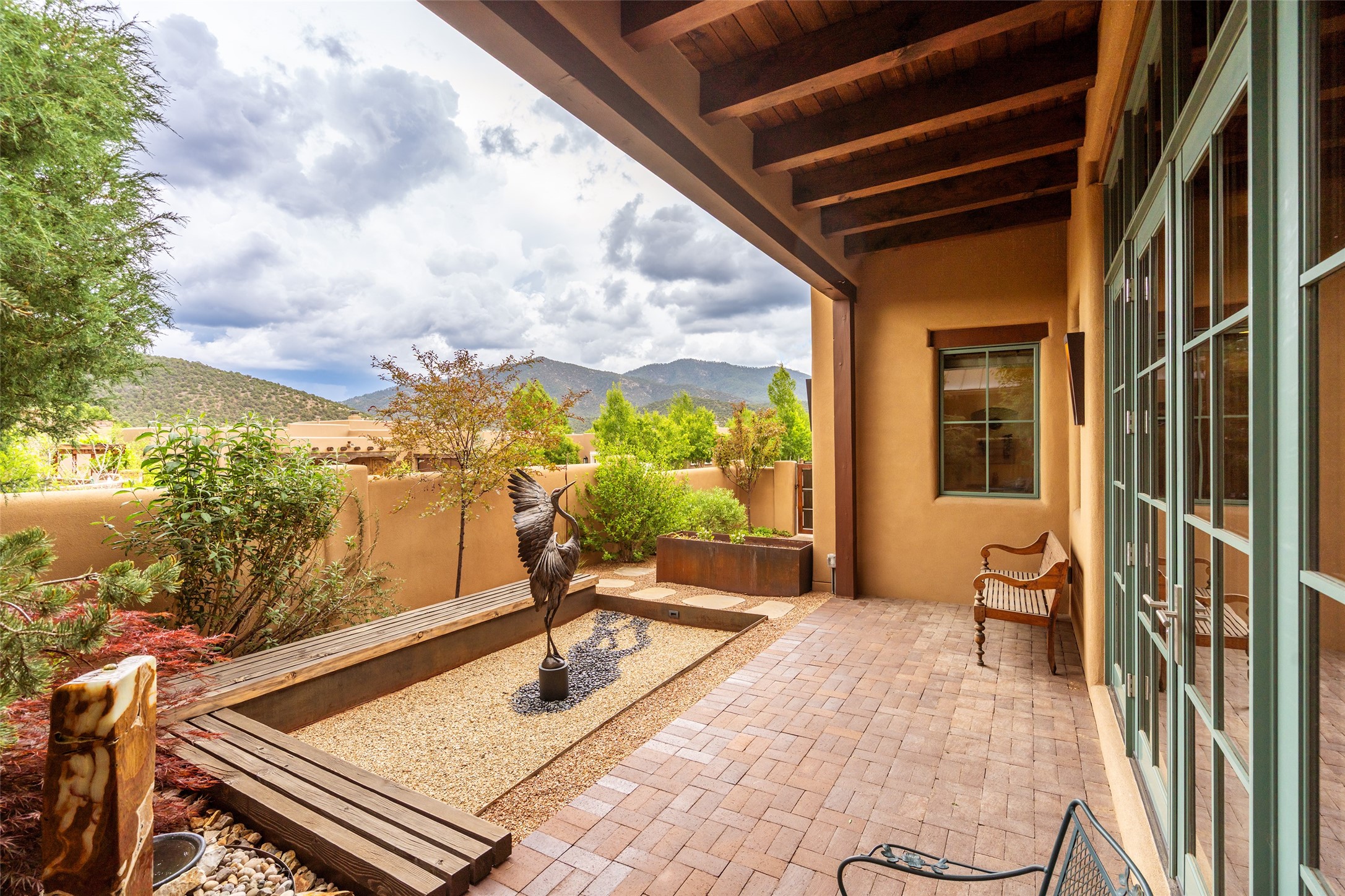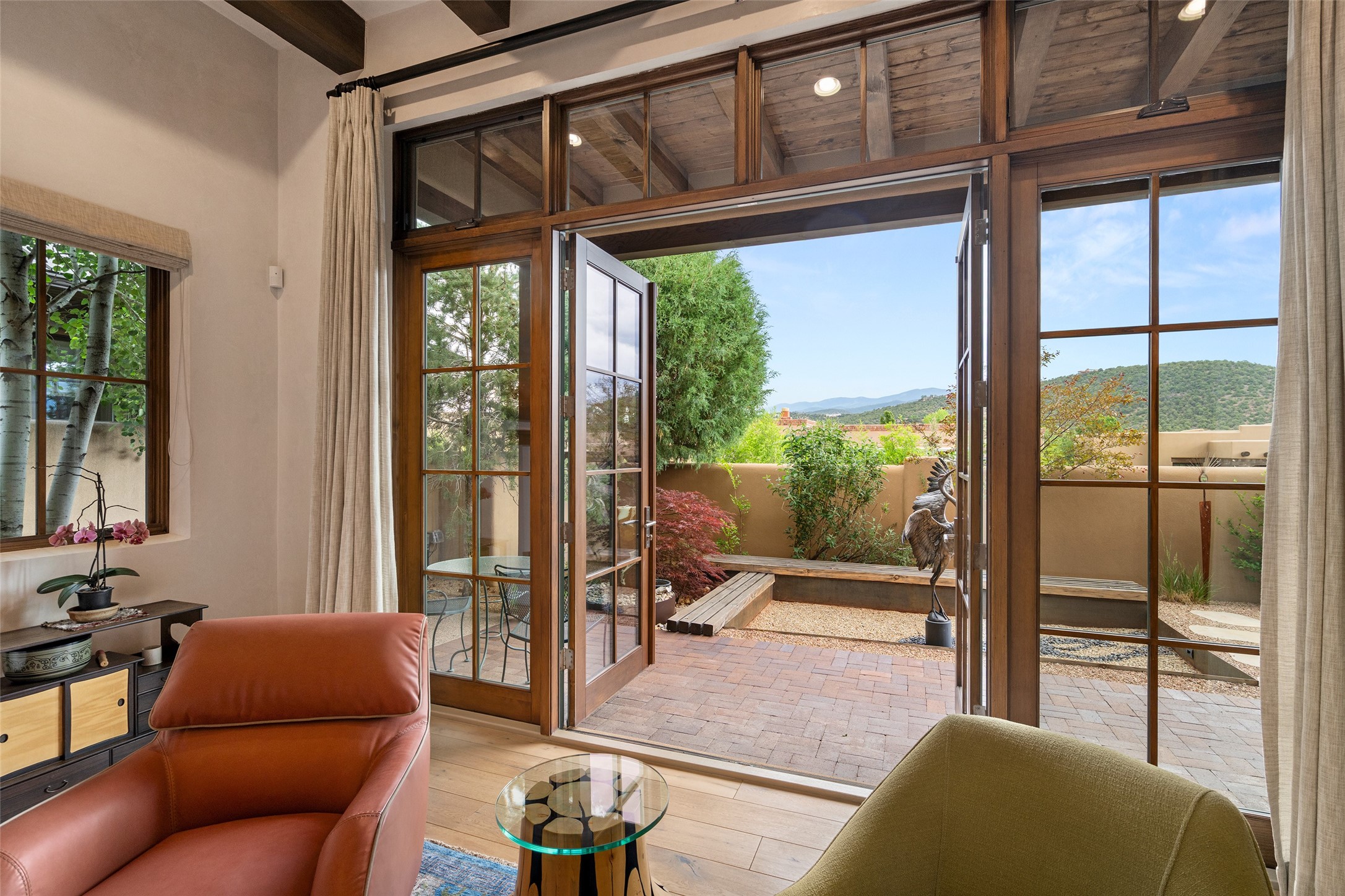 Simply Sublime in the Santa Fe Foothills! Located just moments from both Canyon Road and the historic Santa Fe Plaza, this stunning contemporary residence is the perfect blend of sophisticated elegance and functional livability. Nestled in the picturesque foothills within a charmingly small, gated community, the home offers sweeping views of the Sangre de Cristo Mountains through expansive French doors that flood the interior with natural light. Beautifully designed with a modern sensibility, the open-concept floor plan showcases wide-plank French Oak flooring, smooth hand-troweled plaster walls, and impeccable attention to detail throughout. The chef's kitchen is a true showstopper, featuring Calcutta marble countertops, custom Walnut cabinetry, and premium appliances including a new 36-inch Fisher & Paykel induction range.The spacious primary suite is a serene retreat with direct access to a private rear courtyard surrounded by lush, tranquil landscaping--ideal for morning coffee or evening reflection. The spa-like primary bath includes dual sinks set into bespoke wood countertops, a luxurious soaking tub, and a generous walk-in shower. The ensuite guest bedroom also opens to its own private outdoor seating area, offering a peaceful escape for visitors. Additional features include a new, 2023 TPO roof, whole-house LED lighting, electronic water softener, refrigerated air conditioning, powder room for guests, and an attached two-car garage. Every element of this home has been thoughtfully curated--creating a truly exceptional contemporary sanctuary in one of Santa Fe's most coveted locations.