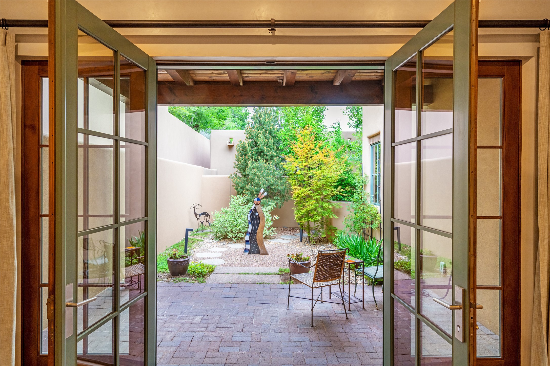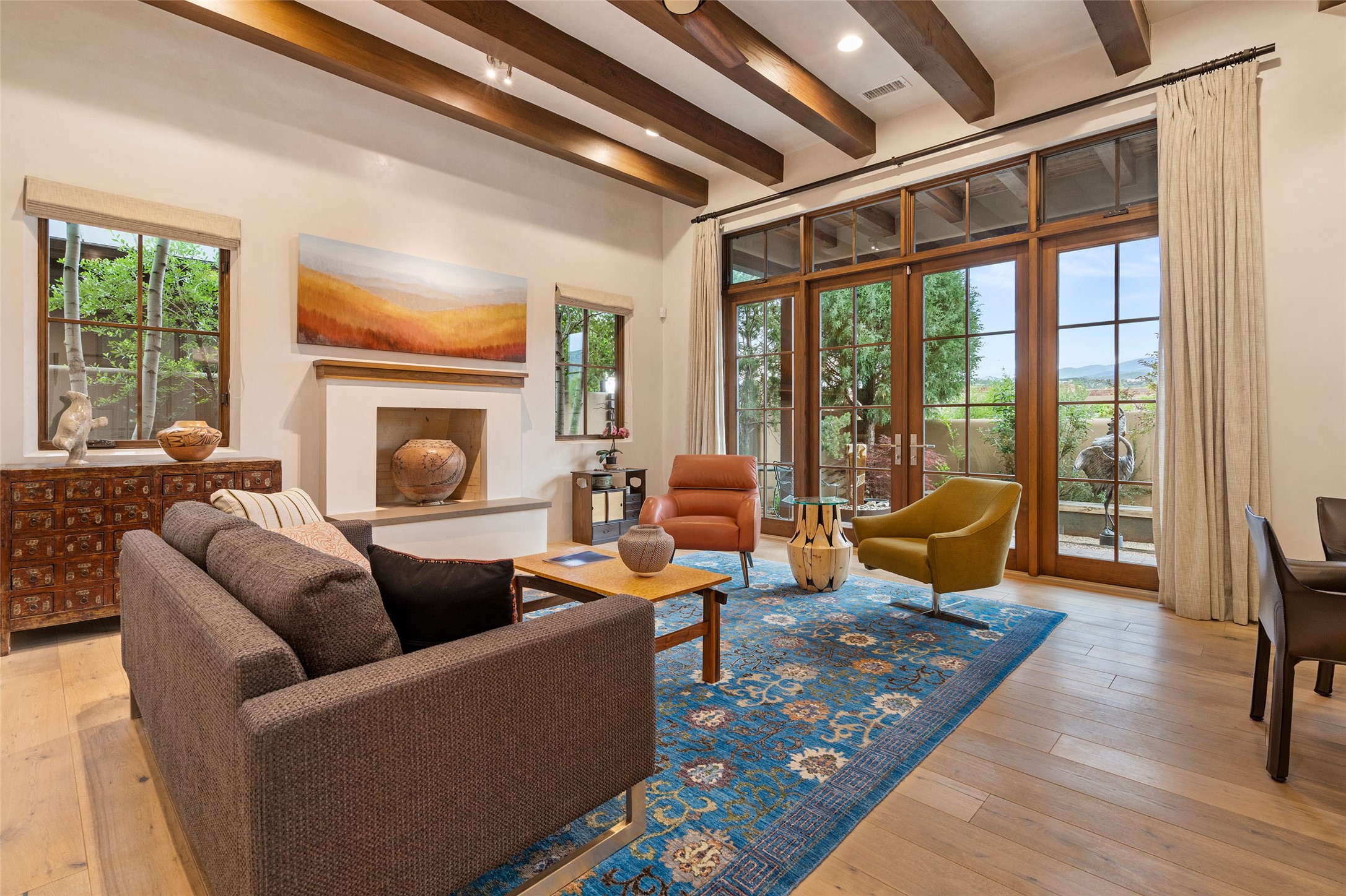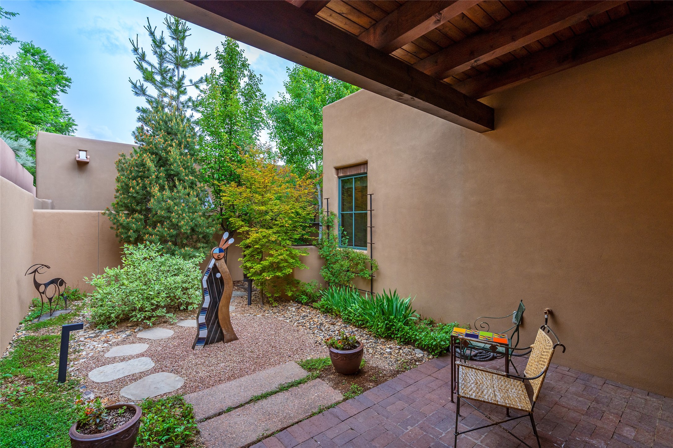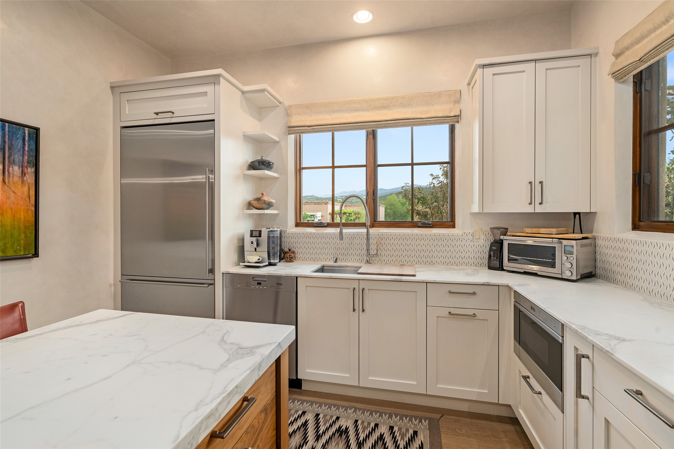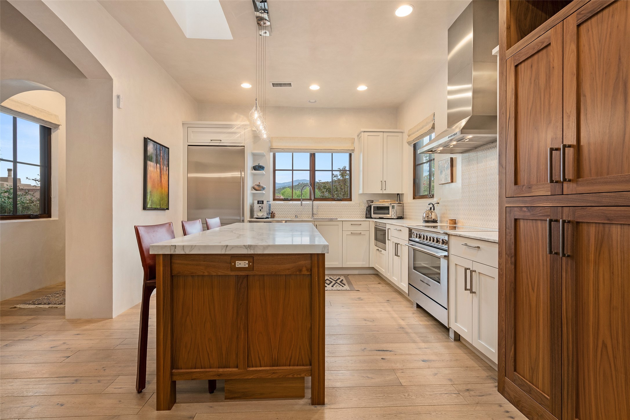 Simply Sublime in the Santa Fe Foothills! Located just moments from both Canyon Road and the historic Santa Fe Plaza, this stunning contemporary residence is the perfect blend of sophisticated elegance and functional livability. Nestled in the picturesque foothills within a charmingly small, gated community, the home offers sweeping views of the Sangre de Cristo Mountains through expansive French doors that flood the interior with natural light. Beautifully designed with a modern sensibility, the open-concept floor plan showcases wide-plank French Oak flooring, smooth hand-troweled plaster walls, and impeccable attention to detail throughout. The chef's kitchen is a true showstopper, featuring Calcutta marble countertops, custom Walnut cabinetry, and premium appliances including a new 36-inch Fisher & Paykel induction range.The spacious primary suite is a serene retreat with direct access to a private rear courtyard surrounded by lush, tranquil landscaping--ideal for morning coffee or evening reflection. The spa-like primary bath includes dual sinks set into bespoke wood countertops, a luxurious soaking tub, and a generous walk-in shower. The ensuite guest bedroom also opens to its own private outdoor seating area, offering a peaceful escape for visitors. Additional features include a new, 2023 TPO roof, whole-house LED lighting, electronic water softener, refrigerated air conditioning, powder room for guests, and an attached two-car garage. Every element of this home has been thoughtfully curated--creating a truly exceptional contemporary sanctuary in one of Santa Fe's most coveted locations.