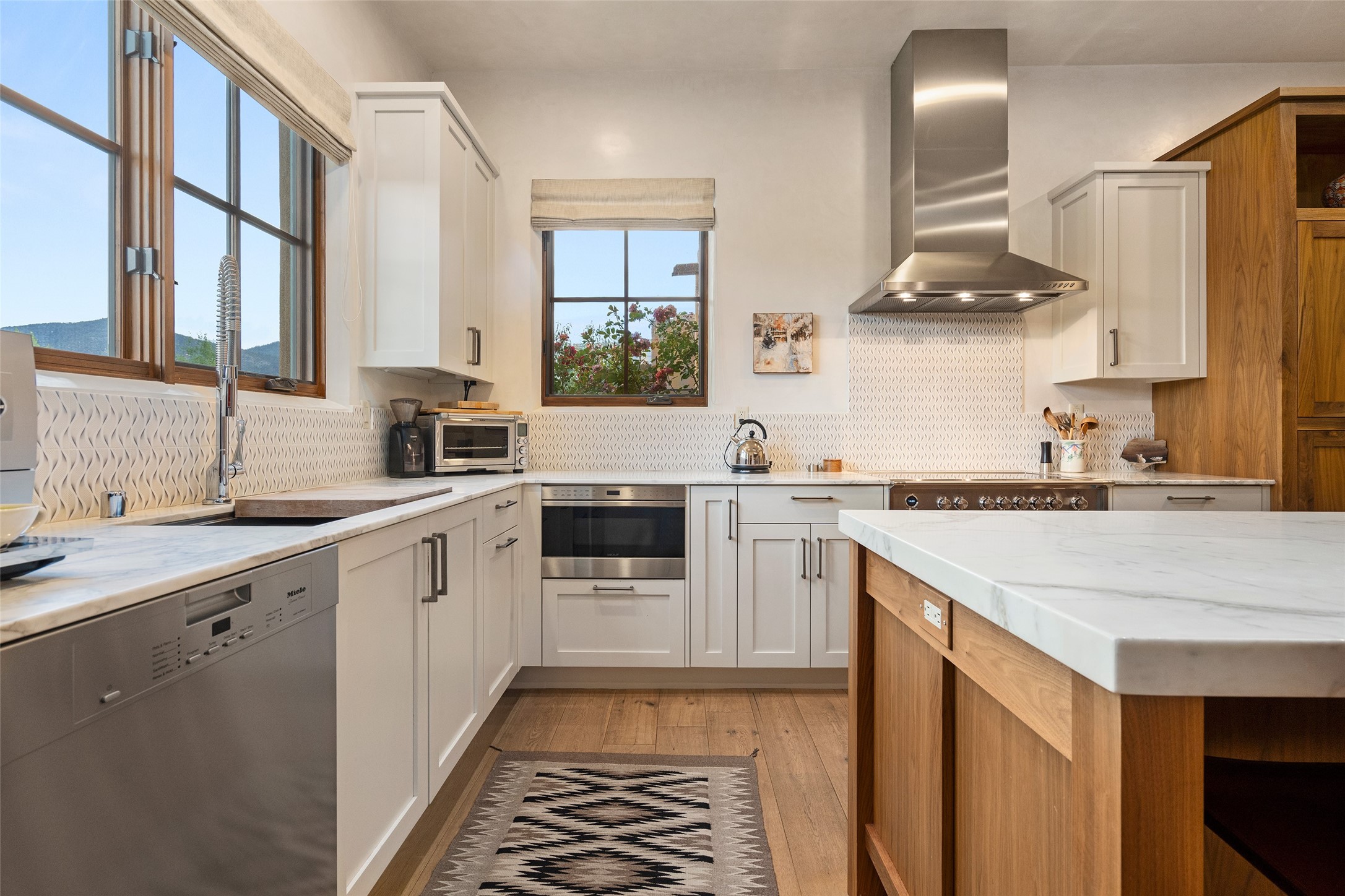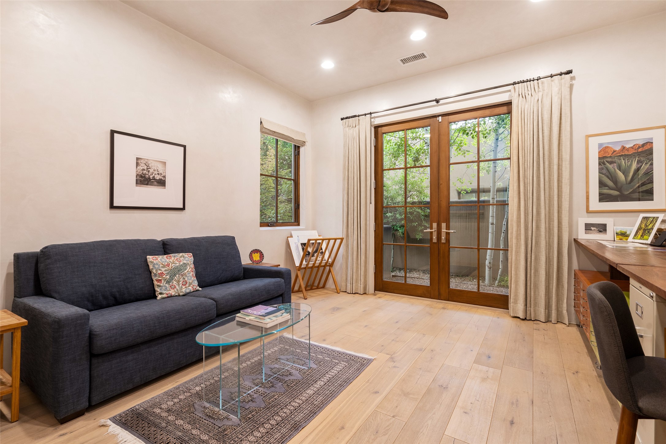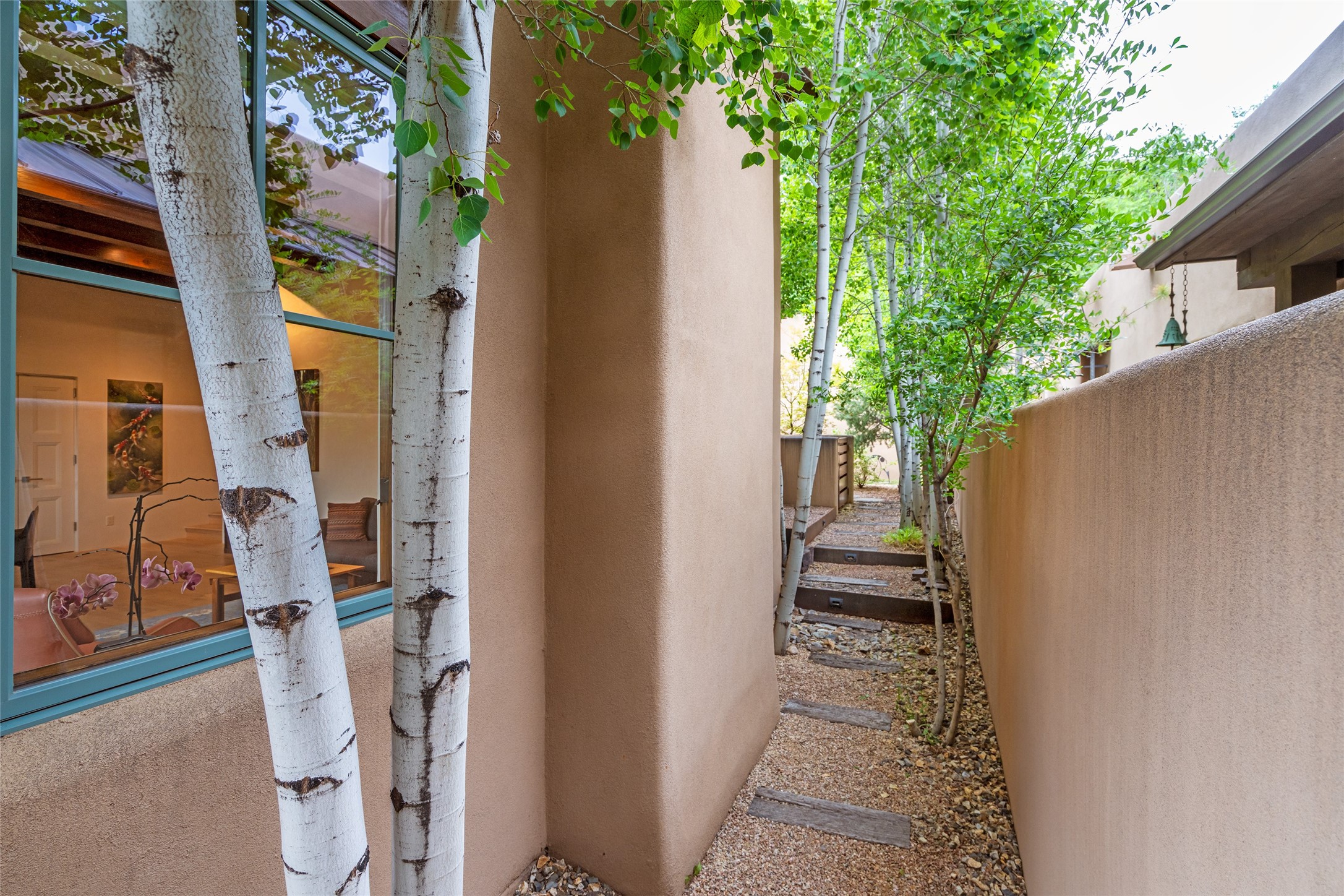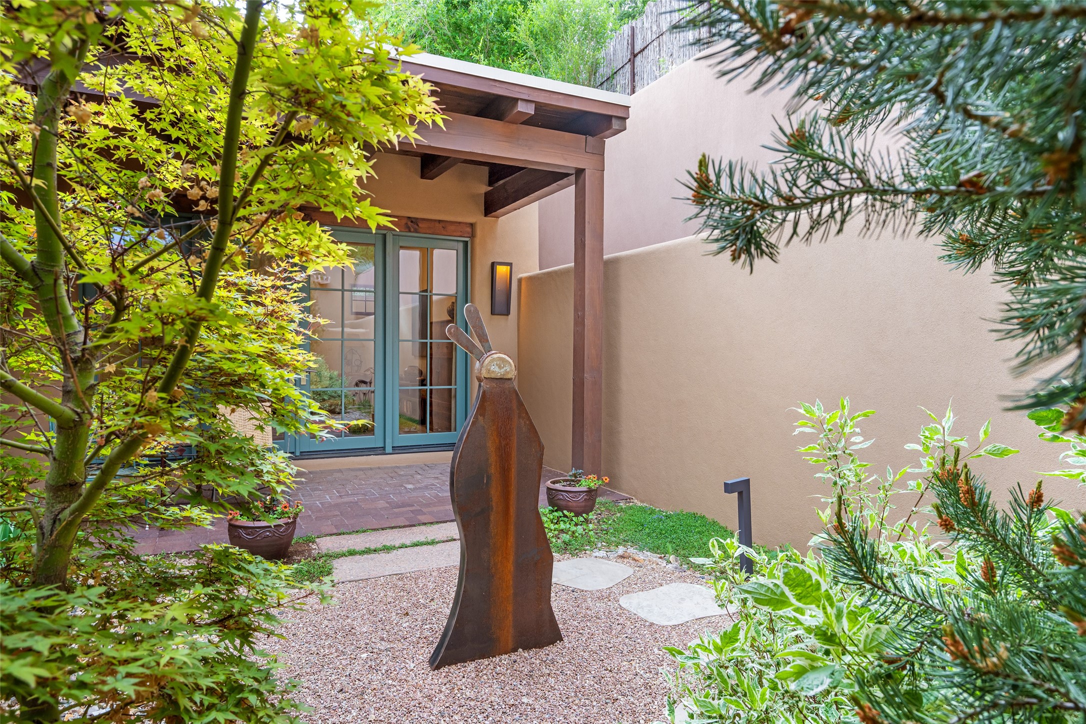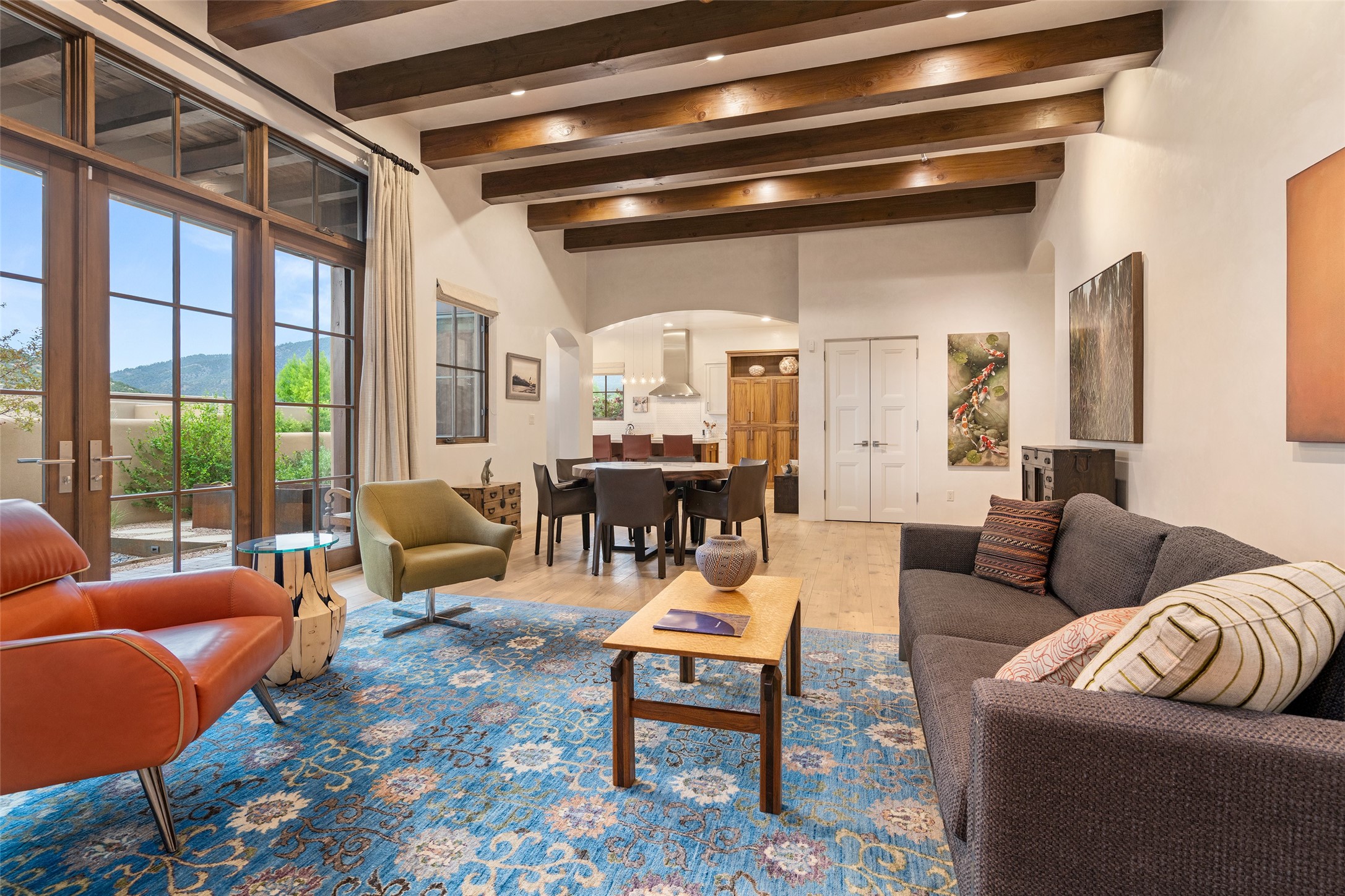 Simply Sublime in the Santa Fe Foothills! Located just moments from both Canyon Road and the historic Santa Fe Plaza, this stunning contemporary residence is the perfect blend of sophisticated elegance and functional livability. Nestled in the picturesque foothills within a charmingly small, gated community, the home offers sweeping views of the Sangre de Cristo Mountains through expansive French doors that flood the interior with natural light. Beautifully designed with a modern sensibility, the open-concept floor plan showcases wide-plank French Oak flooring, smooth hand-troweled plaster walls, and impeccable attention to detail throughout. The chef's kitchen is a true showstopper, featuring Calcutta marble countertops, custom Walnut cabinetry, and premium appliances including a new 36-inch Fisher & Paykel induction range.The spacious primary suite is a serene retreat with direct access to a private rear courtyard surrounded by lush, tranquil landscaping--ideal for morning coffee or evening reflection. The spa-like primary bath includes dual sinks set into bespoke wood countertops, a luxurious soaking tub, and a generous walk-in shower. The ensuite guest bedroom also opens to its own private outdoor seating area, offering a peaceful escape for visitors. Additional features include a new, 2023 TPO roof, whole-house LED lighting, electronic water softener, refrigerated air conditioning, powder room for guests, and an attached two-car garage. Every element of this home has been thoughtfully curated--creating a truly exceptional contemporary sanctuary in one of Santa Fe's most coveted locations.