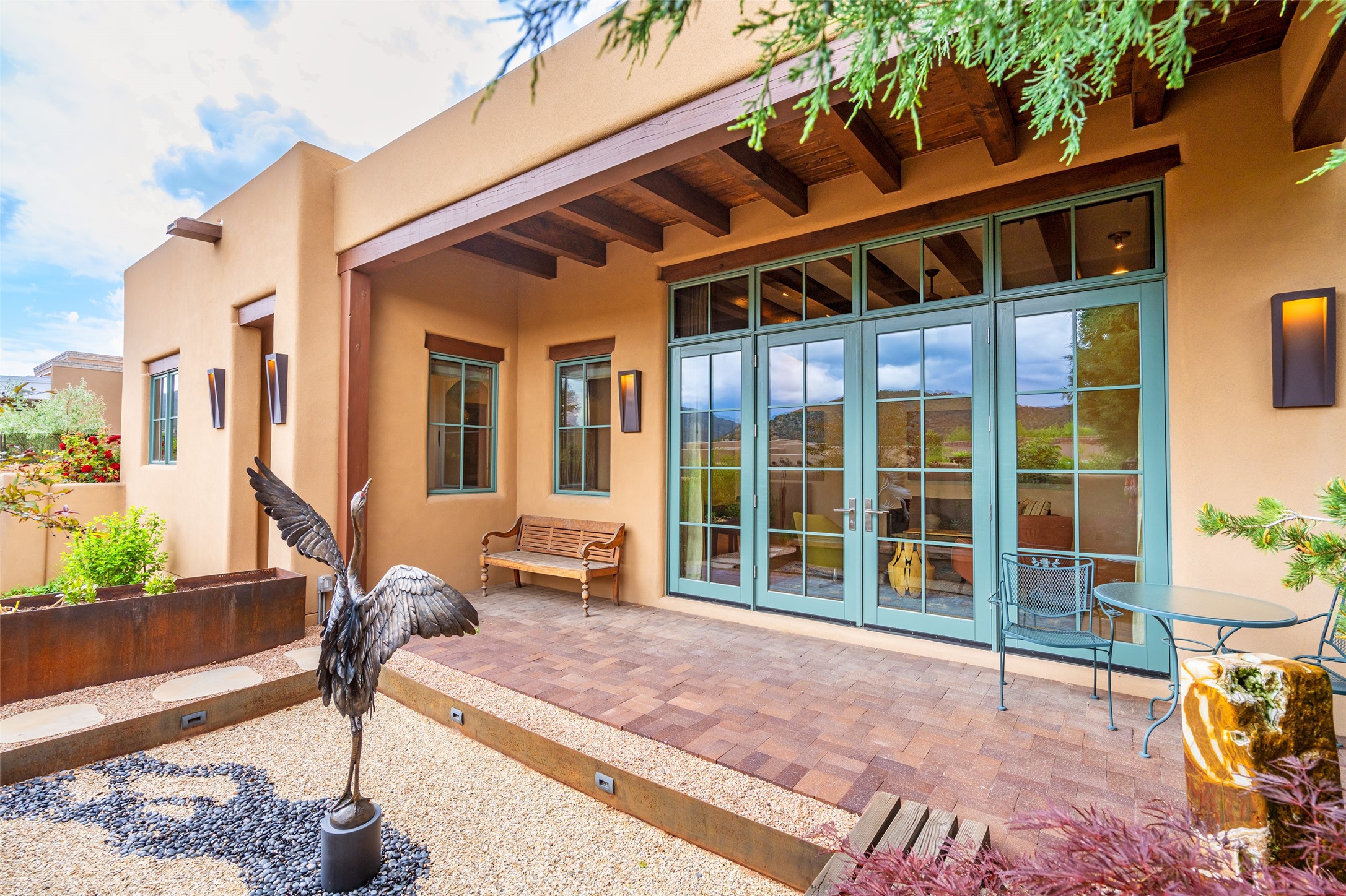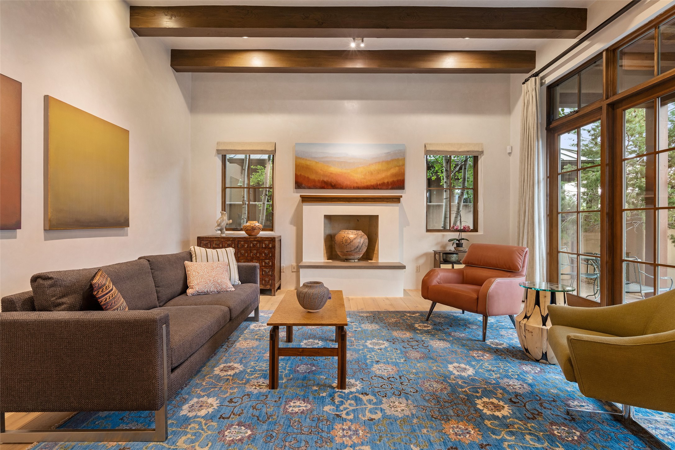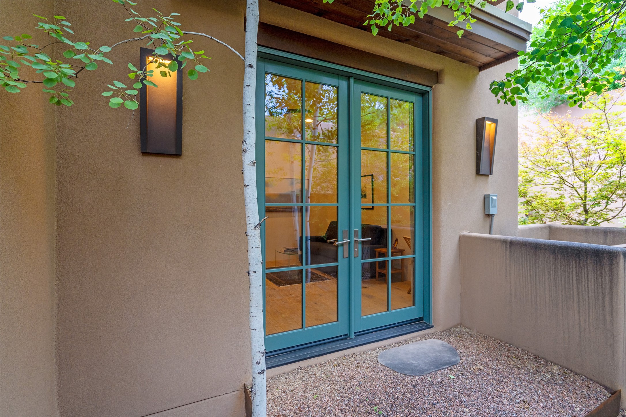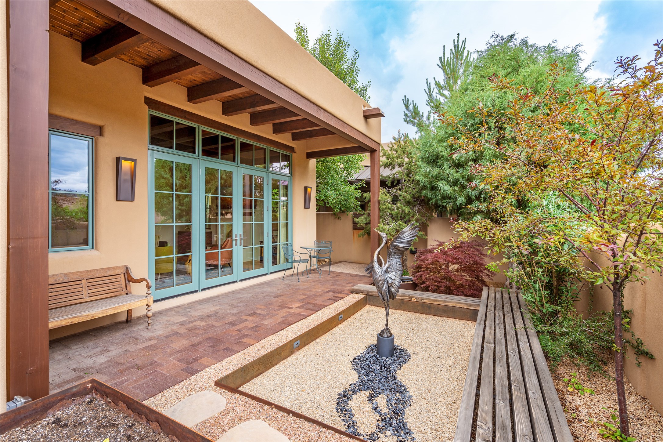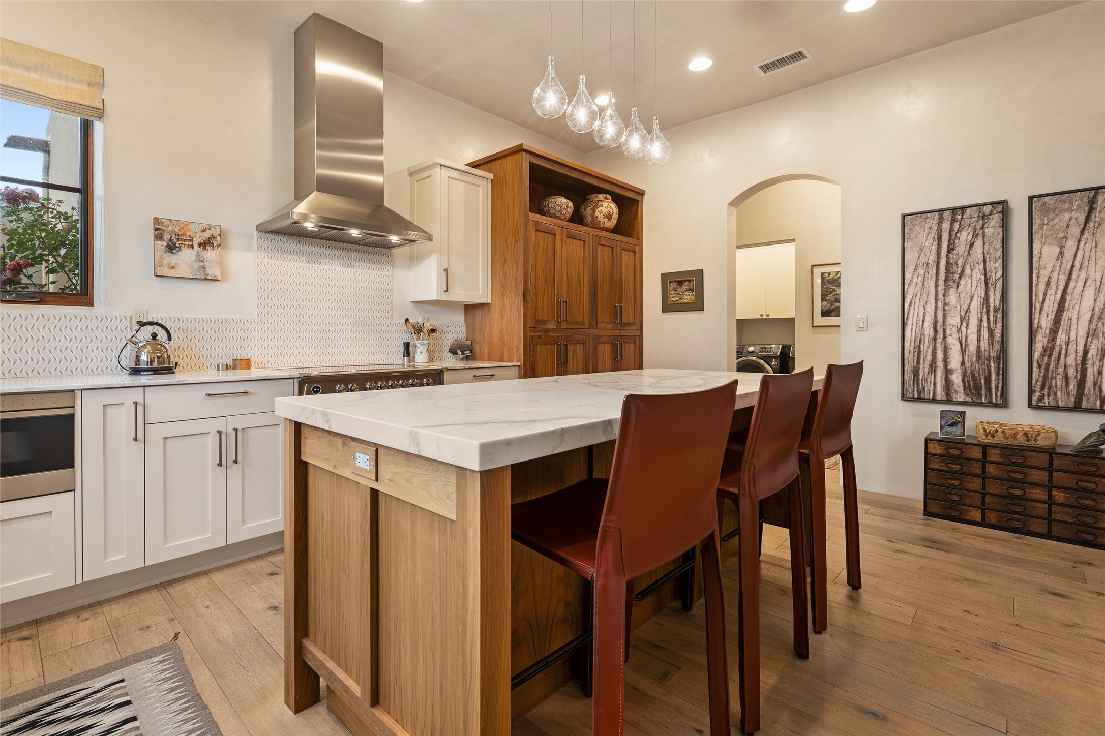 Simply Sublime in the Santa Fe Foothills! Located just moments from both Canyon Road and the historic Santa Fe Plaza, this stunning contemporary residence is the perfect blend of sophisticated elegance and functional livability. Nestled in the picturesque foothills within a charmingly small, gated community, the home offers sweeping views of the Sangre de Cristo Mountains through expansive French doors that flood the interior with natural light. Beautifully designed with a modern sensibility, the open-concept floor plan showcases wide-plank French Oak flooring, smooth hand-troweled plaster walls, and impeccable attention to detail throughout. The chef's kitchen is a true showstopper, featuring Calcutta marble countertops, custom Walnut cabinetry, and premium appliances including a new 36-inch Fisher & Paykel induction range.The spacious primary suite is a serene retreat with direct access to a private rear courtyard surrounded by lush, tranquil landscaping--ideal for morning coffee or evening reflection. The spa-like primary bath includes dual sinks set into bespoke wood countertops, a luxurious soaking tub, and a generous walk-in shower. The ensuite guest bedroom also opens to its own private outdoor seating area, offering a peaceful escape for visitors. Additional features include a new, 2023 TPO roof, whole-house LED lighting, electronic water softener, refrigerated air conditioning, powder room for guests, and an attached two-car garage. Every element of this home has been thoughtfully curated--creating a truly exceptional contemporary sanctuary in one of Santa Fe's most coveted locations.