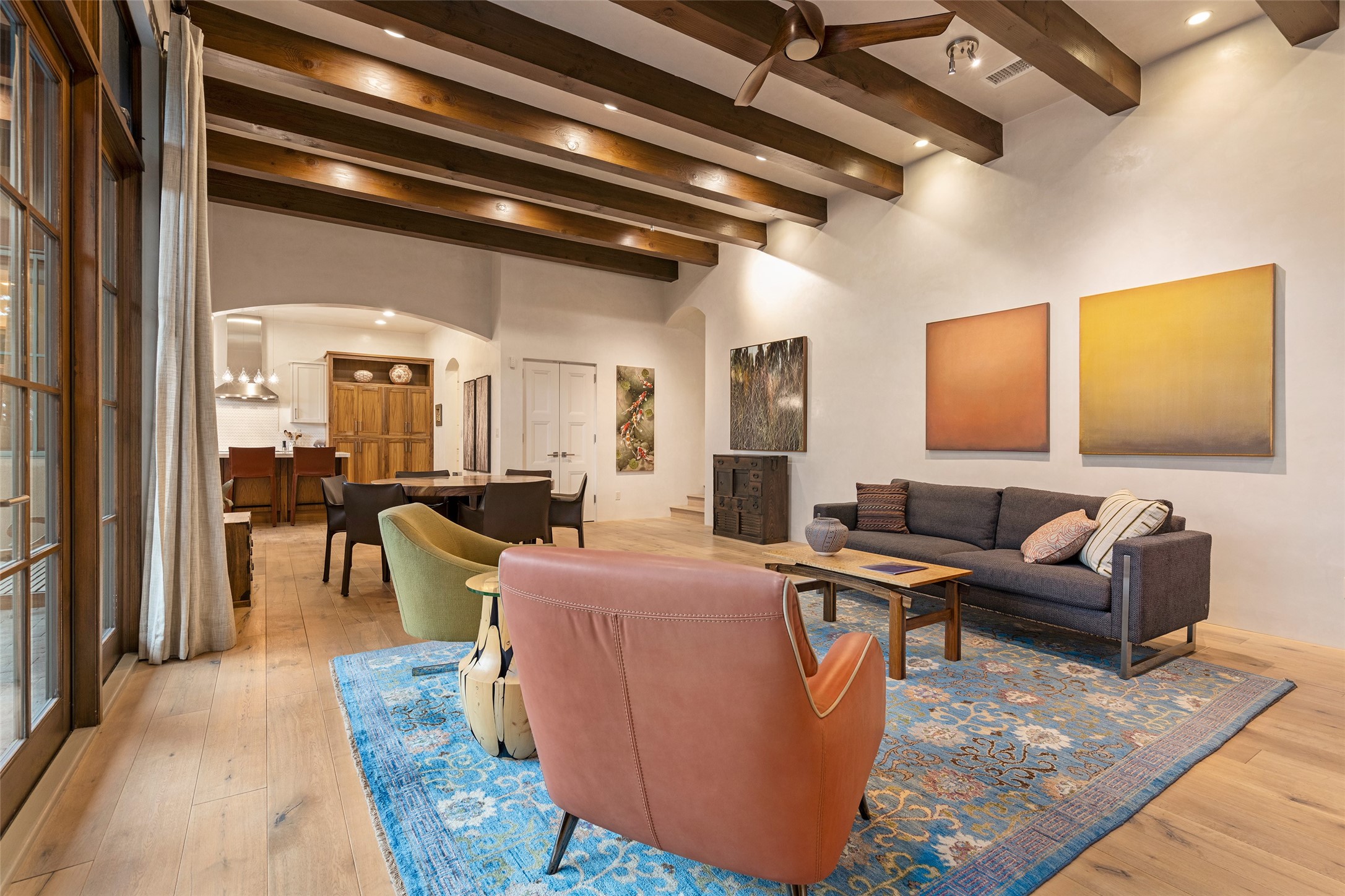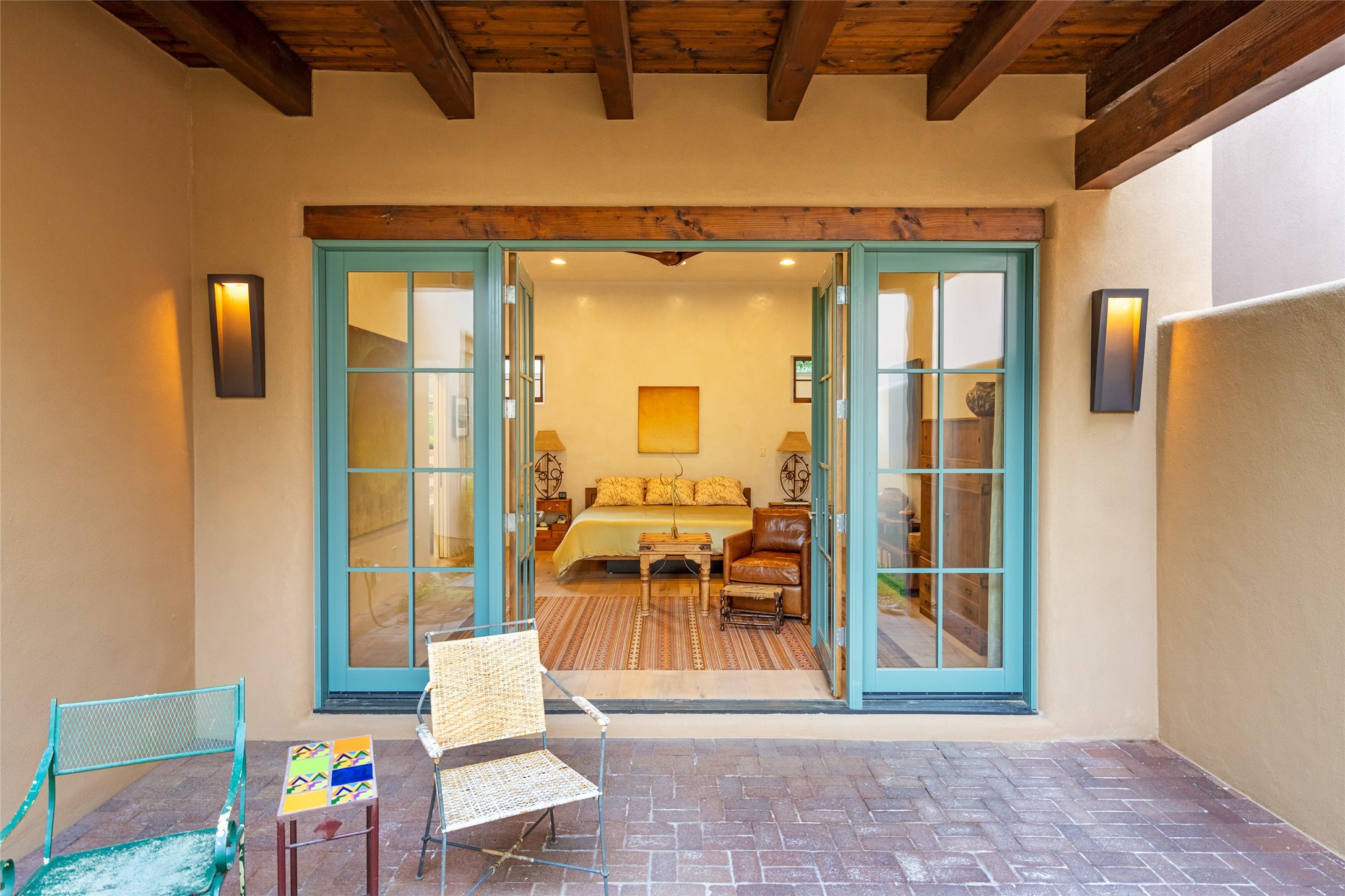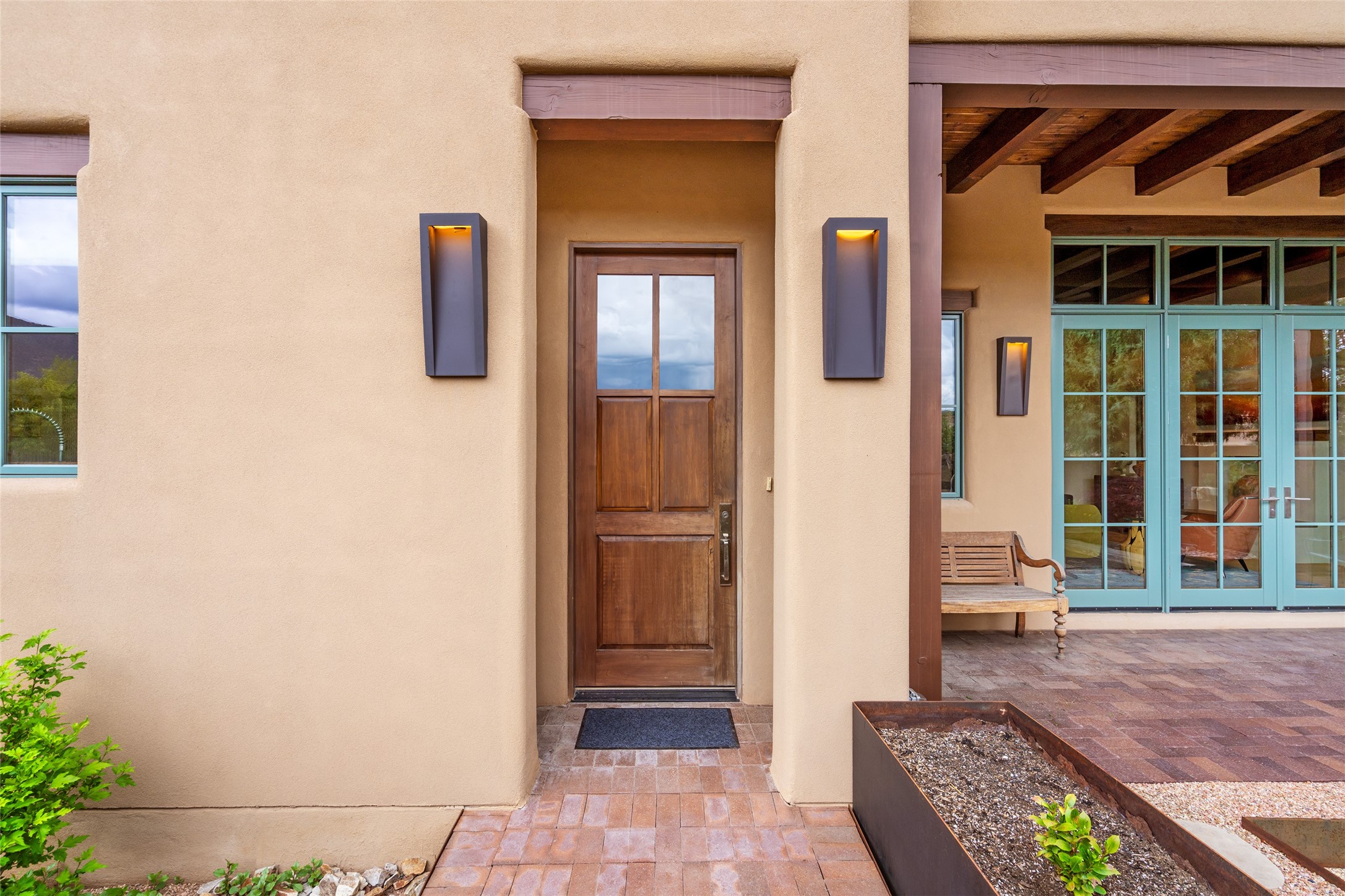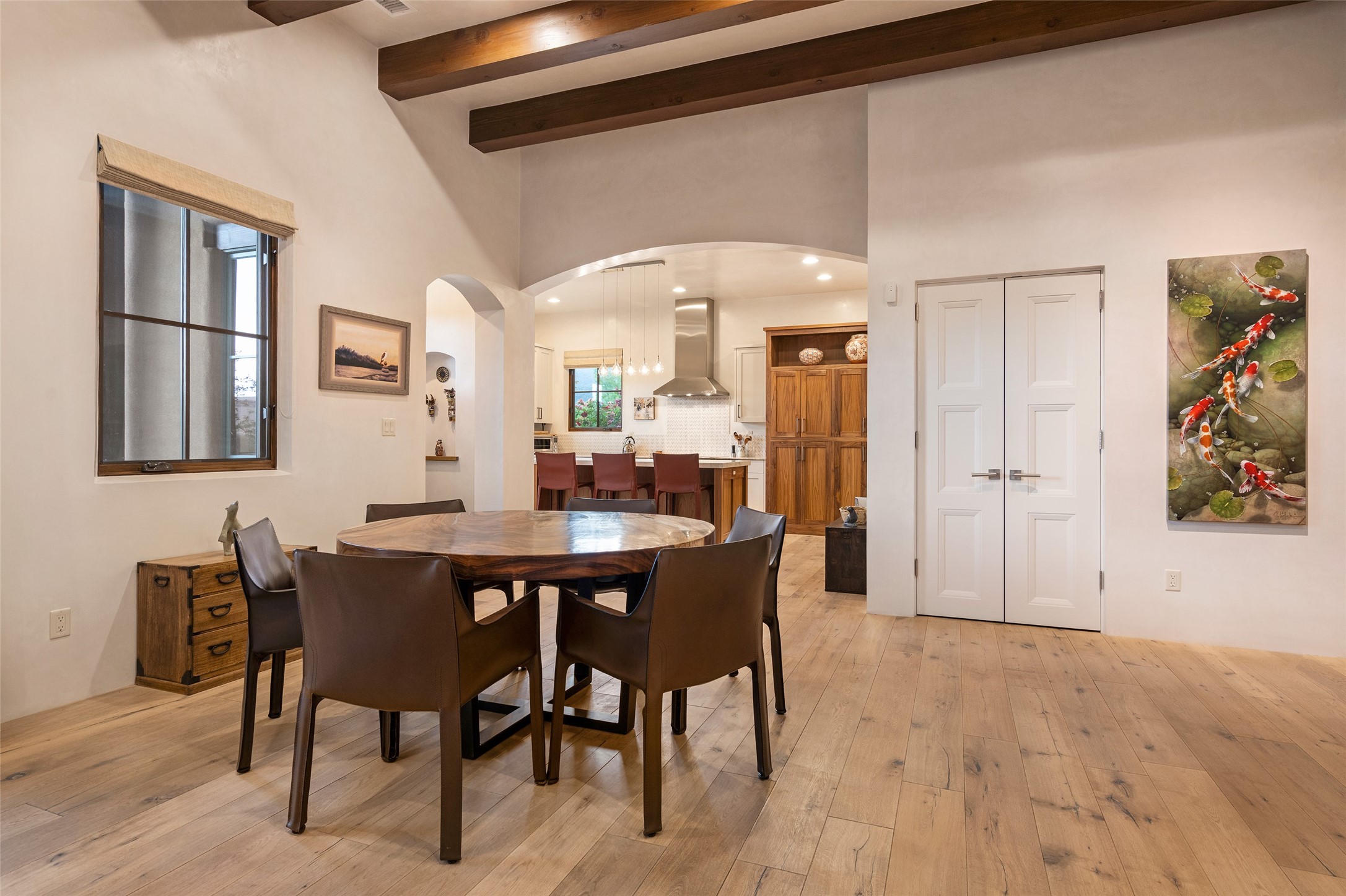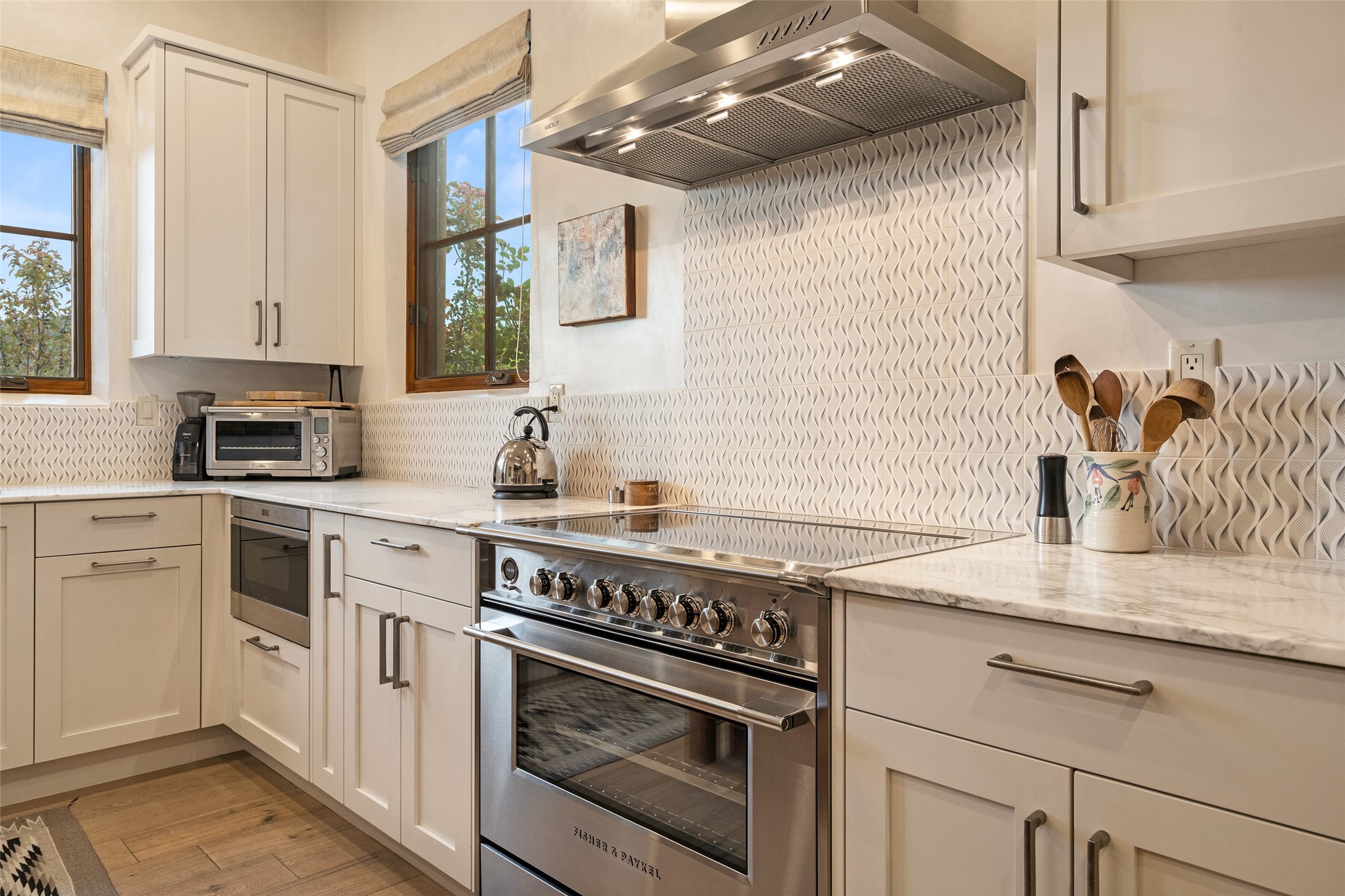 Simply Sublime in the Santa Fe Foothills! Located just moments from both Canyon Road and the historic Santa Fe Plaza, this stunning contemporary residence is the perfect blend of sophisticated elegance and functional livability. Nestled in the picturesque foothills within a charmingly small, gated community, the home offers sweeping views of the Sangre de Cristo Mountains through expansive French doors that flood the interior with natural light. Beautifully designed with a modern sensibility, the open-concept floor plan showcases wide-plank French Oak flooring, smooth hand-troweled plaster walls, and impeccable attention to detail throughout. The chef's kitchen is a true showstopper, featuring Calcutta marble countertops, custom Walnut cabinetry, and premium appliances including a new 36-inch Fisher & Paykel induction range.The spacious primary suite is a serene retreat with direct access to a private rear courtyard surrounded by lush, tranquil landscaping--ideal for morning coffee or evening reflection. The spa-like primary bath includes dual sinks set into bespoke wood countertops, a luxurious soaking tub, and a generous walk-in shower. The ensuite guest bedroom also opens to its own private outdoor seating area, offering a peaceful escape for visitors. Additional features include a new, 2023 TPO roof, whole-house LED lighting, electronic water softener, refrigerated air conditioning, powder room for guests, and an attached two-car garage. Every element of this home has been thoughtfully curated--creating a truly exceptional contemporary sanctuary in one of Santa Fe's most coveted locations.