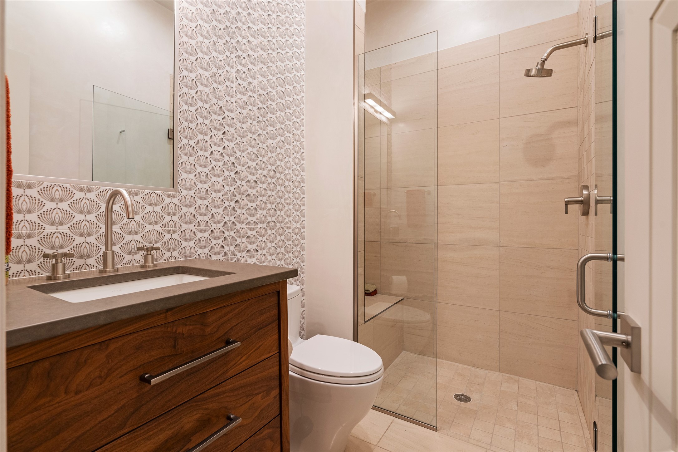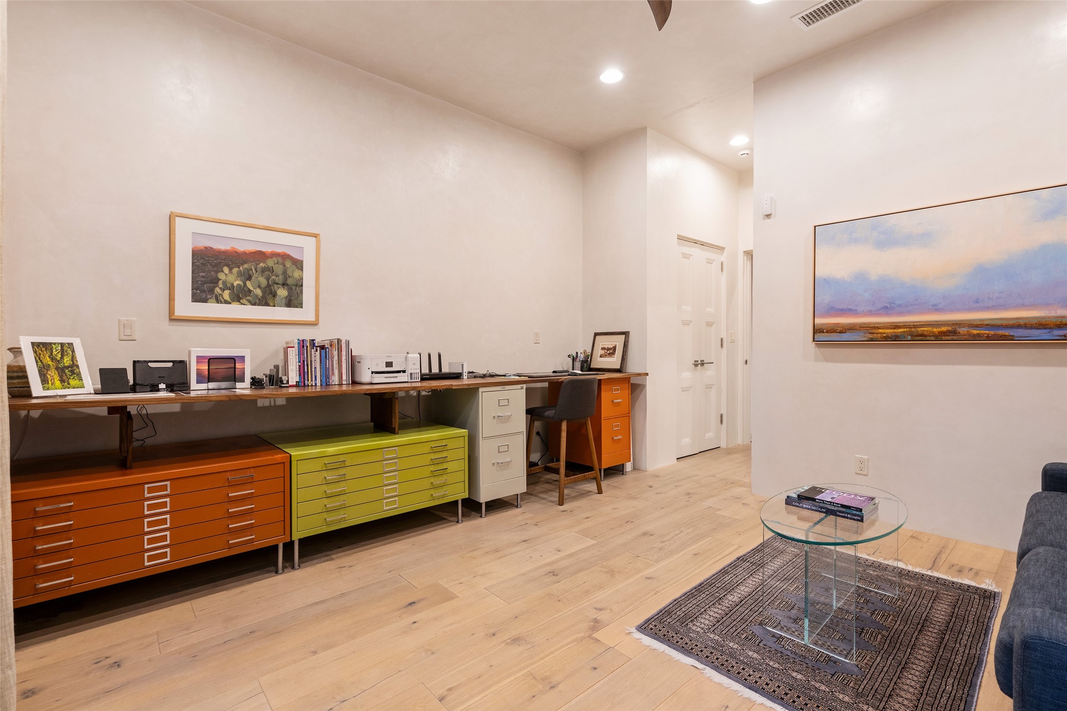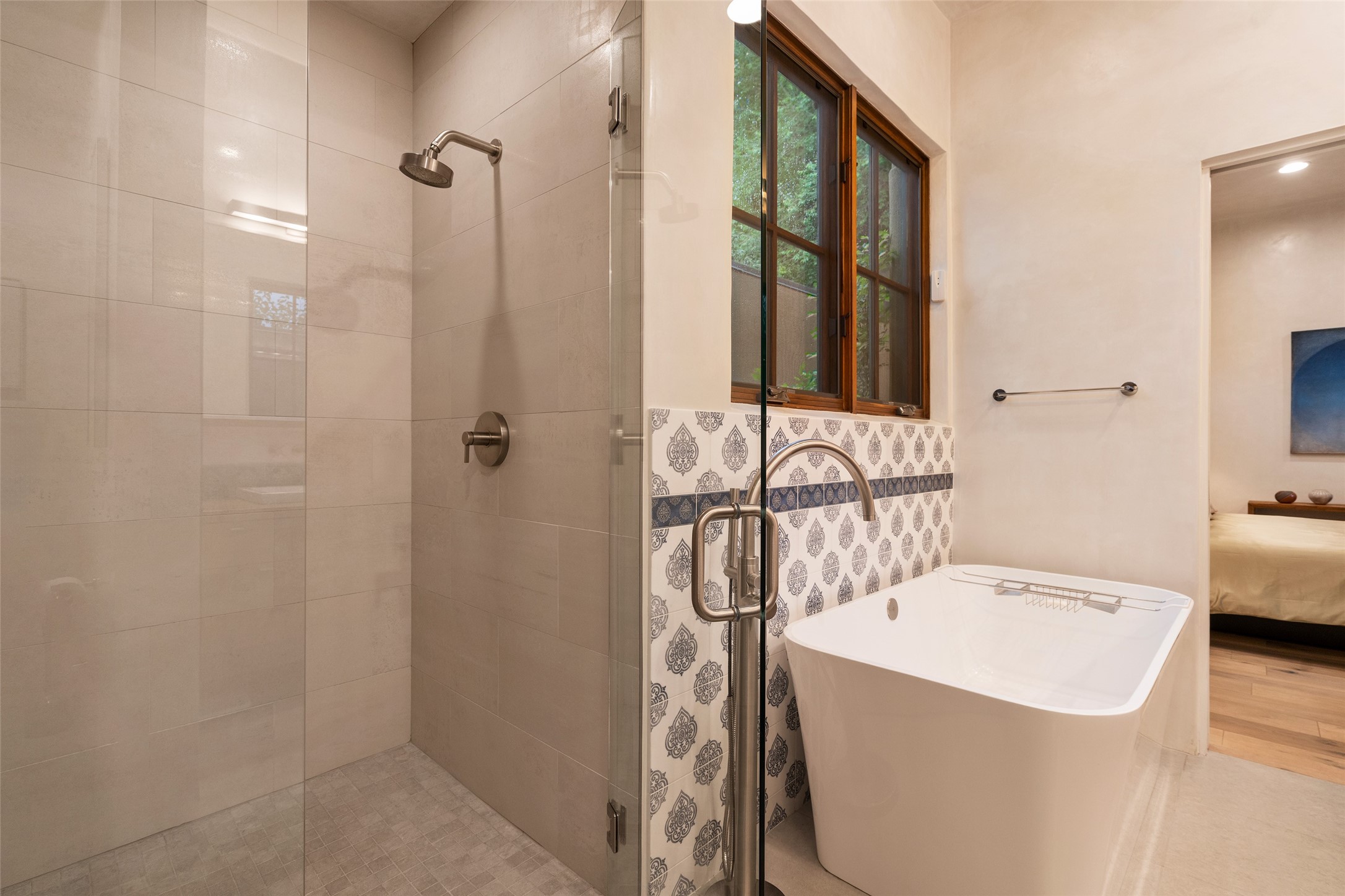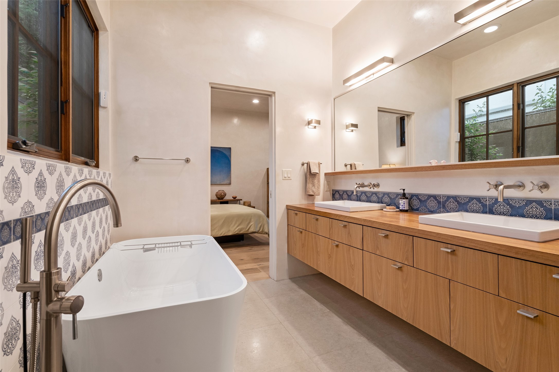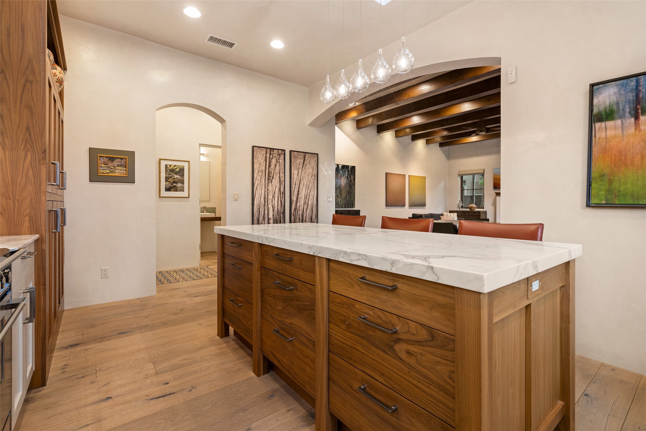 Simply Sublime in the Santa Fe Foothills! Located just moments from both Canyon Road and the historic Santa Fe Plaza, this stunning contemporary residence is the perfect blend of sophisticated elegance and functional livability. Nestled in the picturesque foothills within a charmingly small, gated community, the home offers sweeping views of the Sangre de Cristo Mountains through expansive French doors that flood the interior with natural light. Beautifully designed with a modern sensibility, the open-concept floor plan showcases wide-plank French Oak flooring, smooth hand-troweled plaster walls, and impeccable attention to detail throughout. The chef's kitchen is a true showstopper, featuring Calcutta marble countertops, custom Walnut cabinetry, and premium appliances including a new 36-inch Fisher & Paykel induction range.The spacious primary suite is a serene retreat with direct access to a private rear courtyard surrounded by lush, tranquil landscaping--ideal for morning coffee or evening reflection. The spa-like primary bath includes dual sinks set into bespoke wood countertops, a luxurious soaking tub, and a generous walk-in shower. The ensuite guest bedroom also opens to its own private outdoor seating area, offering a peaceful escape for visitors. Additional features include a new, 2023 TPO roof, whole-house LED lighting, electronic water softener, refrigerated air conditioning, powder room for guests, and an attached two-car garage. Every element of this home has been thoughtfully curated--creating a truly exceptional contemporary sanctuary in one of Santa Fe's most coveted locations.