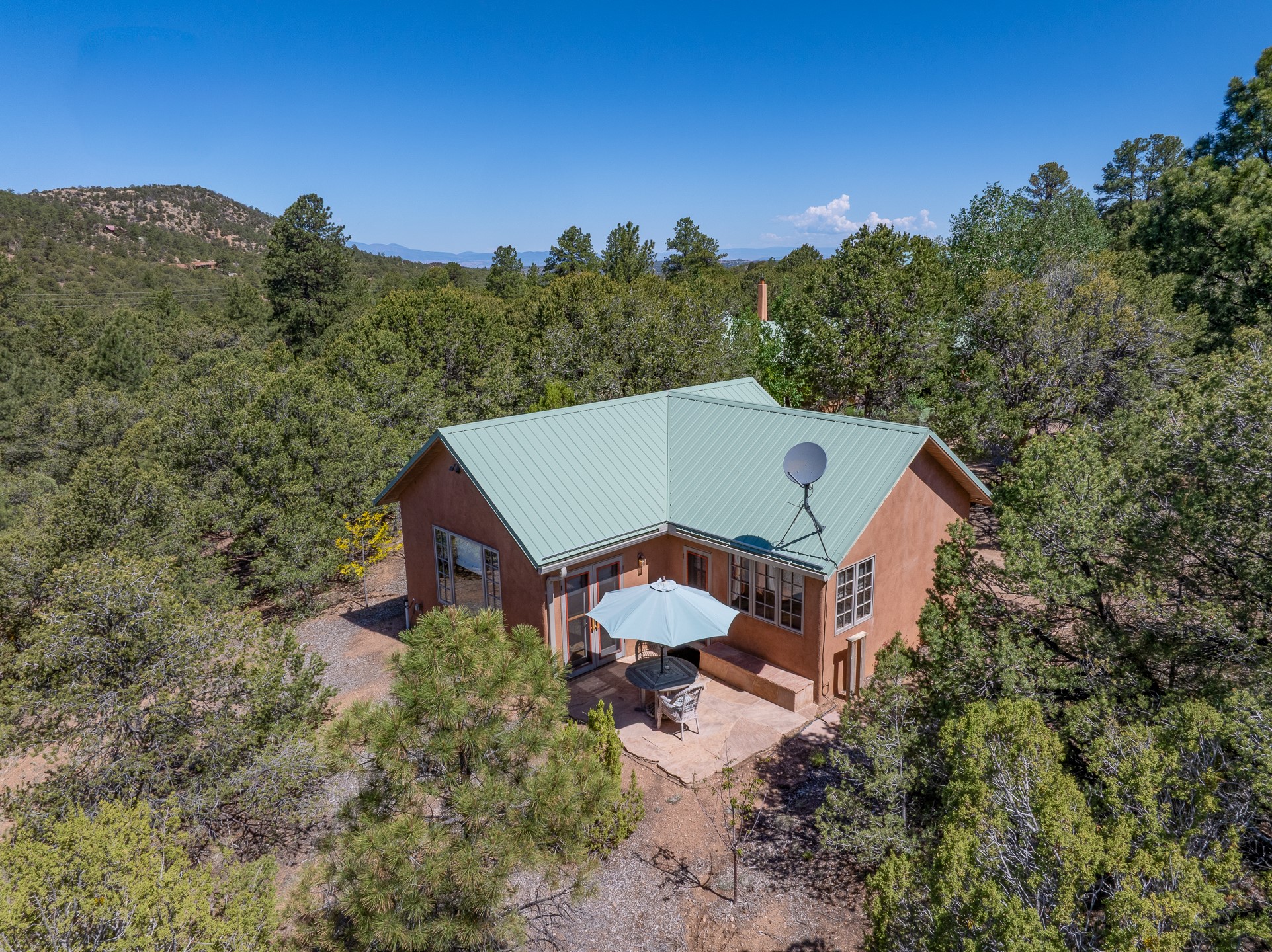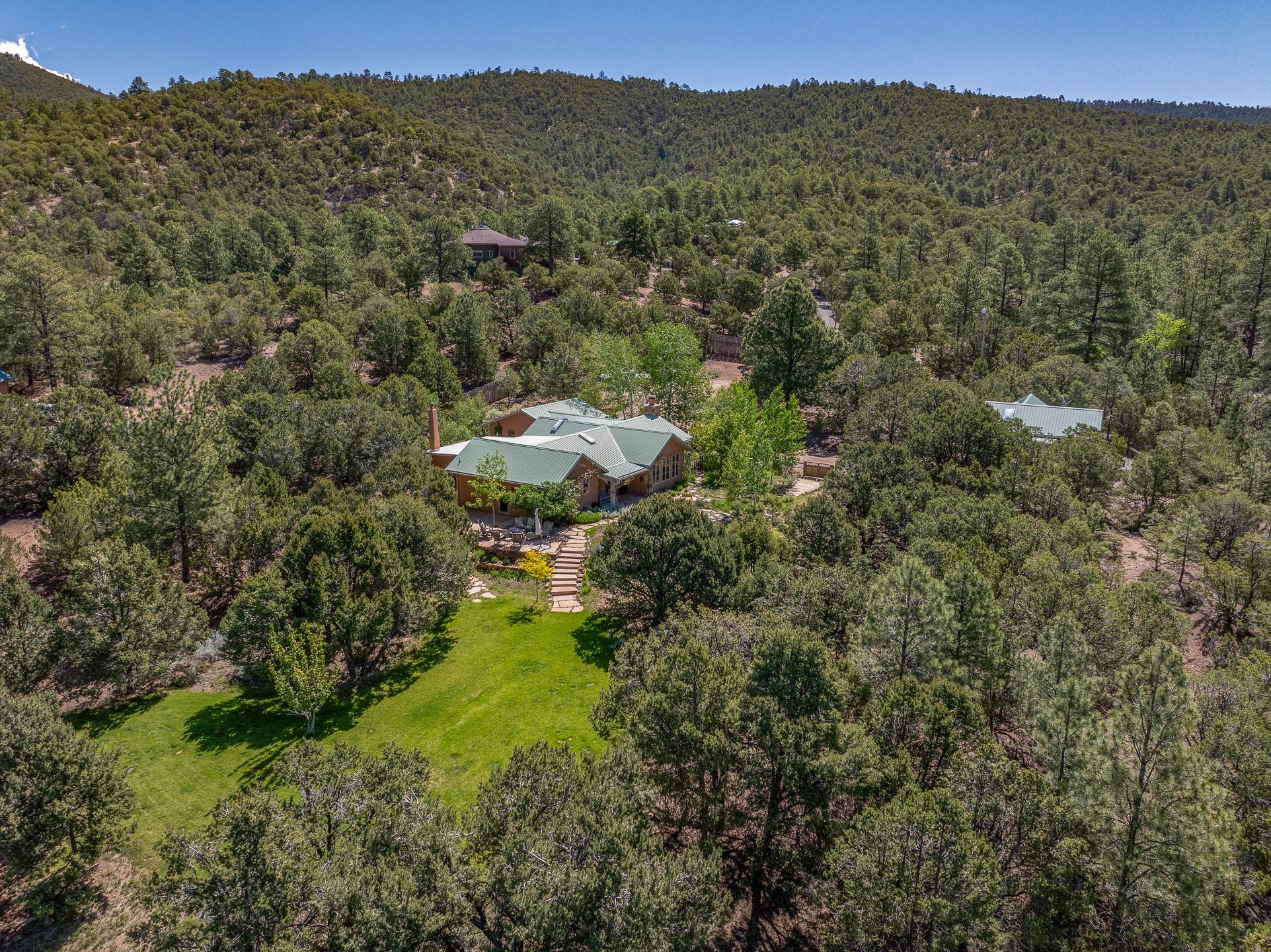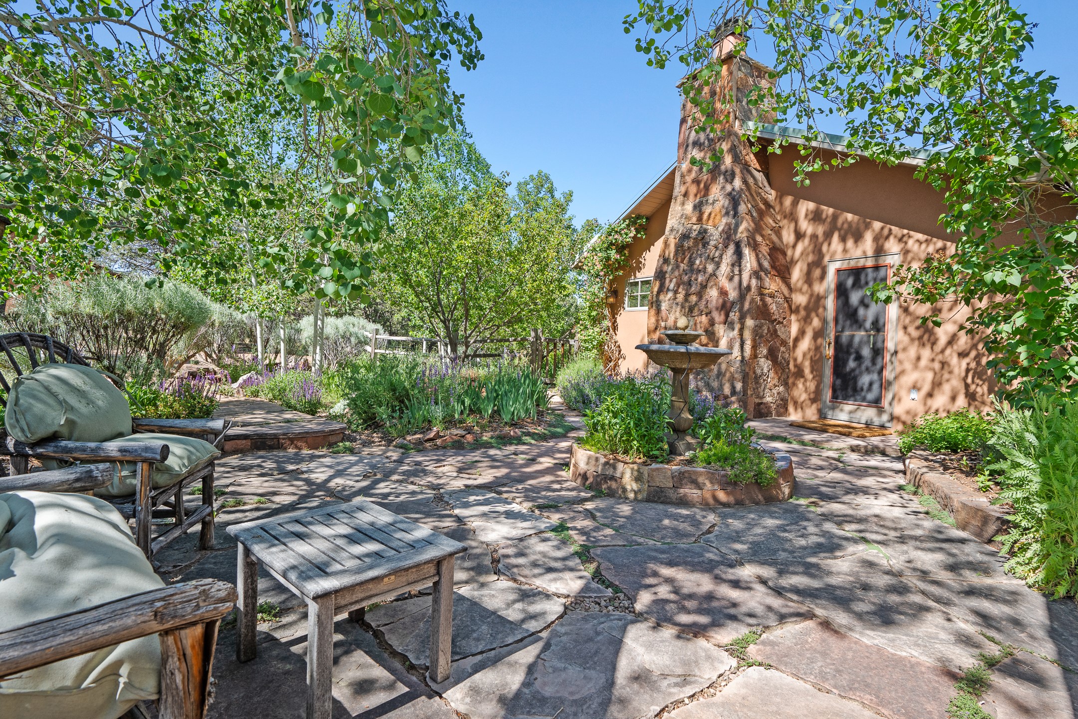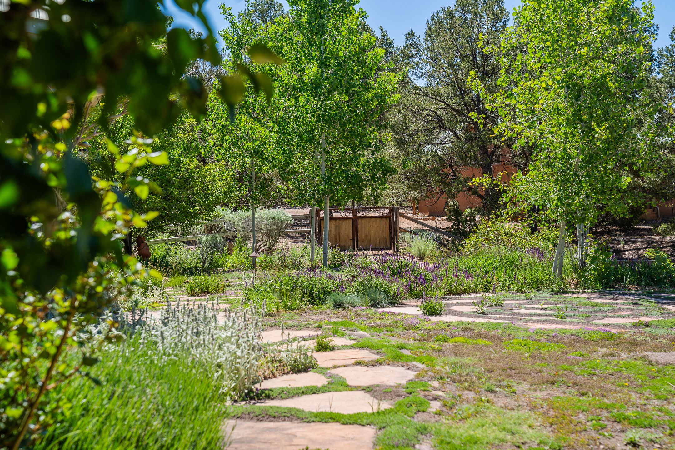 Just 15 minutes from the Santa Fe Plaza, this hidden gem is nestled on 5 acres in a lush, private valley bordering the Santa Fe National Forest. Surrounded by towering aspens, mature ponderosa pines, pions, fruit trees, and established gardens, the property offers rare seclusion, natural beauty, and immediate access to the outdoors. The 2,150 sq ft main residence features a pitched Northern New Mexico roof, radiant heat, mini splits, and a beautifully renovated kitchen with Wolf appliances. Hand-carved granite walls and flagstone patios add timeless character. A detached 625 sq ft one-bedroom guesthouse--fully licensed as a short-term rental--offers privacy for visitors or turn-key income potential. The Dale Ball Trail system--Santa Fe's most beloved network of hiking and biking trails--runs directly through the property, offering unmatched access to miles of scenic exploration right from your door. A large reclaimed seasonal pond adds to the magic of this serene landscape, with endless stargazing by night and wildlife by day. Additional highlights include a 2-car garage (1 bay heated), natural gas utilities, large cistern, and 18-station irrigation system powered by a shared well with 1.5 acre feet of water. The property is part of a small, well-run HOA with low dues and a friendly community. Gated access via Double Arrow ensures privacy and peace of mind. 53 Hidden Valley is a rare opportunity to live immersed in nature--with starry skies above, trails beneath your feet, and Santa Fe's rich culture just minutes away.
