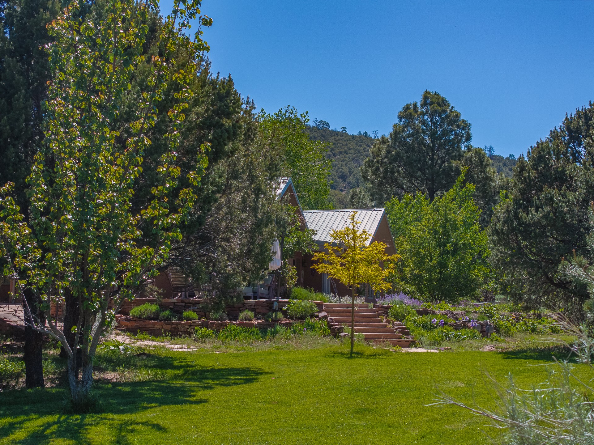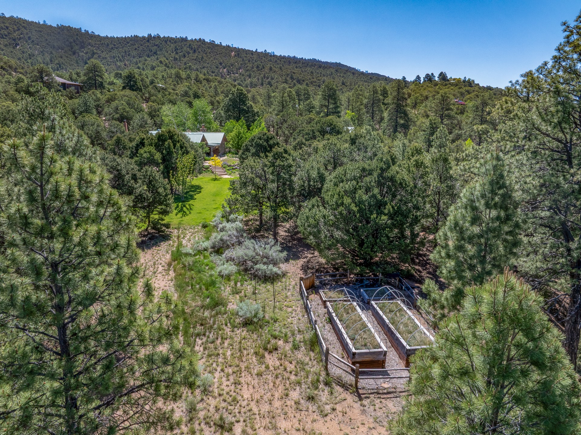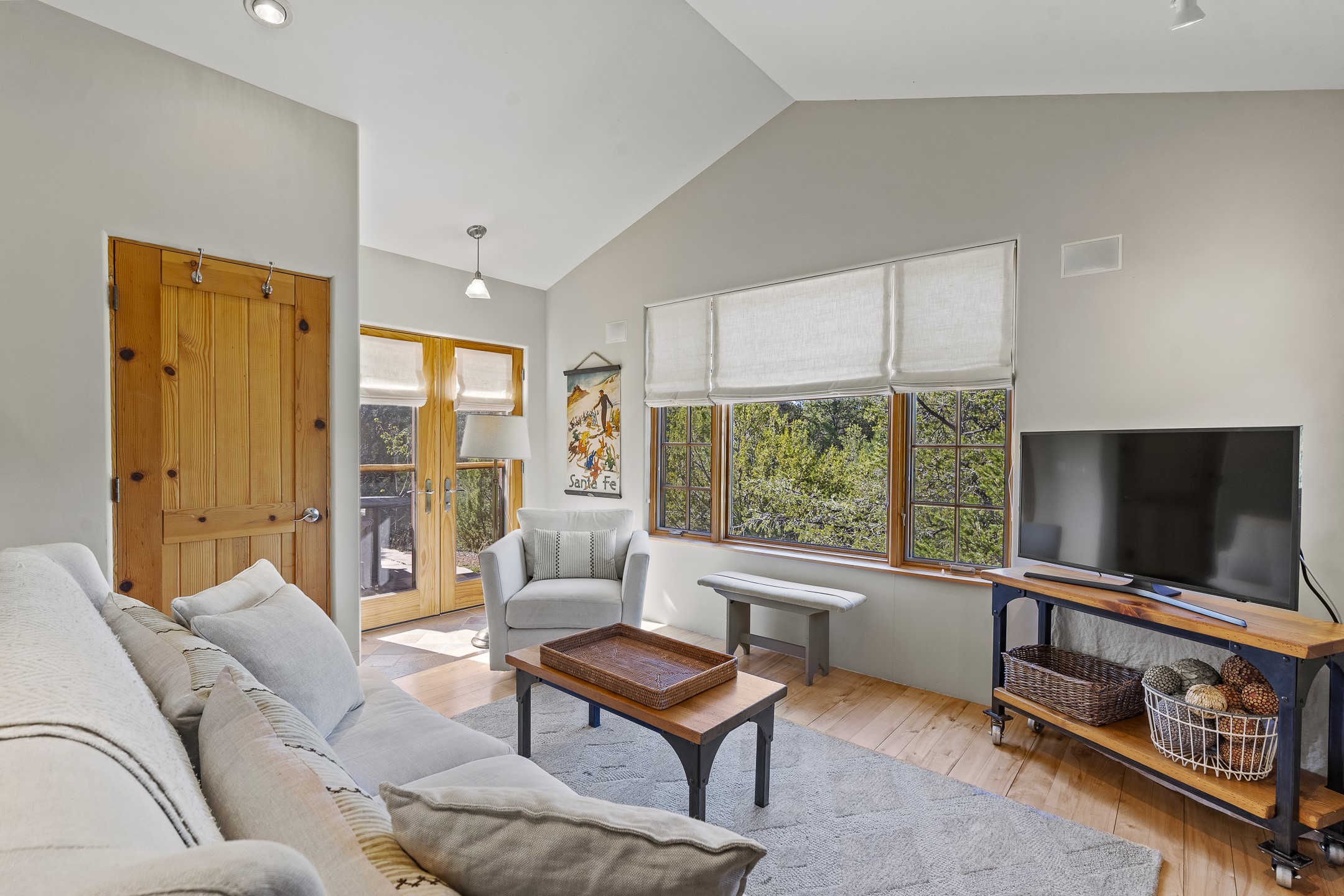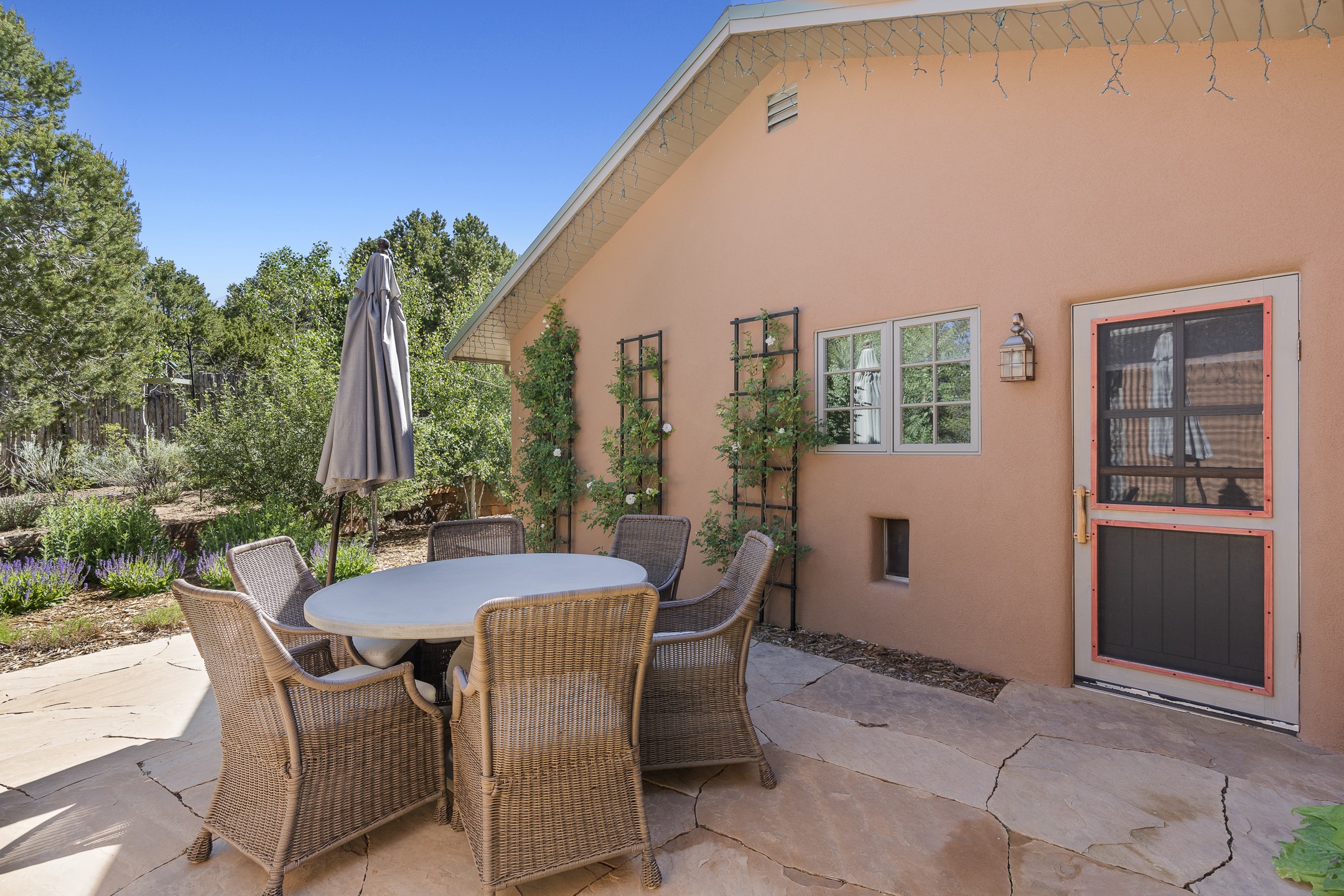 Just 15 minutes from the Santa Fe Plaza, this hidden gem is nestled on 5 acres in a lush, private valley bordering the Santa Fe National Forest. Surrounded by towering aspens, mature ponderosa pines, pions, fruit trees, and established gardens, the property offers rare seclusion, natural beauty, and immediate access to the outdoors. The 2,150 sq ft main residence features a pitched Northern New Mexico roof, radiant heat, mini splits, and a beautifully renovated kitchen with Wolf appliances. Hand-carved granite walls and flagstone patios add timeless character. A detached 625 sq ft one-bedroom guesthouse--fully licensed as a short-term rental--offers privacy for visitors or turn-key income potential. The Dale Ball Trail system--Santa Fe's most beloved network of hiking and biking trails--runs directly through the property, offering unmatched access to miles of scenic exploration right from your door. A large reclaimed seasonal pond adds to the magic of this serene landscape, with endless stargazing by night and wildlife by day. Additional highlights include a 2-car garage (1 bay heated), natural gas utilities, large cistern, and 18-station irrigation system powered by a shared well with 1.5 acre feet of water. The property is part of a small, well-run HOA with low dues and a friendly community. Gated access via Double Arrow ensures privacy and peace of mind. 53 Hidden Valley is a rare opportunity to live immersed in nature--with starry skies above, trails beneath your feet, and Santa Fe's rich culture just minutes away.