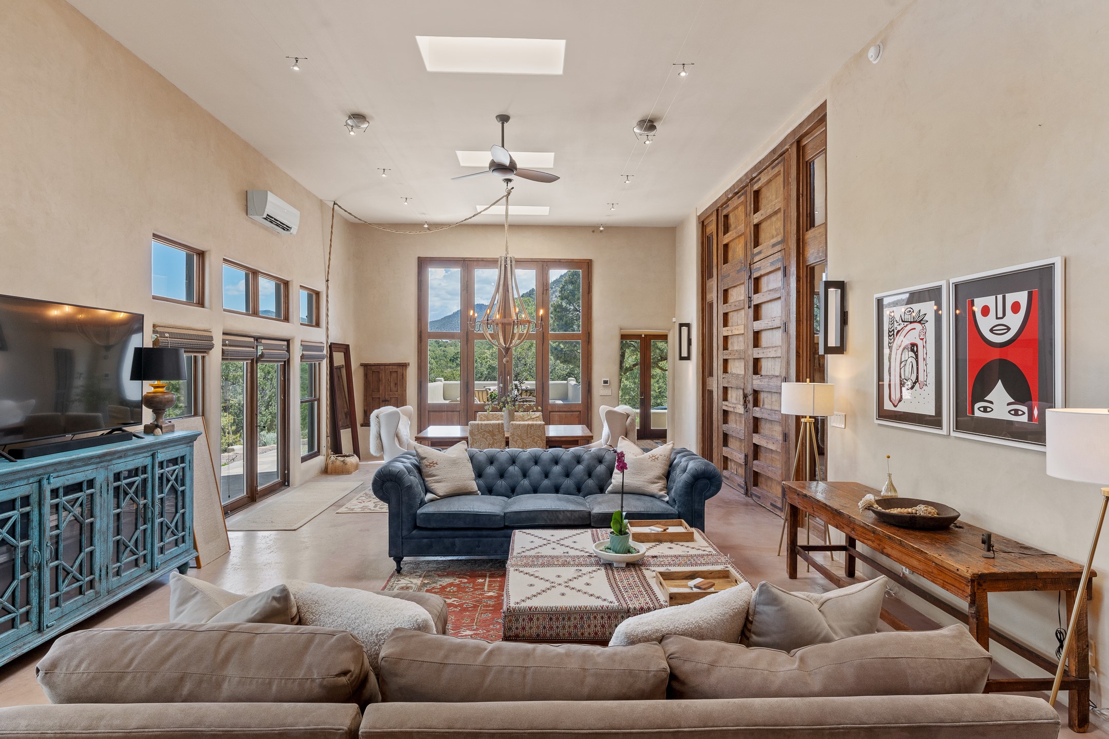 Beautifully sited on 2.5 acres in the foothills of the Sangre de Cristo Mountains, this stunning 3,836 sq. ft. home is a rare blend of traditional Santa Fe style, modern updates, and artistic provenance. Just 12 minutes from the historic Santa Fe Plaza, the property offers beautiful views of the Sangres, Jemez and Sandia Mountains, city lights, and Santa Fe's glorious sunsets. Originally built as a studio for the renowned Native American artist Bruce LaFountain and reimagined in 2001, the home has a distinct soul and history--including its appearance in a feature film. Every detail has been curated with intention, from the antique solid wood doors sourced from La Puerta Originals to the custom American Clay plaster walls, soaring ceilings, exposed vigas and rich natural light throughout. At the heart of the home is a chef's kitchen outfitted with center island, a built-in coffee wet bar with wine refrigerator, and an inviting intimate sitting area centered around a traditional kiva fireplace. This space flows seamlessly to a pergola-covered entertaining patio--ideal for grilling and relaxation. Towering ceilings grace the living room and dining room which also showcases stunning 14-foot antique doors from a Spanish Church and is connected to a spacious view patio ideal for entertaining and taking in the peace and drama of the skies and mountains. The primary suite is located upstairs and features a den/study as well as a spa like bath and a private roof top area with direct access from both the bedroom and bath. The downstairs guest area is separated for ultimate privacy area with each room having direct access to an outdoor space perfect for getting away from it all. Additional highlights include radiant in-floor heating, mini-splits for instant heating and cooling and over $200,000 in thoughtful improvements ensuring ease of living--highlighted by a new boiler and hot water heater, newer roof, newer stucco, newer washer and dryer. An optional designer furniture package is available for purchase, making this extraordinary home move-in ready for those seeking authenticity, elegance, and a true sense of place.