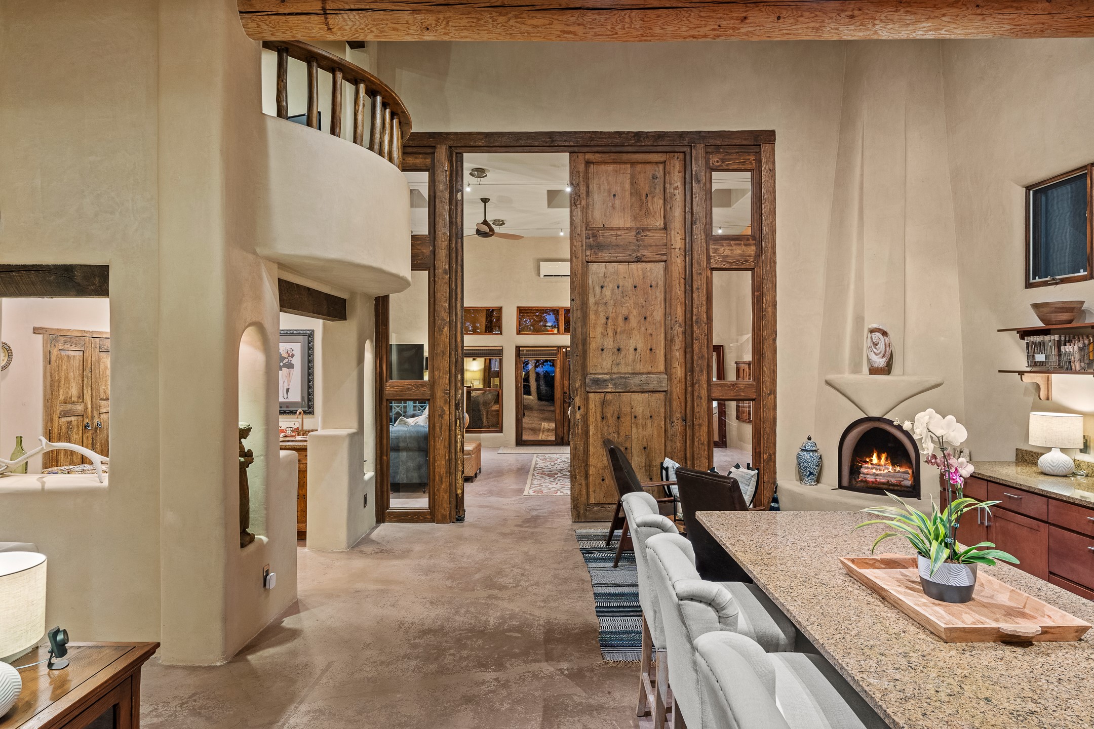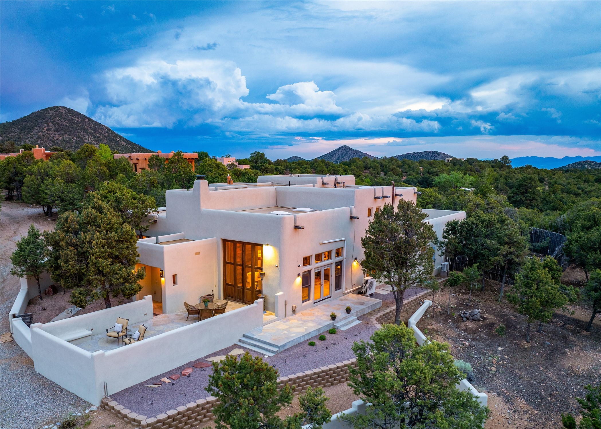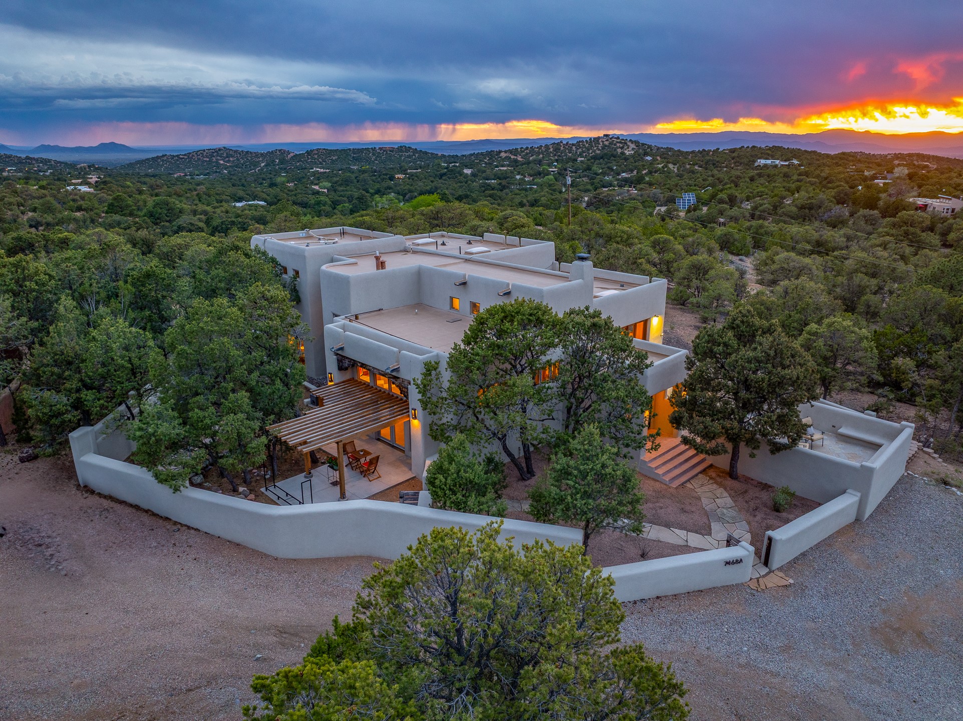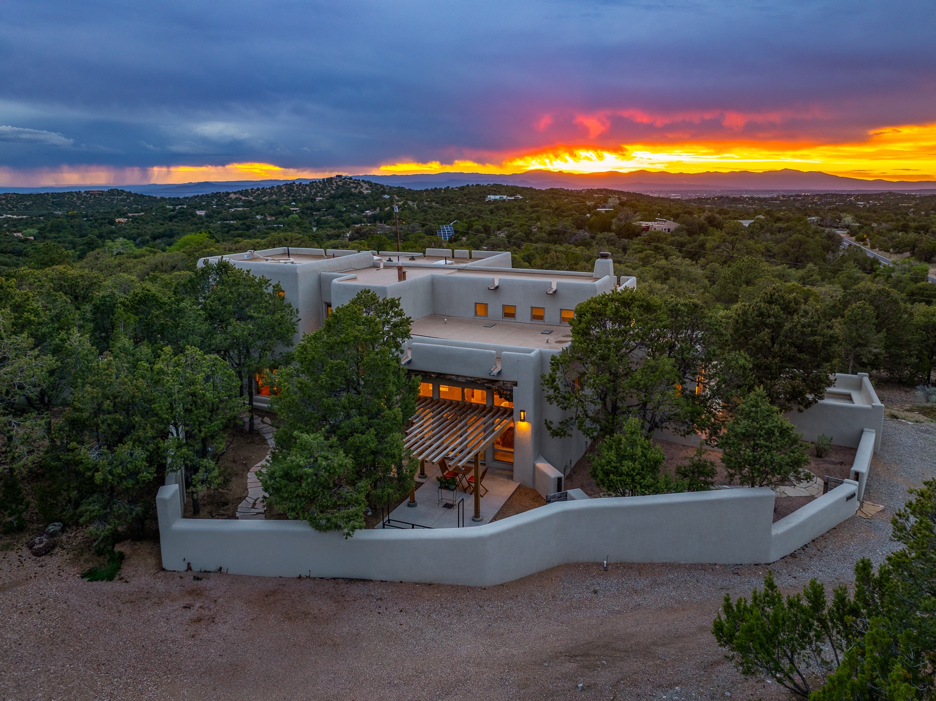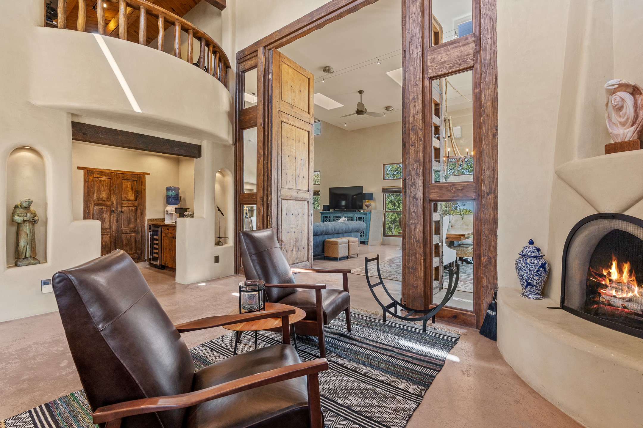 Beautifully sited on 2.5 acres in the foothills of the Sangre de Cristo Mountains, this stunning 3,836 sq. ft. home is a rare blend of traditional Santa Fe style, modern updates, and artistic provenance. Just 12 minutes from the historic Santa Fe Plaza, the property offers beautiful views of the Sangres, Jemez and Sandia Mountains, city lights, and Santa Fe's glorious sunsets. Originally built as a studio for the renowned Native American artist Bruce LaFountain and reimagined in 2001, the home has a distinct soul and history--including its appearance in a feature film. Every detail has been curated with intention, from the antique solid wood doors sourced from La Puerta Originals to the custom American Clay plaster walls, soaring ceilings, exposed vigas and rich natural light throughout. At the heart of the home is a chef's kitchen outfitted with center island, a built-in coffee wet bar with wine refrigerator, and an inviting intimate sitting area centered around a traditional kiva fireplace. This space flows seamlessly to a pergola-covered entertaining patio--ideal for grilling and relaxation. Towering ceilings grace the living room and dining room which also showcases stunning 14-foot antique doors from a Spanish Church and is connected to a spacious view patio ideal for entertaining and taking in the peace and drama of the skies and mountains. The primary suite is located upstairs and features a den/study as well as a spa like bath and a private roof top area with direct access from both the bedroom and bath. The downstairs guest area is separated for ultimate privacy area with each room having direct access to an outdoor space perfect for getting away from it all. Additional highlights include radiant in-floor heating, mini-splits for instant heating and cooling and over $200,000 in thoughtful improvements ensuring ease of living--highlighted by a new boiler and hot water heater, newer roof, newer stucco, newer washer and dryer. An optional designer furniture package is available for purchase, making this extraordinary home move-in ready for those seeking authenticity, elegance, and a true sense of place.