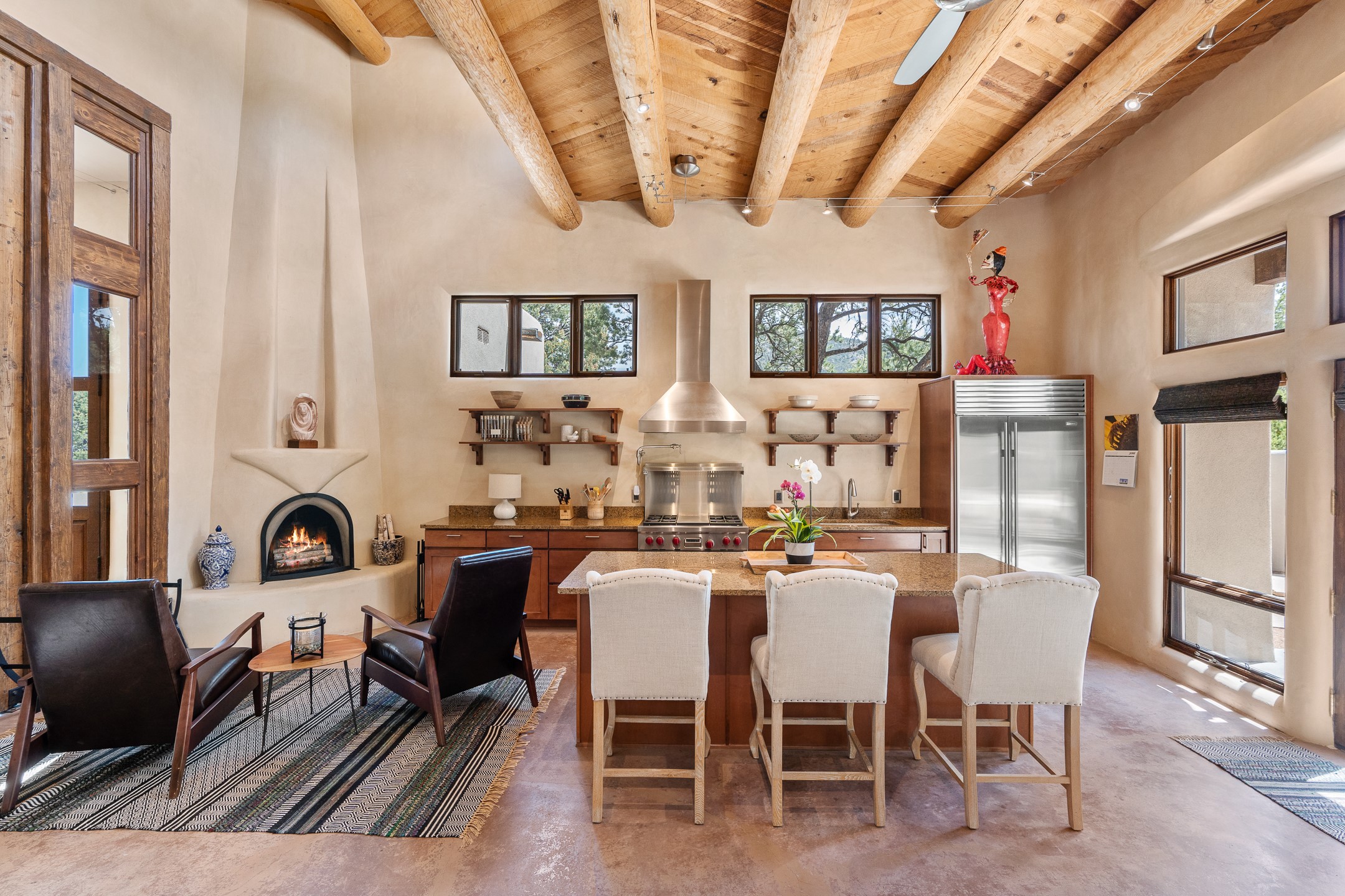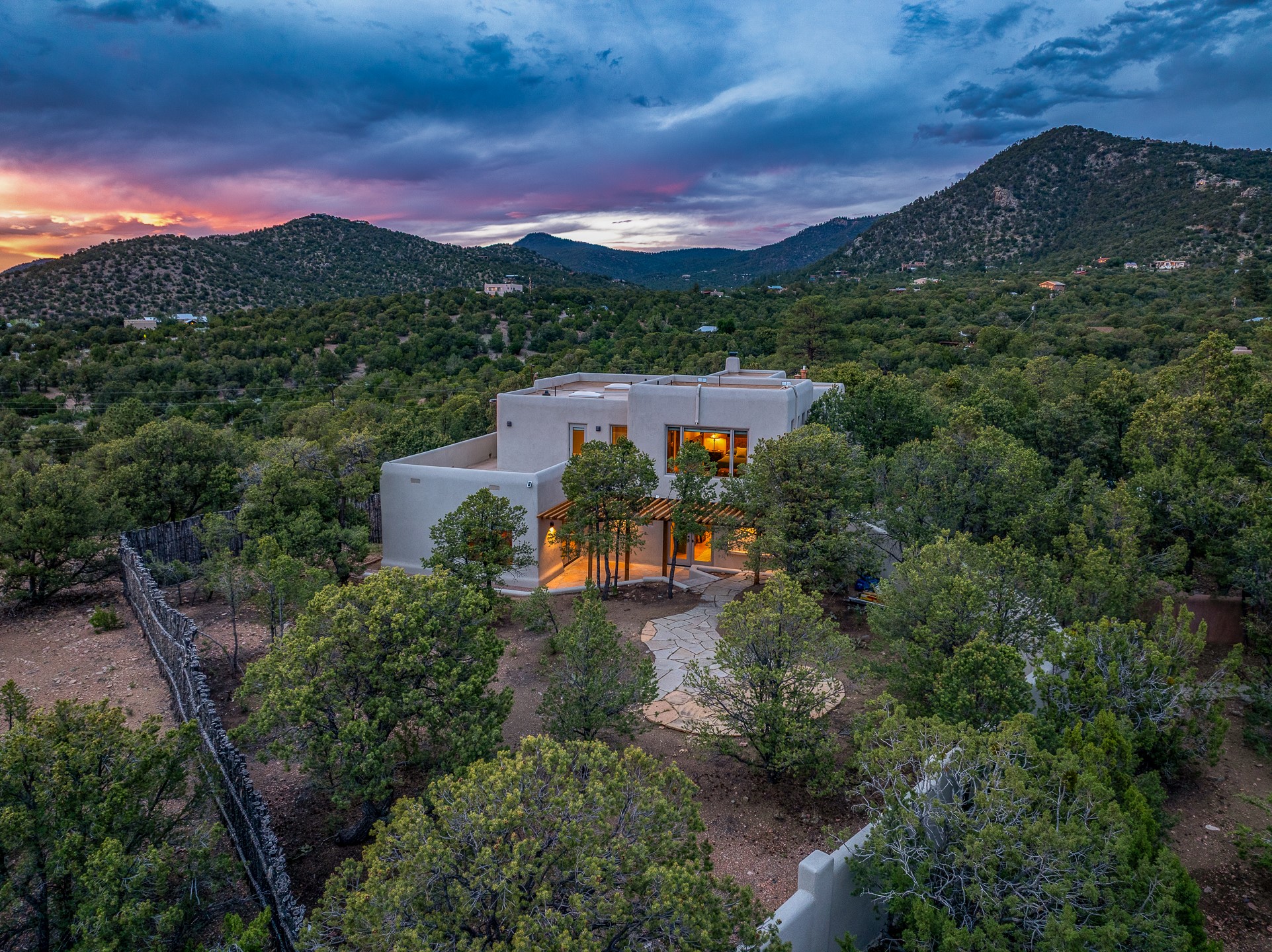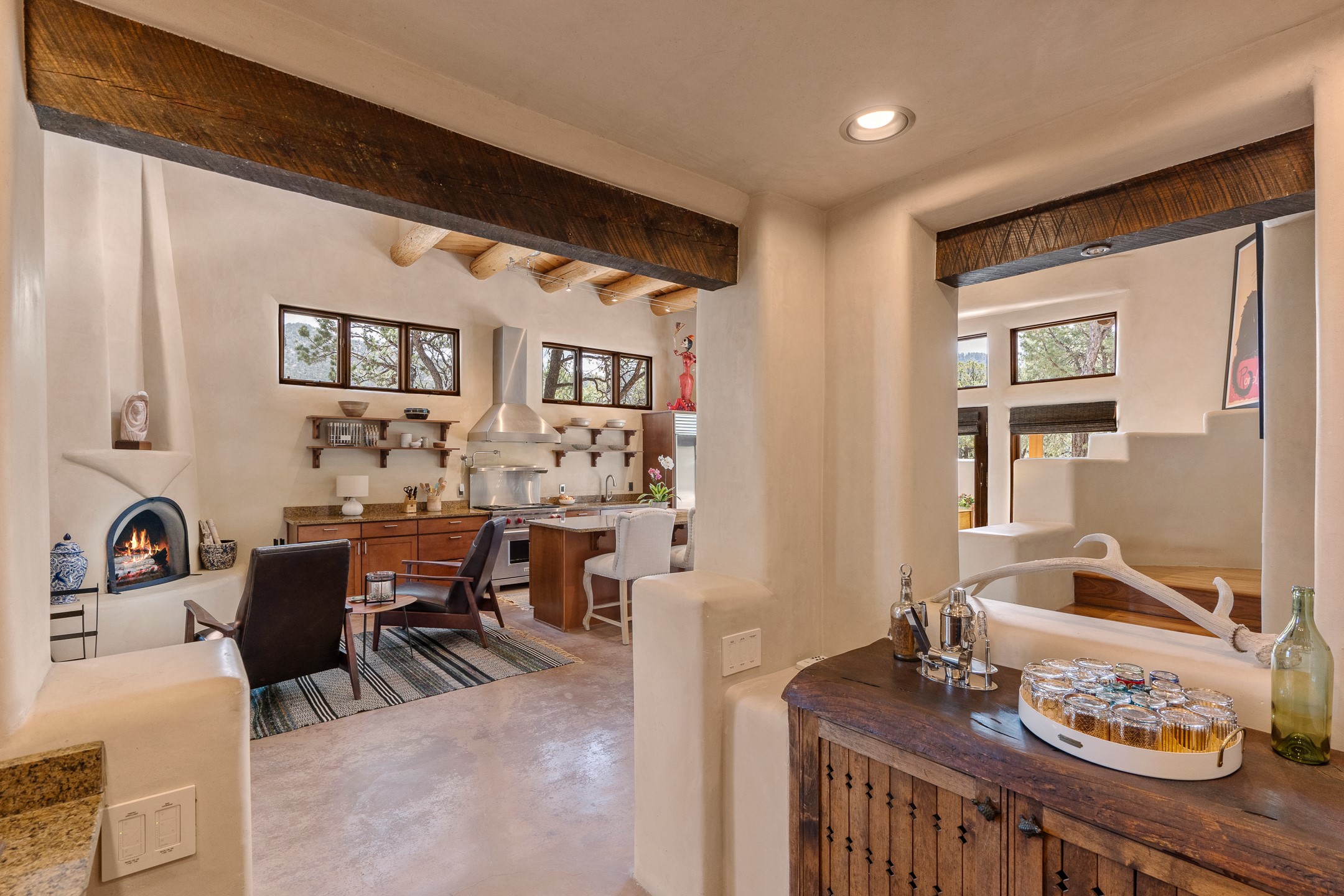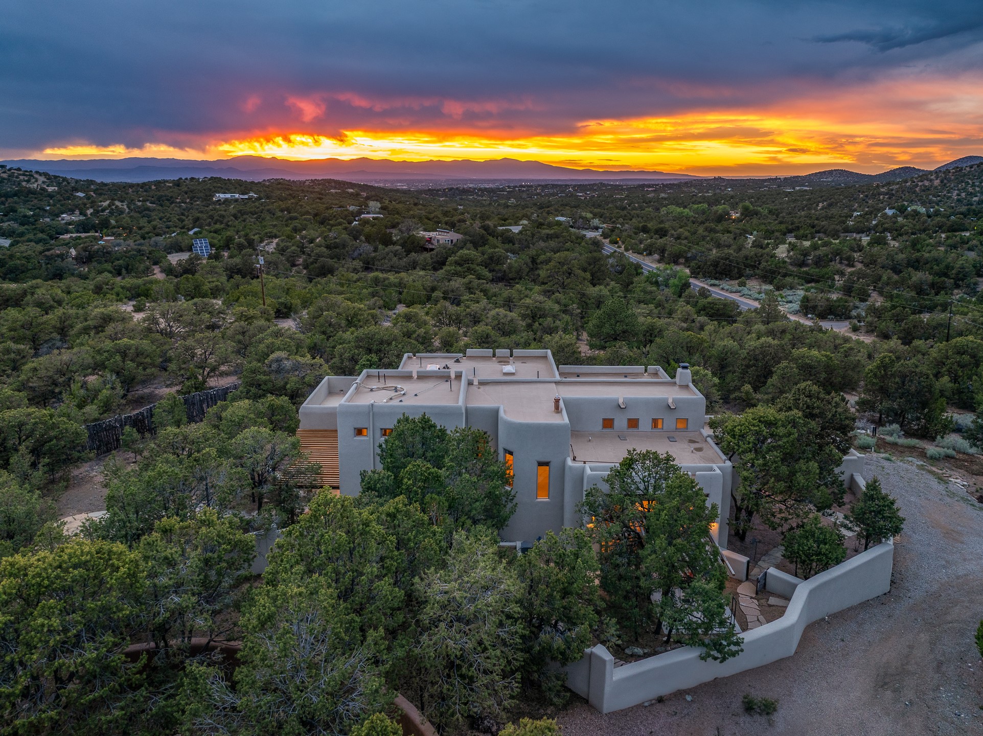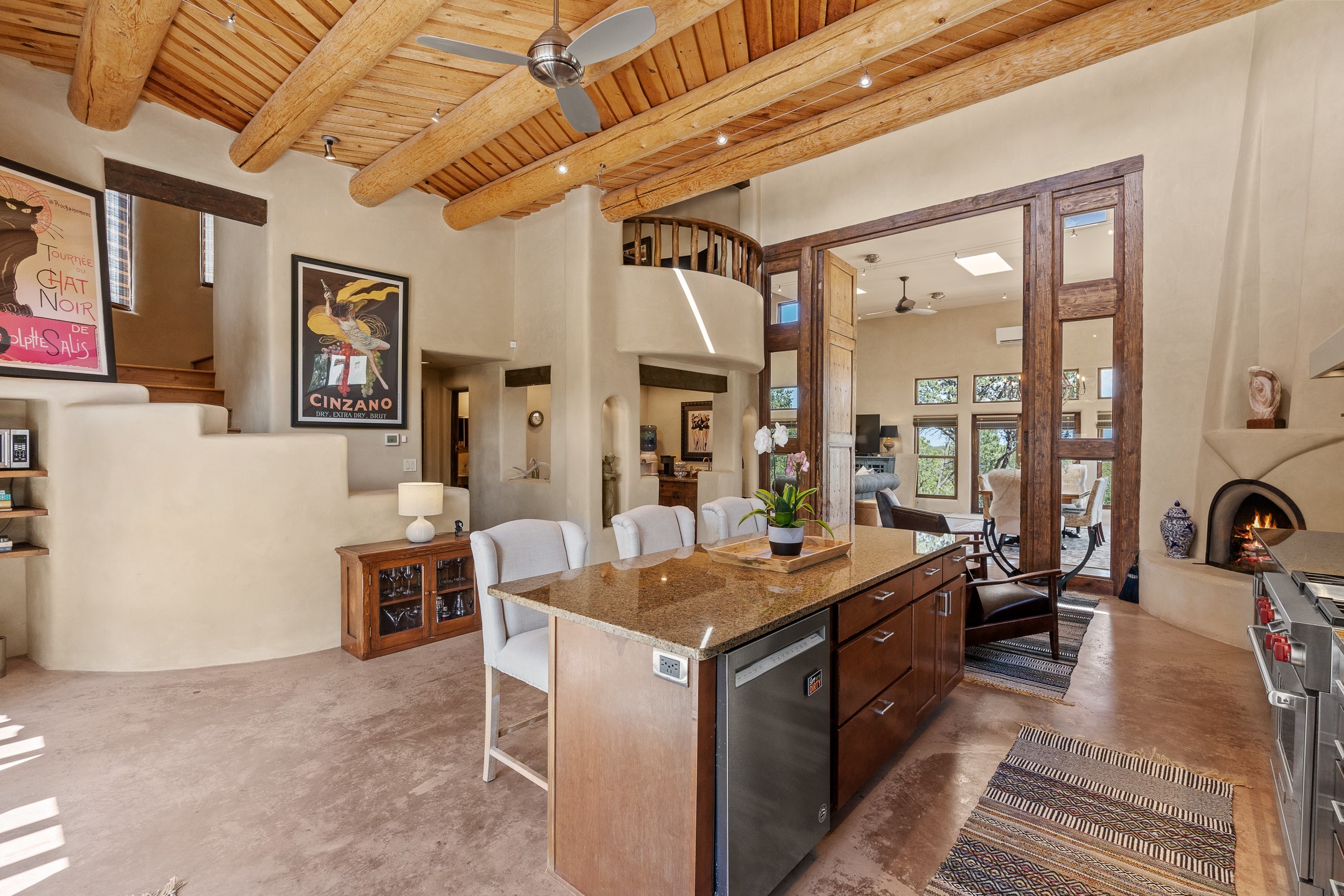 Beautifully sited on 2.5 acres in the foothills of the Sangre de Cristo Mountains, this stunning 3,836 sq. ft. home is a rare blend of traditional Santa Fe style, modern updates, and artistic provenance. Just 12 minutes from the historic Santa Fe Plaza, the property offers beautiful views of the Sangres, Jemez and Sandia Mountains, city lights, and Santa Fe's glorious sunsets. Originally built as a studio for the renowned Native American artist Bruce LaFountain and reimagined in 2001, the home has a distinct soul and history--including its appearance in a feature film. Every detail has been curated with intention, from the antique solid wood doors sourced from La Puerta Originals to the custom American Clay plaster walls, soaring ceilings, exposed vigas and rich natural light throughout. At the heart of the home is a chef's kitchen outfitted with center island, a built-in coffee wet bar with wine refrigerator, and an inviting intimate sitting area centered around a traditional kiva fireplace. This space flows seamlessly to a pergola-covered entertaining patio--ideal for grilling and relaxation. Towering ceilings grace the living room and dining room which also showcases stunning 14-foot antique doors from a Spanish Church and is connected to a spacious view patio ideal for entertaining and taking in the peace and drama of the skies and mountains. The primary suite is located upstairs and features a den/study as well as a spa like bath and a private roof top area with direct access from both the bedroom and bath. The downstairs guest area is separated for ultimate privacy area with each room having direct access to an outdoor space perfect for getting away from it all. Additional highlights include radiant in-floor heating, mini-splits for instant heating and cooling and over $200,000 in thoughtful improvements ensuring ease of living--highlighted by a new boiler and hot water heater, newer roof, newer stucco, newer washer and dryer. An optional designer furniture package is available for purchase, making this extraordinary home move-in ready for those seeking authenticity, elegance, and a true sense of place.