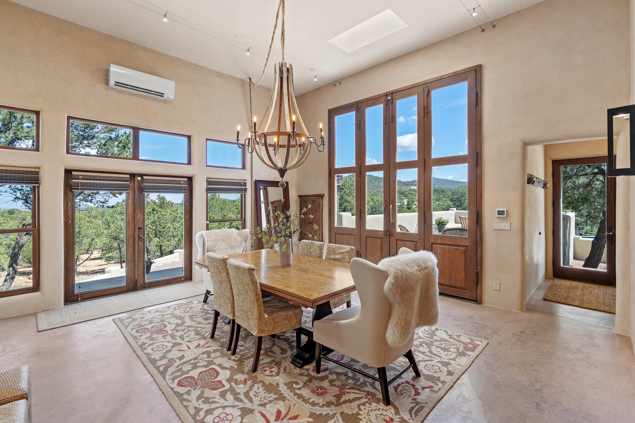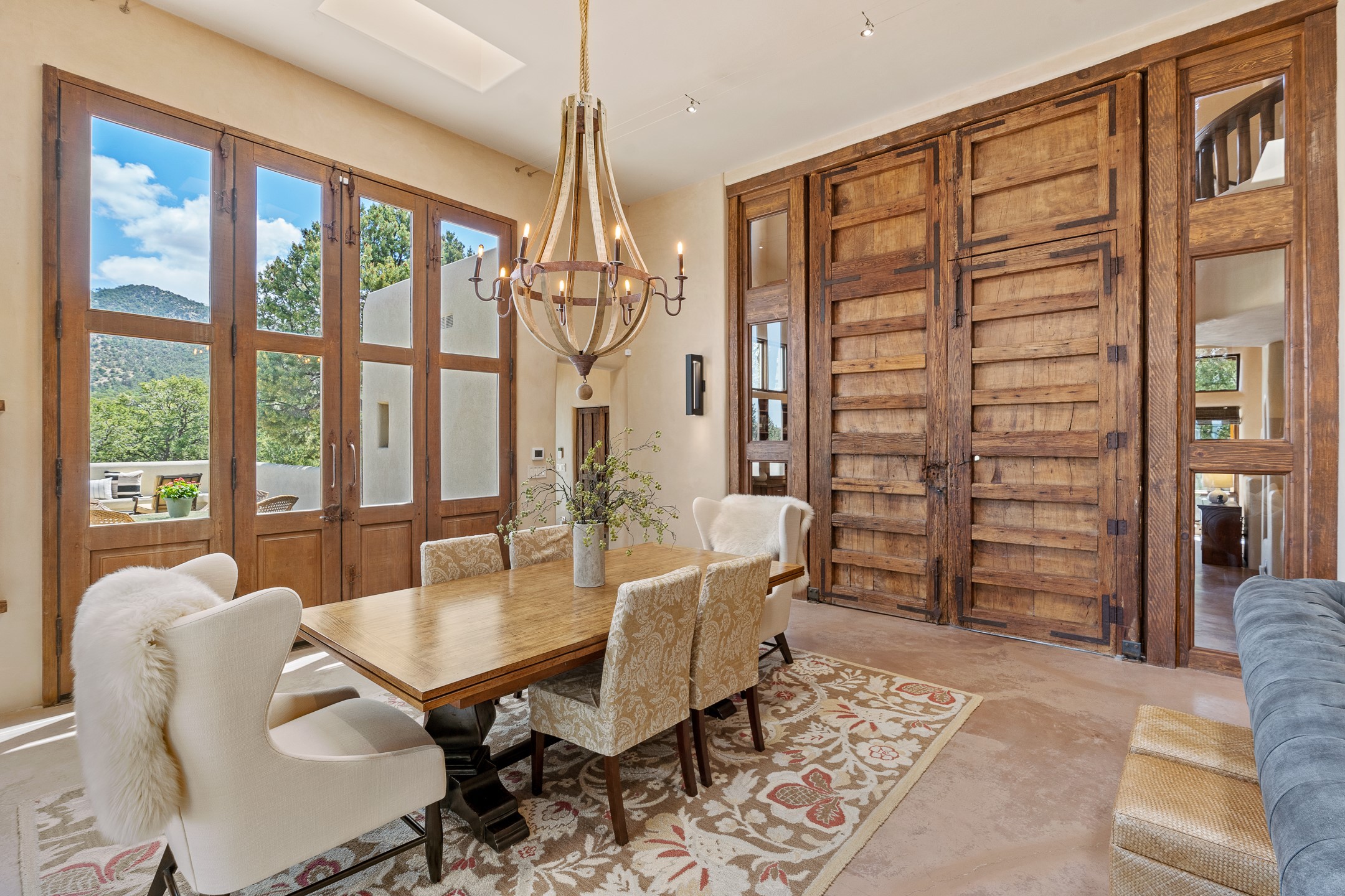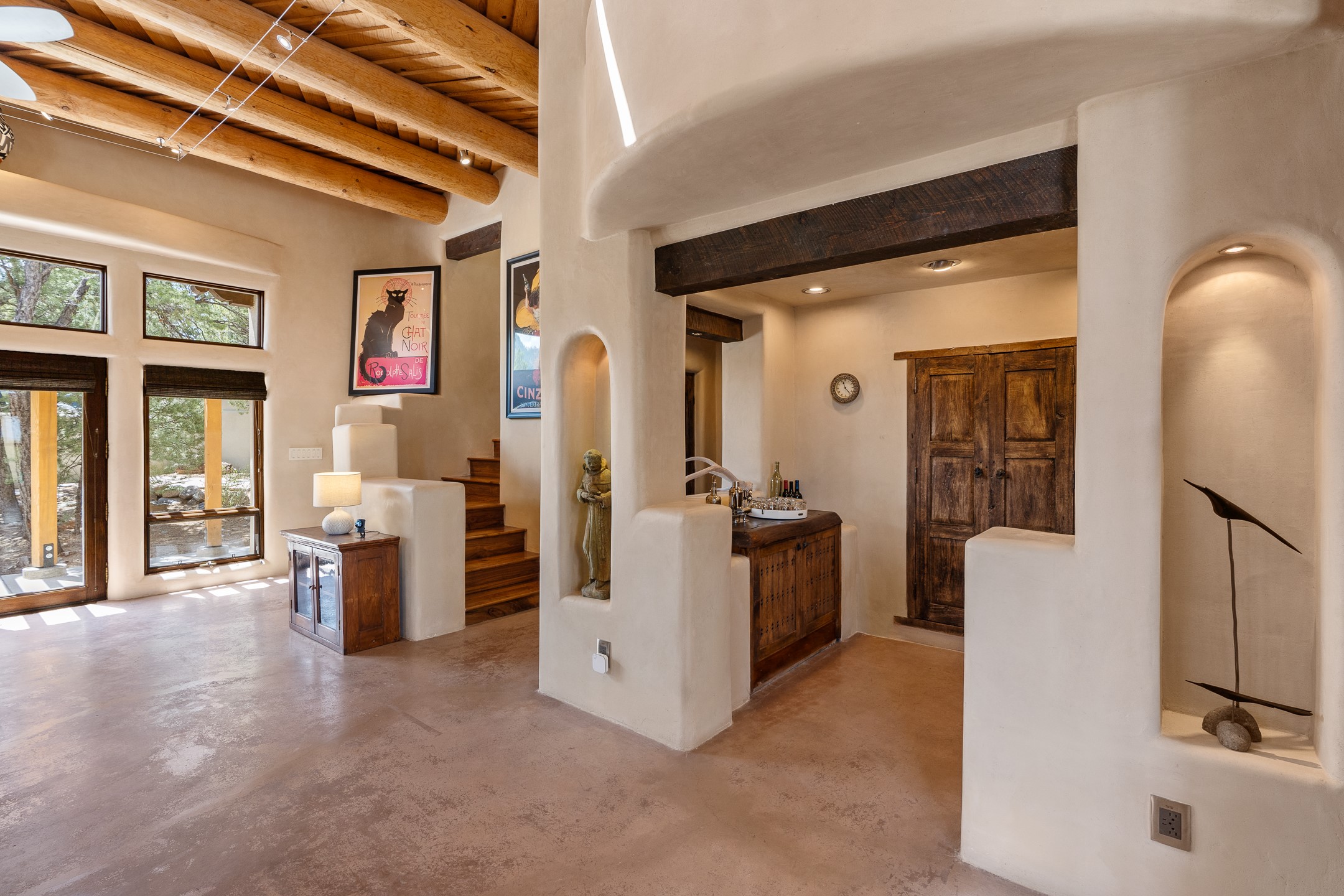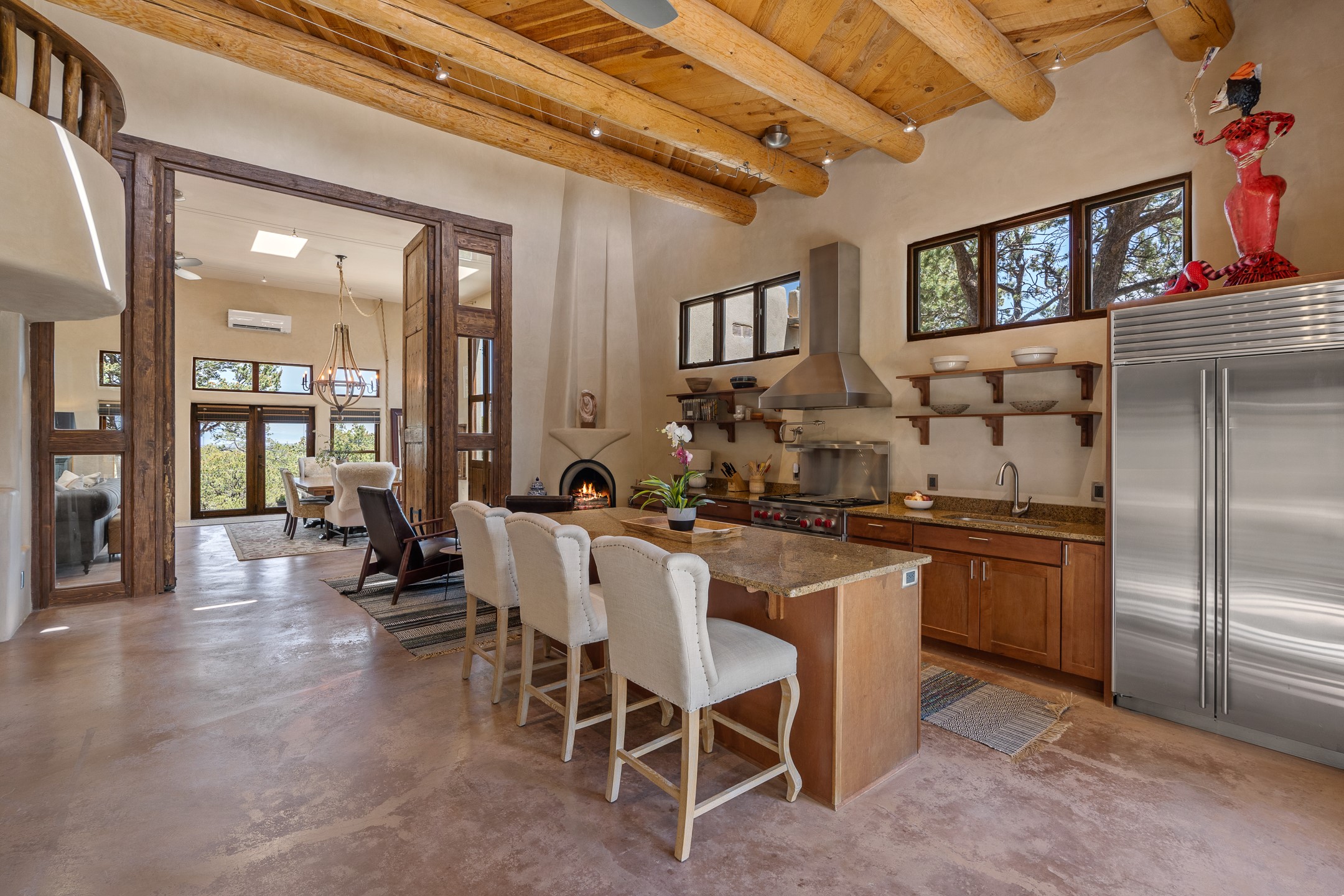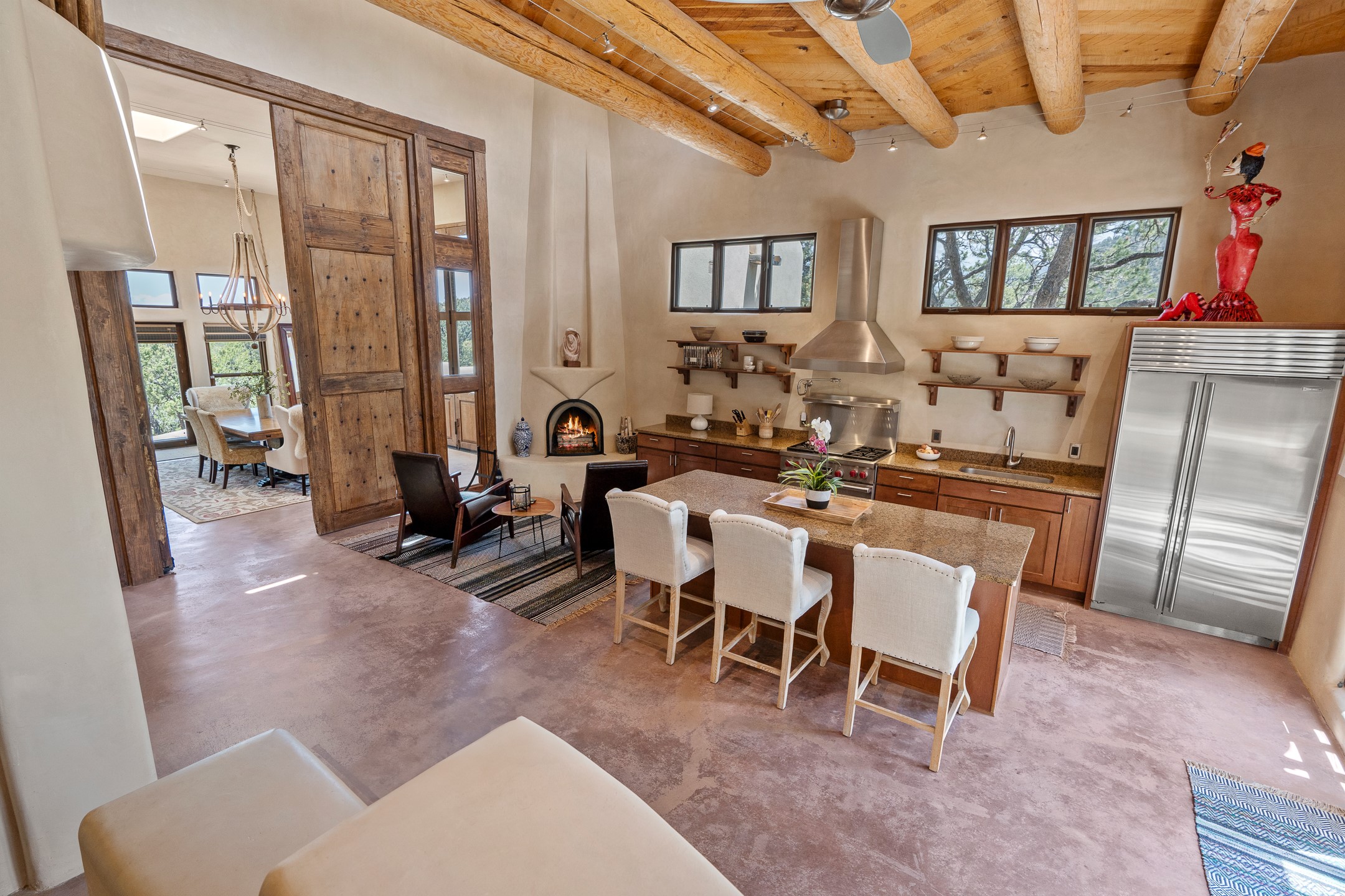 Beautifully sited on 2.5 acres in the foothills of the Sangre de Cristo Mountains, this stunning 3,836 sq. ft. home is a rare blend of traditional Santa Fe style, modern updates, and artistic provenance. Just 12 minutes from the historic Santa Fe Plaza, the property offers beautiful views of the Sangres, Jemez and Sandia Mountains, city lights, and Santa Fe's glorious sunsets. Originally built as a studio for the renowned Native American artist Bruce LaFountain and reimagined in 2001, the home has a distinct soul and history--including its appearance in a feature film. Every detail has been curated with intention, from the antique solid wood doors sourced from La Puerta Originals to the custom American Clay plaster walls, soaring ceilings, exposed vigas and rich natural light throughout. At the heart of the home is a chef's kitchen outfitted with center island, a built-in coffee wet bar with wine refrigerator, and an inviting intimate sitting area centered around a traditional kiva fireplace. This space flows seamlessly to a pergola-covered entertaining patio--ideal for grilling and relaxation. Towering ceilings grace the living room and dining room which also showcases stunning 14-foot antique doors from a Spanish Church and is connected to a spacious view patio ideal for entertaining and taking in the peace and drama of the skies and mountains. The primary suite is located upstairs and features a den/study as well as a spa like bath and a private roof top area with direct access from both the bedroom and bath. The downstairs guest area is separated for ultimate privacy area with each room having direct access to an outdoor space perfect for getting away from it all. Additional highlights include radiant in-floor heating, mini-splits for instant heating and cooling and over $200,000 in thoughtful improvements ensuring ease of living--highlighted by a new boiler and hot water heater, newer roof, newer stucco, newer washer and dryer. An optional designer furniture package is available for purchase, making this extraordinary home move-in ready for those seeking authenticity, elegance, and a true sense of place.