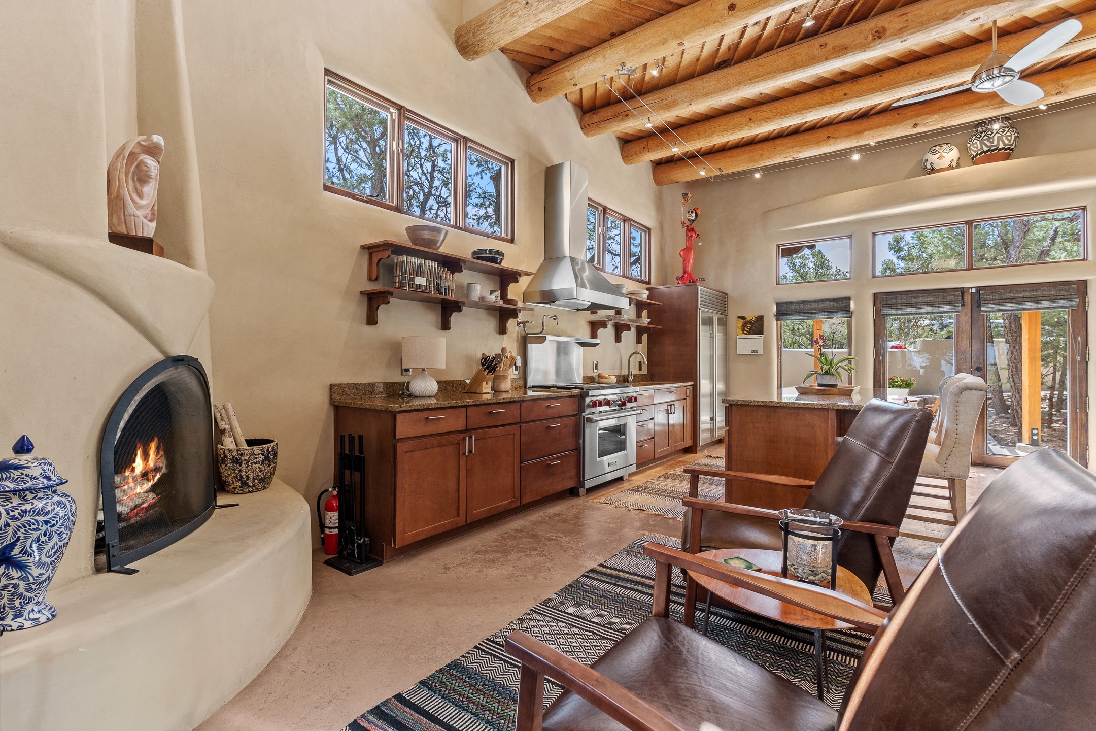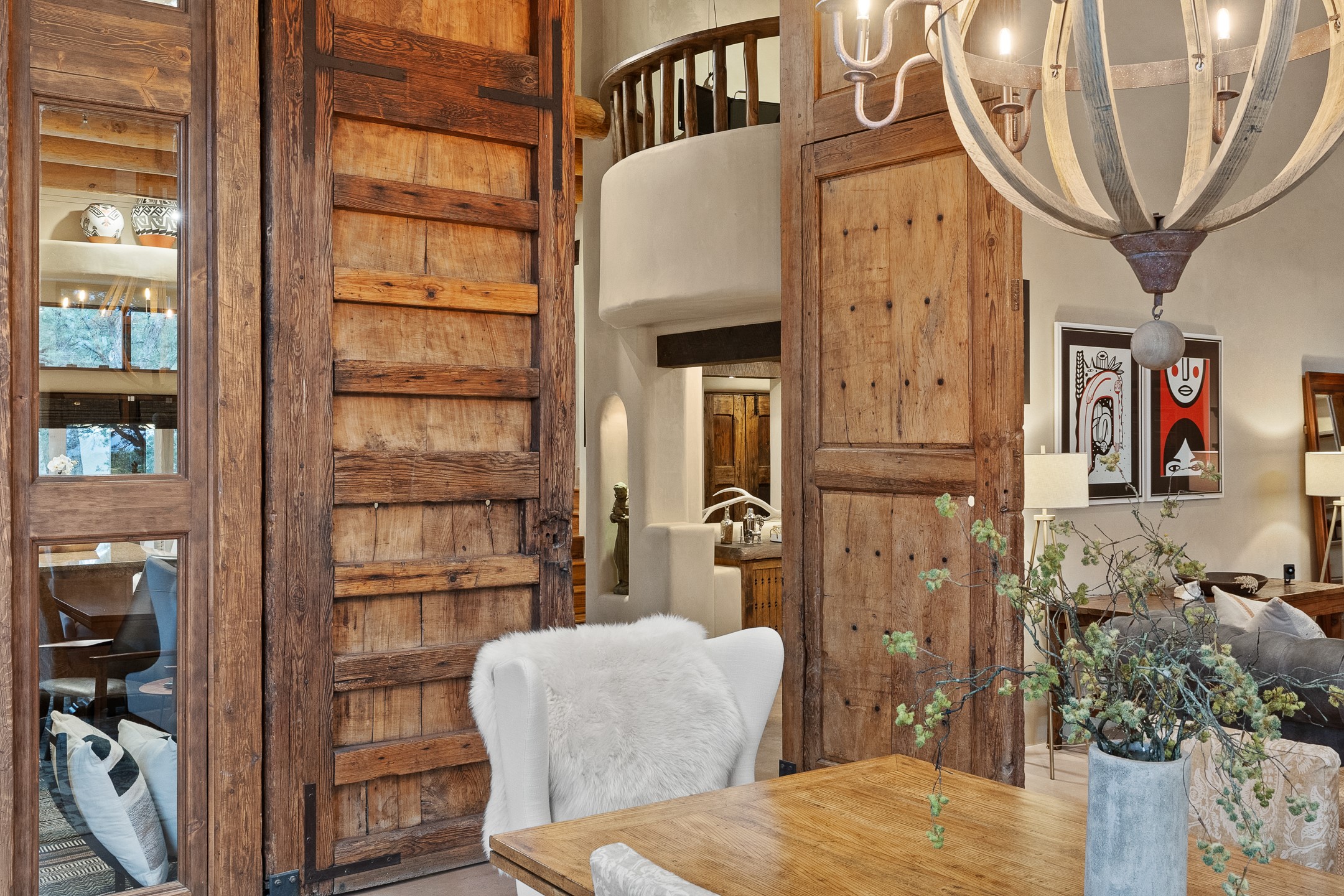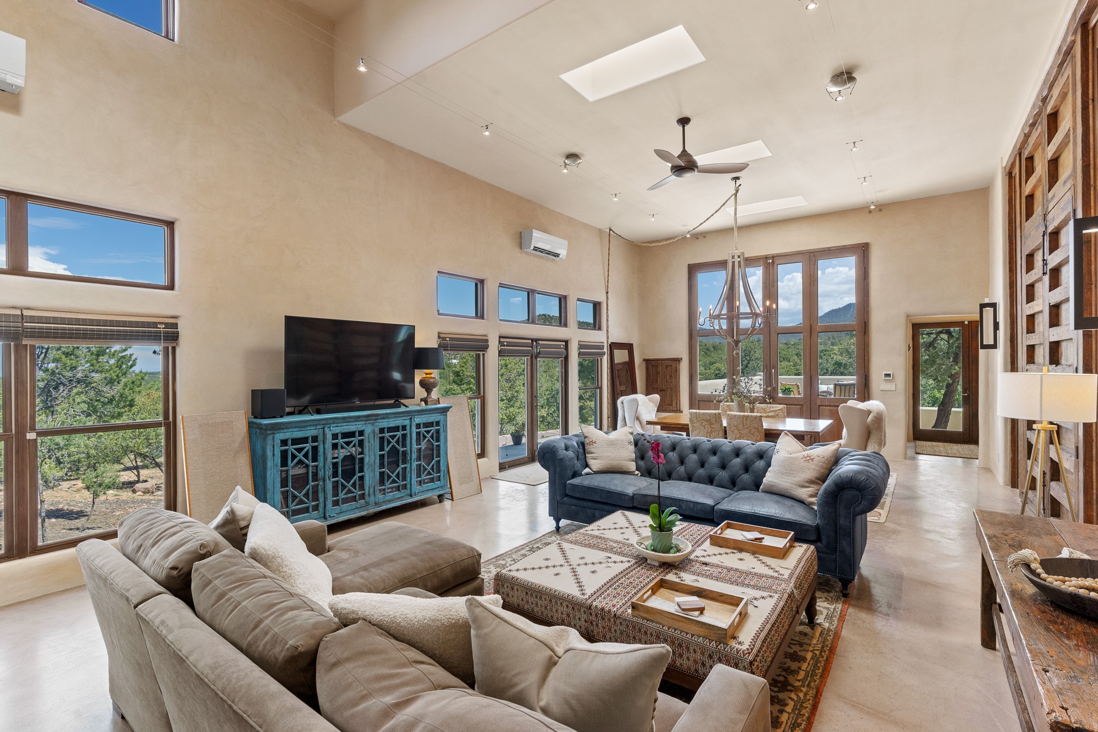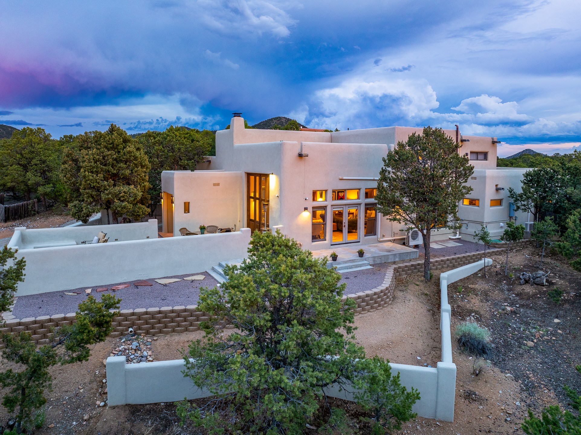 Beautifully sited on 2.5 acres in the foothills of the Sangre de Cristo Mountains, this stunning 3,836 sq. ft. home is a rare blend of traditional Santa Fe style, modern updates, and artistic provenance. Just 12 minutes from the historic Santa Fe Plaza, the property offers beautiful views of the Sangres, Jemez and Sandia Mountains, city lights, and Santa Fe's glorious sunsets. Originally built as a studio for the renowned Native American artist Bruce LaFountain and reimagined in 2001, the home has a distinct soul and history--including its appearance in a feature film. Every detail has been curated with intention, from the antique solid wood doors sourced from La Puerta Originals to the custom American Clay plaster walls, soaring ceilings, exposed vigas and rich natural light throughout. At the heart of the home is a chef's kitchen outfitted with center island, a built-in coffee wet bar with wine refrigerator, and an inviting intimate sitting area centered around a traditional kiva fireplace. This space flows seamlessly to a pergola-covered entertaining patio--ideal for grilling and relaxation. Towering ceilings grace the living room and dining room which also showcases stunning 14-foot antique doors from a Spanish Church and is connected to a spacious view patio ideal for entertaining and taking in the peace and drama of the skies and mountains. The primary suite is located upstairs and features a den/study as well as a spa like bath and a private roof top area with direct access from both the bedroom and bath. The downstairs guest area is separated for ultimate privacy area with each room having direct access to an outdoor space perfect for getting away from it all. Additional highlights include radiant in-floor heating, mini-splits for instant heating and cooling and over $200,000 in thoughtful improvements ensuring ease of living--highlighted by a new boiler and hot water heater, newer roof, newer stucco, newer washer and dryer. An optional designer furniture package is available for purchase, making this extraordinary home move-in ready for those seeking authenticity, elegance, and a true sense of place.