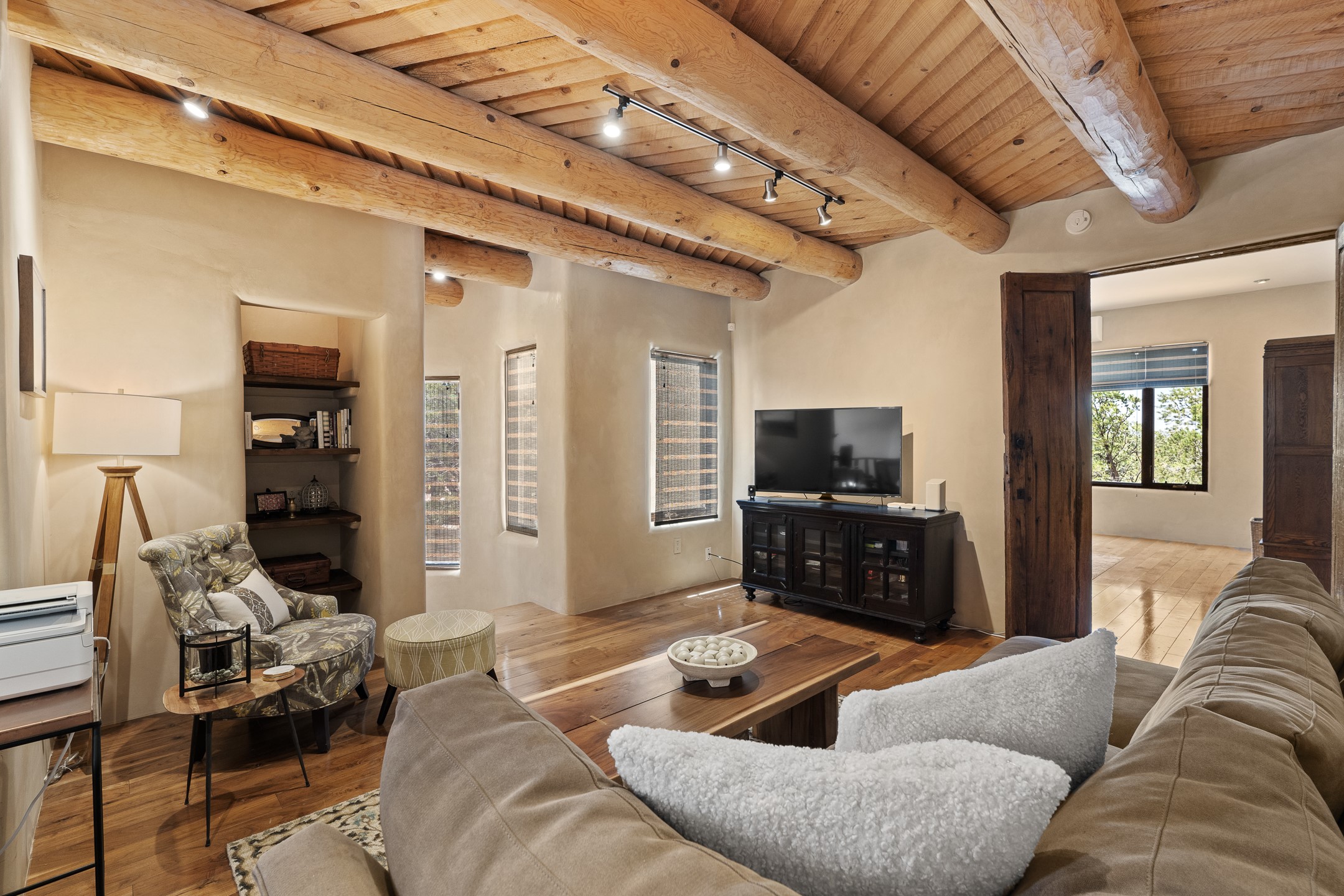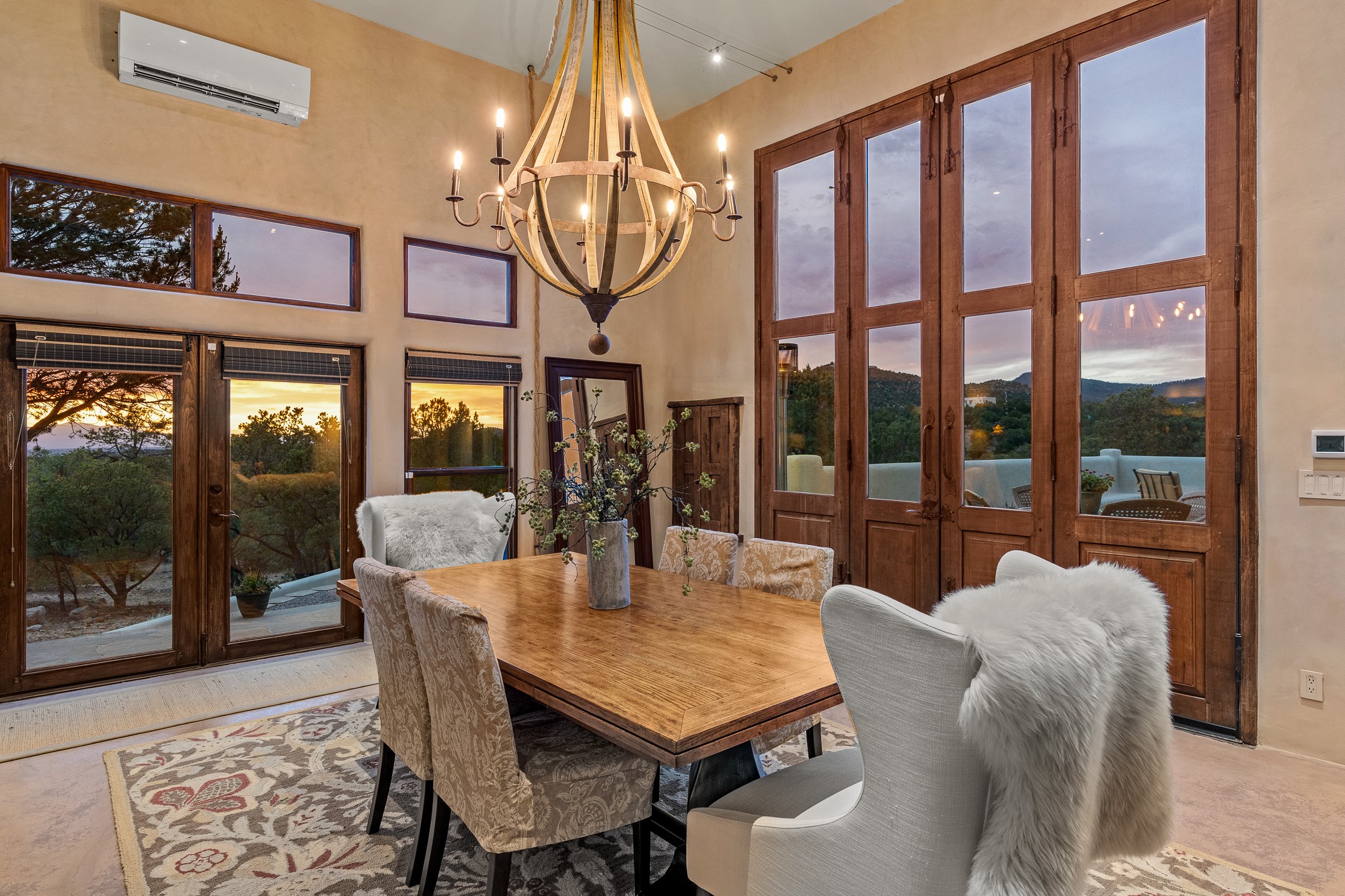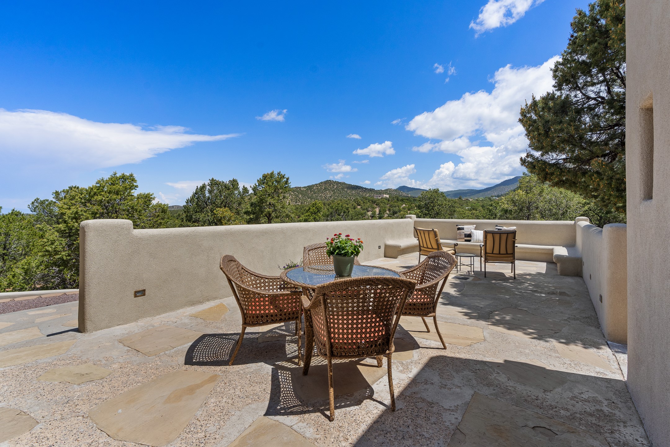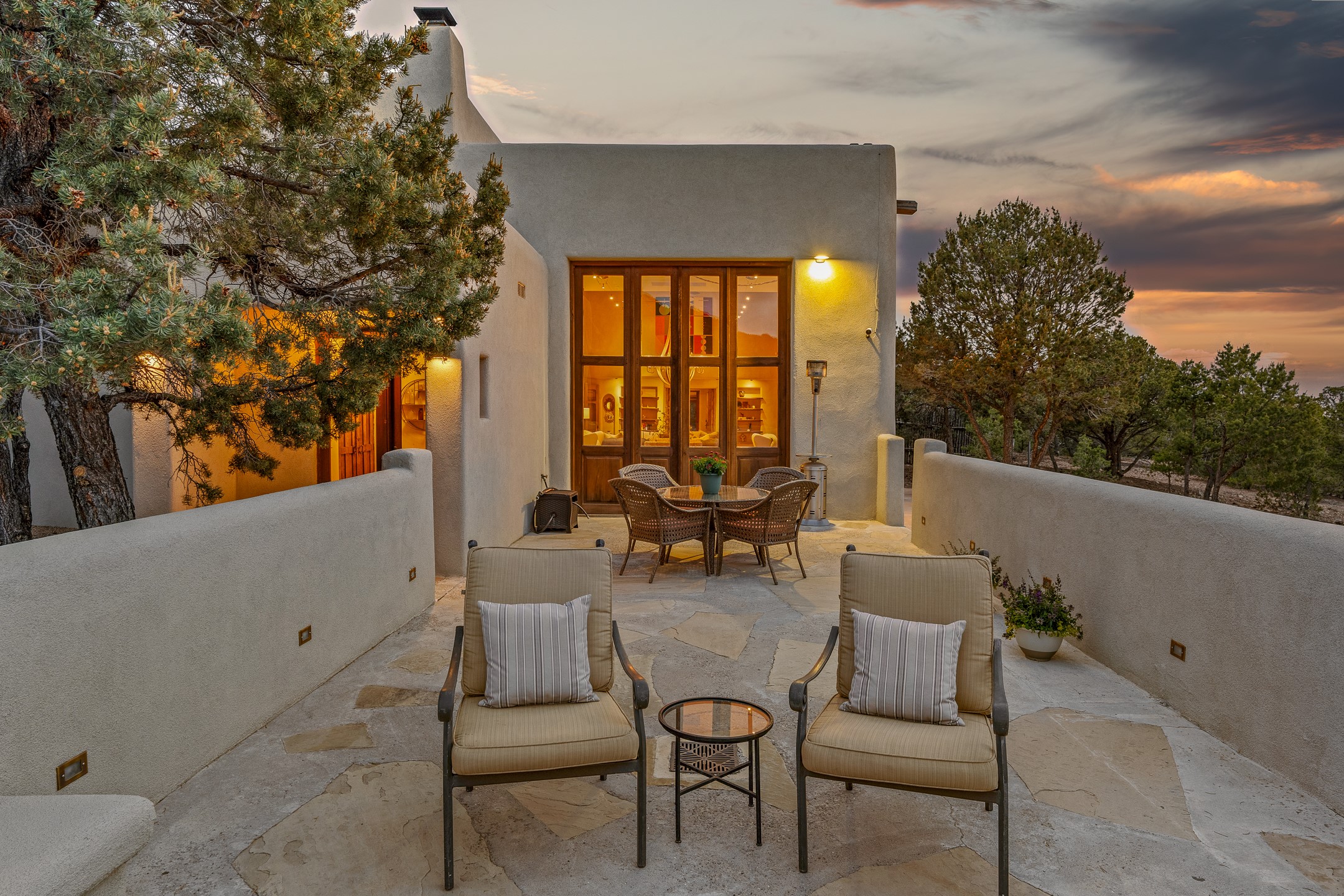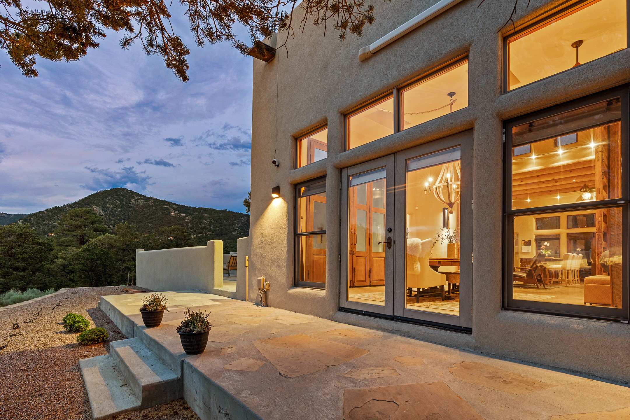 Beautifully sited on 2.5 acres in the foothills of the Sangre de Cristo Mountains, this stunning 3,836 sq. ft. home is a rare blend of traditional Santa Fe style, modern updates, and artistic provenance. Just 12 minutes from the historic Santa Fe Plaza, the property offers beautiful views of the Sangres, Jemez and Sandia Mountains, city lights, and Santa Fe's glorious sunsets. Originally built as a studio for the renowned Native American artist Bruce LaFountain and reimagined in 2001, the home has a distinct soul and history--including its appearance in a feature film. Every detail has been curated with intention, from the antique solid wood doors sourced from La Puerta Originals to the custom American Clay plaster walls, soaring ceilings, exposed vigas and rich natural light throughout. At the heart of the home is a chef's kitchen outfitted with center island, a built-in coffee wet bar with wine refrigerator, and an inviting intimate sitting area centered around a traditional kiva fireplace. This space flows seamlessly to a pergola-covered entertaining patio--ideal for grilling and relaxation. Towering ceilings grace the living room and dining room which also showcases stunning 14-foot antique doors from a Spanish Church and is connected to a spacious view patio ideal for entertaining and taking in the peace and drama of the skies and mountains. The primary suite is located upstairs and features a den/study as well as a spa like bath and a private roof top area with direct access from both the bedroom and bath. The downstairs guest area is separated for ultimate privacy area with each room having direct access to an outdoor space perfect for getting away from it all. Additional highlights include radiant in-floor heating, mini-splits for instant heating and cooling and over $200,000 in thoughtful improvements ensuring ease of living--highlighted by a new boiler and hot water heater, newer roof, newer stucco, newer washer and dryer. An optional designer furniture package is available for purchase, making this extraordinary home move-in ready for those seeking authenticity, elegance, and a true sense of place.